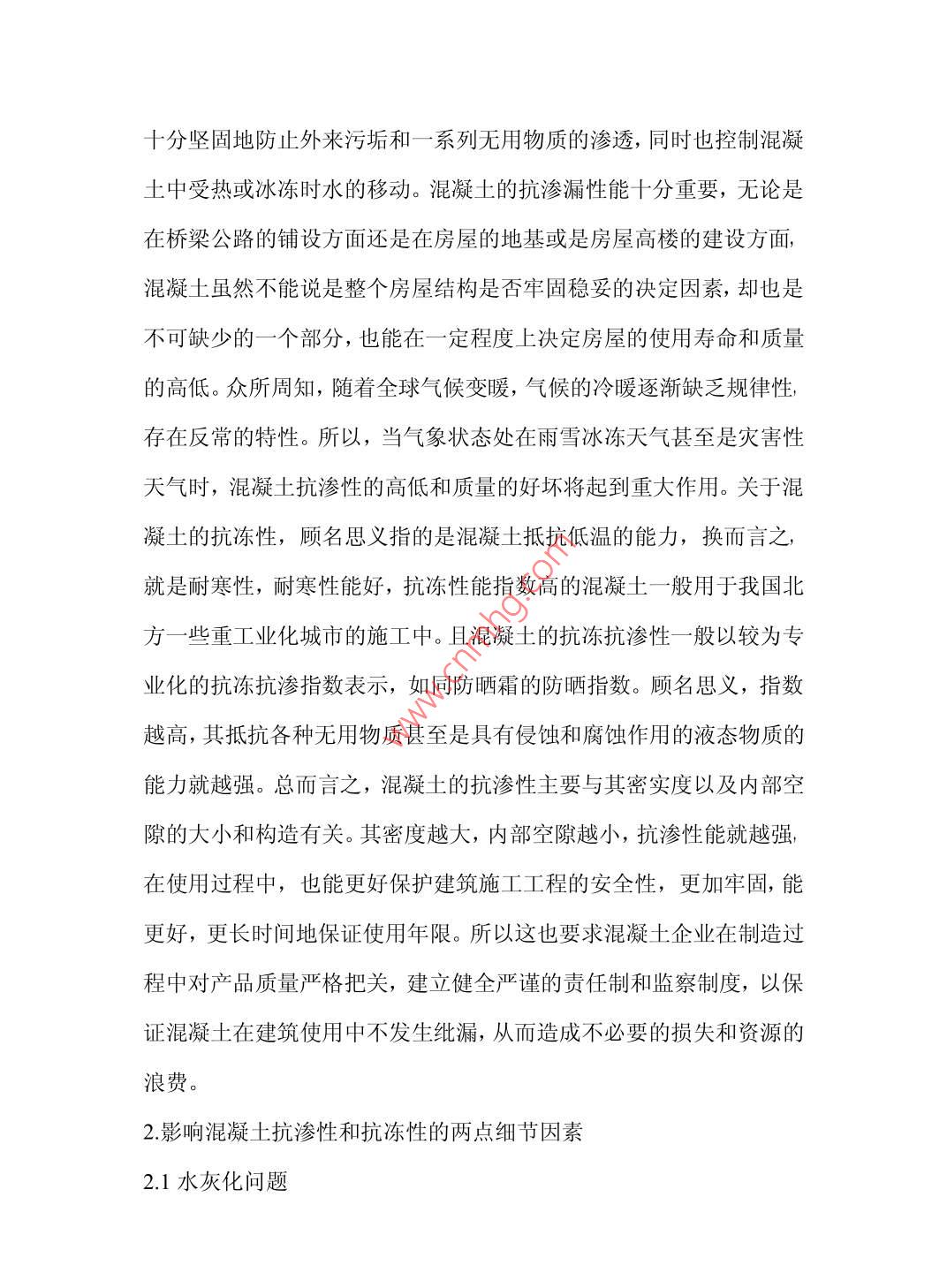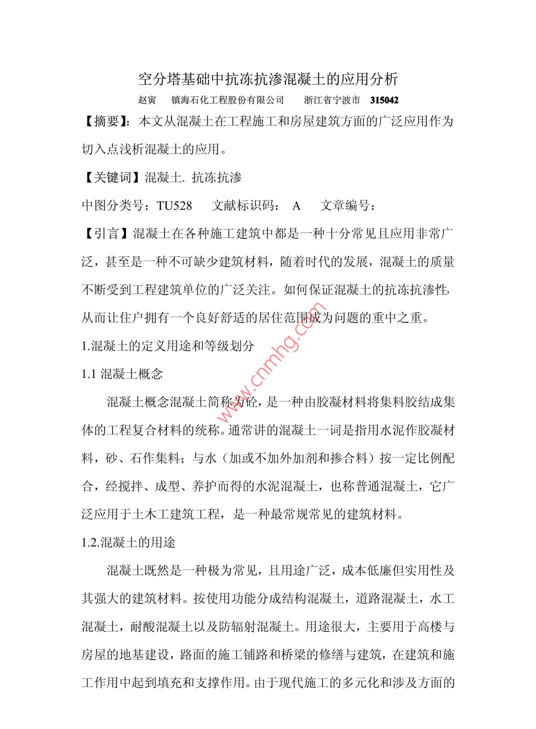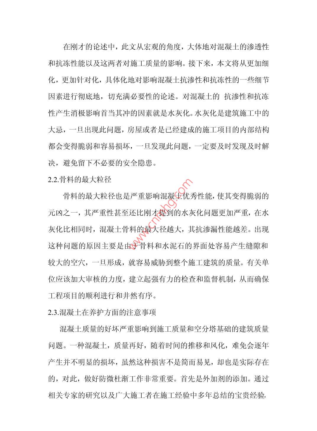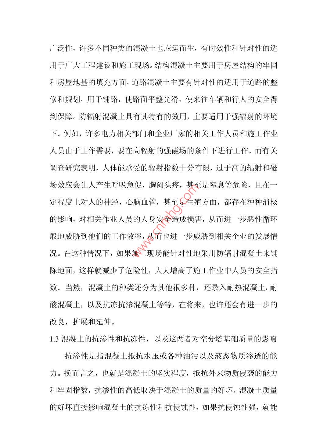 空分塔基礎(chǔ)中抗凍抗?jié)B混凝土的應(yīng)用分析趙寅鎮(zhèn)海石化工程股份有限公司浙江省寧波市315042【摘要】:本文從混凝土在工程施工和房屋建筑方面的廣泛應(yīng)用作為切入點(diǎn)淺析混凝土的應(yīng)用?!娟P(guān)鍵詞】混凝土.抗凍抗?jié)B中圖分類號(hào):TU528文獻(xiàn)標(biāo)識(shí)碼:A文章編號(hào):【引言】混凝土在各種施工建筑中都是一種十分常見且應(yīng)用非常廣泛,甚至是一種不可缺少建筑材料,隨著時(shí)代的發(fā)展,混凝土的質(zhì)量不斷受到工程建筑單位的廣泛關(guān)注。如何保證混凝土的抗凍抗?jié)B性,從而讓住戶擁有一個(gè)良好舒適的居住范圍成為問題的重中之重。1混凝土的定義用途和等級(jí)劃分1.1混凝土概念混凝土概念混凝土簡稱為砼,是一種由膠凝材料將集料膠結(jié)成集體的工程復(fù)合材料的統(tǒng)稱。通常講的混凝土一詞是指用水泥作膠凝材料,砂、石作集料;與水(加或不加外加劑和摻合料)按一定比例配,經(jīng)攪拌、成型、養(yǎng)護(hù)而得的水泥混凝土,也稱普通混凝土,它,泛應(yīng)用于土木工建筑工程,是一種最常規(guī)常見的建筑材料。1.2.混凝土的用途混凝土既然是一種極為常見,且用途廣泛,成本低廉但實(shí)用性及其強(qiáng)大的建筑材料。按使用功能分成結(jié)構(gòu)混凝土,道路混凝土,水工混凝土,耐酸混凝土以及防輻射混凝土。用途很大,主要用于高樓與房屋的地基建設(shè),路面的施工鋪路和橋梁的修繕與建筑,在建筑和施工作用中起到填充和支撐作用。由于現(xiàn)代施工的多元化和涉及方面的廣泛性,許多不同種類的混凝土也應(yīng)運(yùn)而生,有時(shí)效性和針對(duì)性的適用于廣大工程建設(shè)和施工現(xiàn)場。結(jié)構(gòu)混凝土主要用于房屋結(jié)構(gòu)的牢固和房屋地基的填充方面,道路混凝土主要有針對(duì)性的適用于道路的整修和規(guī)劃,用于鋪路,使路面平整光滑,使來往車輛和行人的安全得到保障。防輻射混凝土具有其特有的效用,主要適用于強(qiáng)輻射的環(huán)境下。例如,許多電力相關(guān)部門和企業(yè)廠家的相關(guān)工作人員和施工作業(yè)人員由于工作需要,要在高輻射的強(qiáng)磁場的條件下進(jìn)行工作。而有關(guān)調(diào)查研究表明,人體能承受的輻射指數(shù)十分有限,過于高的輻射和磁場效應(yīng)會(huì)讓人產(chǎn)生呼吸急促,胸悶頭疼,甚至是窒息等危險(xiǎn),且在定程度上對(duì)人的神經(jīng),心腦血管,甚至是生殖方面,都存在種種消極的影響,對(duì)相關(guān)作業(yè)人員的人身安全造成損害,從而進(jìn)一步惡性循環(huán)般地威脅到他們的工作效率,從而也進(jìn)一步威脅到相關(guān)企業(yè)的發(fā)展情況。在這種情況下,如果施工現(xiàn)場能針對(duì)性地采用防輻射混凝土來鋪陳地面,這樣就減少了危險(xiǎn)性,大大增高了施工作業(yè)中人員的安全指數(shù)。當(dāng)然,混凝土的種類還分為其他很多種,還錄入耐熱混凝土,耐酸混凝土,以及抗凍抗?jié)B混凝土等等,在將來,也許還會(huì)有進(jìn)一步的改良,擴(kuò)展和延伸。1.3混凝土的抗?jié)B性和抗凍性,以及這兩者對(duì)空分塔基礎(chǔ)質(zhì)量的影響抗?jié)B性是指混凝土抵抗水壓或各種油污以及液態(tài)物質(zhì)滲透的能力。換而言之,也就是混凝土的堅(jiān)實(shí)程度,抵抗外來物質(zhì)侵襲的能力和牢固指數(shù),抗?jié)B性的高低取決于混凝土的質(zhì)量的好壞?;炷临|(zhì)量的好壞直接影響混凝土的抗凍性和抗侵蝕性,如果抗侵蝕性強(qiáng),就能十分堅(jiān)固地防止外來污垢和一系列無用物質(zhì)的滲透,同時(shí)也控制混凝土中受熱或冰凍時(shí)水的移動(dòng)?;炷恋目?jié)B漏性能十分重要,無論是在橋梁公路的鋪設(shè)方面還是在房屋的地基或是房屋高樓的建設(shè)方面,混凝土雖然不能說是整個(gè)房屋結(jié)構(gòu)是否牢固穩(wěn)妥的決定因素,卻也是不可缺少的一個(gè)部分,也能在一定程度上決定房屋的使用壽命和質(zhì)量的高低。眾所周知,隨著全球氣候變暖,氣候的冷暖逐漸缺乏規(guī)律性,存在反常的特性。所以,當(dāng)氣象狀態(tài)處在雨雪冰凍天氣甚至是災(zāi)害性天氣時(shí),混凝土抗?jié)B性的高低和質(zhì)量的好壞將起到重大作用。關(guān)于混凝土的抗凍性,顧名思義指的是混凝土抵抗低溫的能力,換而言之,就是耐寒性,耐寒性能好,抗凍性能指數(shù)高的混凝土一般用于我國北方一些重工業(yè)化城市的施工中。且混凝土的抗凍抗?jié)B性一般以較為專業(yè)化的抗凍抗?jié)B指數(shù)表示,如同防曬霜的防曬指數(shù)。顧名思義,指數(shù)越高,其抵抗各種無用物質(zhì)甚至是具有侵蝕和腐蝕作用的液態(tài)物質(zhì)的能力就越強(qiáng)??偠灾?混凝土的抗?jié)B性主要與其密實(shí)度以及內(nèi)部空隙的大小和構(gòu)造有關(guān)。其密度越大,內(nèi)部空隙越小,抗?jié)B性能就越強(qiáng),在使用過程中,也能更好保護(hù)建筑施工工程的安全性,更加牢固,能更好,更長時(shí)間地保證使用年限。所以這也要求混凝土企業(yè)在制造過程中對(duì)產(chǎn)品質(zhì)量嚴(yán)格把關(guān),建立健全嚴(yán)謹(jǐn)?shù)呢?zé)任制和監(jiān)察制度,以保證混凝土在建筑使用中不發(fā)生紕漏,從而造成不必要的損失和資源的浪費(f