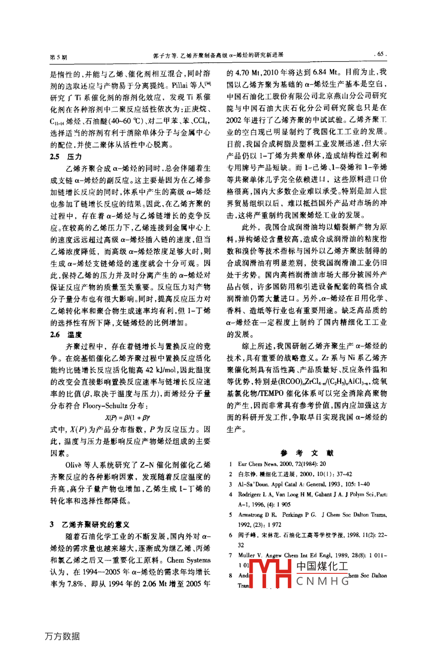 綜述成樹脂及塑料,2003,20(5):61CHINA SYNTHE TIC RESIN AND PLASTICS乙烯齊聚制備高級(jí)α-烯烴的研究新進(jìn)展郭子方陳偉(中國(guó)石油化工股份有限公司北京化工研究院,北京,100013)糜家鈴(中國(guó)石油化工股份有限公司北京燕山分公司研究院,北京,102500)(中國(guó)礦業(yè)大學(xué),北京,100083摘要:介紹了國(guó)內(nèi)外乙烯齊聚催化劑的研究進(jìn)展對(duì)乙烯齊聚催化體系的影響因素(配體、助化劑第組分、溶劑、壓力和溫度等)進(jìn)行了分析。針對(duì)我國(guó)乙烯齊聚研究的差距與不足,指出應(yīng)加快zr系及N系乙烯齊聚催化劑的研究關(guān)鵪詞:乙烯a-烯烴齊聚近年來,隨著烯烴工業(yè)和精細(xì)化工工業(yè)的發(fā)入成倍增加,各種類型的催化體系層出不窮,齊聚展,線型α-烯烴的需求迅速增加,發(fā)展成為一種技術(shù)也有了很大的發(fā)展?,F(xiàn)在已報(bào)道的催化體系重要的有機(jī)化工原料,其用途十分廣泛。通常,主要有:烷基鋁類系、zr系、N系Cr系FeG~C低碳線型α-烯烴可用作低密度聚乙烯系Co系、W系以及最近開始研究的離子液體等(LDPE)和線型低密度聚乙烯①LDPE)的共聚單體Cw以及部分C和Ca2可用以制備聚α-烯烴1乙烯齊聚制備a-烯烴催化劑的分類(PAO),用于生產(chǎn)航空、耐燃燒以及在惡劣環(huán)境下11烷基鋁類催化劑使用的高級(jí)潤(rùn)滑油;C~Cα-烯烴用于制備高烷基鋁催化乙烯齊聚制備線型高級(jí)α-烯烴級(jí)洗滌劑、表面活性劑、化妝品、合成調(diào)味品等;的技術(shù)是最早開發(fā)出來的乙烯齊聚技術(shù),也是迄C:及其以上的a-烯烴可直接或間接用于潤(rùn)滑油今為止工業(yè)生產(chǎn)a-烯烴的主要方法之添加劑及鉆井液、粘合劑密封劑和涂料等;同時(shí)用于催化乙烯齊聚的催化劑主要是三乙基線型a-烯烴還用于合成增塑劑、環(huán)氧化物、胺、直鋁,其催化理論主要是以 Ziegler發(fā)明的兒種反應(yīng)鏈硫醇、脂肪酸以及各類添加劑、低粘性合成油為基礎(chǔ)。烷基鋁催化劑催化乙烯聚合時(shí)因?yàn)榫酆蠗l件苛刻催化劑產(chǎn)率低、產(chǎn)品質(zhì)量不好,逐漸被a-烯烴的生產(chǎn)方法主要有烷烴脫氫法蠟裂新出現(xiàn)的催化劑所替代解法、萃取分離法以及乙烯齊聚法等。目前,工業(yè)12T系催化劑上主要采用乙烯齊聚法制備α-烯烴,烷烴脫氫和Ti系催化劑是研究最早的乙烯齊聚絡(luò)合催蠟裂解等其他方法均因收率低、成本高、產(chǎn)品質(zhì)化劑。該催化體系主要包括TORa、TiC4、Cp2TiCl2不好和工藝復(fù)雜等原因逐漸淡出。據(jù)統(tǒng)計(jì),等圍。其中,研究最多的為TiOR-AR3催化體2000年全球-烯烴生產(chǎn)能力為292Mua,其中275Mta均為乙烯齊聚法,約占總生產(chǎn)能力的收稿日期:2002-11-25修改稿收到日期:203-0626聚烯烴茂金屬催80年代以來,乙烯齊聚的研究愈來愈得到廣中國(guó)煤化工篇。聯(lián)系電話泛重視。各國(guó)在乙烯齊聚制備α烯烴上的科研投CNMHGniciac.cn合皮樹腳及塑料203年第20卷系,R為C1~C6的烷基,R為C1~C8的烷基或芳Ti系絡(luò)合催化劑的反應(yīng)條件大大優(yōu)于經(jīng)典基烷基鋁催化體系,但活性低,CCm烯烴選擇性不許多學(xué)者對(duì)T系催化劑的催化機(jī)理也進(jìn)行高。T系催化劑的開發(fā)使得乙烯齊聚催化劑的研了深入的研究,并提出了各種機(jī)理,其中尤以雙金究前進(jìn)了一大步。屬中心和環(huán)化機(jī)理得到了普遍認(rèn)可。1964年,13N系催化劑Cosee首先提出了這種雙金屬中心的機(jī)理N系催化劑具有活性高、反應(yīng)條件溫和,價(jià)Cose認(rèn)為,烷氧基橋聯(lián)的Ti-Al是乙烯二聚的格便宜等優(yōu)點(diǎn)。就直鏈α-烯烴含量、純度、產(chǎn)品活性中心,并認(rèn)為活性組分為八面體配合物。與催化劑的分離以及催化劑循環(huán)使用等方面來rodrnigerz、 Armstrong和 Novaro等人的進(jìn)一步理說鎳鰲合物催化劑體系都是優(yōu)秀的體系之一。論研究表明,齊聚的鏈增長(zhǎng)及B-H轉(zhuǎn)移均由Ti1.31Ni系催化劑體系的d軌道決定,并逐漸形成了其齊聚機(jī)理。自從 Shell公司開發(fā)鎳螯合物催化劑的殼牌1980年,Daa等人提出了環(huán)化機(jī)理,認(rèn)為在高級(jí)烯烴工藝過程(SHOP以來,大量的Ni系催乙烯齊聚的過程中2個(gè)烯烴分子與1個(gè)T原子化體系被開發(fā)出來,有零價(jià)N配合物,也有2價(jià)相偶合,形成環(huán)戊烷活性中間體。N配合物,其中典型的Ni系催化劑體系見表1。囊1N系乙齊聚催化荊Tab. I Ni-based ethene oligomerization catalysts催化體系反應(yīng)條件NiCl, 6H,O/NaBH,Ph2PCHCOOH HOCH2OH, 3.45 MPA,8%-20%C,31%C2300g/(gh75℃75min20%CxNiX NaBH/ Ph PCH CH, COOH/PPh, HO(CH-OH, 4.05 MPA.41%C·40.5%C1000g(g-h)185%C孟C】,6 HO/NaBH/鄰二苯基膦酸二甲基乙酰胺,4,7MPa67%C…,95%-100%a-烯烴轉(zhuǎn)化率為81%一線型率為100%NCOD》(H1PH七氟丁酸戊醇,482MPa1860g/(gh)NCOD/PCHC0H或HO(CH2OH, 5.0 MPNi(CODHRP(OR)CHCOCH,97%G轉(zhuǎn)化率為80%R為烷基Ni(COD2或Ni烷基》9-羧基芳族溶劑996%線型α-烯烴6 000 mol/mol甲基-9膦釀-二環(huán)(3,3,1)壬烷Ph(PPh,)Ni[Ph- PCHC(Ph)oJ甲苯,50MPa75℃98%α-烯烴線型率為99Ni(COD)Ph2_ COOH98%-99%C3芳族溶劑91%-烯烴000ggPh2PC( So, NajC(Ph)OyCH)A極性溶劑,148MPa50℃Al/Ni為200,(OCHn為0,1,2(R'RRORNIZRRC(R) C(R) M] CHOH/H2 0. 20-100C,48%C452%CnR-為HCa烷基,Cn芳基007-207MPa擇性為909M為S0;Z為 PAsSbNi(Ⅱy有機(jī)酸環(huán)丁鍋NaBH4環(huán)丁砜,655MPa,80℃大于17000g/