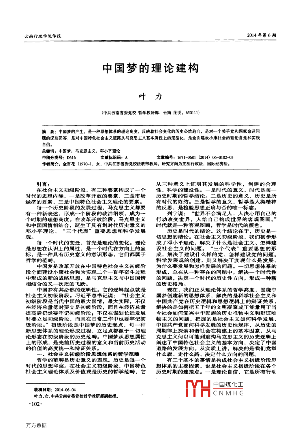 云南行政學(xué)院學(xué)報014年第6期中國夢的理論建構(gòu)葉力(中共云南省委黨校哲學(xué)教研部,云南昆明,650111)搞要:中國夢的產(chǎn)生,是一種思想體系的理論高度,反映著社會變化的歷史必然趨向,是對一個關(guān)乎黨和國家命運(yùn)問題的深刻回答,是對中國特色社會主義道路從馬克思主義基本屬性上的定型化,是全面建設(shè)小康社會的理論自覺和實(shí)踐自信。關(guān)鍵詞:中國夢;馬克思主義;鄧小平理論中圖分類號:D616文獻(xiàn)標(biāo)識碼:A文章編號:1671-0681(2014)06-010203作者簡介:金雪花(1970-),女,中共江蘇省委黨校法政部教師,研究方向?yàn)閼椃ㄐ姓?國際經(jīng)濟(jì)法。引言:從三種意義上證明其發(fā)展的科學(xué)性,創(chuàng)建的合理在社會主義初級階段,有三種要素構(gòu)成了一個性,科學(xué)的建設(shè)性。一是時代的意義,時代是每時代的思想內(nèi)涵,一是改革開放的要素,二是市場歷史時期的哲學(xué)結(jié)論。二是歷史的意義,歷史是所經(jīng)濟(jì)的要素,三是中國特色社會主義理論的要素。有時代的終結(jié)。三是哲學(xué)的意義,哲學(xué)是人類精神每一個歷史階段的發(fā)展過程,馬克思主義都要的反思,是檢驗(yàn)思想正確與否的唯一標(biāo)志。有一種新表述,形成一個階段的政治綱領(lǐng),成為列寧說:“世界不會滿足人,人決心用自己的個時期的理想高度。在改革開放階段,馬克思主義行動改變世界,人給自己構(gòu)成世界的客觀圖畫。”和中國國情相結(jié)合,誕生了具有劃時代歷史意義的時代就是一種客觀圖畫,哲學(xué)是時代的顏色。鄧小平理論、“三個代表”重要思想和科學(xué)發(fā)展歷史是時代的結(jié)論。這個結(jié)論在于,歷史是一說°每一個時代的變遷,首先是理論的變化。理論成了鄧小平理論,解決了什么是社會主義、怎樣建切思想的結(jié)論。在社會主義初級階段,我們初步形是思想在認(rèn)識上的屬性,是一個時代在方向上的坐設(shè)社會主義的問題。“三個代表”重要思想的形標(biāo),是一種具有歷史意義的意識形態(tài),它們都屬于成,解決了建設(shè)什么樣的黨、怎樣建設(shè)黨的問題。哲學(xué)的范疇??茖W(xué)發(fā)展觀的創(chuàng)建,則又解決了實(shí)現(xiàn)什么是發(fā)展中國夢是改革開放在中國特色社會主義初級階為什么要發(fā)展和怎樣發(fā)展的問題。一切思想體系的段全面建設(shè)小康社會和為實(shí)現(xiàn)二個一百年奮斗過程形成,總在從一種存在的問題中,解決一個時代性中形成的新的戰(zhàn)略思想,是馬克思主義與中國國情的問題,決定一個時代的歷史性方向,形成一種新相結(jié)合的又一次質(zhì)的飛躍。的歷史格局。中國夢有其必然的邏輯性。它的邏輯起點(diǎn)就是現(xiàn)在,我們正從理論體系的哲學(xué)高度,圍繞中社會主義初級階段。習(xí)近平總書記說:“社會主義國夢創(chuàng)建新的思想體系,解決的是科學(xué)社會主義和初級階段是當(dāng)代中國的最大國情,最大實(shí)際,不僅中國共產(chǎn)黨在歷史邏輯和思想邏輯上的辯證關(guān)系,在經(jīng)濟(jì)總量低時要立足初級階段,而且在經(jīng)濟(jì)總量解決的是如何把五千年的文明凝聚成正能量用于當(dāng)提高后仍然要牢記初級階段;不僅在謀劃長遠(yuǎn)發(fā)展今社會如何復(fù)興中華民族的歷史唯物主義和辯證唯時要立足初級階段,而且在日常工作中也要牢記初物主義的問題,把握的是社會主義如何科學(xué)發(fā)展,級階段?!背跫夒A段是中國夢的歷史起點(diǎn),每一種中國共產(chǎn)黨如何科學(xué)發(fā)展的歷史性規(guī)律,從歷史的新思想體系的理論形成過程,立足點(diǎn)都源于一切理周期律上探索和諧社會在構(gòu)建上的基本因素,從馬論形態(tài)在初級階段的歷史范疇。中國夢從思想屬性克思主義何以可能到重構(gòu)馬克思主義的歷史邏輯上上的形成,是先前歷史過程的意義和當(dāng)前歷史活動闡述了中國特色社會主義的基本方向,決定了中國的價值的高度統(tǒng)一和辯證關(guān)系。道路的發(fā)展方向。從實(shí)質(zhì)上講,解決的是我們黨舉社會主義初級階段思想體系的哲學(xué)范障什么旗、走什么路、決定什么方向的問題哲學(xué)的范疇是歷史意義的表現(xiàn)。歷史是每一個有三個基本的事情是構(gòu)成社會主義初級階段思時代的思想印痕。在社會主義初級階段,中國特色想體系的主要因素,也是社會主義初級階段在各個社會主義理論體系及價值觀是歷史的哲學(xué)范疇,它歷史時期的連接點(diǎn)。一是理論自信,它是所有行動中國煤化工收稿日期:20140604葉力,女,中共云南省委黨校哲學(xué)教研部酬教授CNMH葉力:中國夢的理論建構(gòu)的指南。二是道路自信,它是實(shí)現(xiàn)中國夢的途徑。大問題,也都需要從戰(zhàn)略上拿出治本之策?!痹谑侵贫茸孕?它是一切發(fā)展的根本保障,這三者八大之后,習(xí)近平總書記結(jié)合中國國情和時代特征是中國特色社會主義的基本立足點(diǎn)和歷史范疇,因發(fā)表了關(guān)于中國夢的重要論述,成為一種新的理論此形成經(jīng)濟(jì)建設(shè)、政治建設(shè)、文化建設(shè)、黨的思想起點(diǎn)。建設(shè)、生態(tài)文明建設(shè)五位一體的格局和總依據(jù)、總中國夢的理論內(nèi)涵有正能量、歷史周期律、最