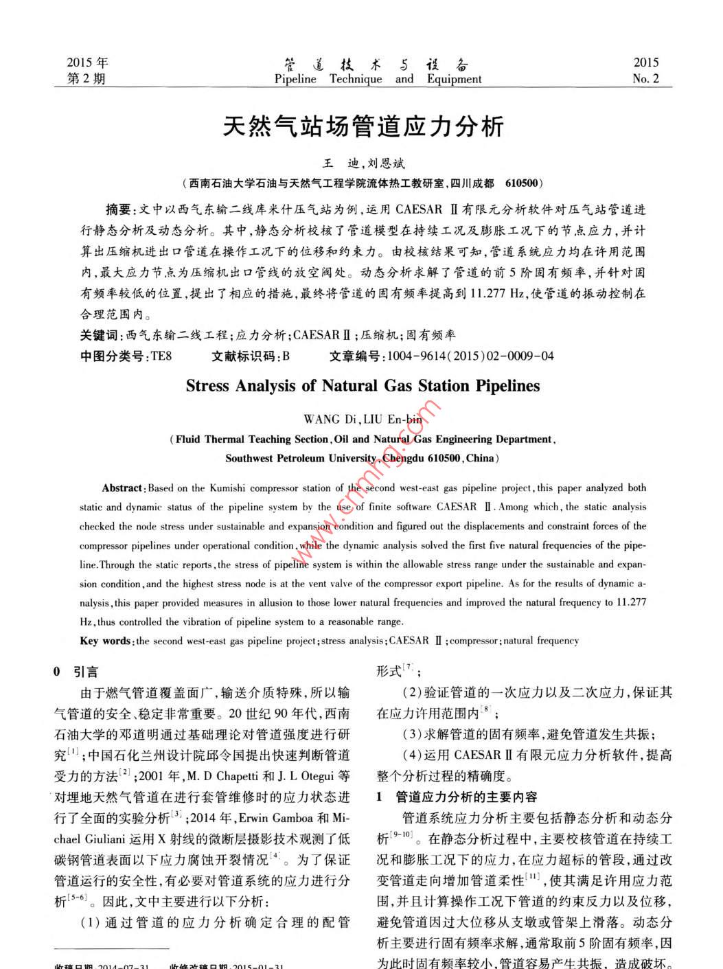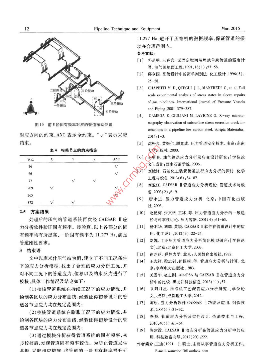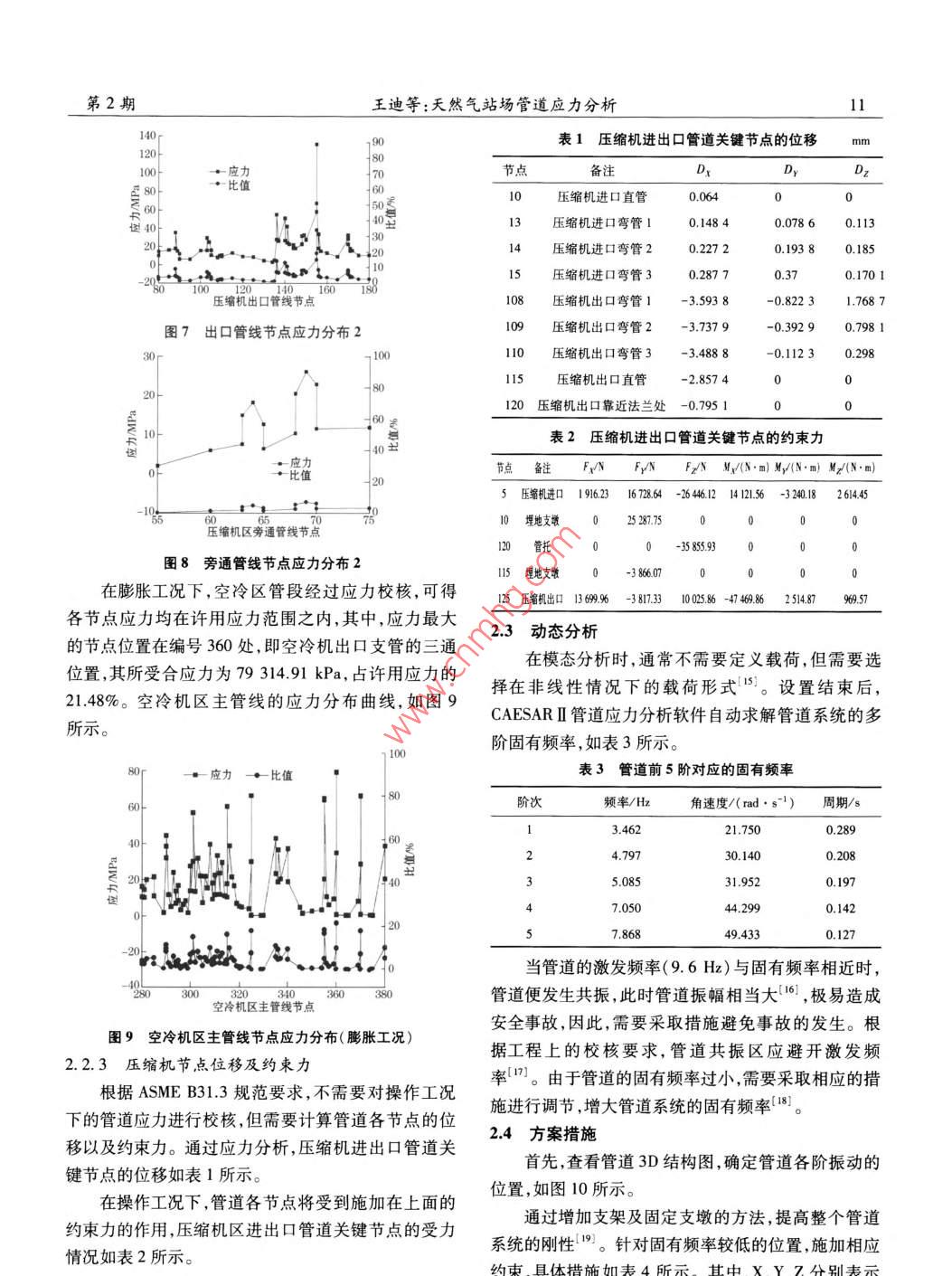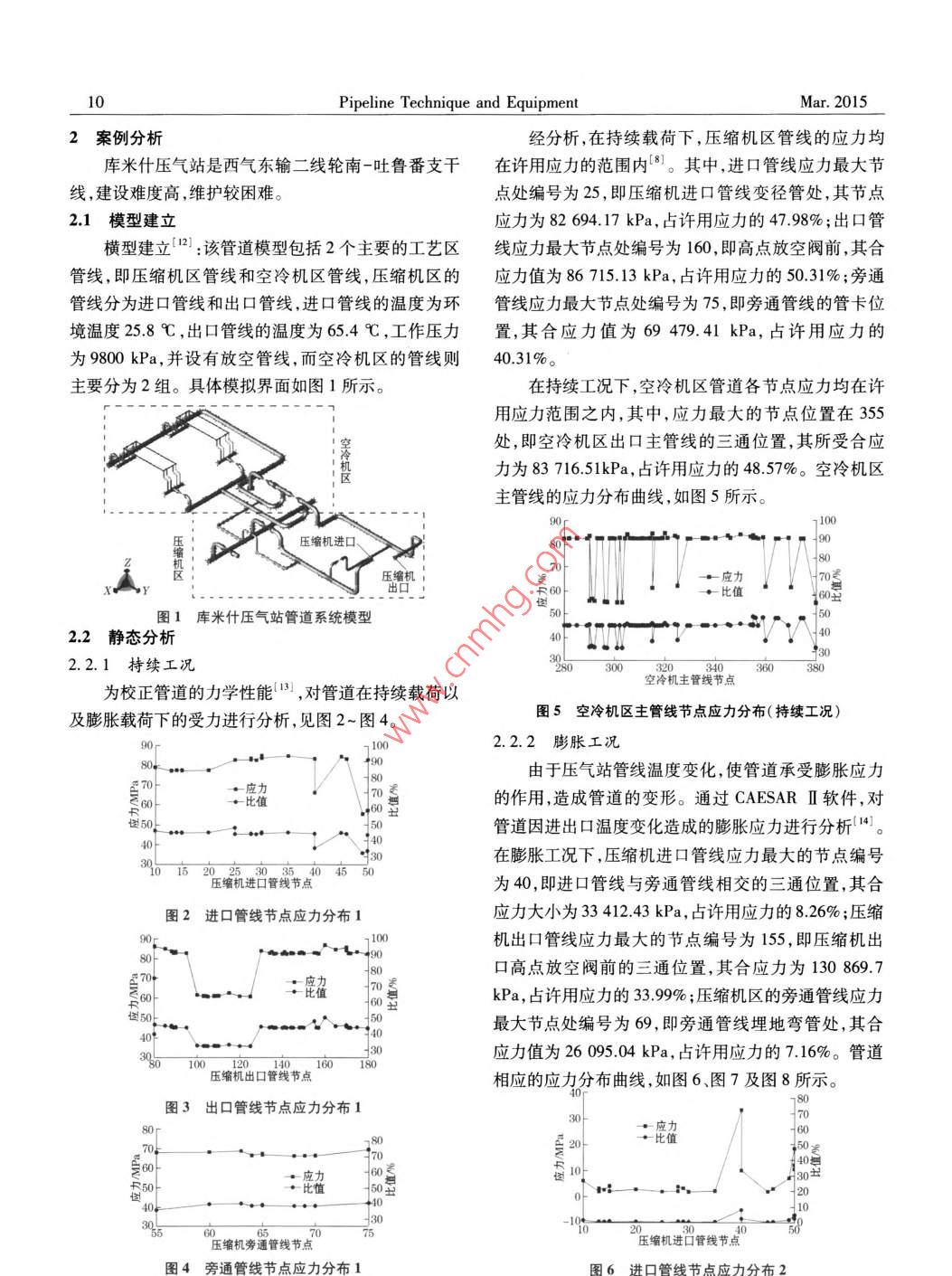 年管道技術(shù)5設(shè)2015第2期Pipeline Technique and EquipmentNo. 2天然氣站場管道應(yīng)力分析王迪,劉恩斌(西南石油大學(xué)石油與天然氣工程學(xué)院流體熱工教研室,四川成都610500摘要:文中以西氣東輸二線庫米什壓氣站為例,運(yùn)用 CAESARⅡ有限元分析軟件對(duì)壓氣站管道進(jìn)行靜態(tài)分析及動(dòng)態(tài)分析。其中,靜態(tài)分析校核了管道模型在持續(xù)工況及膨脹工況下的節(jié)點(diǎn)應(yīng)力,并計(jì)算出壓縮機(jī)進(jìn)出口管道在操作工況下的位移和約束力。由校核結(jié)果可知,管道系統(tǒng)應(yīng)力均在許用范圍內(nèi),最大應(yīng)力節(jié)點(diǎn)為壓縮機(jī)出口管線的放空閥處。動(dòng)態(tài)分析求解了管道的前5階固有頻率,并針對(duì)固有頻率較低的位置,提出了相應(yīng)的措施,最終將管道的固有頻率提高到11.277Hz,使管道的振動(dòng)控制在合理范圍內(nèi)。關(guān)鍵詞:西氣東輸二線工程;應(yīng)力分析; CAESARⅡ;壓縮機(jī);固有頻率中圖分類號(hào):TE8文獻(xiàn)標(biāo)識(shí)碼:B文章編號(hào):1004-9614(2015)02-0009-04Stress Analysis of Natural Gas Station PipelinesWANG Di LIU En-binFluid Thermal Teaching Section, Oil and Natural Gas Engineering DepartmentSouthwest Petroleum University, Chengdu 610500, China)Abstract: Based on the Kumishi compressor station of the second west-east gas pipeline project, this paper analyzed bothstatic and dynamic status of the pipeline system by the use of finite software CAESAR I. Among which, the static analysisecked the node stress under sustainable and expansion condition and figured out the displacements and constraint forces of thees underwhile the dynamic analysis solved the first five natural frequencies of the pipe-line Through the static reports, the stress of pipeline system is within the allowable stress range under the sustainable and expatsion condition, and the highest stress node is at the vent valve of the compressor export pipeline. As for the results of dynamic aalysis, this paper provided measures in allusion to those lower natural frequencies and improved the natural frequency to 11. 277Hz,thus controlled the vibration of pipeline systeKey words: the second west-east gas pipeline project; stress analysis; CAESAR I; compressor; natural frequency0引言形式7由于燃?xì)夤艿栏采w面廣,輸送介質(zhì)特殊,所以輸(2)驗(yàn)證管道的一次應(yīng)力以及二次應(yīng)力,保證其氣管道的安全、穩(wěn)定非常重要。20世紀(jì)90年代,西南在應(yīng)力許用范圍內(nèi)8;石油大學(xué)的鄧道明通過基礎(chǔ)理論對(duì)管道強(qiáng)度進(jìn)行研(3)求解管道的固有頻率,避免管道發(fā)生共振;究口;中國石化蘭州設(shè)計(jì)院邱令國提出快速判斷管道(4)運(yùn)用 CAESARⅡ有限元應(yīng)力分析軟件,提高受力的方法:;2001年, M. D Chapetti和J. L Otegui等整個(gè)分析過程的精確度。對(duì)埋地天然氣管道在進(jìn)行套管維修時(shí)的應(yīng)力狀態(tài)進(jìn)管道應(yīng)力分析的主要內(nèi)容行了全面的實(shí)驗(yàn)分析3;2014年, Erwin gamboa和Mi管道系統(tǒng)應(yīng)力分析主要包括靜態(tài)分析和動(dòng)態(tài)分chael giuliani運(yùn)用ⅹ射線的微斷層攝影技術(shù)觀測了低析0。在靜態(tài)分析過程中,主要校核管道在持續(xù)工碳鋼管道表面以下應(yīng)力腐蝕開裂情況。為了保證況和膨脹工況下的應(yīng)力,在應(yīng)力超標(biāo)的管段,通過改管道運(yùn)行的安全性,有必要對(duì)管道系統(tǒng)的應(yīng)力進(jìn)行分變管道走向增加管道柔性,使其滿足許用應(yīng)力范析56。因此,文中主要進(jìn)行以下分析圍,并且計(jì)算操作工況下管道的約束反力以及位移,(1)通過管道的應(yīng)力分析確定合理的配管避免管道因過大位移從支墩或管架上滑落。動(dòng)態(tài)分析主要進(jìn)行固有頻率求解,通常取前5階固有頻率,因Pipeline Technique and EquipmentMar.20152案例分析經(jīng)分析,在持續(xù)載荷下,壓縮機(jī)區(qū)管線的應(yīng)力均庫米什壓氣站是西氣東輸二線輪南-吐魯番支干在許用應(yīng)力的范圍內(nèi)。其中,進(jìn)口管線應(yīng)力最大節(jié)線,建設(shè)難度高,維護(hù)較困難。點(diǎn)處編號(hào)為25,即壓縮機(jī)進(jìn)口管線變徑管處,其節(jié)點(diǎn)21模型建立應(yīng)力為82694.17kPa,占許用應(yīng)力的47.98%;出口管橫型建立12:該管道模型包括2個(gè)主要的工藝區(qū)線應(yīng)力最大節(jié)點(diǎn)處編號(hào)為160,即高點(diǎn)放空閥前,其合管線,即壓縮機(jī)區(qū)管線和空冷機(jī)區(qū)管線,壓縮機(jī)區(qū)的應(yīng)力值為86715.13kPa,占許用應(yīng)力的50.31%;旁通管線分為進(jìn)口管線和出口管線,進(jìn)口管線的溫度為環(huán)管線應(yīng)力最大節(jié)點(diǎn)處編號(hào)為75,即旁通管線的管卡位境溫度25.8℃,出口管線的溫度為654℃,工作壓力置,其合應(yīng)力值為69479.41kPa,占許用應(yīng)力的為9800kPa,并設(shè)有放空管線,而空冷機(jī)區(qū)的管線則40.31%。主要分為2組。具體模擬界面如圖1所示在持續(xù)工況下,空冷機(jī)區(qū)管道各節(jié)點(diǎn)應(yīng)力均在許用應(yīng)力范圍之內(nèi),其中,應(yīng)力最大的節(jié)點(diǎn)位置在355處,即空冷機(jī)區(qū)出口主管線的三通位置,其所受合應(yīng)力為8371651kPa,占許用應(yīng)力的4857%??绽錂C(jī)區(qū)主管線的應(yīng)力分布曲線,如圖5所示。壓縮機(jī)進(jìn)口應(yīng)力比值圖1庫米什