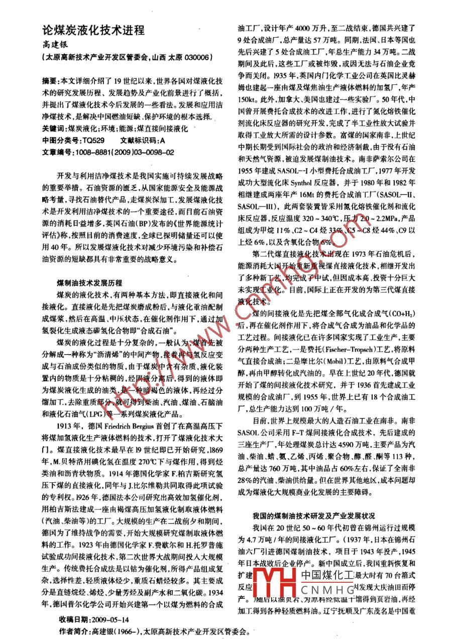 論煤炭液化技術(shù)進(jìn)程油工廠,設(shè)計(jì)年產(chǎn)4000萬升,至二戰(zhàn)結(jié)束,德國共興建了高建銀9處合成油廠.總產(chǎn)量達(dá)s7萬噸。同期,法國、日本等國也(太原高新技術(shù)產(chǎn)業(yè)開發(fā)區(qū)管委會,山西太原03000)先后興建了5處合成油工廠,年總生產(chǎn)能力34萬噸。二戰(zhàn)期間及此后,這些工廠或被炸毀,或因無法與石油企業(yè)競摘要:本文詳細(xì)介紹了19世紀(jì)以來,世界各國對煤液化技爭而關(guān)閉。1935 年,英國內(nèi)門化學(xué)T.業(yè)公司在英國比靈赫術(shù)的研究發(fā)展歷程、發(fā)展趨勢及產(chǎn)業(yè)化前最進(jìn)行了概括,姆也建起- ~座由煤及煤焦油生產(chǎn)液體燃料的加氫廠,年產(chǎn)并提出了煤液化技術(shù)今后發(fā)展的一些看法。 發(fā)展和應(yīng)用潔1S0kt。此外.加拿大、美國也建過- - 些實(shí)驗(yàn)廠。50年代,中凈煤技術(shù),是解決中國燃油短缺保護(hù)環(huán)境的根本選擇,國曾開展費(fèi)托合成技術(shù)的改進(jìn)工作,進(jìn)行了氮化熔鐵催化關(guān)鍵詞:煤炭液化;環(huán)境;能源;煤直接間接液化劑流化宋反應(yīng)器的研究開發(fā).完成了半工業(yè)性放大試驗(yàn)并中圈分類號:TQ529文獻(xiàn)標(biāo)識碼:A取得工業(yè)放大所需的設(shè)計(jì)參數(shù)。富煤的國家南非.上世紀(jì)文章編號:1008- 888(2009 )03- 0098- 02中期長期受到國際社會的政治和經(jīng)濟(jì)制裁,由于沒有石油和天然氣資源,被迫發(fā)展煤制油技術(shù)。南非薩索爾公司在開發(fā)與利用潔凈煤技術(shù)是我國實(shí)施可持續(xù)發(fā)展戰(zhàn)略1955 年建成SASOL -1小型費(fèi)托合成油T廠,1977年開發(fā)的重要舉措。石油資源的避乏,從國家能源安全及能源戰(zhàn)成功大型流化床Synthol 反應(yīng)器,并于1980年和1982年略考量,尋找石油替代產(chǎn)品,走煤炭深加工,發(fā)展煤液化技相繼建成兩座年產(chǎn)16ML的費(fèi)托合成油T.J廠(SASOL- -u、術(shù)是開發(fā)利用潔凈煤技術(shù)的-個(gè)重要途徑.而目前石油資SASOL- 11), 此兩套裝置皆采用氯化熔鐵催化劑和流化源的消耗日益增多.英國石油(BP)發(fā)布的《世界能源統(tǒng)計(jì)床反應(yīng)器,反應(yīng)溫度320~ 340心,壓力2.0~2.2MPa,產(chǎn)品評估)稱.按照目前的消費(fèi)速度,全球已探明儲量還可以使組成為甲烷11% .C2~C4烴33% .C5-C8經(jīng)44%、c9以用40年。所以發(fā)展煤液化技術(shù)對減少環(huán)境污染和補(bǔ)償石上烴6% ,以及含氧化合物6%。油資源的短缺都具有非常重要的戰(zhàn)略意義。第二代煤直接液化技術(shù)出現(xiàn)在1973年石油危機(jī)后,能源消耗大國開始重新重視煤直接液化技術(shù),相繼開發(fā)出煤制油技術(shù)發(fā)展歷程了多種新工藝,均完成了中試,但因成本高投資十分巨大煤炭的液化技術(shù),有兩種基本方法,即直接液化和間未實(shí)現(xiàn)工業(yè)化。目前,國際上正在開發(fā)的為第三代煤直接接液化。直接液化是先把煤炭磨成粉后,與液化重油配制液化技術(shù)。成煤漿然后在高溫、中壓狀態(tài),在催化劑作用下,通過加煤的間接液化是先把煤全部氣化成合成氣(CO+H)氫裂化生成液態(tài)碳?xì)浠衔锛础昂铣墒汀?。?再在催化劑作用下,將合成氣合成為油品和化學(xué)品的煤炭的液化過程是十分復(fù)雜的,一般認(rèn)為.煤首先被工藝過程。間接液化已在許多國家實(shí)現(xiàn)了工業(yè)生產(chǎn),主要,分解成-種稱為“瀝清烯”的中間產(chǎn)物,接著再與氫反應(yīng)變分兩種生產(chǎn)工藝, -是費(fèi)托(Fischer- Tmpech)I藝,將原料成與石油成份類似的物質(zhì),由于媒炭中含有雜質(zhì),液化裝氣直接合成油;二是摩比爾( Mobi)工藝,由原料氣合成甲置內(nèi)的物質(zhì)是十分粘稠的.經(jīng)固液分離后,得到的液體即醇.再由甲醇轉(zhuǎn)化成汽油的。早在上:世紀(jì)20年代,德國就為煤炭液化生成的油類.是一種暗褐色的液體.再經(jīng)過分開始了煤的間接液化技術(shù)研究,并于1936首先建成工業(yè)餾加T.去除重質(zhì)部分就可得到柴油.汽油.煤油、石腦油規(guī)模的合成油廠.到1955年,世界上已有18個(gè)合成油工和液化石油氣(LPC)等- -系列煤炭液化產(chǎn)品。廠,總生產(chǎn)能力達(dá)到100萬噸/年。1913年,德閏Fiedich Brgju首創(chuàng)了在高溫高壓下目前,世界上規(guī)模最大的人造石油工業(yè)在南非。南非將煤加氫液化生產(chǎn)液體燃料的技術(shù),打開了煤液化技術(shù)大SASOL公司采用F-T煤間接液化合成技術(shù),先后建成的門。煤直接液化技術(shù)最早在19世紀(jì)即已開始研究.1869.三座生產(chǎn)廠,年處理煤炭總計(jì)達(dá)4590萬噸,主要產(chǎn)品為汽年,M.貝特濟(jì)用碘化氫在溫度270C下與煤作用,得到烴油 、柴油蠟.氨.乙烯、丙婼.聚合物、醇醛,酮等113種,類油和瀝青狀物質(zhì)。1914年德國化學(xué)家F.柏吉斯研究氫總產(chǎn)放達(dá)760萬噸,其中油品占60%左右,保證了全南非壓下煤的自接液化,同年與J.比爾維勒共同取得此項(xiàng)試驗(yàn)28%的汽油 柴油供給量。但在世界其他地區(qū),成本問題卻的專利權(quán)。1926年,德國法本公司研究出高效加氫催化劑,成為煤液化大規(guī)模商業(yè)化發(fā)展的主要障礙。用柏吉斯法建成- -座由褐煤高壓加氫液化制取液體燃料(汽油柴油等)的工廠。大規(guī)模的生產(ch
