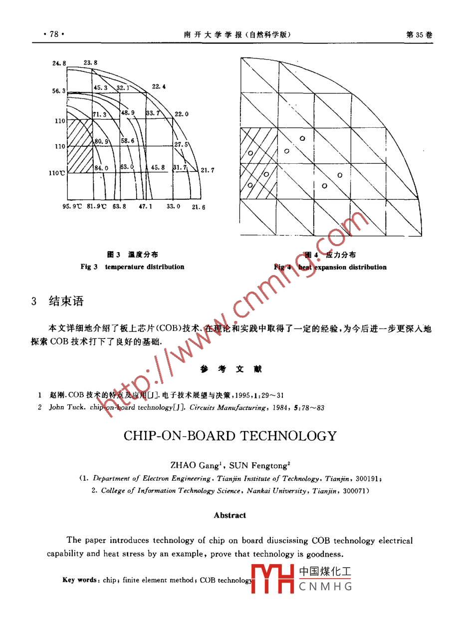 第35卷第4期南開(kāi)大學(xué)學(xué)報(bào)(自然科學(xué))Vol. 35 Ne42002年12月Acta Scientiarum Naturalium U niversitatis NankaiensisDec.2002文章編號(hào): 0465-7942(2002)04-0076-03COB技術(shù)趙剛'孫風(fēng)桐2(1.天津理工學(xué)院電子系,天津,300191; 2.南開(kāi)大學(xué)信息技術(shù)科學(xué)學(xué)院,天津,300071)摘要本文介紹了板上芯片技術(shù).通過(guò)一個(gè)實(shí)例討論了COB技術(shù)的電氣性能和熱應(yīng)力的分析,證明該技術(shù)是優(yōu)良的.關(guān)鍵詞:芯片;有限元;板上芯片中圈分類號(hào): TP331文獻(xiàn)標(biāo)識(shí)碼: A0引言表面組裝技術(shù)(SMT)是當(dāng)今電子組件的一種全新的技術(shù),它是將微小型的無(wú)引線元器件或引線極短的元器件,直接焊在印制電路板上.采用表面組裝技術(shù)制作的電路具有體積小,重量輕,功能強(qiáng)等特點(diǎn).作.為表面組裝技術(shù)的最新發(fā)展,板上芯片(chiponboard,COB)技術(shù)將進(jìn)-步提高電子組件的組裝密度,降低成本,縮小和減輕電子組件的體積和重量.COB技術(shù)發(fā)展的動(dòng)力是產(chǎn)品小型化的需要,因而COB技術(shù)特別適用于消費(fèi)產(chǎn)品,在日本和美國(guó)該項(xiàng)技術(shù)得到了廣泛的應(yīng)用.1 COB的結(jié)構(gòu)與工藝COB技術(shù)是將裸露的IC芯片直接貼裝在印刷電路板上,通過(guò)鍵合線與電路板鍵合,然后進(jìn)行芯片的鈍化和保護(hù).板.上芯片的結(jié)構(gòu)如圖1所示.COB技術(shù)工藝可以分為兩大。步驟,即IC芯片的引線鍵合和印化保護(hù).在放置IC芯片前,先將導(dǎo)電粘chip 芯片PCB合劑印刷在印制電路板上,將IC芯片貼裝好,把粘合劑固化,而后用引一線將IC芯片的壓焊位連接在印制電路板的焊盤(pán)上,所以與其它技術(shù)不圈1 COB 技術(shù)的結(jié)構(gòu)同的是,COB技術(shù)需要在COB組件上制備兩個(gè)焊點(diǎn)(一個(gè)在IC芯片F(xiàn)ig 1 Structure of CoB technology上,另一個(gè)在印制電路板上).引線鍵合是將裸露的IC芯片與印制電路板相連接的過(guò)程,該工序的目的是使裸鱷的IC芯片通過(guò)梁式引線與印制電路板有可靠的電氣鍵合.在COB技術(shù)中對(duì)裸露的IC芯片要進(jìn)行鈍化和保護(hù),這也是COB技術(shù)工藝中最重要的一環(huán),在對(duì)裸露的IC芯片進(jìn)行鈍化保護(hù)技術(shù)工藝中,最常用的是采用環(huán)氧樹(shù)脂的熱固性塑料對(duì)裸露的IC芯片進(jìn)行保護(hù)和封裝.2 COB技術(shù)的應(yīng)用中國(guó)煤化工本文討論了在COB技術(shù)中的兩個(gè)問(wèn)題,一是COB技MHCN MH C題和體積與通孔插裝的比較,二是在COB技術(shù)中一直被人們所關(guān)注的基板,芯片和密封劑的熱膨脹系數(shù)不匹配的問(wèn)題.收稿日期2001-11-27作者簡(jiǎn)介:趙剛(1952- ),男 ,天津人,高級(jí)工程師,主要從事信號(hào)分析與處理的研究第4期趙剛等:COB技術(shù)●77●2.1COB技術(shù)的電氣性能.Ve通過(guò)制作一對(duì)數(shù)放大器組件,來(lái)R3實(shí)現(xiàn)COB技術(shù).對(duì)數(shù)放大器原理圖如圖2所示,原理圖中的電阻、電容,除了熱敏電阻R5,電位器R8,和二極管外,其余全部采用了片式元器R4R1件,由于客觀條件所限,我們只得到o了三極管(NPN)的芯片,所以,本電.路對(duì)三極管(NPN)采用了COB技R7_馬一。R8為了實(shí)現(xiàn)組件的薄型化,把各片_R6式元件(電阻,電容),全部集中貼裝1在雙面電路板的一面,另一面集中了不能實(shí)行片式化的元件,如電阻器,圈2對(duì)數(shù)放大器原理圈熱敏電阻,二極管及體積稍大的片式Fig 2 Theory chart of logarlthm mplifier雙運(yùn)放.根據(jù)原理圖,利用上述可得到的元器件,用自動(dòng)布線軟件包進(jìn)行印制電路板的CAD設(shè)計(jì).根據(jù)設(shè)計(jì)好的電路圖做出印制電路板后,就.表1可以根據(jù)COB技術(shù)的工藝流程,進(jìn)行芯片的Table 1貼裝,固化,引線鍵合和芯片的鈍化保護(hù).全輸人0.024 0.030 0. 0870. 066誤差inputerror部元器件都組裝和密封好后,進(jìn)行特性測(cè)試.先進(jìn)行在線測(cè)試.然后進(jìn)行系統(tǒng)特性測(cè)試,檢第一組輸出1.614 1.528 1.098 0.179 3. 5%the first geroup output測(cè)其對(duì)數(shù)放大器的電氣性能.測(cè)試結(jié)果如表第二組輸出1.617 1.524 1.089 0.178 2. 7%1所示.the second geroup output由表1可見(jiàn),利用COB技術(shù)制作的對(duì)數(shù)第三組輸出1.620 1.526 1.093 0.179 3. 1%放大器組件,輸入和輸出關(guān)系- -致性良好.電the third geroup output氣性能穩(wěn)定.由表2可見(jiàn),其體積只有用通孔輸出(理論值)1.619 1.523 1.060 0. 178插裝技術(shù)的1/8,重量?jī)H為其的1/14. 證明了output (theory value)衰2COB技術(shù)的成功.Table 22.2 COB技術(shù)的熱分析.通孔插裝COB技術(shù)COB技術(shù)是將裸露的IC直接貼裝在印through hole fitCOB technology刷電路板上,然后用密封劑加以密封保護(hù).由重量52. 2g3.8g.于密封劑和基板之間的熱膨脹系數(shù)不匹配,weight在功率循環(huán)和熱循環(huán)期間,它們將以不同的體積3. 9cmX3. 9cmX1. 6cm1. 7cmX 1. 8cmX0.9cm速度膨脹和收縮,這種由于熱膨脹系數(shù)和熱volume膨脹速率的差別而產(chǎn)生的應(yīng)力,作用在芯片上,在極端的情況下,會(huì)損壞芯片.通過(guò)有限元技術(shù)來(lái)分析熱應(yīng)力的分布問(wèn)題.將密封劑所覆蓋的圓形區(qū)域,用所選用的三節(jié)點(diǎn)三角形單元,劃分成有限元網