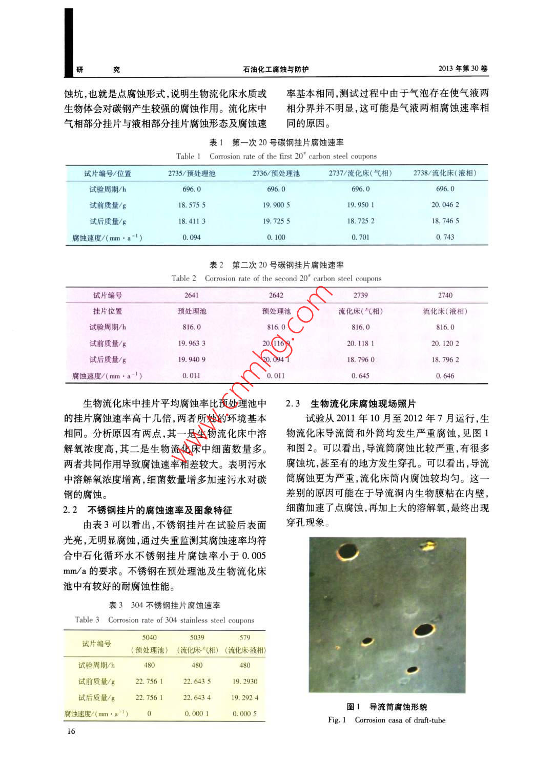 2013年第30卷第5期石油化工腐蝕與防護(hù) CORROSION& PROTECTION IN PETROCHEMICAL INDUSTRY研乙二醇污水對(duì)碳鋼的腐蝕性研究曹玉紅!,劉獻(xiàn)玲,張建成,吳平2,童海定2(1.中石化洛陽(yáng)工程有限公司,河南洛陽(yáng)4710032.中國(guó)石化上海石油化工股份有限公司,上海金山201508)摘要:生物流化床反應(yīng)器是一種高效好氧水處理設(shè)備,用于乙二醇污水處理時(shí)效果良好。但在試驗(yàn)過(guò)程中,發(fā)現(xiàn)碳鋼材質(zhì)的反應(yīng)器腐蝕嚴(yán)重。根據(jù)碳鋼掛片在不冏條件下的腐蝕速率,研究腐蝕發(fā)展程度和表面形貌圖像特征的關(guān)系。重點(diǎn)通過(guò)不同條件下乙二醇污水對(duì)碳鋼、不銹鋼掛片的腐蝕速率對(duì)比,探討其腐蝕機(jī)理,說(shuō)明生物流化床處理乙二醇污水設(shè)備中腐蝕以點(diǎn)腐蝕為主的特征。結(jié)果表明,處理乙二醇污水生物流化床反應(yīng)器選用碳鋼材質(zhì)腐蝕較嚴(yán)重,且表面形成較深的腐蝕坑,設(shè)備需要做防腐蝕處理或選用其它耐腐蝕材質(zhì)。不銹鋼材質(zhì)在處理乙二醇污水生物流化床反應(yīng)器中具有較好的抗腐蝕能力。關(guān)鍵詞:乙二醇污水腐蝕速率碳鋼點(diǎn)腐蝕中圖分類號(hào):TG174.4文獻(xiàn)標(biāo)識(shí)碼:A文章編號(hào):1007-015X(2013)05-0015-03乙二醇污水中的主要污染物是乙二醇、二號(hào)碳鋼材質(zhì),每次掛入4片,分別掛在預(yù)處理池水乙二醇、微量乙醛及堿等污染物,且生物耗氧量中及生物流化床池水中。按標(biāo)準(zhǔn)操作方法,掛片掛(BOD)與化學(xué)耗氧量(COD)的比值為0.4入前經(jīng)過(guò)脫脂、除油處理,掛片不經(jīng)過(guò)預(yù)膜。測(cè)試0.6,生化性較好,適合采用好氧生化法進(jìn)行處過(guò)程中預(yù)處理池中的掛片浸沒在水中,流化床掛片理,但好氧生化處理過(guò)程中乙二醇、二乙二醇、一片浸沒水中,另一片在水面上,分別測(cè)試液相及乙醛等可能被氧化成酸性物質(zhì),再加上一定濃氣相部分腐蝕速率。測(cè)試結(jié)束后將掛片取出,通過(guò)度的溶解氧,對(duì)碳鋼設(shè)備腐蝕嚴(yán)重。生物流化酸洗、除銹、干燥稱重后,計(jì)算腐蝕速率。床處理乙二醇污水設(shè)備的材質(zhì)為碳鋼,床內(nèi)介不銹鋼掛片(0Crl8NgTi)處理方式與碳鋼相質(zhì)是乙二醇污水、聚乙烯填料及生物膜和空氣,同,掛入日期為2012年6月7日,共掛入3片,溶解氧一般在3~5mg/L,溫度為15-35℃,在片掛入預(yù)處理池,另外2片掛在生物流化床池中。10個(gè)月試驗(yàn)運(yùn)行過(guò)程中,腐蝕嚴(yán)重,影響整個(gè)設(shè)2012年6月28日掛片取出,經(jīng)硝酸溶液處理后備的安全運(yùn)行和使用受命。干燥稱重,計(jì)算腐蝕速率。目前,乙二醇污水對(duì)碳鋼腐蝕的研究較少。本文通過(guò)分析相同環(huán)境下不同材質(zhì)的腐蝕程度及2結(jié)果與討論其相同時(shí)間下不同腐蝕環(huán)境的碳鋼試片形貌特2.1碳鋼掛片的腐蝕速率征,探討腐蝕發(fā)展程度,以期為生物流化床工業(yè)化中國(guó)石化集團(tuán)對(duì)碳鋼在循環(huán)水中腐蝕速度監(jiān)設(shè)備選材提供參考。測(cè)要求是:化工和化纖系統(tǒng)≤0.075mm/a,煉油系統(tǒng)≤0.100mm/a。通過(guò)表1和表2對(duì)比可知1腐蝕監(jiān)測(cè)方法及過(guò)程預(yù)處池中的掛片腐蝕速率平均為0.054mm/a,兩腐蝕監(jiān)測(cè)采用中國(guó)石油化工總公司生產(chǎn)部次測(cè)試雖有一定波動(dòng),但腐蝕速率可達(dá)到煉油系《冷卻水分析和試驗(yàn)方法》—現(xiàn)場(chǎng)腐蝕掛片測(cè)統(tǒng)腐蝕控制要求。生物流化床中掛片平均腐蝕率試法掛片狀態(tài)模擬設(shè)備狀態(tài),通過(guò)掛片的失重監(jiān)為0.68mm/a,掛片腐蝕較嚴(yán)重,表面有明顯的腐測(cè)相關(guān)材質(zhì)在系統(tǒng)中的腐蝕速率。掛片于2012年2月14日第一次掛入,2012年收稿日期:2013-04-07;修改稿收到日期:2013-05-27。3月14日取出:2012年3月14日第二次掛入,2012作者簡(jiǎn)介:曹玉紅(1978-),碩士高級(jí)工程師,一直從事環(huán)保年4月17日取出。這兩次掛入的掛片均選用20研究。聯(lián)系電話:1378318005 E-mail caoya@lpe,com石油化工腐蝕與防護(hù)013年第30卷蝕坑,也就是點(diǎn)腐蝕形式,說(shuō)明生物流化床水質(zhì)或率基本相同,測(cè)試過(guò)程中由于氣泡存在使氣液兩生物體會(huì)對(duì)碳鋼產(chǎn)生較強(qiáng)的腐蝕作用。流化床中相分界并不明顯,這可能是氣液兩相腐蝕速率相氣相部分掛片與液相部分掛片腐蝕形態(tài)及腐蝕速同的原因。表1第一次20號(hào)碳鋼掛片腐蝕速率Table 1 Corrosion rate of the first 20 carbon steel coupons試片編號(hào)/位置2735/預(yù)處理池2736/預(yù)處理池2737/流化床(氣相)2738/流化床(液相)試驗(yàn)周期/h96.0696.0696.0696.0試前質(zhì)量/18.575519.900520.0462試后質(zhì)量/g18.411319.725518.725218.7465腐蝕速度/(mm·a-1)0.0940.1000.7010.743表2第二次20號(hào)碳鋼掛片腐蝕速率Table 2 Corrosion rate of the second 20" carbon steel coupons試片編號(hào)26412739掛片位置預(yù)處理池預(yù)處理池流化床(氣相流化床(液相)試驗(yàn)周期/h816.0816.0816.0816.0試前質(zhì)量/g19.96330.116920.Il8120.1202試后質(zhì)量/g19.940920.09418.796018.7962腐蝕速度/(mm·a-10.0l0.0110.6450.646生物流化床中掛片平均腐蝕率比預(yù)處理池中2.3生物流化床腐蝕現(xiàn)場(chǎng)照片的掛片腐