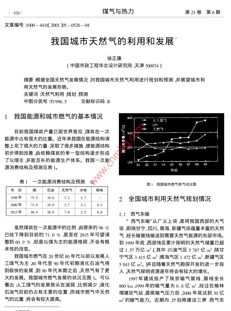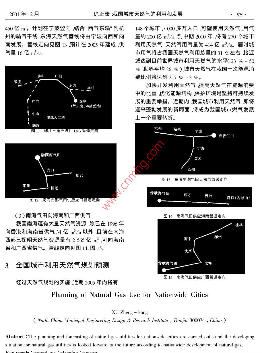 526煤氣與熱力第21卷第6期文章編號:1000-44162001)5-0526-04我國城市天然氣的利用和發(fā)展徐正康中國市政工程華北設(shè)計研究院天津300074)摘要根據(jù)全國夭然氣發(fā)展情況對我囯城市天然氣利用進行規(guī)劃和預(yù)測并展望城市利用天然氣的發(fā)展形勢關(guān)鍵詞天然氣利用覬劃預(yù)測中圖分類號:U996.5文獻標(biāo)識碼B1我國能源和城市燃氣的基本情況人工煤氣目前我國煤炭產(chǎn)量已居世界首位煤炭在一次90天然氣能源中占有很大的比重。近年來我國在能源結(jié)構(gòu)調(diào)整上花了很大的力量采取了很多措施使能源結(jié)構(gòu)初步得到改善由依賴煤炭的單一型結(jié)構(gòu)逐步形成/都20了以煤主多能互補的能源生產(chǎn)體系。我國一次能源消費結(jié)構(gòu)及預(yù)測見表1。91g2999697駙8"99表1一次能源消費結(jié)構(gòu)及預(yù)測%圖1我國城市燃氣供氣狀況圖石油天然氣水電核電1998年73.518.62全國城市利用天然氣規(guī)劃情況200年71.02.72.1015年2.1西氣東輸西氣東輸”"從廣義上講是將我國西部的大氣雖然煤炭在一次能源中的比例由原來的96%田即陜甘寧、四川、青海、新疆氣田蘊量豐富的天然已經(jīng)下降到目前的71.0%甚至在2015年可望調(diào)氣經(jīng)長輸管線輸送到需要天然氣能源的東部市場。整到60.9%但是以煤為主的能源格局不會有根到199年底西部地區(qū)累計探明的天然氣儲量已超本性的改變。過1.57萬億m3(其中川渝氣區(qū)5787億m3陜甘我國城市燃氣在20世紀80年代以前以發(fā)展人寧氣區(qū)3415億m3青海氣區(qū)1472億m3新疆氣區(qū)工煤氣為主80年代至90年代初期液化石油氣得5043億m3肼并且隨著天然氣勘探開發(fā)的進一步投到極快的發(fā)展到90年代末期之后天然氣有了更入天然氣探明資源逐年將會有較大的增長。大的發(fā)展。我國城市燃氣發(fā)展的狀況見圖1??梢?997年建成投產(chǎn)了陜京輸氣管線,管線全長看出次工煤氣的發(fā)展勢頭在減弱比例減少液化860km1999年的輸氣量為6.8億m3經(jīng)過在榆林石油氣目前仍占有主要的位置而城市燃氣中天然增建加氣站提高輸氣壓力后2000年底達到30億氣的比重將會有較大提高。m3的輸氣能力。近期內(nèi),計劃再建設(shè)三條西氣東2001年12月徐正康我國城市天然氣的利用和發(fā)展527輸”輸氣管線市。輪南-武威全長1993km見圖4武威-靖1)青海澀北至甘肅蘭州的輸氣管線向西寧、邊全長592km見圖5清邊-鄭州全長692km,見蘭州地區(qū)供氣。全長953km輸氣能力20億m3總圖6鄭州-上海全長890km見圖7。另外在鄭州投資約25億元3月30日正式開工建設(shè)計劃2001-上海段規(guī)劃了三條支管線即安徽定遠至合肥支年10月建成。管道走向見圖2。線、常州至浙江杭州支線、南京至蕪湖支線。長江跨越將是本工程中關(guān)鍵項目經(jīng)過安徽蕪湖、南京西側(cè)板橋及南京東側(cè)三江口三個過江方案的充分比選初步確定三江口為首選的長江跨越地點?!蔽鳉鈻|輸”主輸氣干管的管徑確定為φ1016m全線同徑輸氣壓力為10.0MPa材質(zhì)X70管道有內(nèi)涂層(2)重慶忠縣至湖北武漢的輸氣管線向湖北、輪南首站湖南地區(qū)供氣全長738km,管徑711m,設(shè)計壓庫爾勒善哈密力6.4MPa輸氣能力30億m3總投資約30億元國家計委于2000年8月正式批準(zhǔn)忠-漢”天然氣管道工程項目建議書。中外合作建設(shè)預(yù)計2001開嘉裕關(guān)工要求在2002年建成。除忠一漢主干管之外,另外規(guī)劃了三條支線:武昌-黃石技枝江-荊門-襄張掖樊潛江-長沙。管道走向見圖3圖4西氣東輸塔里木至上溆輪南-武威段蒼道走向荊門川渝氣H利川官昌寧癌安堡忠縣恩施黃石株州靖邊東輸忠縣至武漢管道走向子長3)新疆塔里木至上海的輸氣管線途經(jīng)九省市向華東地區(qū)供氣全長約4000km輸氣能力120億m3。長輸管線投資約400億元以上包括上、下游其它相關(guān)項目的建設(shè)整個工程的投資規(guī)模將陽城超過1500億元。博愛目前國務(wù)院部署的西氣東輸”工程是特指由新疆塔里木到上海和長江三角洲的輸氣項目。2001圖6西氣東輸塔里木至上溆靖邊-鄭州段簷道走向年4月完成可行性研究報告和簽訂照付不議合同及為了充分確保西氣東輸”的可靠性及滿足我國對外招面引。20年建成西請邊到上海的天東部地區(qū)天然氣的需求增長計劃在200-200年然氣管線開始送氣。2004年全線貫通長輸管線的起點為新疆輪臺南部的輪南首站,從陜西靖邊到上海再建設(shè)一條復(fù)線輸氣量為80億m3/a管徑DN800煤氣與熱力第21卷第6期輸氣壓力后供應(yīng)河北、山東兩省并保證對北京的博支線管道總長度4961km其中俄羅斯境內(nèi)1960供氣量,管道走向見圖8計劃在2002年建成。陜京km中國境內(nèi)3001kmo管線并向?qū)幭暮蛢?nèi)蒙古延伸供氣走向見圖9科維克金氣田〔餓)恰楊金田(俄)定遠南京常州蘇州新烏奧楊合肥蕘湖齊齊哈爾宜興長春抗州虛線為二期榆林加壓站至韓國淄博仁川石家濟南S淄博2.3進口LNG為改善東南沿海地區(qū)經(jīng)濟增長迅速缺少能源的狀況擬在廣東省珠江三角洲地區(qū)首先引進國外呼和浩特液化天然氣資源進行LNG項目的試點。一期規(guī)模石嘴山LNG300萬t(約天然氣37.4億m3/a)二期規(guī)模增加ING200萬t(約天然氣24.9億m3/a)前期工作目前已全面啟動計劃在2005年前建成一期工程。管道全長506km管徑DN600走向見圖11圖9陜京管線
