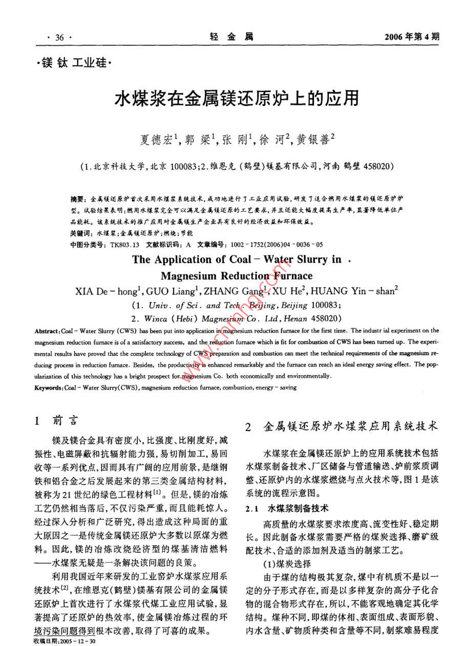 水煤漿在金屬鎂還原爐上的應(yīng)用