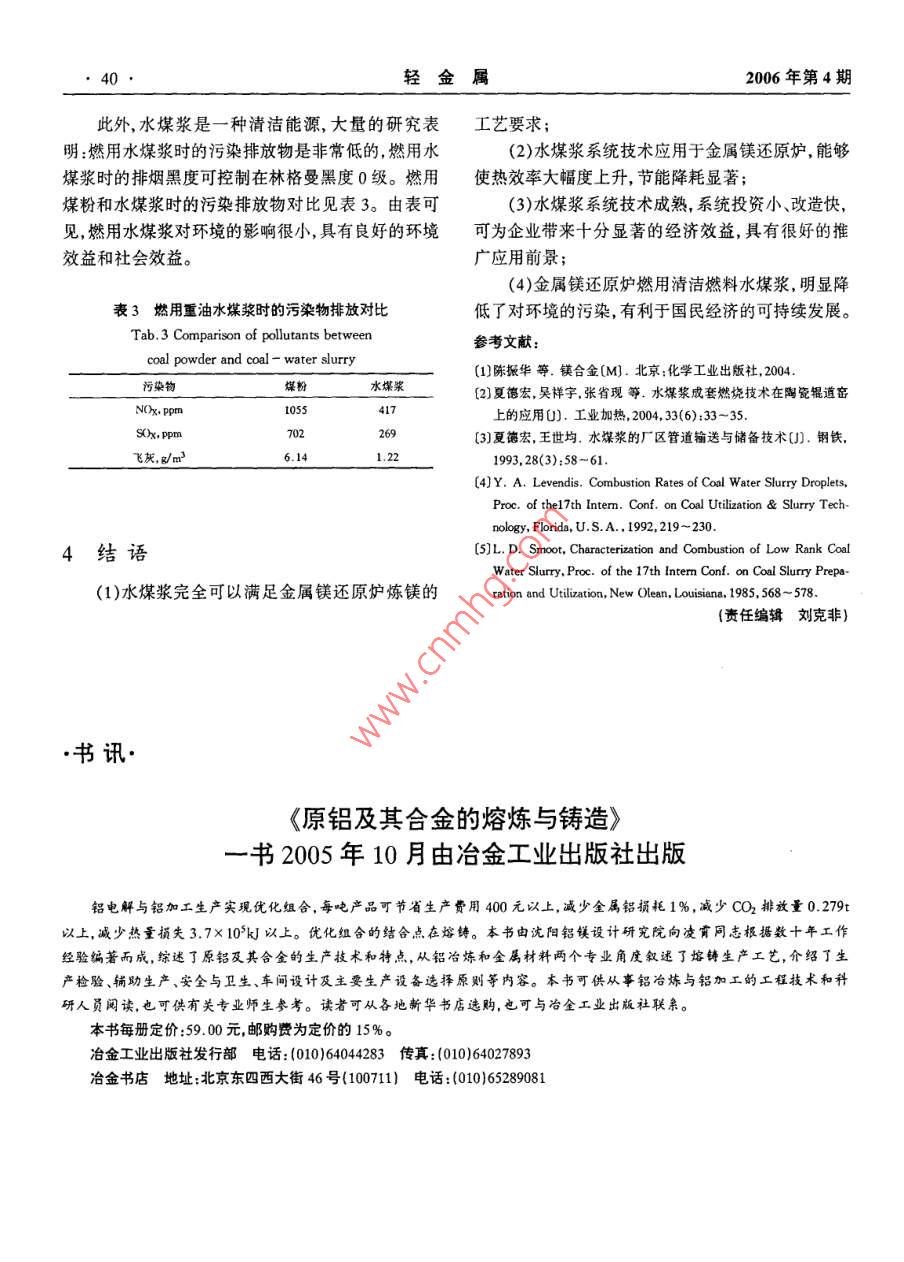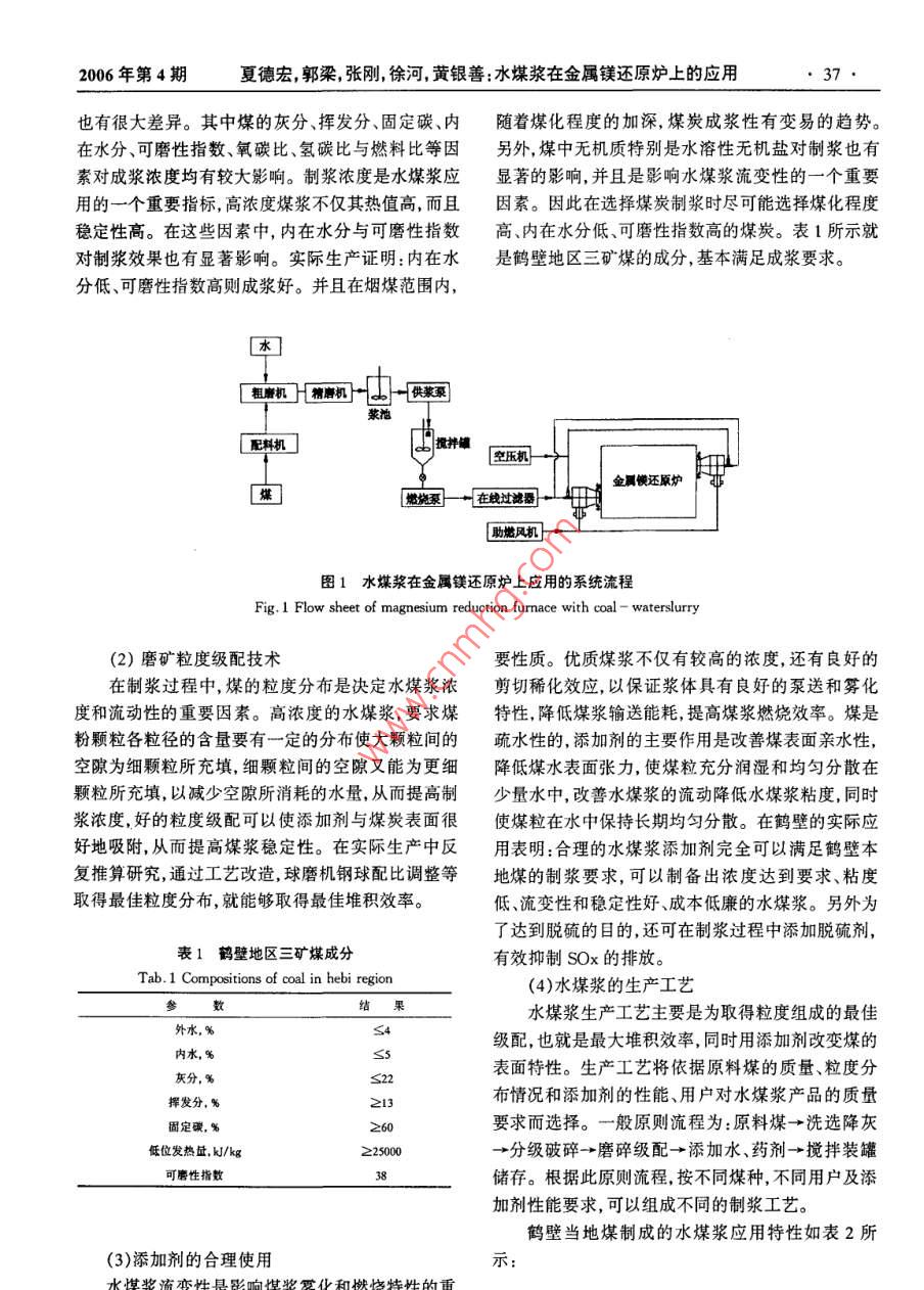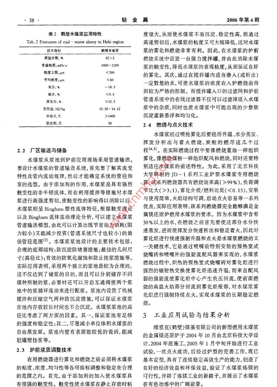 36輕金屬2006年第4期鎂鈦工業(yè)硅水煤漿在金屬鎂還原爐上的應(yīng)用夏德宏1,郭梁,張剛,徐河2,黃銀善(1.北京科技大學(xué),北京100083;2維恩克(鶴壁)鎂基有限公司,河南鶴壁458020)摘要;全屬鎂還原爐首次采用水煤漿親統(tǒng)技術(shù)進行了工業(yè)應(yīng)用試驗,研發(fā)丁逶合然用水煤漿的鎂還原爐爐型。試驗結(jié)果表明:然用水煤漿完全可以滿足金的工藝要求,并且還能大幅度提高生產(chǎn)率,顯著降低單位產(chǎn)品能耗。該親統(tǒng)技術(shù)的推廣應(yīng)用對金屬鎂生產(chǎn)企業(yè)具有良姸的經(jīng)濟效益和環(huán)保敦益關(guān)鍵詞:水煤漿;金屬鎂還原爐;燃燒;節(jié)能中圖分類號:TK803.13文獻標(biāo)識碼:A文章編號:1002-1752(2006)04-0036-05The Application of Coal- Water Slurry inMagnesium Reduction FurnaceXIA De-hong, GUO Liang, ZHANG Gang, XU He, HUANG Yin-shan2(1. Univ. of Sci. and Tech. Beijing, Beijing 1000832. Winca( Hebi ) Magnesium Co. Ltd, Henan 458020)Abstract: Coal-Water Slurry(CwS)has been put into application in magnesium reduction furnace for the first time, The industr ial experiment on themagnesium reduction furnace is of a satisfactory success, and the reduction fumace which is fit for combustion of Cws has been turned up. The experi-nental results have proved that the complete technology of CwS preparation and combustion can meet the technical requirements of the magnesium re-ducing process in reduction fumace. Besides, the productivity is enhanced remarkably and the fumace can reach an ideal energy saving effect. The pop-ularization of this technology has a bright prospect for magnesium Co, both economically and environmentallyKeywords: Coal- Water Slurry(CWS), magnesium reduction furnace, combustion, energy-saving1前言2金屬鎂還原爐水煤漿應(yīng)用糸統(tǒng)技術(shù)鎂及鎂合金具有密度小,比強度、比剛度好,減振性、電磁屏蔽和抗輻射能力強,易切削加工,易回水煤漿在金屬鎂還原爐上的應(yīng)用系統(tǒng)技術(shù)包括收等一系列優(yōu)點,因而具有廣闊的應(yīng)用前景,是繼鋼水煤漿制備技術(shù)、廠區(qū)儲備與管道輸送、爐前漿質(zhì)調(diào)鐵和鋁合金之后發(fā)展起來的第三類金屬結(jié)構(gòu)材料,整、還原爐內(nèi)的水煤漿燃燒與點火技術(shù)等圖1是該被稱為21世紀(jì)的綠色工程材料{。但是,鎂的冶煉系統(tǒng)的流程示意圖。工藝仍然相當(dāng)落后,不僅污染嚴(yán)重,而且能耗驚人。2.1水煤漿制備技術(shù)經(jīng)過深入分析和廣泛研究,得出造成這種局面的重高質(zhì)量的水煤漿要求濃度高、流變性好、穩(wěn)定期大原因之一是傳統(tǒng)金屬鎂還原爐大多數(shù)以原煤為燃長。因此制備水煤漿需要嚴(yán)格的煤炭選擇、磨礦級料。因此,鎂的冶煉改燒經(jīng)濟型的煤基清潔燃料配技術(shù)、合適的添加劑及適當(dāng)?shù)闹茲{工藝。一水煤漿無疑是一條解決該問題的良策。(1)煤炭選擇利用我國近年來研發(fā)的工業(yè)窯爐水煤漿應(yīng)用系由于煤的結(jié)構(gòu)極其復(fù)雜,煤中有機質(zhì)不是以一統(tǒng)技術(shù)2,在維恩克(鶴壁)鎂基有限公司的金屬鎂定的分子形式存在,而是以多樣復(fù)雜的高分子化合還原爐上首次進行了水煤漿代煤工業(yè)應(yīng)用試驗,顯物的混合物形式存在,所以,不能客觀地確定其化學(xué)著提高了還原爐的熱效率,使金屬鎂冶煉過程的環(huán)結(jié)構(gòu)。煤種不同,即煤的體相、表面組成、表面形貌境污染問題得到根本改善取得了可喜的成果。內(nèi)水含量、礦物質(zhì)種類和含量等不同,制漿難易程度收稿日期:2005-12-302006年第4期夏德宏,郭梁張剛徐河,黃銀善:水煤漿在金屬鎂還原爐上的應(yīng)用37也有很大差異。其中煤的灰分、揮發(fā)分、固定碳、內(nèi)隨著煤化程度的加深,煤炭成漿性有變易的趨勢。在水分、可磨性指數(shù)、氧碳比、氫碳比與燃料比等因另外,煤中無機質(zhì)特別是水溶性無機鹽對制漿也有素對成漿濃度均有較大影響。制漿濃度是水煤漿應(yīng)顯著的影響,并且是影響水煤漿流變性的一個重要用的一個重要指標(biāo),高濃度煤漿不僅其熱值高,而且因素。因此在選擇煤炭制漿時盡可能選擇煤化程度穩(wěn)定性高。在這些因素中,內(nèi)在水分與可磨性指數(shù)高、內(nèi)在水分低、可磨性指數(shù)高的煤炭。表1所示就對制漿效果也有顯著影響。實際生產(chǎn)證明:內(nèi)在水是鶴壁地區(qū)三礦煤的成分,基本滿足成漿要求。分低、可磨性指數(shù)高則成漿好。并且在煙煤范圍內(nèi),}糖時士配料機攪拌「空壓機金屬還原爐是具圖1水煤漿在金屬鎂還原爐上應(yīng)用的系統(tǒng)流程Fig. l Flow sheet of magnesium reduction furnace with coal-waterslurry(2)磨礦粒度級配技術(shù)要性質(zhì)。優(yōu)質(zhì)煤漿不僅有較高的濃度,還有良好的在制漿過程中,煤的粒度分布是決定水煤漿濃剪切稀化效應(yīng),以保證漿體具有良好的泵送和霧化度和流動性的重要因素。高濃度的水煤漿,要求煤特性,降低煤漿輸送能耗,提高煤漿燃燒效率。煤是粉顆粒各粒徑的含量要有一定的分布使大顆粒間的疏水性的,添加劑的主要作用是改善煤表面親水性,空隙為細(xì)顆粒所充填,細(xì)顆粒間的空隙又能為更細(xì)降低煤水表面張力,使煤粒充分潤濕和均勻分散在顆粒所充填,以減少空隙所消耗的水量,從而提高制少量水中,改善水煤漿的流動降低水煤漿粘度,同時漿濃度,好的粒度
