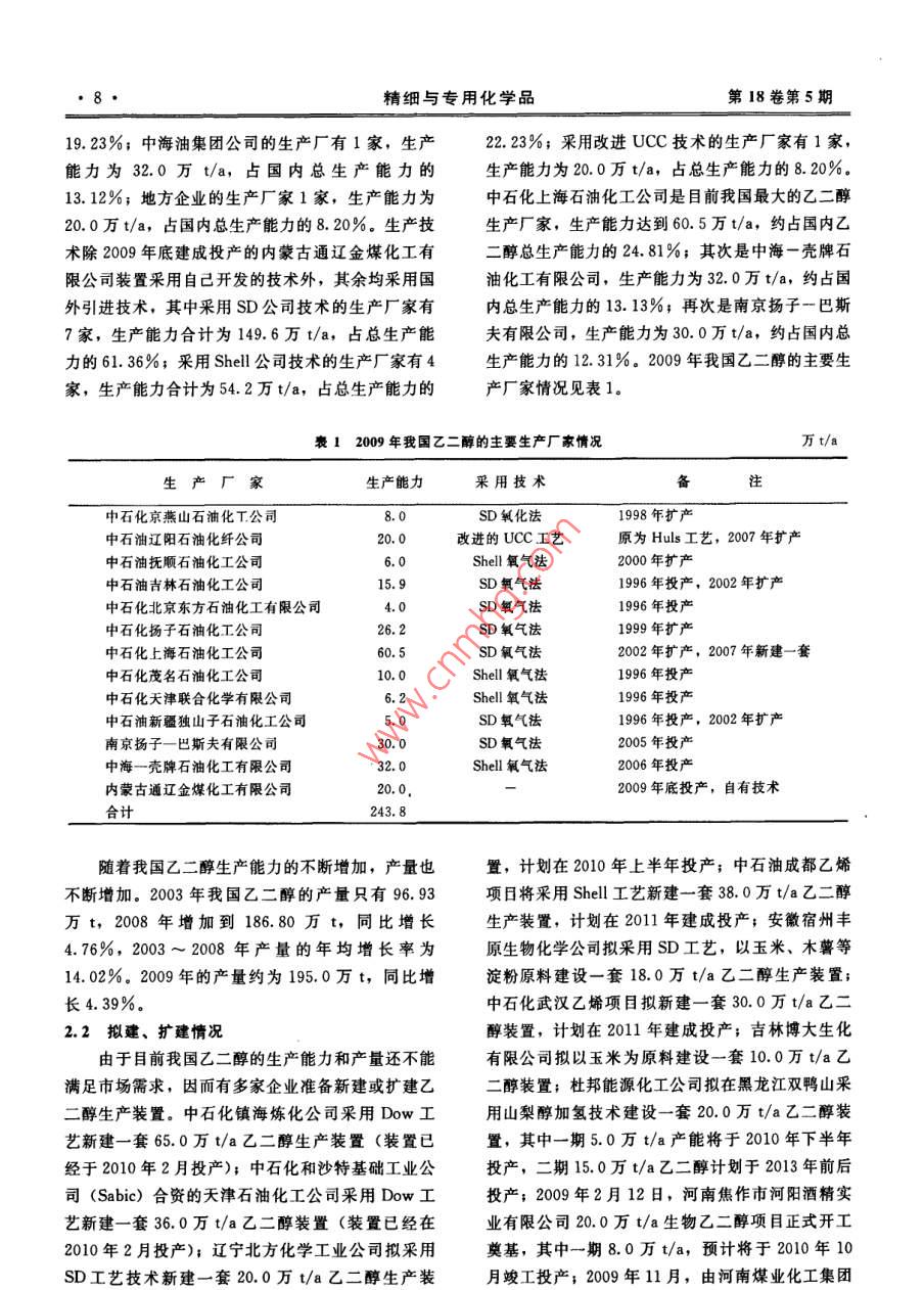 May 2010精細(xì)與專用化學(xué)品第18卷第5期4 Fine and Specialty Chemicals2010年5月我國乙二醇生產(chǎn)技術(shù)進(jìn)展及市場(chǎng)分析金棟,崔小明(北京燕山石油化工公司研究院,北京102500)摘要:介紹了我國乙二醇合成技術(shù)的最新進(jìn)展,分析了我國乙二醇的供需現(xiàn)狀及發(fā)展前景。2009年我國乙二醇的生產(chǎn)能力達(dá)到243.8萬t/a,但需求量達(dá)到777.1萬t,產(chǎn)量仍不能滿足市場(chǎng)需求今后除擴(kuò)大生產(chǎn)能力,積極開發(fā)新技術(shù)外,還應(yīng)該積極拓展新的應(yīng)用領(lǐng)域等,以促進(jìn)我國乙二醇產(chǎn)業(yè)健康有序發(fā)展。關(guān)鍵詞乙二醇;生產(chǎn)技術(shù);市場(chǎng)分析 Production technologies progress and market analysis of ethylene glycol in China JIN Dong, CUI Xiao-ming (Research Institute of Beijing Yanshan Petrochemical Corp. Beijing, 102500, China) Abstract: The new research progress of the production technologies of ethylene glycol in China were intro- duced. The production, consumption and development prospect of ethylene glycol in China were analysed. In 2009, the production capacity of ethylene glycol in China was about 2438kt/, and the consumption was about 7771kt, the output still can not meet the needs of market. In order to keep the ethylene glycol industry in China develop healthily and orderly, we should not only take to expand production capacity and develop new technolo- gies actively, but also to develop new application fileds. Key words: ethylene glycol, production technology; market analysis乙二醇(EG)是一種重要的有機(jī)化工原料,已經(jīng)過剩,而我國的產(chǎn)能和產(chǎn)量仍不能滿足市場(chǎng)需主要用于生產(chǎn)聚酯纖維和防凍劑,還可用于不飽和求,每年都需要大量進(jìn)口,我國乙二醇的發(fā)展前景聚酯樹脂、潤滑劑、增塑劑、非離子表面活性劑以廣闊。,,及炸藥等,用途十分廣泛。1生產(chǎn)技術(shù)進(jìn)展目前,乙二醇的生產(chǎn)方法主要有石油路線和非石油路線兩大類,其中石油路線是以乙烯為原料,目前,我國乙二醇的生產(chǎn)主要采用以乙烯、氧經(jīng)環(huán)氧乙烷生產(chǎn)乙二醇,該生產(chǎn)技術(shù)基本上由英荷氣等為原料的石油路線近幾年,除了生產(chǎn)能力以 Shell、美國科學(xué)設(shè)計(jì)公司(sd)以及美國uC三及產(chǎn)量方面的增長外,在乙二醇新技術(shù)的開發(fā)和應(yīng)家公司所壟斷。非石油路線是以合成氣為原料,可用上也取得了長足進(jìn)展。采用多種方法合成乙二醇。目前,我國乙二醇主要1.1環(huán)氧乙烷催化水合技術(shù)采用環(huán)氧乙烷直接水合法進(jìn)行生產(chǎn)。近年來,隨著針對(duì)環(huán)氧乙烷直接水合法生產(chǎn)乙二醇工藝中存聚酯纖維、聚酯塑料和防凍液等對(duì)乙二醇的旺盛需在的水比大、能耗高等不足,大連理工大學(xué)、中石求,人們相繼開發(fā)出合成乙二醇的多種新方法,其化上海石油化工研究院、江蘇工業(yè)學(xué)院(現(xiàn)名常州中環(huán)氧乙烷催化水合法和碳酸乙烯酯法被認(rèn)為是今大學(xué))以及南京工業(yè)大學(xué)等單位對(duì)環(huán)氧乙烷催化水后最有發(fā)展前景的工業(yè)化生產(chǎn)方法,是目前國內(nèi)外合生產(chǎn)乙二醇技術(shù)進(jìn)行了研究,并取得較大進(jìn)展。研究開發(fā)的熱點(diǎn)。目前,世界乙二醇的總生產(chǎn)能力大連理工大學(xué)進(jìn)行了環(huán)氧乙烷催化水合制備收稿日期:2010-03-1010作者簡介:金棟(1969-),男,高級(jí)工程師,碩士現(xiàn)主要從事技術(shù)開發(fā)和管理工作2010年5月金棟等:我國乙二醇生產(chǎn)技術(shù)進(jìn)展及市場(chǎng)分析5乙二醇的均相酸堿協(xié)同催化反應(yīng)體系和非均相催化江蘇工業(yè)學(xué)院研究人員還以HCO3型強(qiáng)堿反應(yīng)體系的試驗(yàn),并對(duì)催化劑的催化活性、乙二醇性陰離子交換樹脂為催化劑,采用多級(jí)固定床反應(yīng)選擇性及反應(yīng)條件進(jìn)行了考查。均相直接催化水合器串聯(lián)的催化水合工藝(簡稱多級(jí)工藝)對(duì)環(huán)氧乙所用催化劑為無機(jī)鹽和雜多酸的復(fù)合物,其中雜多烷制乙二醇的反應(yīng)進(jìn)行了研究,并與采用單個(gè)固定酸為KPMo2O4·7H2O,無機(jī)鹽為K當(dāng)n()床反應(yīng)器的單段工藝進(jìn)行了對(duì)比,考察了物料配比:n(環(huán)氧乙烷)=4~8:1、w(催化劑)=2%~1%、和重時(shí)空速對(duì)多級(jí)工藝中環(huán)氧乙烷轉(zhuǎn)化率和乙二醇反應(yīng)溫度100~150℃、反應(yīng)壓力0.8~2.1MPa、反選擇性的影響。實(shí)驗(yàn)結(jié)果表明,與單段工藝相比,應(yīng)時(shí)間8~30min、pH值8~1時(shí),環(huán)氧乙烷的轉(zhuǎn)多級(jí)工藝采用多段進(jìn)料的方式,有效移除反應(yīng)中放化率為95.0%~99.9%乙二醇的選擇性為出的熱量,降低了催化劑的膨脹率,提高了催化劑96.0%;非均相水合所用的催化劑為負(fù)載型雜多酸的使用壽命;在3個(gè)反應(yīng)器溫度各自為77、75、(鹽)催化劑,其中載體為yal2O和SO,雜多酸70℃、n(水):n(環(huán)氧乙烷)=8:1、重時(shí)空及其鹽為磷鉬酸、磷鉬酸鉀、磷鎢酸以及硅鎢酸等。速為2.0h、壓力為1.0MPa的條件下,連續(xù)運(yùn)行當(dāng)采用磷鉬酸鉀/yAl2O3為催化劑,在反應(yīng)溫度2880h,環(huán)氧乙烷的轉(zhuǎn)化率達(dá)到99%,乙二醇選擇140℃、壓力1.0MPa、n(水):n(環(huán)氧乙烷)為5:1性為97%的條件下,乙二醇選