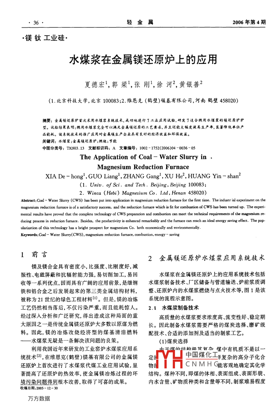 輕金屬2006年第4期·鎂鈦工業(yè)硅水煤漿在金屬鎂還原爐上的應(yīng)用夏德宏1,郭梁1,張剛1,徐河2,黃銀善2(1.北京科技大學(xué),北京100083;2.維恩克(鶴壁)鎂基有限公司,河南壁458020)摘要;全屬鎂還原爐首次采用水煤漿親純技術(shù),成行丁工業(yè)應(yīng)用試驗(yàn),研發(fā)丁適合鶿用水煤漿的鎂還原爐爐型。試驗(yàn)蛄果表明:然用水蝶漿完全可以滿足金屬鎂還原的工藝要求,并且還能大幅度提高生產(chǎn)率,玉著降低單位產(chǎn)品能耗。該親統(tǒng)技術(shù)的推廣應(yīng)用對金屬鎂生產(chǎn)企良好的經(jīng)濟(jì)效益和環(huán)保效益關(guān)鍵詞:水煤漿;金屬鎂還原爐;然燒;節(jié)能中圖分類號(hào):TK803.13文獻(xiàn)標(biāo)識(shí)碼:A文章編號(hào):1002-1752(2006)04-0036-05The Application of Coal-Water Slurry inMagnesium Reduction furnaceXIA De-hong, GUO Liang, ZHANG Gang, XU He, HUANG Yin-shan2. Winca( Hebi )Magnesium Co. Ltd, Henan 458020)Abstract: Coal-Water Slurry(CwS) has been put into application in magnesium reduction furnace for the first time. The industr ial experiment on themagnesium reduction furnace is of a satisfactory success, and the reduction fumace which is fit for combustion of CWS has been turned up. The experi-mental results have proved that the completeof CwS preparation and combustion can meet the technical requirements of the magnesium re-ducing process in reduction furnace. Besides, the productivity is enhanced remarkably and the furnace can reach an ideal energy saving effect. The popation of this technology has a bright prospect for magnesium Co. both economically and environmentallyrds: Coal- Water Slurry(CwS), magnesium reduction furnace, combustion, energy -savin1前言2金屬鎂還原爐水煤漿應(yīng)用糸統(tǒng)技術(shù)鎂及鎂合金具有密度小,比強(qiáng)度、比剛度好,減振性、電磁屏蔽和抗輻射能力強(qiáng),易切削加工,易回水煤漿在金屬鎂還原爐上的應(yīng)用系統(tǒng)技術(shù)包括收等一系列優(yōu)點(diǎn),因而具有廣闊的應(yīng)用前景,是繼鋼水煤漿制備技術(shù)、廠區(qū)儲(chǔ)備與管道輸送、爐前漿質(zhì)調(diào)鐵和鋁合金之后發(fā)展起來的第三類金屬結(jié)構(gòu)材料,整、還原爐內(nèi)的水煤漿燃燒與點(diǎn)火技術(shù)等,圖1是該被稱為21世紀(jì)的綠色工程材料{。但是,鎂的冶煉系統(tǒng)的流程示意圖。工藝仍然相當(dāng)落后,不僅污染嚴(yán)重,而且能耗驚人。2.1水煤漿制備技術(shù)經(jīng)過深入分析和廣泛研究,得出造成這種局面的重高質(zhì)量的水煤漿要求濃度高、流變性好、穩(wěn)定期大原因之一是傳統(tǒng)金屬鎂還原爐大多數(shù)以原煤為燃長。因此制備水煤漿需要嚴(yán)格的煤炭選擇、磨礦級(jí)料。因此鎂的冶煉改燒經(jīng)濟(jì)型的煤基清潔燃料配技術(shù)、合適的添加劑及適當(dāng)?shù)闹茲{工藝。水煤漿無疑是一條解決該問題的良策。(1)煤炭選擇利用我國近年來研發(fā)的工業(yè)窯爐水煤漿應(yīng)用系干的結(jié)構(gòu)甘旬九煤中有機(jī)質(zhì)不是以統(tǒng)技術(shù)2,在維恩克(鶴壁)鎂基有限公司的金屬鎂定中國煤化工羊復(fù)雜的高分子化合還原爐上首次進(jìn)行了水煤漿代煤工業(yè)應(yīng)用試驗(yàn),顯物CNMH能客觀地確定其化學(xué)著提高了還原爐的熱效率,使金屬鎂冶煉過程的環(huán)結(jié)構(gòu)。煤種不同,即煤的體相、表面組成、表面形貌、境污染問題得到根本改善,取得了可喜的成果。內(nèi)水含量、礦物質(zhì)種類和含量等不同,制漿難易程度收稿日期:2005-12-302006年第4期夏德宏郭梁張剛徐河,黃銀善:水煤漿在金屬鎂還原爐上的應(yīng)用37也有很大差異。其中煤的灰分、揮發(fā)分、固定碳、內(nèi)隨著煤化程度的加深,煤炭成漿性有變易的趨勢。在水分、可磨性指數(shù)、氧碳比、氫碳比與燃料比等因另外,煤中無機(jī)質(zhì)特別是水溶性無機(jī)鹽對制漿也有素對成漿濃度均有較大影響。制漿濃度是水煤漿應(yīng)顯著的影響,并且是影響水煤漿流變性的一個(gè)重要用的一個(gè)重要指標(biāo),高濃度煤漿不僅其熱值高,而且因素。因此在選擇煤炭制漿時(shí)盡可能選擇煤化程度穩(wěn)定性高。在這些因素中,內(nèi)在水分與可磨性指數(shù)高、內(nèi)在水分低、可磨性指數(shù)高的煤炭。表1所示就對制漿效果也有顯著影響。實(shí)際生產(chǎn)證明:內(nèi)在水是鶴壁地區(qū)三礦煤的成分,基本滿足成漿要求。分低、可磨性指數(shù)高則成漿好。并且在煙煤范圍內(nèi),粗磨機(jī)[物唐機(jī)上-供款暴攪拌罐空壓機(jī)金屬還原爐燃燒泵—在績過濾器「助燃風(fēng)圖1水煤漿在金屬鏷還原爐上應(yīng)用的系統(tǒng)流程Fig 1 Flow sheet of magnesium reduction furnace with coal-waterslurry(2)磨礦粒度級(jí)配技術(shù)要性質(zhì)。優(yōu)質(zhì)煤漿不僅有較高的濃度,還有良好的在制漿過程中,煤的粒度分布是決定水煤漿濃剪切稀化效應(yīng),以保證漿體具有良好的泵送和霧化度和流動(dòng)性的重要因素。高濃度的水煤漿,要求煤特性,降低煤漿輸?shù)芎?提高煤漿燃燒效率。煤是粉顆粒各粒徑的含量要有一定的分布使大顆粒間的疏水性的,添加劑的主要作用是改善煤表面親水性,空隙為細(xì)顆粒所充填,細(xì)顆粒間的空隙又能為更細(xì)降低煤水表面張力,使煤粒充分潤濕和均勻分散在顆粒所充填,以減少空隙所消耗的水量,從而提高制少量水中,改善水煤