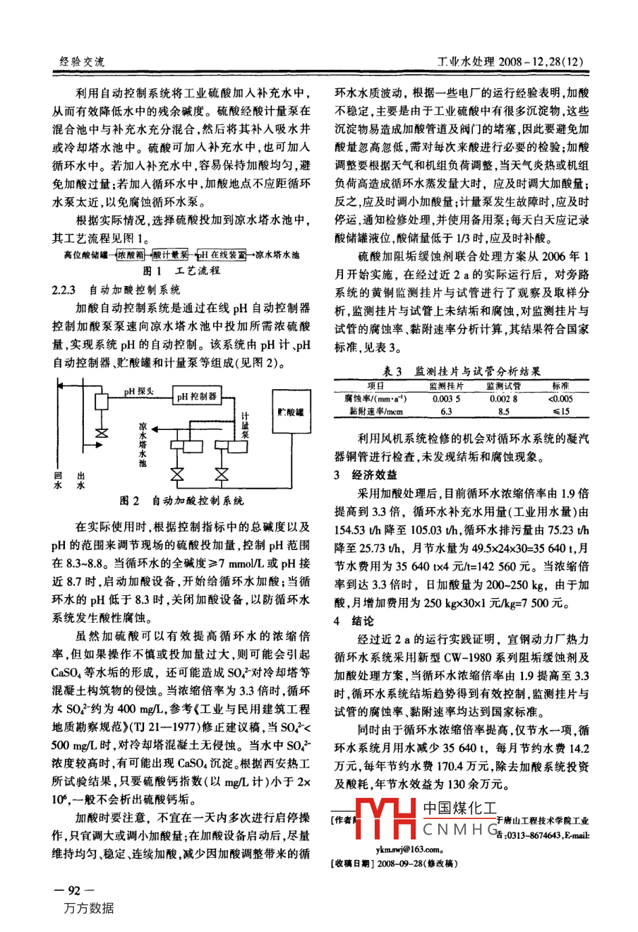 第28卷第12期工業(yè)水處理Vol 28 No 122008年12月Industrial Water TrealmentDec.,2008熱力循環(huán)水加酸工藝處理實例閆克明(宣化鋼鐵集團有限責(zé)任公司動力廠,河北宣化075100)[摘要]鋼動力廠在熱力車間循環(huán)水系統(tǒng)中更換循環(huán)水穩(wěn)劑配方,并采用循環(huán)水加酸工藝提高了循環(huán)水濃縮倍數(shù),在提高循環(huán)水的濃縮倍率(由19上升至33)的同時控制加酸后循環(huán)水的pH,使系統(tǒng)新鮮水補水量由154.53h降至10503Wh。實現(xiàn)了節(jié)水降耗的目的取得了良好的經(jīng)濟效益。關(guān)鍵詞]循環(huán)水;自動控制pH;阻垢緩蝕劑[中圖分類號]TQ085:4[文獻(xiàn)標(biāo)識碼]B[文章編號]1005-829X(2008)120091-02宣鋼動力廠擔(dān)負(fù)著全公司的水、電、風(fēng)、蒸汽、充水的水質(zhì),需向循環(huán)水系統(tǒng)中投加阻垢緩蝕劑以煤氣等的供應(yīng)任務(wù),其中,做為生產(chǎn)系統(tǒng)的一部分防設(shè)備腐蝕和結(jié)垢。的熱力車間循環(huán)水系統(tǒng)擔(dān)負(fù)著為風(fēng)機和發(fā)電裝置1水質(zhì)的凝汽器提供冷卻水的任務(wù)。為了防止風(fēng)機和發(fā)電該廠補充水為地下水,水質(zhì)見表1。裝置的凝汽器的銅管發(fā)生腐蝕和結(jié)垢,根據(jù)系統(tǒng)補從表1可以看出,補充水中硬度、堿度都較高,表也下水水質(zhì)濁度/(mgL")電導(dǎo)率(ps,cm)堿度/(mgL)總硬度/mgL)Ca/(mngL")Mr"(mg·L)總鐵/(mgt")Cr/(mgl)854.008161316.l3158.8015540002666.87注:總堿度、總硬度、Ca2Mg2"以CaCO3計。結(jié)垢的可能性很大,而隨著循環(huán)水濃縮倍數(shù)的提高,緩蝕性能大幅度降低,在凝汽器銅管上發(fā)現(xiàn)有結(jié)垢水質(zhì)的結(jié)垢和腐蝕傾向也會越來越嚴(yán)重?,F(xiàn)象影響了系統(tǒng)的安全、穩(wěn)定、高效運行。為此,我2存在問題及解決方法們提出重新篩選阻垢緩蝕劑并在系統(tǒng)中采用硫酸加2.1存在問題阻垢緩蝕劑聯(lián)合處理方案。目前水資源日益緊張,作為循壞水系統(tǒng),節(jié)水的22解決方法最有效措施就是提高循環(huán)水濃縮倍數(shù),降低系統(tǒng)補2.2.1篩選阻垢緩蝕劑水量。動力廠最初選用的普通阻垢緩蝕劑(CW對CW系列、H系統(tǒng)、GR系列共7個阻垢緩蝕1983)一般只在濃縮倍數(shù)18-20的情況下起到較好劑配方進(jìn)行了阻垢和緩蝕試驗試驗結(jié)果見表2。的阻垢緩蝕性能,當(dāng)濃縮倍數(shù)進(jìn)一步提高時,其阻垢篩選出適用于現(xiàn)場水質(zhì)的阻垢緩蝕配方為表2阻垢和緩蝕試驗結(jié)果CW-1983GR-324GR-326主要成分物、分散劑、鋅腆酸鹽 PBTCA、酸及其共聚物、酸及其共物、酸、瞬酸鹽有色酸、瞬酸鹽、行色酸膦酸鹽、有色鹽、BTABTATTA金屬緩蝕劑金屬緩蝕劑金屬緩蝕劑阻垢率%81867292碳鋼腐蝕速率0.24120.15850.22840278501753黃鋼腐蝕速率/00026002200147000600004700041注:試驗的濃縮倍數(shù)為23。CW-1980,此配方以 PBTCA為主劑,其阻垢和緩蝕以提高濃縮倍數(shù)性能優(yōu)于常用的膦酸鹽。循環(huán)水的加酸處理,一般采用濃硫酸與水中最2.2.2釆用循環(huán)水加酸處理工藝流程常見的重碳酸鹽的反應(yīng),將水中的重碳酸鹽轉(zhuǎn)變?yōu)樵瓌恿S熱力車間循環(huán)水系統(tǒng)沒有調(diào)控p的csd凵中國煤化工大(0℃時為1750手段,正常情況下pH維持在90以上,系統(tǒng)鈣硬和mg/LCNMHG的析出從而可以堿度都較高,直接提高濃縮倍數(shù)將使系統(tǒng)結(jié)垢趨勢大大地提高環(huán)水的濃緗舉。另外反應(yīng)生成的游加重。其解決方法是通過循環(huán)水加酸工藝降低堿度離CO2,也有利于抑制碳酸鹽水垢的析出。經(jīng)驗交流工業(yè)水處理2008-12,28(12)利用自動控制系統(tǒng)將工業(yè)硫酸加入補充水中,環(huán)水水質(zhì)波動,根據(jù)一些電廠的運行經(jīng)驗表明,加酸從而有效降低水中的殘余堿度。硫酸經(jīng)酸計量泵在不穩(wěn)定,主要是由于工業(yè)硫酸中有很多沉淀物,這些混合池中與補充水充分混合,然后將其補入吸水井沉淀物易造成加酸管道及閥門的堵塞,因此要避免加或冷卻塔水池中。硫酸可加入補充水中,也可加入酸量忽高忽低,需對每次來酸進(jìn)行必要的檢驗;加酸循環(huán)水中。若加入補充水中,容易保持加酸均勻,避調(diào)整要根據(jù)天氣和機組負(fù)荷調(diào)整,當(dāng)天氣炎熱或機組免加酸過量;若加入循環(huán)水中,加酸地點不應(yīng)距循環(huán)負(fù)荷高造成循環(huán)水蒸發(fā)量大時,應(yīng)及時調(diào)大加酸量;水泵太近,以免腐蝕循環(huán)水泵。反之,應(yīng)及時調(diào)小加酸量;計量泵發(fā)生故障時,應(yīng)及時根據(jù)實際情況,選擇硫酸投加到?jīng)鏊刂?停運,通知檢修處理,并使用備用泵;每天白天應(yīng)記錄其工藝流程見圖1。酸儲罐液位,酸儲量低于1/3時,應(yīng)及時補酸。高位酸儲罐依酸釀計量世在線裝寫→涼水塔水池硫酸加阻垢緩蝕劑聯(lián)合處理方案從2006年1圖1工藝流程月開始實施,在經(jīng)過近2a的實際運行后,對旁路223自動加酸控制系統(tǒng)系統(tǒng)的黃銅監(jiān)測掛片與試管進(jìn)行了觀察及取樣分加酸自動控制系統(tǒng)是通過在線pH自動控制器析,監(jiān)測掛片與試管上未結(jié)垢和腐蝕對監(jiān)測掛片與控制加酸泵泵速向涼水塔水池中投加所需濃硫酸試管的腐蝕率黏附速率分析計算,其結(jié)果符合國家量實現(xiàn)系統(tǒng)p的自動控