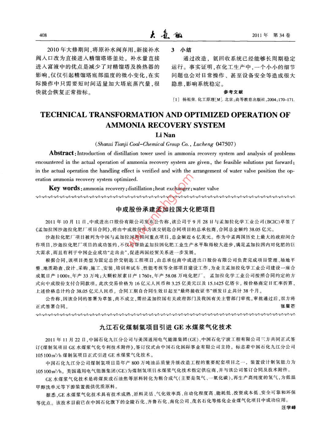 2011年第34卷2010年大修期間,將原補(bǔ)水閥棄用,新接補(bǔ)水3小結(jié)閥人口改為直接進(jìn)入精餾塔塔釜處。補(bǔ)水量直接通過改造,氨回收系統(tǒng)已經(jīng)能夠長周期穩(wěn)定進(jìn)人富液中的優(yōu)點(diǎn)是減少了對精餾塔及換熱器的運(yùn)行。事實(shí)證明,在化工生產(chǎn)中,一個(gè)小小的細(xì)節(jié)影響,僅僅引起精餾塔底部溫度的微小變化,在實(shí)問題也會(huì)對日常操作、甚至設(shè)備安全等造成很大際操作中只需要短時(shí)間適量加大塔底蒸汽量,很隱患,影響系統(tǒng)穩(wěn)定??炀蜁?huì)恢復(fù)正常指標(biāo)。參考文獻(xiàn)[1]楊祖榮.化工原理[M].北京:高等教育出版社,2004:170-171.TECHNICAL TRANSFORMATION AND OPTIMIZED OPERATION OFAMMONIA RECOVERY SYSTEMLi Nan(Shanxi Tianji Coal-Chemical Group Co., Lucheng 047507)Abstract: Introduction of distillation tower used in ammonia recovery system and analysis of problemsencountered in the actual operation of ammonia recovery system are given, the feasible solutions put forwardin the actual operation the handling effect is verified and with the arrangement of water valve position the operation ammonia recovery system optimizedKey words: ammonia recovery; distillation; heat exchanger; water valve中成股份承建孟加拉國大化肥項(xiàng)目2011年10月11日,中成進(jìn)出口股份有限公司發(fā)布公告稱,該公司于9月28日與孟加拉化學(xué)工業(yè)公司(BCIC)草簽了《孟加拉國沙迦拉化肥廠項(xiàng)目合同》,將由中成股份作為該交鑰匙合同項(xiàng)目的總承包商,合同總金額約3805億元。沙迦拉化肥廠項(xiàng)目被列為中國與孟加拉國兩國間重點(diǎn)項(xiàng)目,總金額近6億美元。作為中孟兩國歷史上最大的政府間合作項(xiàng)目,沙迦拉化肥廠項(xiàng)目的成功簽約,不僅可幫助孟加拉國化肥工業(yè)生產(chǎn)水平取得較大進(jìn)步,滿足孟加拉國內(nèi)對化肥的巨大需求,而且有利于中國企業(yè)成功“走出去”,促進(jìn)兩國經(jīng)貿(mào)關(guān)系進(jìn)一步發(fā)展。據(jù)合同,該項(xiàng)目類型為固定總價(jià)交鑰匙工程項(xiàng)目,由總承包商中成進(jìn)出口股份有限公司負(fù)責(zé)完成項(xiàng)目管理、場地平整、地質(zhì)勘查、設(shè)計(jì)、采購、施工、安裝、培訓(xùn)和試車、性能考核等全部項(xiàng)目建設(shè)工作,為業(yè)主孟加拉化學(xué)工業(yè)公司建設(shè)一座合成氨日產(chǎn)1000t、年產(chǎn)33萬噸;大顆粒尿素日產(chǎn)1760t,年產(chǎn)5808萬噸化肥廠。孟加拉化學(xué)工業(yè)公司按照合同約定的方式向中成股份支付合同款項(xiàng)。此次交易價(jià)格為16億元人民幣和3.25億美元以及15.1425億塔卡。按價(jià)格商定日匯率折算,上述價(jià)格總計(jì)約合3805億元人民幣。合同工期自合同生效日起至“最終接收證書”頒發(fā)日止共計(jì)38個(gè)月。公告稱,因該合同的簽署為草簽,尚不成立,需經(jīng)孟加拉國有關(guān)政府部門及我國有關(guān)主管部門審批。審批通過后,雙方將正式簽署合同。張星芒九江石化煤制氫項(xiàng)目引進(jìn)GE水煤漿氣化技術(shù)2011年11月22日,中國石化九江分公司與美國通用電氣能源集團(tuán)(CE)、中國石化寧波工程有限公司三方共同正式簽訂《煤制氫項(xiàng)目GE水煤漿氣化專利技術(shù)附件》,簽訂儀式由中國石化國際事業(yè)有限公司主持。標(biāo)志著中國石化九江分公司105100m3/h煤制氫項(xiàng)目正式引進(jìn)GE水煤漿氣化技術(shù)中國石化九江分公司煤制氫項(xiàng)目是年產(chǎn)800萬噸油品質(zhì)量升級(jí)改造工程的重要配套項(xiàng)目之一,裝置設(shè)計(jì)制氫能力為105100m}/h。美國通用電氣能源集團(tuán)(GE)為煤制氫項(xiàng)目水煤漿氣化技術(shù)指定供應(yīng)商,并與該公司簽訂合同及技術(shù)附件GE水煤漿氣化技術(shù)是將煤炭或石油焦等原料轉(zhuǎn)化為粗合成氣(主要是氫氣、一氧化碳),再生產(chǎn)高純度的氫氣,為低溫甲醇洗單元等下游裝置提供優(yōu)質(zhì)原料據(jù)悉,GE水煤漿氣化技術(shù)具有技術(shù)成熟、原料靈活、氣化效率高、自動(dòng)化程度高、能耗低、投資成本低、安全可靠和環(huán)保等優(yōu)點(diǎn)。該技術(shù)目前已在中國石化旗下的金陵石化、齊魯石化、南化公司、茂名石化等煉化企業(yè)煤氣化項(xiàng)目中成功應(yīng)用。汪學(xué)峰
