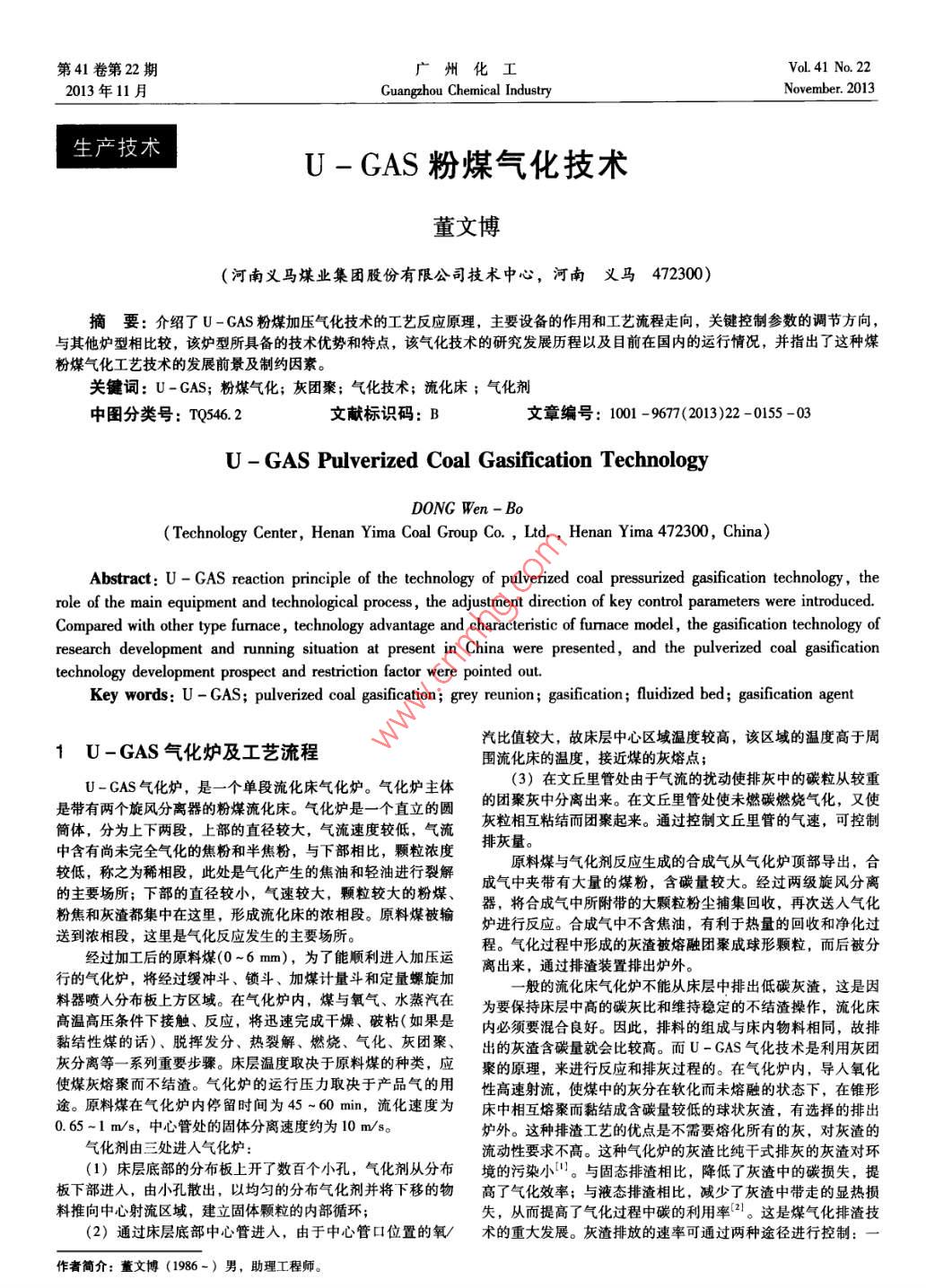 第41卷第22期廣州化工 Vol. 41 No. 222013年11月 Guangzhou Chemical Industry November. 2013生產(chǎn)技術(shù)U-GAS粉煤氣化技術(shù)董文博(河南義馬煤業(yè)集團(tuán)股份有限公司技術(shù)中心,河南義馬472300)摘要:介紹了-GAS粉煤加壓氣化技術(shù)的工藝反應(yīng)原理,主要設(shè)備的作用和工藝流程走向,關(guān)鍵控制參數(shù)的調(diào)節(jié)方向,與其他爐型相比較,該爐型所具備的技術(shù)優(yōu)勢(shì)和特點(diǎn),該氣化技術(shù)的研究發(fā)展歷程以及目前在國(guó)內(nèi)的運(yùn)行情況,并指出了這種煤粉煤氣化工藝技術(shù)的發(fā)展前景及制約因素。關(guān)鍵詞:-GAS;粉煤氣化;灰團(tuán)聚;氣化技術(shù);流化床;氣化劑中圖分類號(hào):TQ546.2文獻(xiàn)標(biāo)識(shí)碼:B文章編號(hào):1001-9677(2013)22-0155-03 U-GAS Pulverized Coal Gasification Technology DONG Wen-Bo(Technology Center, Henan Yima Coal Group Co.,lt, Henan Yima472300, China) Abstract: U-GAS reaction principle of the technology of pulverized coal pressurized gasification technology, the role of the main equipment and technological process, the adjustment direction of key control parameters were introduced Compared with other type furnace, technology advantage and characteristic of fumace model, the gasification technology of research development and running situation at present in China were presented, and the pulverized coal gasification technology development prospect and restriction factor were pointed out. Key words: U-GAS; pulverized coal gasification; grey reunion; gasification; fluidized bed; gasification agent汽比值較大,故床層中心區(qū)域溫度較高,該區(qū)域的溫度高于周1u-gAs氣化爐及工藝流程圍流化床的溫度,接近煤的灰熔點(diǎn);U-gAs氣化爐,是一個(gè)單段流化床氣化爐。氣化爐主體(3)在文丘里管處由于氣流的擾動(dòng)使排灰中的碳粒從較重是帶有兩個(gè)旋風(fēng)分離器的粉煤流化床。氣化爐是一個(gè)直立的圓的團(tuán)聚灰筒體,分為上下兩段,上部的直徑較大,氣流速度較低,氣流灰?;抑蟹蛛x出來(lái)在文丘里管處使未燃碳燃燒氣化,又使相互粘結(jié)而團(tuán)聚起來(lái)。通過控制文丘里管的氣速,可控制中含有尚未完全氣化的焦粉和半焦粉,與下部相比,顆粒濃度排灰量。較低,稱之為稀相段,此處是氣化產(chǎn)生的焦油和輕油進(jìn)行裂解原料煤與氣化劑反應(yīng)生成的合成氣從氣化爐頂部導(dǎo)出,合的主要場(chǎng)所;下部的直徑較小,氣速較大,顆粒較大的粉煤成氣中夾帶有大量的煤粉,含碳量較大。經(jīng)過兩級(jí)旋風(fēng)分離器,將合成氣中所附帶的大顆粒粉塵捕集回收,再次送入氣化粉焦和灰渣都集中在這里,形成流化床的濃相段。原料煤被輸爐進(jìn)行反應(yīng)。合成氣中不含焦油,有利于熱量的回收和凈化過送到濃相段,這里是氣化反應(yīng)發(fā)生的主要場(chǎng)所。經(jīng)過加工后的原料煤(0~6mm),為了能順利進(jìn)入加壓運(yùn)程。氣化過程中形成的灰渣被熔融團(tuán)聚成球形顆粒,而后被分行的氣化爐,將經(jīng)過緩沖斗、鎖斗、加煤計(jì)量斗和定量螺旋加般的流化床氣化爐不能從床層中排出低碳灰渣,這是因料器噴人分布板上方區(qū)域。在氣化爐內(nèi),煤與氧氣、水蒸汽在為要保持床層中高的碳灰比和維持穩(wěn)定的不結(jié)渣操作,流化床高溫高壓條件下接觸、反應(yīng),將迅速完成干燥破粘(如果是內(nèi)必須要混合良好因此,排料的組成與床內(nèi)物料相同,故排黏結(jié)性煤的話)、脫揮發(fā)分、熱裂解、燃燒、氣化、灰團(tuán)聚、出的灰渣含碳量就會(huì)比較高。而u-gAS氣化技術(shù)是利用灰團(tuán)灰分離等一系列重要步驟。床層溫度取決于原料煤的種類,應(yīng)聚的原理,來(lái)進(jìn)行反應(yīng)和排灰過程的。在氣化爐內(nèi),導(dǎo)入氧化使煤灰熔聚而不結(jié)渣。氣化爐的運(yùn)行壓力取決于產(chǎn)品氣的用性高速射流,使煤中的灰分在軟化而未熔融的狀態(tài)下,在錐形途。原料煤在氣化爐內(nèi)停留時(shí)間為45~60min,流化速度為床中相互熔聚而黏結(jié)成含碳量較低的球狀灰渣,有選擇的排出0.65~1m/s,中心管處的固體分離速度約為10m/sc爐外。這種排渣工藝的優(yōu)點(diǎn)是不需要熔化所有的灰,對(duì)灰渣的氣化劑由三處進(jìn)入氣化爐:流動(dòng)性要求不高。這種氣化爐的灰渣比純干式排灰的灰渣對(duì)環(huán)(1)床層底部的分布板上開了數(shù)百個(gè)小孔,氣化劑從分布境的污染小。與固態(tài)排渣相比降低了灰渣中的碳損失,提板下部進(jìn)入,由小孔散出,以均勻的分布?xì)饣瘎┎⑾乱频奈锔吡藲饣?與液態(tài)排渣相比,減少了灰渣中帶走的顯熱損料推向中心射流區(qū)域,建立固體顆粒的內(nèi)部循環(huán);失,從而提高了氣化過程中碳的利用率(21。這是煤氣化排渣技(2)通過床層底部中心管進(jìn)入,由于中心管口位置的氧/術(shù)的重大發(fā)展?;以欧诺乃俾士赏ㄟ^兩種途徑進(jìn)行控制:作者簡(jiǎn)介:董文博(1986-)男,助理工程師。156廣州化工2013年11月種是控制通入文丘里管氣化劑的氣流速度,另一種是控制冷渣最重要的影響因素。它是由煤和灰的性質(zhì)所決定的,必須控制機(jī)的轉(zhuǎn)速。在灰不熔化而又能夠團(tuán)聚成球形的狀態(tài)。實(shí)驗(yàn)發(fā)現(xiàn),此溫度一般比煤的灰熔點(diǎn)低100~200℃,與灰分中鐵的含量有關(guān)。煤緩沖斗第二旋風(