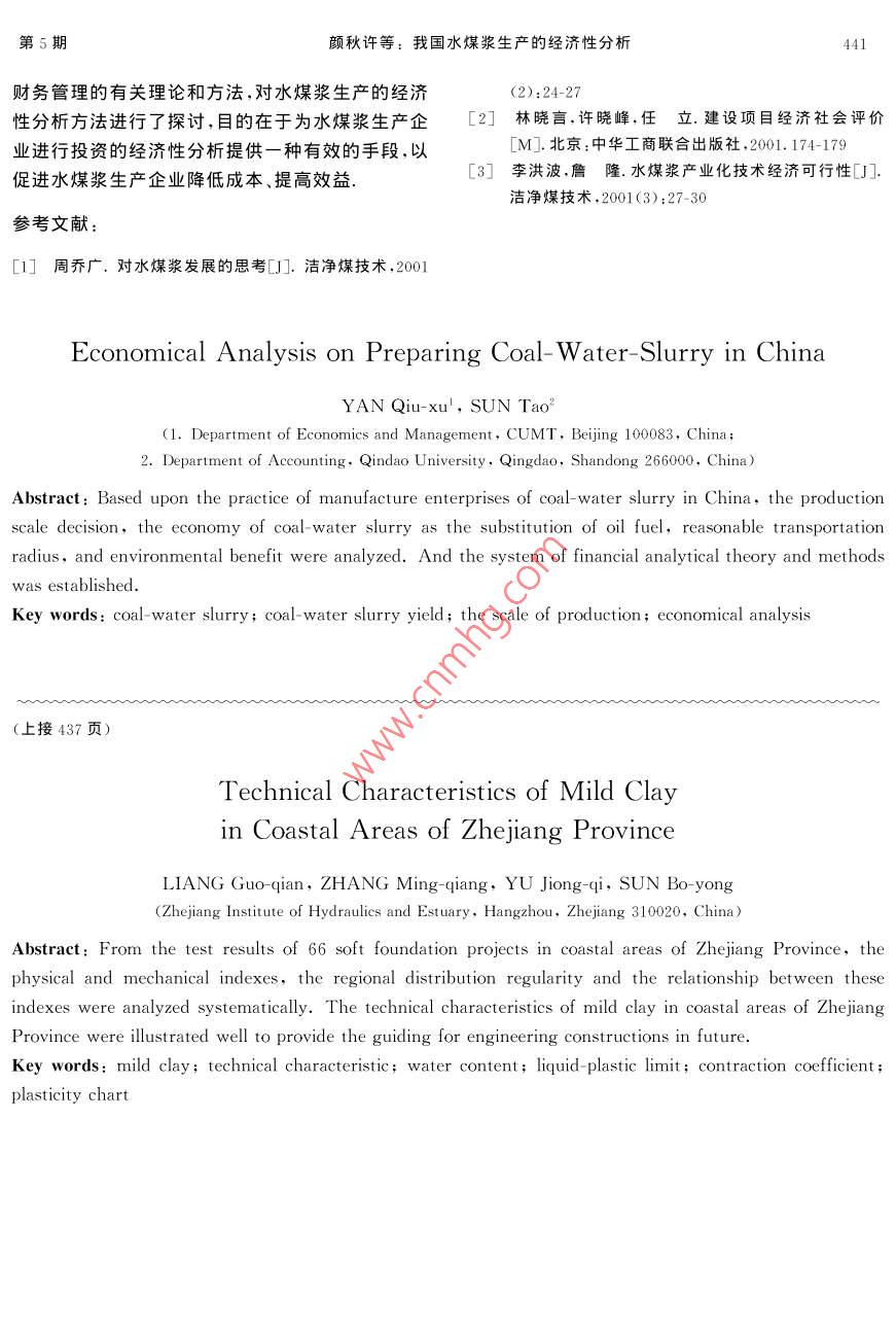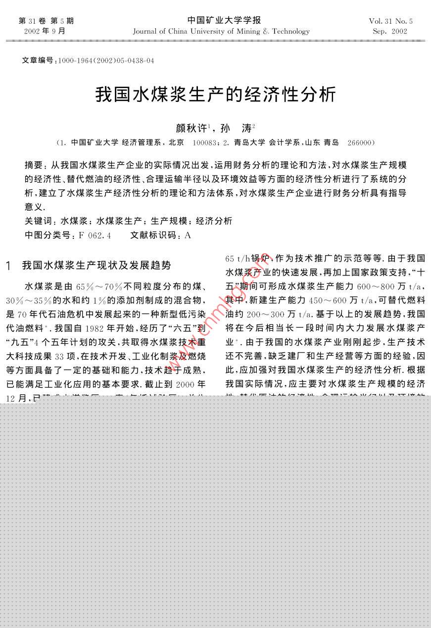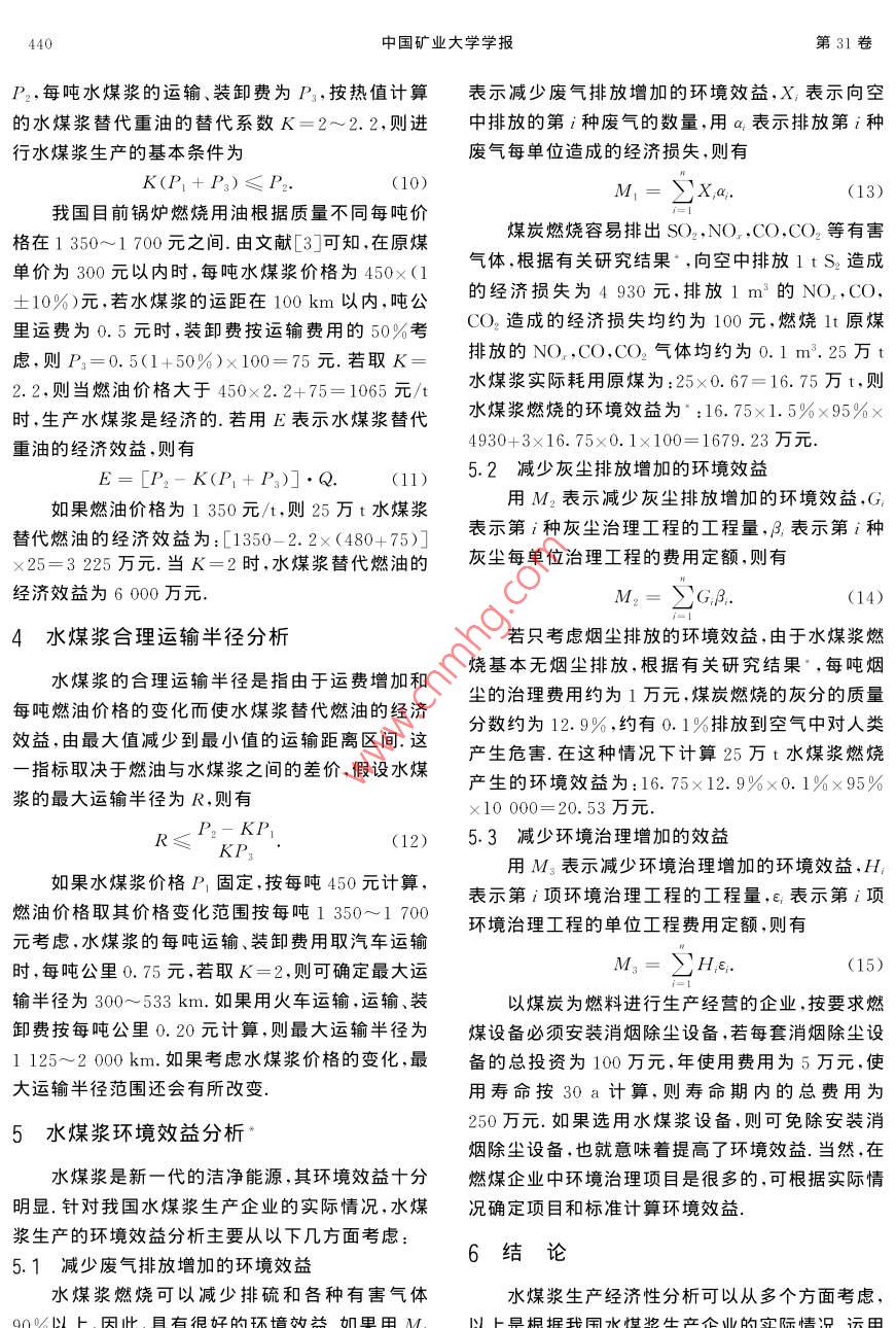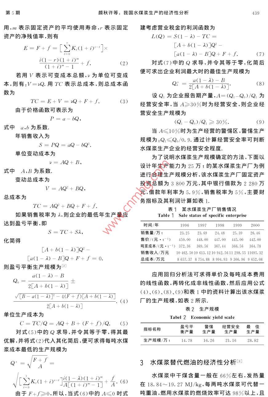 第31卷第5期中國礦業(yè)大學(xué)學(xué)報Vol 31 No 52002年9月Journal of China University of Mining & TechnologSep.2002文章編號:1000-1964(2002)05-0438-04我國水煤漿生產(chǎn)的經(jīng)濟(jì)性分析顏秋許,孫濤(1.中國礦業(yè)大學(xué)經(jīng)濟(jì)管理系,北京100083;2.青島大學(xué)會計學(xué)系,山東青島26600)摘要:從我國水煤漿生產(chǎn)企業(yè)的實(shí)際情況岀發(fā),運(yùn)用財努分析的理論和方法,對水煤漿生產(chǎn)規(guī)模的經(jīng)濟(jì)性、替代燃油的經(jīng)濟(jì)性、合理運(yùn)輸半徑以及環(huán)境效益等方面的經(jīng)濟(jì)性分析進(jìn)行了系統(tǒng)的分析,建立了水煤漿生產(chǎn)經(jīng)濟(jì)性分析的理論和方法體系,對水煤漿生產(chǎn)企業(yè)進(jìn)行財務(wù)分析具有指導(dǎo)意義關(guān)鍵詞:水煤漿;水煤漿生產(chǎn);生產(chǎn)規(guī)模;經(jīng)濟(jì)分析中圖分類號:F062.4文獻(xiàn)標(biāo)識碼:A1我國水煤漿生產(chǎn)現(xiàn)狀及發(fā)展趨勢65t/h鍋爐,作為技術(shù)推廣的示范等等由于我國水煤漿產(chǎn)業(yè)的快速發(fā)展,再加上國家政策支持,“十水煤漿是由65%~70%不同粒度分布的煤、五”期間可形成水煤漿生產(chǎn)能力600~800萬t/a,30%~35%的水和約1%的添加劑制成的混合物,其中,新建生產(chǎn)能力450~600萬t/a,可替代燃料是70年代石油危機(jī)中發(fā)展起來的一種新型低污染油約200~300萬t/a.基于以上的發(fā)展趨勢,我國代油燃料“.我國自1982年開始,經(jīng)歷了“六五”到將在今后相當(dāng)長一段時間內(nèi)大力發(fā)展水煤漿產(chǎn)“九五”4個五年計劃的攻關(guān),共取得水煤漿技術(shù)重業(yè).由于我國的水煤漿產(chǎn)業(yè)剛剛起步,生產(chǎn)技術(shù)大科技成果33項在技術(shù)開發(fā)、工業(yè)化制漿及燃燒還不完善,缺乏建廠和生產(chǎn)經(jīng)營等方面的經(jīng)驗(yàn),因等方面具備了一定的基礎(chǔ)和能力,技術(shù)趨于成熟,此,應(yīng)加強(qiáng)對我國水煤漿生產(chǎn)的經(jīng)濟(jì)性分析.根據(jù)已能滿足工業(yè)化應(yīng)用的基本要求截止到2000年我國實(shí)際情況,應(yīng)主要對水煤漿生產(chǎn)規(guī)模的經(jīng)濟(jì)12月,已建成水煤漿廠13座(包括試驗(yàn)廠),總生性、替代原油的經(jīng)濟(jì)性、合理運(yùn)輸半徑以及環(huán)境效產(chǎn)能力達(dá)309萬ta.我國水煤漿生產(chǎn)是根據(jù)能源益等方面進(jìn)行分析,確保水煤漿生產(chǎn)在經(jīng)濟(jì)效益的市場需求發(fā)展起來的,發(fā)展的主要動力是由于水煤前提下正常發(fā)展?jié){具有替代燃油較好的經(jīng)濟(jì)效益凵我國燃料油消費(fèi)量很大、199年電力行業(yè)用2水煤漿生產(chǎn)規(guī)模的經(jīng)濟(jì)性分析油1660萬t,石油、石化、化工的工藝加熱和原料如果用K表示固定資產(chǎn)投資,K,表示第t年用油1180萬t,建材窯爐燃油300萬t,鋼鐵窯爐的貸款額,為貸款利率,s為建設(shè)期,則按復(fù)利計和發(fā)電燃油264萬t.因此,水煤漿代油燃燒的主要算的建設(shè)期固定資產(chǎn)投資的本利和為市場在石油石化和電力行業(yè).目前,許多企業(yè)正在K進(jìn)行水煤漿改造和試燒工作,如茂名熱電廠K:(1+i)220t/h鍋爐改造,汕頭萬豐熱電廠220t/h燃油鍋為確定水煤漿生產(chǎn)的最低投資規(guī)模,假設(shè)水煤爐改造,西江電廠220t/h鍋爐改造,南海電廠3漿生產(chǎn)企業(yè)的年均生產(chǎn)能力為Q,每噸水煤漿的單臺67θ0t/h燃油鍋爐改造,北京燕山石化公司在建價為P,則年銷售收入為:S=PQ.水煤漿生產(chǎn)的總設(shè)好第一臺220th燃用水煤漿鍋爐的基礎(chǔ)上再成本可區(qū)分為固定成本和變動成本,若用E表示建一臺220t/h燃用水煤漿鍋爐,中原油田已將水煤漿生產(chǎn)企業(yè)的固定成本總額,F表示年均固定4t/h快裝鏈條爐改用燃燒水煤漿,計劃再改造資產(chǎn)折舊,f表示固定資產(chǎn)折舊以外的年均固定費(fèi)第5期顏秋許等:我國水煤漿生產(chǎn)的經(jīng)濟(jì)性分析439用,m表示固定資產(chǎn)的平均使用壽命,r表示固定建考慮營業(yè)稅金的利潤函數(shù)為資產(chǎn)的凈殘值率,則有L(Q)=S(1-2)-TCE=F+f=[∑(1+A+b(1-)]QLa(1-1)-BlQ+F+f.i(1-r)(1+i)(1+i)m-1f(2)對式(7)中的Q求導(dǎo),并令其等于零,化簡后若用V表示可變成本總額,ν為單位可變成便可求出企業(yè)利潤最大時的最佳生產(chǎn)規(guī)模為本,則有:=Q.用TC表示總成本,則總成本函Q2[A+6(1-)(8)數(shù)為設(shè)Q1為企業(yè)報告期產(chǎn)量,A=(Q1-Q)/Q1為TC=E+V=u+F+f.(3)經(jīng)營安全率,當(dāng)A≥30%時為經(jīng)營安全,則企業(yè)經(jīng)由于價格函數(shù)可表示為營安全生產(chǎn)規(guī)模為P= a-bo式中a,b為系數(shù).(Q1-Q)/Q1≥30%當(dāng)A≤10%時為生產(chǎn)經(jīng)營的警惕區(qū),警惕生產(chǎn)年銷售收入為規(guī)模為:Q1≤Q。/0.9.通過計算經(jīng)營安全率可判斷s= PQ= aQ-bQ水煤漿生產(chǎn)企業(yè)的經(jīng)營安全程度單位變動成本為為了說明水煤漿生產(chǎn)規(guī)模確定的方法,下面以式中A,B為系數(shù)設(shè)計年生產(chǎn)能力為25萬t的某水煤漿生產(chǎn)廠為例進(jìn)行合理生產(chǎn)規(guī)模分析,該水煤漿生產(chǎn)廠固定資產(chǎn)變動總成本為投資總額為3800萬元,其中銀行借款為2280萬V= AQ2+ BQ元,借款年利率為5.9%,銷售稅率為5%,主要財總成本為務(wù)指標(biāo)及其利潤計算如表1AQ+BQ+F+f表1某水煤漿生產(chǎn)廠銷售