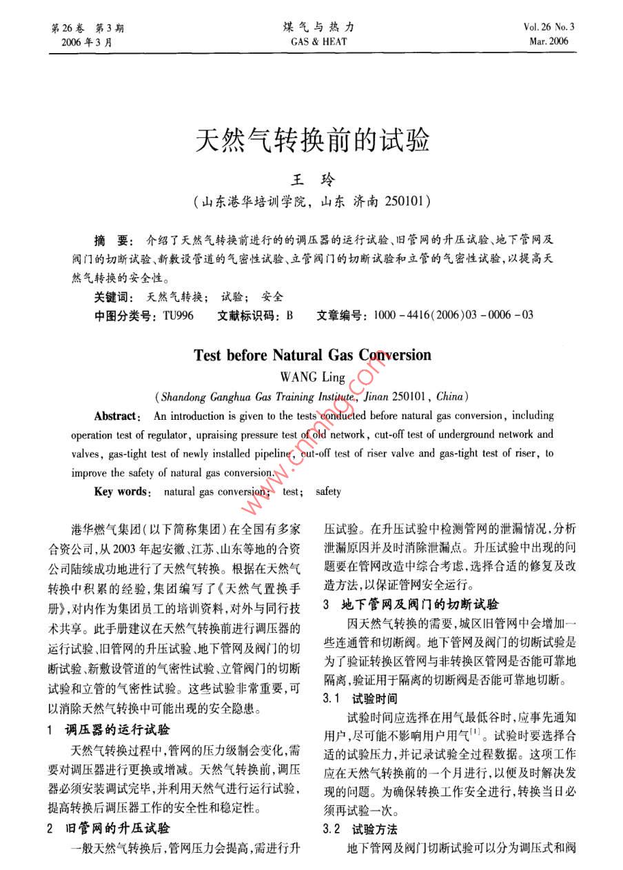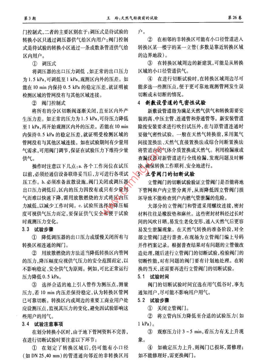 第26卷第3期煤氣與熱力Vol 26 No. 32006年3月GAS heatMar.2006天然氣轉(zhuǎn)換前的試驗(yàn)王玲(山東港華培訓(xùn)學(xué)院,山東濟(jì)南250101)摘要:介紹了天然氣轉(zhuǎn)換前進(jìn)行的的調(diào)壓器的運(yùn)行試驗(yàn)、舊管網(wǎng)的升壓試驗(yàn)、地下管網(wǎng)及閥門的切斷試驗(yàn)、新敷設(shè)管道的氣密性試驗(yàn)、立管閥門的切斷試驗(yàn)和立管的氣密性試驗(yàn),以提高天然氣轉(zhuǎn)換的安全性。關(guān)鍵詞:天然氣轉(zhuǎn)換;試驗(yàn);安全中圖分類號(hào):TU996文獻(xiàn)標(biāo)識(shí)碼:B文章編號(hào):1000-416(2006)03-000-0Test before Natural Gas ConversionShandong Ganghua Gas Training Institute, Jinan 250101, China)Abstract: An introduction is given to the tests conducted before natural gas conversion, includingperation test of regulator, upraising pressure test of old network, cut-off test of underground network andalves, gas-tight test of newly installed pipeline, cut-off test of riser valve and gas-tight test of riser, toimprove the safety of natural gas conversionKey words: natural gas conversion; test safety港華燃?xì)饧瘓F(tuán)(以下簡(jiǎn)稱集團(tuán))在全國(guó)有多家壓試驗(yàn)。在升壓試驗(yàn)中檢測(cè)管網(wǎng)的泄漏情況,分析合資公司,從2003年起安徽江蘇、山東等地的合資泄漏原因并及時(shí)消除泄漏點(diǎn)。升壓試驗(yàn)中出現(xiàn)的問公司陸續(xù)成功地進(jìn)行了天然氣轉(zhuǎn)換。根據(jù)在天然氣題要在管網(wǎng)改造中綜合考慮,選擇合適的修復(fù)及改轉(zhuǎn)換中積累的經(jīng)驗(yàn),集團(tuán)編寫了《天然氣置換手造方法以保證管網(wǎng)安全運(yùn)行。冊(cè)》,對(duì)內(nèi)作為集團(tuán)員工的培訓(xùn)資料,對(duì)外與同行技3地下管網(wǎng)及閥門的切斷試驗(yàn)術(shù)共享。此手冊(cè)建議在天然氣轉(zhuǎn)換前進(jìn)行調(diào)壓器的因天然氣轉(zhuǎn)換的需要,城區(qū)舊管網(wǎng)中會(huì)增加一運(yùn)行試驗(yàn)舊管網(wǎng)的升壓試驗(yàn)地下管網(wǎng)及閥門的切些連通管和切斷閥。地下管網(wǎng)及閥門的切斷試驗(yàn)是斷試驗(yàn)新敷設(shè)管道的氣密性試驗(yàn)、立管閥門的切斷為了驗(yàn)證轉(zhuǎn)換區(qū)管網(wǎng)與非轉(zhuǎn)換區(qū)管網(wǎng)是否能可靠地試驗(yàn)和立管的氣密性試驗(yàn)。這些試驗(yàn)非常重要,可隔離驗(yàn)證用于隔離的切斷閥是否能可靠地切斷。以消除天然氣轉(zhuǎn)換中可能出現(xiàn)的安全隱患。3.1試驗(yàn)時(shí)間試驗(yàn)時(shí)間應(yīng)選擇在用氣最低谷時(shí),應(yīng)事先通知調(diào)壓器的運(yùn)行試驗(yàn)用戶,盡可能不影響用戶用氣。試驗(yàn)時(shí)要選擇合天然氣轉(zhuǎn)換過程中,管網(wǎng)的壓力級(jí)制會(huì)變化,需適的試驗(yàn)壓力,并記錄試驗(yàn)全過程數(shù)據(jù)。這項(xiàng)工作要對(duì)調(diào)壓器進(jìn)行更換或增減。天然氣轉(zhuǎn)換前,調(diào)壓應(yīng)在天然氣轉(zhuǎn)換前的一個(gè)月進(jìn)行,以便及時(shí)解決發(fā)器必須安裝調(diào)試完畢,并利用天然氣進(jìn)行運(yùn)行試驗(yàn),現(xiàn)的問題。為確保轉(zhuǎn)換工作安全進(jìn)行,轉(zhuǎn)換當(dāng)日必提高轉(zhuǎn)換后調(diào)壓器工作的安全性和穩(wěn)定性。須再試驗(yàn)一次2舊管網(wǎng)的升壓試驗(yàn)3.2試驗(yàn)方法般天然氣轉(zhuǎn)換后,管網(wǎng)壓力會(huì)提高,需進(jìn)行升地下管網(wǎng)及閥門切斷試驗(yàn)可以分為調(diào)壓式和閥第3期王玲:天然氣轉(zhuǎn)換前的試驗(yàn)第26卷門控制式,二者的主要區(qū)別在于:調(diào)壓式是待試驗(yàn)的戶。轉(zhuǎn)換小區(qū)只通過調(diào)壓器供氣給區(qū)內(nèi)用戶;閥門控制②在相鄰的非轉(zhuǎn)換區(qū)可能有小口徑管道進(jìn)入式是待試驗(yàn)的轉(zhuǎn)換小區(qū)通過一條或數(shù)條管道供氣給轉(zhuǎn)換區(qū)某一樓宇的某一立管(多數(shù)是靠近轉(zhuǎn)換區(qū)域區(qū)內(nèi)用戶。的邊界地段)。①調(diào)壓式③在轉(zhuǎn)換區(qū)域周邊的新建筑,可能是從轉(zhuǎn)換將調(diào)壓器的出口壓力調(diào)低,如正常的出口壓力區(qū)域的小口徑管道供氣為1.5kPa,可調(diào)低至1kPa,觀測(cè)區(qū)內(nèi)外的壓差。如④在進(jìn)行切斷試驗(yàn)時(shí),在轉(zhuǎn)換區(qū)域周邊盡可能在10mn內(nèi)保持0.5kPa的穩(wěn)定壓差,就證明被能多選一些測(cè)壓點(diǎn),便于更可靠地觀測(cè)管網(wǎng)發(fā)生誤檢測(cè)區(qū)域的管網(wǎng)沒有與其他區(qū)域連接。切斷或未切斷的情況。②閥門控制式新敷設(shè)管道的氣密性試驗(yàn)將所有的分區(qū)切斷閥逐漸關(guān)閉,直至區(qū)內(nèi)外產(chǎn)新敷設(shè)管道指為滿足天然氣供氣和轉(zhuǎn)換需要安生壓力差。如正常的壓力為1.5kPa,可待壓力降低裝的高、中壓主管、連通管和旁通管等。新安裝管道至1kPa,再開始觀測(cè)區(qū)內(nèi)外的壓差。若能在10min除按安裝要求進(jìn)行吹掃試壓外,在與原管道連通時(shí)內(nèi)保持05kPa的穩(wěn)定壓差,就證明受檢測(cè)區(qū)域的要做氣密性試驗(yàn)。一般在天然氣轉(zhuǎn)換前,采用氮?dú)夤芫W(wǎng)沒有與其他區(qū)域連接。如在試驗(yàn)期間有少量用間接置換法、天然氣直接置換法或綜合間斷置換法氣需求,可用閥門調(diào)節(jié)保證在試驗(yàn)壓力下維持少量將管道內(nèi)的氣體