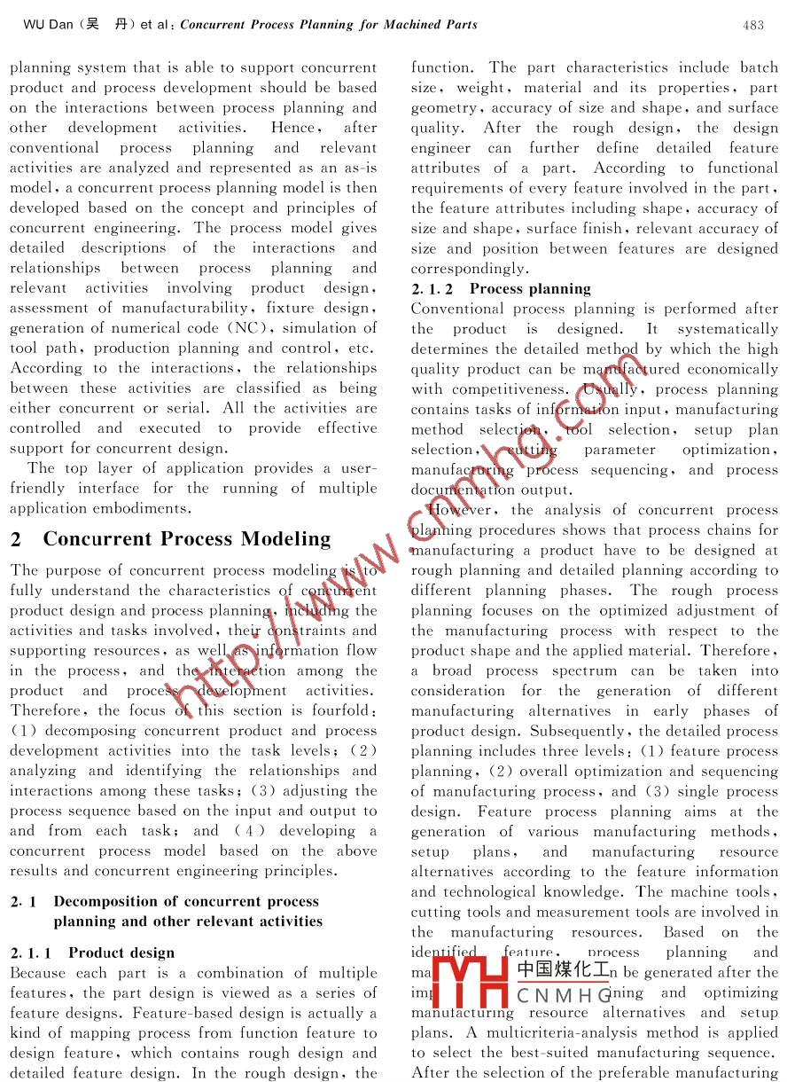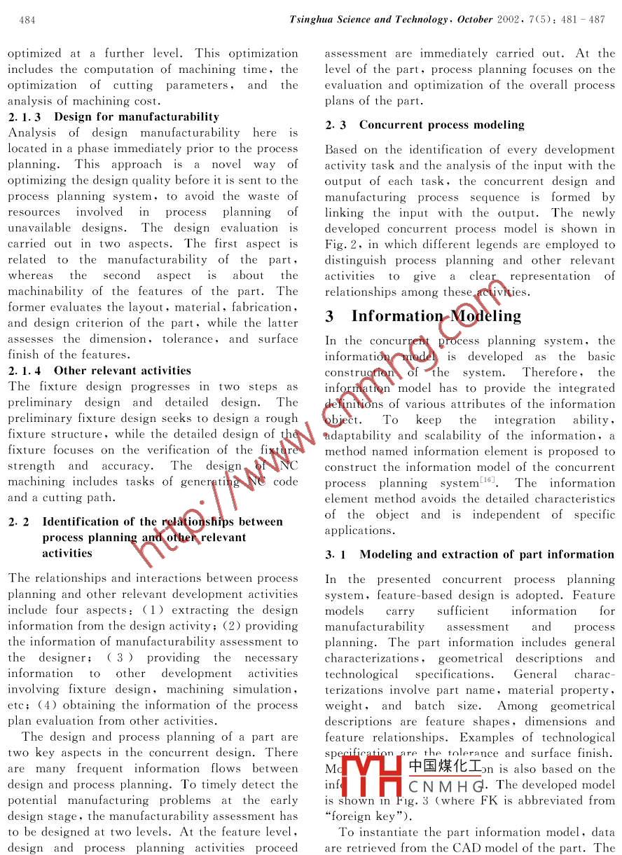 TSINGHUA SCIENCE AND TECHNOL0GYISSN 1007-0214 10/22pp481 - 487Volume 7,Number 5,October 2002Concurrent Process Planning for Machined Parts'WU Dan (吳丹)** ,WANG Xiankui (王先逵), LI Zhizhong (李志忠)Department of Precision Instruments and Mechanology,Tsinghua University, Beijing 100084,ChinaAbstract: Detailed manufacturing information about the parts can help designers produce better designs.Detailed manufacturing information is conveyed to the designer through micro. circles within the concurrentdesign process for machined parts, focusing on instantaneous product design and process planning. Theprocess has three key elements: a hier archical architecture design of the concurrent process planning system ,modeling and reengineering of the concurrent process planning, and modeling of information. The approach issuccessfully implemented and applied for concurrent design and process planning of some complicated parts.Key words: concurrent engineering; concurrent design; process planningand employment of design for X tools, such asIntroductiondesign for manufacturing, design for assembly,Development of a product undergoes a sequence ofdesign for cost, and design for serviceability. Inlife-cycle phases including design,process plan-the concurrent design, as the evaluations of thening,manufacturing,inspection, andmain-downstream productdevelopment aspects atenance. In the past,these product developmentcarried out instantaneously at the early designactivities were organized in a sequential manner :stage,this approachincreasesindustrialfrom design to downstream life-cycle phases. Ascompetitiveness by reducing the number of costlythe design engineers tend to generate designs withredevelopments,shortening product developmentexcellent functional performance, these designslead-time and providing high quality products.usually require excessive manufacturing efforts;Concurrent design is actually modeled bytherefore, leading to a high production costl1.21multipleiteration sub-processes called designTo reduce the gap between design and othercircles, for the gradual generation and addition ofdownstreamproductdevelopmentaspects,design information. Analyzing concurrent designconcurrent design has been extensively studied[3-8].shows that the iteration processes have to beConcurrent design is a method which incorporatesdesigned at different levels of macro- and micro-theconsiderationindow nstreamcircles. The macro circle emphasizes the roughdevelopment aspects into the design stage tosimultaneity of design withproduce a design with the best overall product life-development aspects at the level of a part, whilecycleperformance.Concurrentdesign isthe micro-circle focuses on the detailed informationcharacterized by early involvement of differentfeedback between design and downstream activitiesfunctional disciplines, parallelism and rational-at the feature level of the part. The existence ofization of sequential product development activities中國煤化工ffective increase in the .desMYHC N MH Ghich will shorten theproduct development per1od. With the goal ofReceived : 2001-04-26; revised: 2002-03-27* Supported by the State High- Tech Development Plan ofreflecting the essence of concurrent design, it isChina (No. 863-511- 9842- 011)necessary to make full use of the approach to*¥Towhom correspondence should be addressed. .micro-design circles from the point of both processE-mailm. tsinghua. edu.cn;and information. Based on the analysis of productTel: 86-10- 62773270development process involving design, process482Tsinghua Science and Technology, October 2002,7(5): 481 - 487planning, and other relevant aspects, an optimizedThe research in this paper aims at developing anprocessanddetailedinformation flow areapproach to instantaneous concurrent design andsubsequently reengineered to identify when andprocess planning focusing on the formation ofhow every sub-process runs, and what kind ofconcurrent design micro -circles and the provisioninformation flows among sub -processes.of detailed manufacturing information to help theIn concurrent design, downstream manufactur-designer to formulate appropriate manufacturinging information should be provided to make properspecifications and to yield the best product design.decisions at the design stage. Since process1 Architecture of Concurrentplanning is the stage of production preparationthrough product development aspects, it canProcess Planning Systemprovide detailed manufacturing information to theThe proposed system provides a concurrent processdesigner and play a crucial role in concurrentplanning environment for parts to be machined.design. Therefore, concurrent process planning isDuring the process planning stage, the plannerviewed as one of the most important areas ofshould be able to access design information andconcurrent design which deserves extensiveresearchE9-151.However,the framework of adesigner for manufacturability assessment.Theconcurrent process planning system at the micro-architecture of the system is designed in fourcircle level of concurrent design has not yet beenlayers: information, function, control andfully addressed.application, shown in Fig. 1.User interfaceApplication layerExecution and controlModeling ofControl layerof concurent processconcurrent pro--個-ETechnological decision-Definition ofmakingfunection modelFunction layer二二土一一一二一個二------Definition of information modelInformation layer| linformationlinformationJlinformationlinfommationFig.1 The architecture of the proposed concurrent process planning systemSince the information model is the basis of the .for making different technological decisionsconcurrent process planning system, the bottom ofaccording to various kinds of decision logic andthe architecture is designated as the informationproducing detailed manufacturing information.layer including information of parts, technologicalBasedonthedecision-makingengineknowledge,manufacturing resource, etc. Theinform