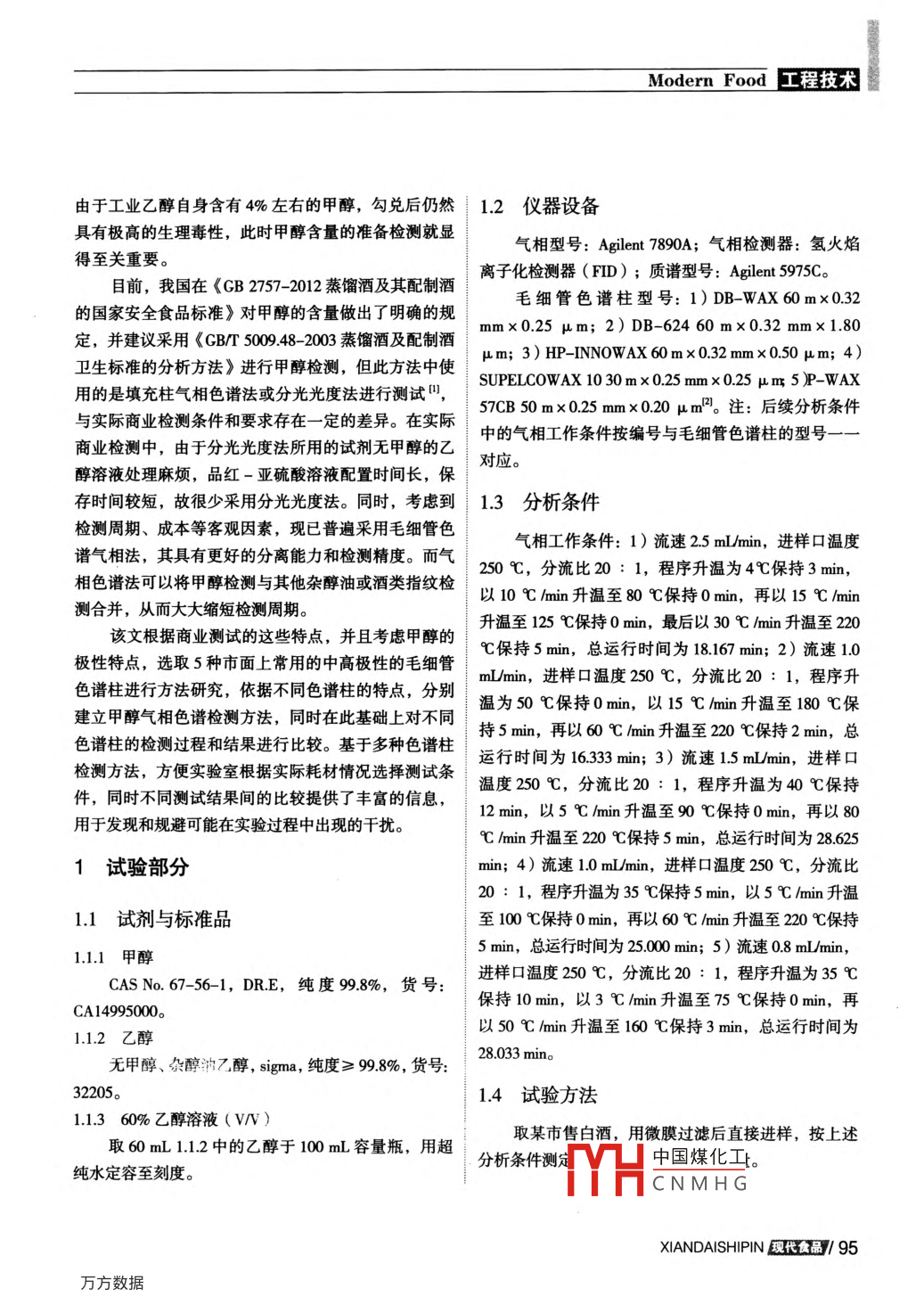 程技術(shù) Modern Food白酒中甲醇檢測方法的優(yōu)化Optimization of Methanol Detection Method in Chinese Spirit◎羅藝,楊琳,俞文清(通標標準技術(shù)服務(wù)(上海)有限公司,上海200000Luo Yi, Yang Lin, Yu WengingStandard technical service(Shanghai)Co., Ltd, Shanghai 200000, China)摘要:蒸餾酒及其配制酒的國家安全食品標準對甲醇的含量做出了明確的規(guī)定,并建議采用GB/T500948中提及的填充柱氣相色譜法或分光光度法進行測試,但在實際商業(yè)檢測中,已普遍采用毛細管色譜柱,并與白酒中其他易揮發(fā)雜質(zhì)或酒類指紋測試同時進行,從而提高測試精度并縮短檢測周期。該文根據(jù)商業(yè)測試的特點,選取了5種不同的毛細管色譜柱,分別建立了甲醇氣相色譜檢測方法,為商業(yè)檢測色譜柱及方法選擇提供了便利,同時通過測試結(jié)果的比較,確定了較優(yōu)化的測試方法。關(guān)鍵詞:白酒;甲醇;氣相色譜;毛細管;檢測方法Abstract: National food safety standard of distilled wine and mixed wine made an explicit requirementfor the content of methanol, and recommended GB/T 5009. 48 to test by using the packed column gaschromatography and spectrophotometric method. However, capillary chromatographic column has been usedwidely in the actual commercial tests, and methanol is determined with other volatile impurities and liquorfingerprint testing simultaneously to improve the test precision and shorten the testing period. Accordingto the characteristics of the commercial test, this study established the analytical test methods of methanolbased on gas chromatography of 5 different capillary columns, which is convenient to select capillaryhromatographic column and test method based on the result of this study. Meanwhile, this study selected thebetter test method through the comparison of test resultsKey words: Chinese spirits; Methanol; Gas chromatography; Capillary column; Test method中圖分類號:R1555白酒( Chinese spirits)是以糧谷為主要原料,以甲醇的毒性對人體的神經(jīng)和血液系統(tǒng)影響極大,消化大曲、小曲或麩曲及酒母等為糖化發(fā)酵劑,經(jīng)蒸煮、道、呼吸道和皮膚的攝入都會產(chǎn)生毒理反應(yīng),同時甲糖化、發(fā)酵、蒸餾而制成的蒸餾酒。白酒在生產(chǎn)過程醇蒸汽則能迅速地對人體的呼吸道和視力產(chǎn)生損害中會自然產(chǎn)生甲醇、乙醇和其他有機物質(zhì),但在蒸餾般正堂白酒中所含的話量甲醇對人體并無傷的過程中,由于甲醇和乙醇的沸點較接近,甲醇無法害,并且還中國煤化紋標志,用于完全分離,導致白酒中不可避免地存在一定量的甲醇。品牌白酒的鑒CNMH兌的假冒白酒,94瓜魂代食品 XIANDAISHIPINModern food程技術(shù)由于工業(yè)乙醇自身含有4%左右的甲醇,勾兌后仍然1.2儀器設(shè)備具有極高的生理毒性,此時甲醇含量的準備檢測就顯氣相型號: agilent7890A;氣相檢測器:氫火焰得至關(guān)重要。目前,我國在《CB2757-2012蒸餾酒及其配制酒離子化檢測器(FD);質(zhì)譜型號: agilent5975C。的國家安全食品標準》對甲醇的含量做出了明確的規(guī)毛細管色譜柱型號:1)DB-WAX60m×0.32定,并建議采用《cB/T500948-2003蒸餾酒及配制酒nm×0.25m;2)DB-62460m×0.32mm×1.80Hm; 3 )HP-INNOWAX 60 m x 0.32 mm x 0.50 H m; 4)衛(wèi)生標準的分析方法》進行甲醇檢測,但此方法中使用的是填充柱氣相色譜法或分光光度法進行測試 n] SUPELCOWAX1030m×025mmx0.25μm5-WAX57CB50m×0.25mm×0.20μm2。注:后續(xù)分析條件與實際商業(yè)檢測條件和要求存在一定的差異。在實際中的氣相工作條件按編號與毛細管色譜柱的型號商業(yè)檢測中,由于分光光度法所用的試劑無甲醇的乙對應(yīng)。醇溶液處理麻煩,品紅-亞硫酸溶液配置時間長,保存時間較短,故很少采用分光光度法。同時,考慮到13分析條件檢測周期、成本等客觀因素,現(xiàn)已普遍采用毛細管色氣相工作條件:1)流速25m/min,進樣口溫度譜氣相法,其具有更好的分離能力和檢測精度。而氣250℃,分流比20:1,程序升溫為4℃保持3min,相色譜法可以將甲醇檢測與其他雜醇油或酒類指紋檢測合并,從而大大縮短檢測周期。以10℃/min升溫至80℃保持0min,再以15℃/min該文根據(jù)商業(yè)測試的這些特點,并且考慮甲醇的升溫至125℃保持0min,最后以30℃/min升溫至220℃保持5min,總運行時間為18.167min;2)流速1.0極性特點,選取5種市面上常用的中高極性的毛細管色譜柱進行方法研究,依據(jù)不同色譜柱的特點,分別mL/min,進樣口溫度250℃,分流比20:1,程序升溫為50℃保持0min,以15℃hmin升溫至180℃保建立甲醇氣相色譜檢測方法,同時在此基礎(chǔ)上對不同色譜柱的檢測過程和結(jié)果進行比較?;诙喾N色譜柱持5min,再以60℃/min升溫至220℃保持2min,總檢測方法,方便實驗室根據(jù)實際耗材情況選擇測試條運行時間為1633min;3)流速15ml/min,進樣口件,同時不同測試結(jié)果間的比較提供了豐富的信息,溫度250℃,分流比20:1,程序升溫為40℃保持12min,以5℃/min升溫至90℃保持0min,再以80用于發(fā)現(xiàn)和規(guī)避可能在實驗過程中出現(xiàn)的干擾?!?min升溫至220℃保持5min,總運行時間為286251試驗部分min;4)流速1.0mI/min,進樣口溫度250℃,分流比20:1,程序升溫為35℃保持5min,以5℃/min升溫11試劑與標準品至100℃保持0min,再以60℃/min升溫至220℃保持1.1.1甲醇5min,總運行時間為25000min;5)流速0.8ml/min,CAS No.67-56-1,DRE,純度99.8%,貨號:進樣口溫度250℃,分流比20:1,程序升溫為35℃保持10min,以3℃/min升溫至75℃保持0min,再CA14995000。1.1.2乙醇以50℃/min