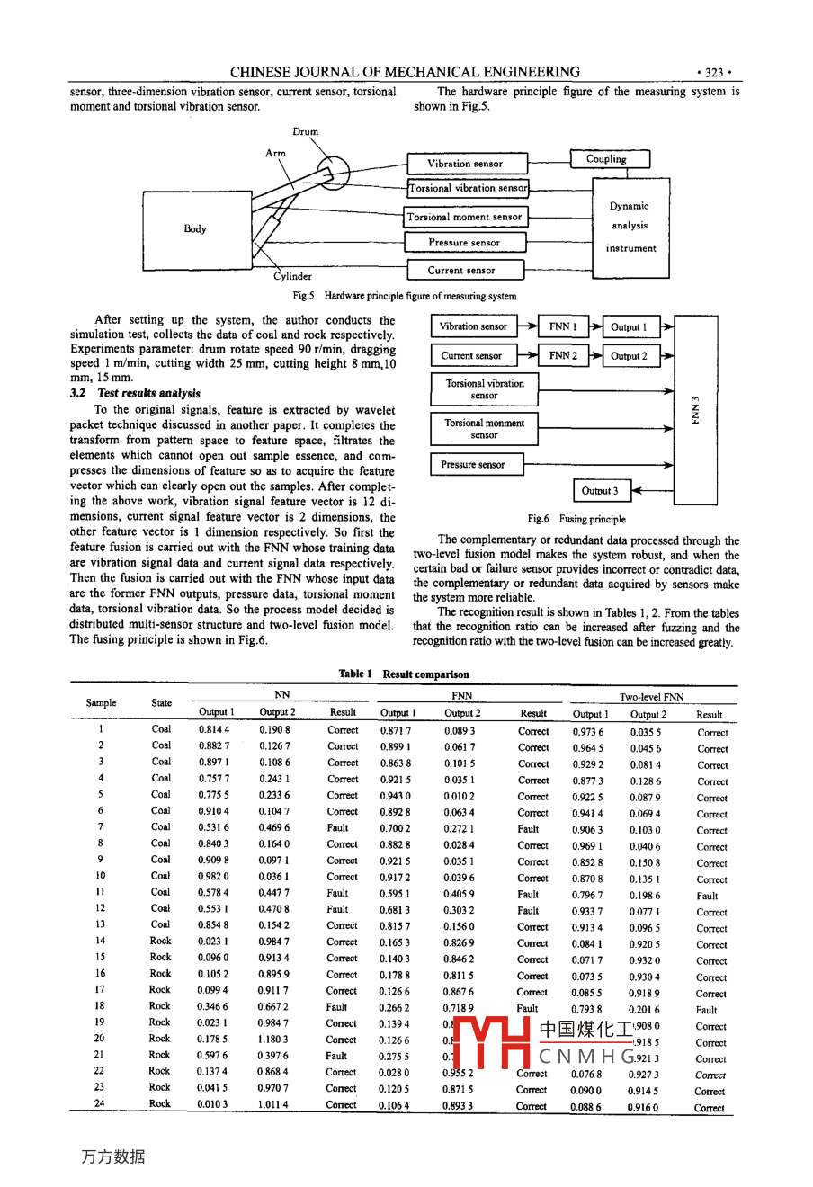 CHINESE JOURNAL OF MECHANICAL ENGINEERINGvol.16,No.3,2003321·STUDY ON THE COAL-ROCK INTER-FACE RECOGNITION METHODRen FangBASED ON MULTI-SENSOR DATAYang ZhaojianFUSION TECHNIQUEXiong shibTP8,Cz3月Research institute of Mechano-Abstract: The coal-rock interface recogmition method based on multi-sensor data fusion technique isTaiyuan University of Technology.forward because of the localization of single type sensor recognition method. The measuring theoryTaiyuan 030024, Chinabased on multi-sensor data fusion technique is analyzed, and hereby the test platform of recognitionsystem is manufactured. The advantage of data fusion with the fuzzy neural network(FNN)techniqhas been probed. The two-level FNN is constructed and data fusion is camied out. The experimentsshow that in various conditions the method can always acquire a much higher recognition rate thanKey words: Coal-rock interface recognition( CIR) Data fusion(DF) Multi-sensorsource information. The purpose of DF is0 INTRODUCTIONdescription of the object by calculating andthe existedmulti-source signals. Thus a more accuratethe ability to automatically trace the coak) can make the shearer have ment can be made. Multi-sensor may have different features: on-ciple is shown in Fig. 1. It cannot only contribute to mine automation, fuzzy or accurate information; compleary or contradict infor-but also reduce the content of rock and the other mineral that must be mation. Multi-sensor DF can fully take advantage of multi-sensorremoved in the process of coal beneficiation. In the recent years, USA sources, and then syntheses the complementary or redundant infor-and some other countries have developed CiR as an important project mation both in time and in space according to certain algorithms orbecause it is one of the key techniques of mining automation.principles, so identical description to detect object can be availableTop rock Vibration sensor CoalThese DFs can enlarge the range of time and space, enhance confi-dence bounds, reduce fuzzification, improve detecting property, andenhance system reliability greatly. In the multi-sensor system,theinformation given by each sensor is somewhat unreliable. DF proc-ess is in fact an unsurely inductive process. The recognition algo-theory, which constructs state space model of fusion object andestimate with the different estimate method, such as kalman filterFig 1 Detecting method of coal-rock interfacemaximum likelihood estimate, least square fitting. @2 Data fusionmethod based on statistic theory. It is based on estimate theoryAt present, methods worldwidely adopted in this field are as which realizes data fusion with the iteration algorithm, such asfollows:( Sensor method based on NGR(nature gamma radia- Bayesian method, D-S algorithm and markov random field methodtions)o.@ Sensor method based on cutting force response of 3 Artificial intelligence fusion method based on knowledge.Theshearer.@3 Infrared rays detecting device. Vibration sensor method is based on theory of rule-based model. The data fusion ismethod. These methods collect data by the single type sensor only. carried out when the two or some regulations about the same objectBecause every single sensor has its own special certain precision and are combined into a same regulation in the logic interfere process,application range, collecting data by the single type sensor is limited such as blackboard architecture. 4 Fusion method based on in-to a certain area and fault recognition is sometimes unavoidable. formation, the method is based on information processResearching and developing a recognition system using multi-sensor which is developed recent years and possesses the higheris a tendency to provide design base for the height adjustment system. gence such as neural network(NN), entropy method, clusterDue to the above consideration, a new idea has come with collecting sis, fuzzy logic method and vote methodgnals related to cutting status of shearer with multi-sensor, such asNN technology wins favor with its unique advantage amongmotor current signal, oil pressure signal, vibration signal of non rotary the methods. NN regards the known data and the known conditionnal moment and torsional vibration signals of drum shaft. modal as sample, gets the map relation between the data and theIn a word, fusing multi-signal to recognize coal rock interface can modal through studying. In the NN system, signal storage andhance precision and accuracy greatlycess merge into a whole. NN can induce the integrative inforation from the partial and imprecise information, because it has1 MULTI-SENSOR DATA FUSIONlitv. information Drocessing ability and perfectData fusion (DF)is a kind of processing method with multi- develop中國煤化工 The production andfoCNMHG Because the generlogic mode, the inputThis project is supported by Provincial Youth Science Foundation of Shanxi, or output of network belongs to either this kind or that kinds-Butna(No 20011020)and National Natural Science Foundation of China in practice, the classification boundary of data is usually fuzzy or(No. 59975064). Received June2003: accepted April 10, 2003sometimes wan. So if the information is not kept in the network322. Ren Fang, et al: Study on the coal-rock interface recognition method based ondata fusion techniqueduring the training, the recognition ratio of network cannot beTo every xian be determined according to thered. In order to solve the problem, the author is enlightened formula u f(oxhich f= sigmoid(r). a and 6 can beby the fuzzy technique, and combines fuzzy technique with the determined whenInction a is minimized, given(x, u,),nn to identify stateuzzy technique can be combined with nN due to many is1.2....Nimilarities0l.( From the mapping view they posses non-liE=∑(1-)/Nfunction nearly ability. As for the style of data process theyall settle the process parallelly. In the aspect of the inside where Ar--Desire outputmechanism there are many similarities between the member