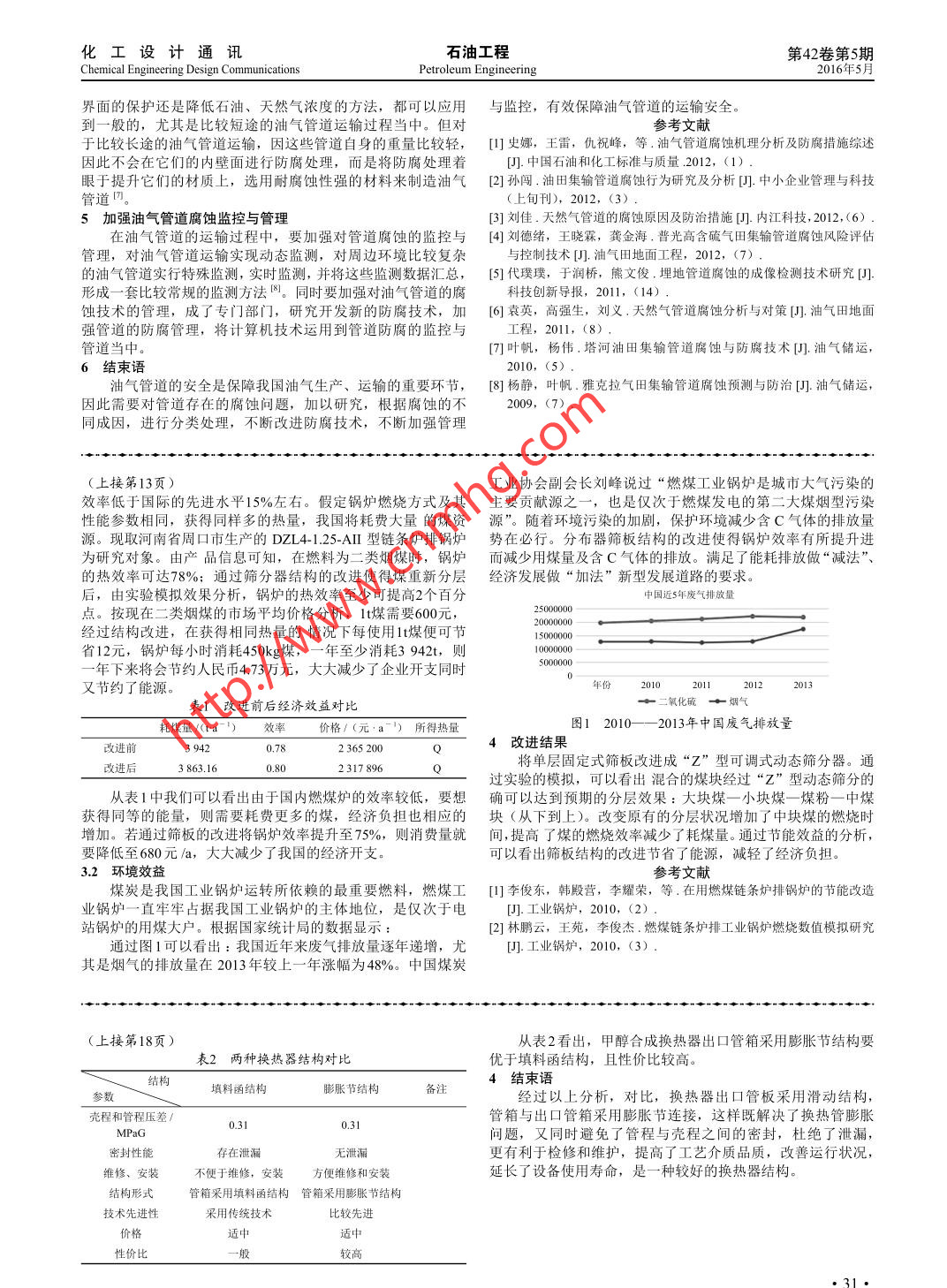 第42卷第5期煤化工與甲醇化工設(shè)計通訊2016年5月Coal Cemical MethanolChemical Engineering Design Communications甲醇合成換熱器結(jié)構(gòu)優(yōu)化張建民,李愛玲(新能能源 有限公司,內(nèi)蒙古達拉特旗014300)摘要:通過對甲醇合成換熱器結(jié)構(gòu)進行對比,換熱器管箱采用膨脹節(jié)結(jié)構(gòu)明顯優(yōu)于填料函結(jié)構(gòu),有效地降低泄漏,提高合成產(chǎn)率,更好地適應(yīng)生產(chǎn)需要。關(guān)鍵詞:穩(wěn)定輕烴; LNG;換熱器;合成;甲醇;填料函;膨脹節(jié)中圖分類號: TQ223.121文獻標志碼:A文章編號: 1003- 6490 (2016) 05- 0018 -02Methanol Synthesis of Heat Exchanger Structure OptimizationZhang Jian-min, Li Ai-lingAbstract : Based on methanol synthesis heat exchanger structure, heat exchanger tube box packing box structure is obviously betterthan the structure of expansion joint, reduce leakage effectively,improve the synthesis yield, better meet the needs of production.Key words : natural gasoline natural gas liquid stabilized light hydrocarbon ; LNG ; heat exchanger ; synthesis ; methyl alcohol ;stufing box ; expansion joint新能能源有限公司是新奧生態(tài)控股股份有限公司(股票代構(gòu),另一端管板采用滑動結(jié)構(gòu),屬于自由端形式,滑動管板碼: 600803)下屬子公司,是新奧集團成員企業(yè)之一,主要從與 出口管箱采用膨脹節(jié)部件,分別采用法蘭連接,構(gòu)成管程事煤基化工生產(chǎn)。一期已建成投產(chǎn)60萬ta甲醇項目、目前實出口管道,可有效補償管程系統(tǒng)的伸縮量,杜絕殼程介質(zhì)向現(xiàn)滿負荷穩(wěn)定生產(chǎn)。二期以當?shù)刎S富的煤原料,采用水煤漿氣管程泄漏,同時管箱采用膨脹節(jié)結(jié)構(gòu)便于安裝和檢修。化、催化氣化、加氫氣化等工藝,配套低溫甲醇洗、變換、甲228醇合成、穩(wěn)定輕烴等裝置生產(chǎn)20萬t/a 穩(wěn)定輕烴,同時副產(chǎn)2億m' (標) /aLNG,于2015年6月正式啟動, 目前處于施工建設(shè)階段。1概述新能達旗二期項目,采用卡薩利工藝包,甲醇合成換熱器均采用臥式結(jié)構(gòu),屬于高壓設(shè)備,其主要功能合成塔入口與出口氣體進行換熱,是合成工段主要設(shè)備(主要參數(shù)見表1),換熱管較長,管程和殼程膨脹較大,存在泄漏現(xiàn)象,不能較好滿足生產(chǎn)需要。表1甲醇合成換熱器主要參數(shù)圖1原換熱器結(jié)構(gòu)圖主要參數(shù)_殼程管程19.殼程; 20.殼程出口: 21.折流板; 22.滑 動管板;冷合成氣熱合成氣.23.管程封頭; 24.殼程封頭; 25.管箱; 26.管程出口;操作溫度1設(shè)計溫度/C 61 ~ 230/280262.5 ~ 121.3/34027.擋板: 28.管箱蓋板操作壓力1設(shè)計壓力/(MPaG) 8.679.58.36/9.5換熱面積/ m2?3501.6換熱管規(guī)格φ 14X2X12000換熱管數(shù)量/根重量/t總重119:管程重量582原換熱器設(shè)計結(jié)構(gòu)甲醇合成換熱器原設(shè)計結(jié)構(gòu)(見圖1),采用浮頭式換熱器結(jié)構(gòu),換熱器管板- -端固定,另一端可以滑動,其滑動管圖2原管箱結(jié)構(gòu)圖板與管程出口管箱采用焊接連接,管程出口管箱和管程出口段連接段采用填料函結(jié)構(gòu)(見圖2),在起初運行工況中,可1.管箱封頭; 2.內(nèi)管箱; 3.填料; 4.填料環(huán);有效解決殼程與管程熱膨脹問題,隨著使用壓力、溫度和介5.填料壓蓋; 6.外管箱; 7.殼程外壁; 8.螺栓、螺母.質(zhì)的變化,換熱器使用效果一般。填料函密封結(jié)構(gòu)存在著殼.- 8913101L11617程介質(zhì)向管程泄漏的現(xiàn)象,造成換熱效果不理想,合成產(chǎn)率降低,能耗增加,設(shè)備使用壽命縮短,不能較好滿足生產(chǎn)需要。3改進后換熱器結(jié)構(gòu)甲醇合成換熱器正常運行,必須保證管板和管程正常伸縮量,否則會出現(xiàn)管板嚴重變形,結(jié)合實際工況,保證原換熱器主要設(shè)備結(jié)構(gòu)不變的情況下,將管程出口管箱改造為膨脹節(jié)結(jié)構(gòu)(詳見圖3),膨脹節(jié)部件由膨脹節(jié)、內(nèi)筒和法蘭組成,膨脹節(jié)一端與內(nèi)筒強度焊接,另一端與內(nèi)筒密封焊接,從而確保膨脹節(jié)伸縮自由;換熱器管程一端管板采用固定管板結(jié)圖3 改進后管箱結(jié)構(gòu)圖8.管程封頭; 9.螺栓螺母; 10膨脹節(jié)(帶配套法蘭) ; 11.管 箱;收稿日期: 2016 -05- 1212.螺栓螺母; 13.殼程封頭; 14殼程外壁; 15.密封墊片;作者簡介:張建民(1972-), 男,山西太原人,設(shè)備工程師,主要16.管程蓋板; 17.螺栓螺母從事設(shè)備技術(shù)管理工作。(下轉(zhuǎn)第31頁)●18●化工設(shè)計通訊石油工程第42卷第5期Chemical Engineering Design CommunicationsPetroleum Engineering2016年5月界面的保護還是降低石油、天然氣濃度的方法,都可以應(yīng)用與監(jiān)控,有效保障油氣管道的運輸安全。到一般的,尤其是比較短途的油氣管道運輸過程當中。但對參考文獻于比較長途的油氣管道運輸,因這些管道自身的重量比較輕,[] 史娜,王雷, 仇祝峰,等.油氣管道腐蝕機理分析及防腐措施綜述因此不會在它們的內(nèi)壁面進行防腐處理,而是將防腐處理著[J].中國石油和化工標準與質(zhì)量.2012, (1)眼于提升它們的材質(zhì)上,選用耐腐蝕性強的材料來制造油氣[2]孫闖.油田集輸管道腐蝕行為研究及分析[].中小企業(yè)管理與科技(上旬刊), 2012, (3)5加強油氣管道腐蝕監(jiān)控與管理[3]劉佳.天然氣管道的腐蝕原因及防治措施[D]. 內(nèi)江科技, 2012,(6) .在油氣管道的運輸過程中,要加強對管道腐蝕的監(jiān)控與[4]劉