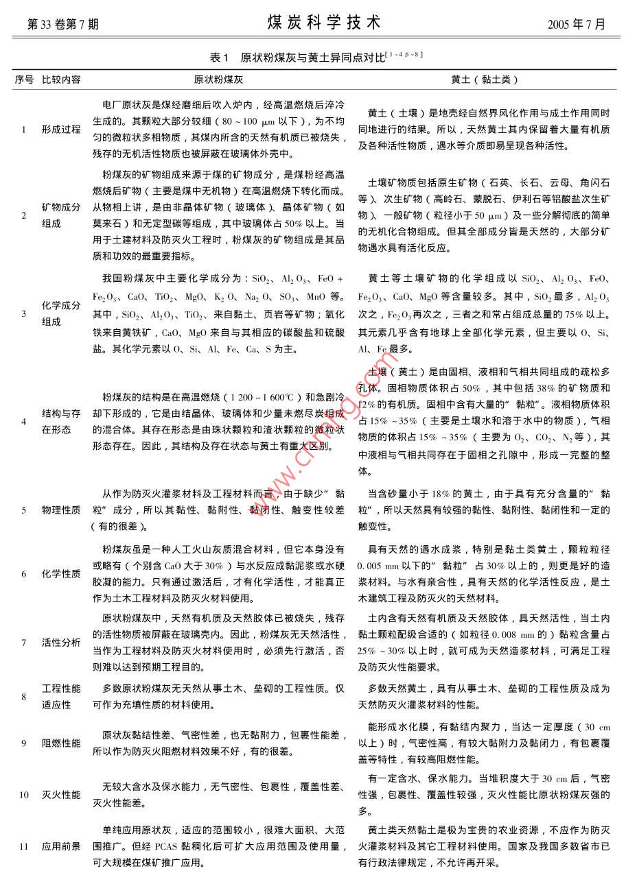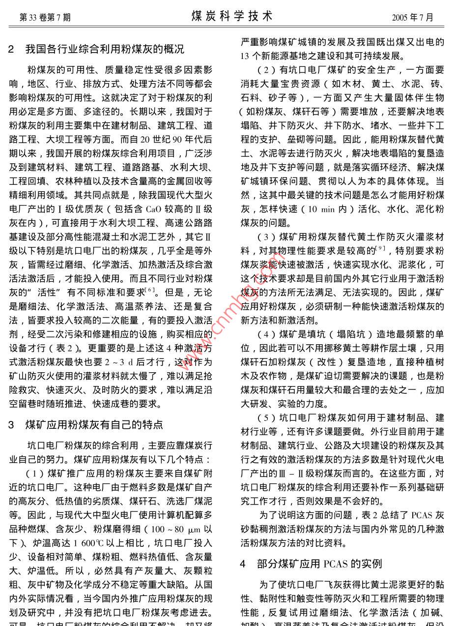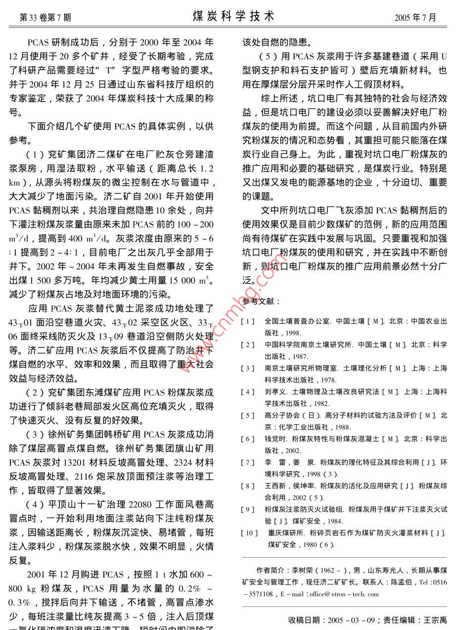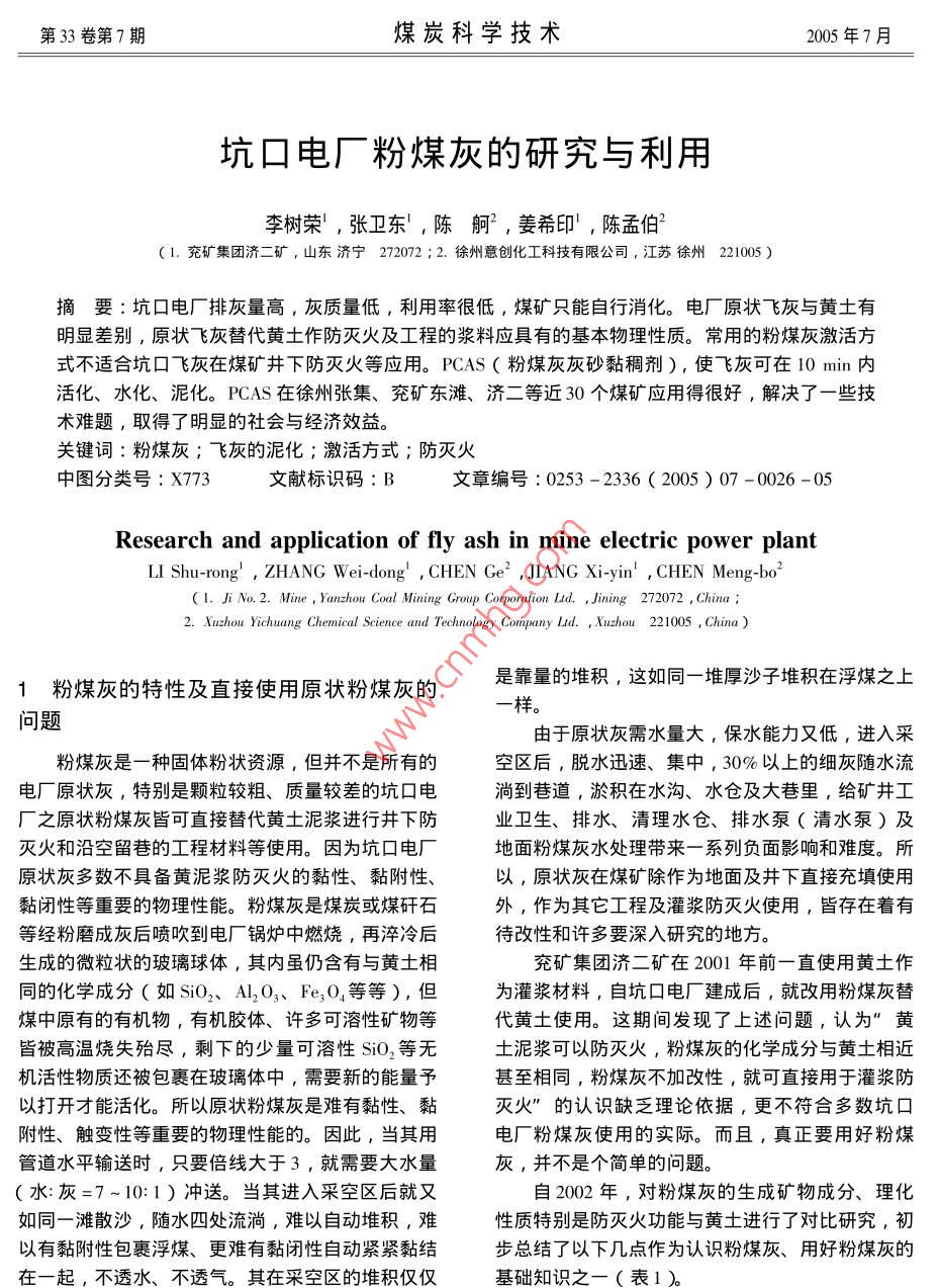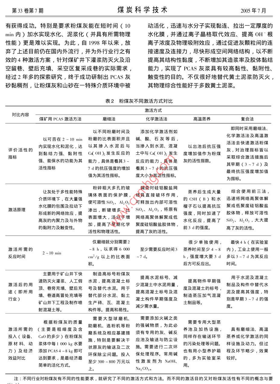 第33卷第7期煤炭科學(xué)技術(shù)2005年7月坑囗電廠粉煤灰的研究與利用李樹榮,張衛(wèi)東,陳舸2,姜希印,陳孟伯1.兗礦集團(tuán)濟(jì)二礦,山東濟(jì)寧272072;2.徐州意創(chuàng)化工科技有限公司,江蘇徐州221005)摘要∶坑口電廠排灰量高,灰質(zhì)量低,利用率很低,煤礦只能自行消化。電廠原狀飛灰與黃土有明顯差別,原狀飛灰替代黃土作防滅火及工程的漿料應(yīng)具有的基本物理性質(zhì)。常用的粉煤灰激活方式不適合坑口飛灰在煤礦井下防滅火等應(yīng)用。PCAS(粉煤灰灰砂黏稠劑),使飛灰可在10min內(nèi)活化、水化、泥化。PAS在徐州張集、兗礦東灘、濟(jì)二等近30個(gè)煤礦應(yīng)用得很好,解決了一些技術(shù)難題,取得了明顯的社會(huì)與經(jīng)濟(jì)效益。關(guān)鍵詞:粉煤灰;飛灰的泥化;激活方式;防滅火中圖分類號(hào):X773文獻(xiàn)標(biāo)識(shí)碼:B文章編號(hào):0253-2336(2005)07-0026-05Research and application of fly ash in mine electric power plantLI Shu-rong, ZHANG Wei-dong, ChEn Ge", JIANG Xi-yin, CHEN Meng-bo(I. Ji No. 2. Mine, Yanzhou Coal Miup Corporation Lid. Jining 272072, China2. Xuzhou Yichuang Chemical Science and Technology Company Lid. Xuzhou 221005, China粉煤灰的特性及直接使用原狀粉煤灰的是靠量的堆積,這如同一堆厚沙子堆積在浮煤之上問題一樣由于原狀灰需水量大,保水能力又低,進(jìn)入采粉煤灰是一種固體粉狀資源,但并不是所有的空區(qū)后,脫水迅速、集中,30%以上的細(xì)灰隨水流電廠原狀灰,特別是顆粒較粗、質(zhì)量較差的坑口電淌到巷道,淤積在水溝、水倉及大巷里,給礦井工廠之原狀粉煤灰皆可直接替代黃土泥漿進(jìn)行井下防業(yè)衛(wèi)生、排水、清理水倉、排水泵(清水泵)及滅火和沿空留巷的工程材料等使用。因?yàn)榭涌陔姀S地面粉煤灰水處理帶來一系列負(fù)面影響和難度。所原狀灰多數(shù)不具備黃泥漿防滅火的黏性、黏附性、以,原狀灰在煤礦除作為地面及井下直接充填使用黏閉性等重要的物理性能。粉煤灰是煤炭或煤矸石外,作為其它工程及灌漿防滅火使用,皆存在著有等經(jīng)粉曆成灰后噴吹到電廠鍋爐中燃燒,再淬冷后待改性和許多要深入硏究的地方。生成的微粒狀的玻璃球體,其內(nèi)雖仍含有與黃土相兗礦集團(tuán)濟(jì)二礦在2001年前一直使用黃土作同的化學(xué)成分〔如SO2、Al2O3、re3O等等),但為灌漿材料,自坑口電廠建成后,就改用粉煤灰替煤中原有的有機(jī)物,有機(jī)膠體、許多可溶性礦物等代黃土使用。這期間發(fā)現(xiàn)了上述問題,認(rèn)為”黃皆被高溫?zé)ТM,剩下的少量可溶性SiO2等無土泥漿可以防滅火,粉煤灰的化學(xué)成分與黃土相近機(jī)活性物質(zhì)還被包裹在玻璃體中,需要新的能量予甚至相同,粉煤灰不加改性,就可直接用于灌漿防以打開才能活化。所以原狀粉煤灰是難有黏性、黏滅火”的認(rèn)識(shí)缺乏理論依據(jù),更不符合多數(shù)坑口附性、觸變性等重要的物理性能的。因此,當(dāng)其用電廠粉煤灰使用的實(shí)際。而且,真正要用好粉煤管道水平輸送時(shí),只要倍線大于3,就需要大水量灰,并不是個(gè)簡單的問題水:灰=7~10:1)沖送。當(dāng)其進(jìn)入采空區(qū)后就又自2002年,對(duì)粉煤灰的生成礦物成分、理化如同一灘散沙,隨水四處流淌,難以自動(dòng)堆積,難性質(zhì)特別是防滅火功能與黃土進(jìn)行了對(duì)比研究,初以有黏附性包裹浮煤、更難有黏閉性自動(dòng)緊緊黏結(jié)步總結(jié)了以下幾點(diǎn)作為認(rèn)識(shí)粉煤灰、用好粉煤灰的在一起,不透水、不透氣。其在采空區(qū)的堆積僅僅基礎(chǔ)知識(shí)之一(表1第33卷第7期煤炭科學(xué)技術(shù)2005年7月表1原狀粉煤灰與黃土異同點(diǎn)對(duì)比14581序號(hào)比較內(nèi)容原狀粉煤灰黃土(黏土類)電廠原狀灰是煤經(jīng)磨細(xì)后吹入爐內(nèi),經(jīng)高溫燃燒后淬冷1形成過程生成的其顆粒大部分較細(xì)(80-100m以下),為不均同地進(jìn)行的結(jié)果。所以,天然黃士其內(nèi)保留著大量有機(jī)質(zhì)殘存的無機(jī)活性物質(zhì)也被屏蔽在玻璃體外殼中。及各種活性物質(zhì),遇水等介質(zhì)即易呈現(xiàn)各種活性。粉煤灰的礦物組成來源于煤的礦物成分,是煤粉經(jīng)高溫燃燒后礦物(主要是煤中無機(jī)物)在高溫燃燒下轉(zhuǎn)化而成土堰礦物質(zhì)包括原生礦物(石英、長石、云母、角閃石等)次生礦物(高嶺石、蒙脫石、伊利石等鋁酸鹽次生礦礦物成分從物相上講,是由非晶體礦物(玻瑞體)晶體礦物(如物)一般礦物(粒徑小于50μm)及一些分解徹底的簡單莫來石)和無定型碳等組成,其中玻璃體占50%以上。當(dāng)用于土建材料及防滅火工程時(shí),粉煤灰的礦物組成是其品的無機(jī)化合物組成。但其全部成分皆是天然的,大部分礦物遇水具有活化反應(yīng)質(zhì)和功效的最重要指標(biāo)。我國粉煤灰中主要化學(xué)成分為:SiO2、Al2O3、FeO+黃土等土壤礦物的化學(xué)組成以S;O2、Al2O3、FeO化學(xué)成分Fe2O3、CaO、TO2、MgO、K2O、Na2O、SO3、MnO等。Fe2O3、CnO、MgO等含量較多。其中,SiO2最多,Al2O3其中,SiO2、A2O3、TO2、來自黏土、頁巖等礦物;氧化次之,Fe2O3再次之,三者之和常占組成總量的75%以上。鐵來自黃鐵礦,CaO、MgO來自與其相應(yīng)的碳酸鹽和硫酸其元素幾乎含有地球上全部化學(xué)元素,但主要以O(shè)、Si鹽。其化學(xu