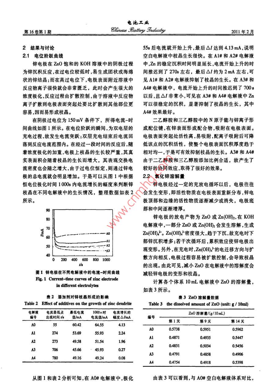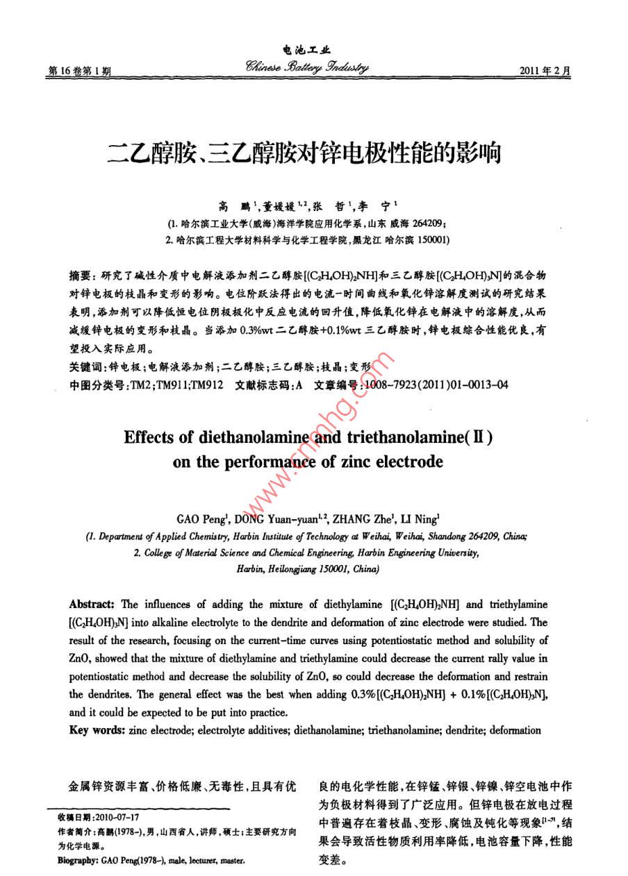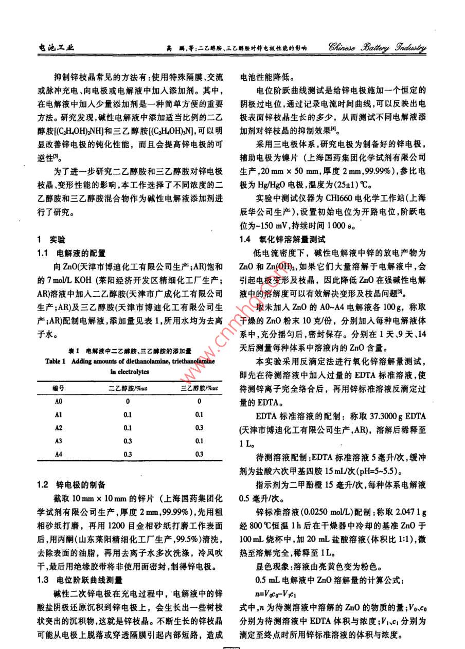 二乙醇胺、三乙醇胺對鋅電極性能的影響 二乙醇胺、三乙醇胺對鋅電極性能的影響