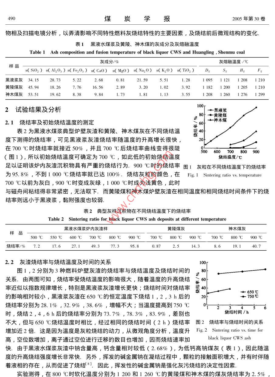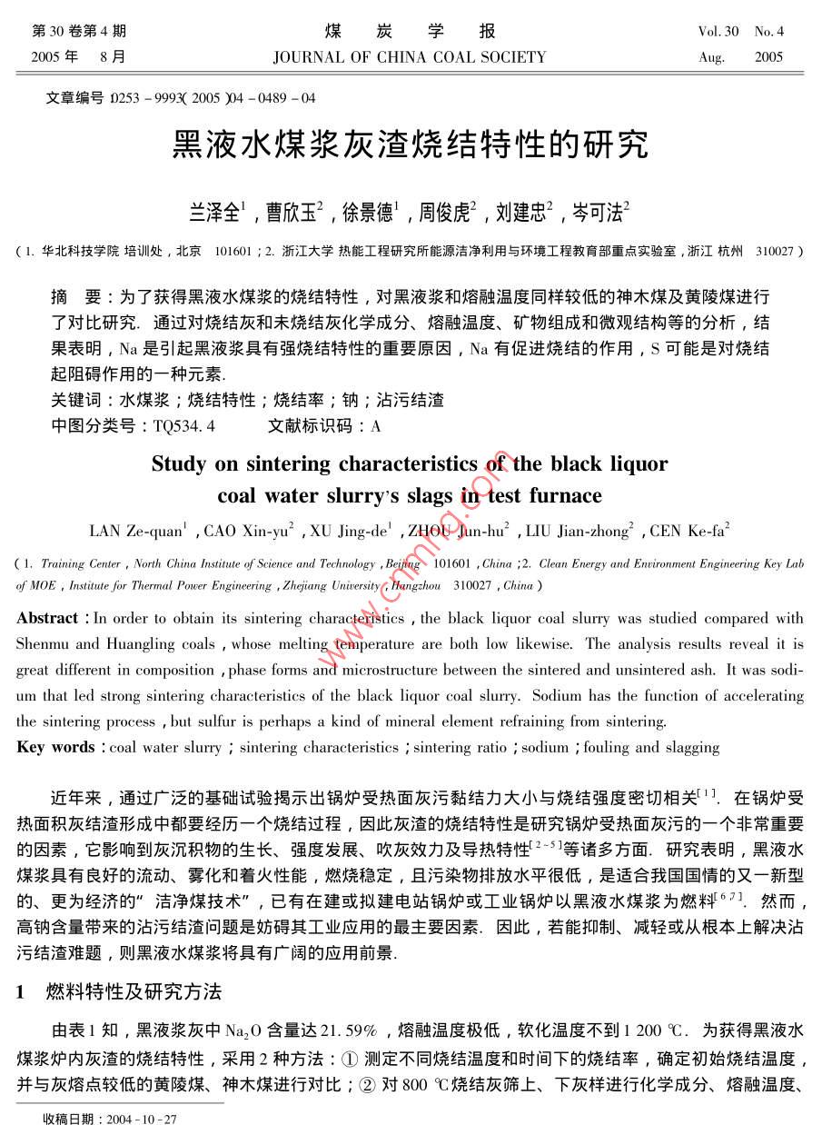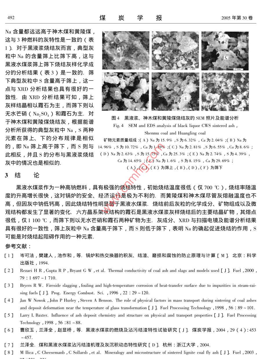 第30卷第4期煤炭學(xué)報(bào)Vol, 30 No 42005年8月JOURNAL OF CHINA COAL SOCIETY2005文章編號(hào)0253-9993(2005)4-0489-04黑液水煤漿灰渣燒結(jié)特性的研究蘭澤全,曹欣玉2,徐景德!,周俊虎2,劉建忠2,岑可法2〔1.華北科技學(xué)院培訓(xùn)處,北京101601;2.浙江大學(xué)熱能工程研究所能源潔凈利用與環(huán)境工程教育部重點(diǎn)實(shí)驗(yàn)室,浙江杭州31007)摘要∶為了獲得黑液水煤漿的燒結(jié)特性,對(duì)黑液漿和熔融溫度冋樣較低旳神木煤及黃陵煤進(jìn)行了對(duì)比研究.通過(guò)對(duì)燒結(jié)灰和未燒結(jié)灰化學(xué)成分、熔融溫度、礦物組成和微觀結(jié)構(gòu)等的分析,結(jié)果表明,Na是引起黑液漿具有強(qiáng)燒結(jié)特性的重要原因,№a有促進(jìn)燒結(jié)的作用,S可能是對(duì)燒結(jié)起阻礙作用的一種元素關(guān)鍵詞∵水煤漿;燒結(jié)特性;燒結(jié)率;鈉;沾污結(jié)渣中圖分類號(hào):TQ534.4文獻(xiàn)標(biāo)識(shí)碼:AStudy on sintering characteristics of the black liquorcoal water slurry's slags in test furnaceLAn Ze-quan', CAO Xin-yu, XU Jing-de, ZHOU Jun-hu', LIU Jian-zhong, cen Ke-fa(l. Training Center, North China institute of Science and Technology, Beijing 101601, China 2. Clean Energy and Environment Engineering Key Labf MOE, Institute for Thermal Pouer Engineering Zhejiang Uniersity Hangzhou 310027, ChinaAbstract: In order to obtain its sintering characteristics the black liquor coal slurry was studied compared withShenmu and Huangling coals whose melting temperature are both low likewise. The analysis results reveal it isgreat different in composition, phase forms and microstructure between the sintered and unsintered ash. It was sodium that led strong sintering characteristics of the black liquor coal slurry. Sodium has the function of acceleratingthe sintering process but sulfur is perhaps a kind of mineral element refraining from sinteringKey words: coal water slurry sintering characteristics sintering ratio sodium fouling and slagging近年來(lái),通過(guò)廣泛的基礎(chǔ)試驗(yàn)揭示出鍋爐受熱面灰污黏結(jié)力大小與燒結(jié)強(qiáng)度密切相關(guān)1.在鍋爐受熱面積灰結(jié)渣形成中都要經(jīng)歷一個(gè)燒結(jié)過(guò)程,因此灰渣的燒結(jié)特性是研究鍋爐受熱面灰污的一個(gè)非常重要的因素,它影響到灰沉積物的生長(zhǎng)、強(qiáng)度發(fā)展、吹灰效力及導(dǎo)熱特性2-3等諸多方面.研究表明,黑液水煤漿具有良好的流動(dòng)、霧化和著火性能,燃燒穩(wěn)定,且污染物排放水平很低,是適合我國(guó)國(guó)情的又一新型的、更為經(jīng)濟(jì)的″潔凈煤技術(shù)″,已有在建或擬建電站鍋爐或工業(yè)鍋爐以黑液水煤漿為燃料6.然而高鈉含量帶來(lái)的沾污結(jié)渣問(wèn)題是妨礙其工業(yè)應(yīng)用的最主要因素.因此,若能抑制、減輕或從根本上解決沾污結(jié)渣難題,則黑液水煤漿將具有廣闊的應(yīng)用前景.1燃料特性及研究方法由表1知,黑液漿灰中Na2O含量達(dá)21.59%,熔融溫度極低,軟化溫度不到1200℃.為獲得黑液水煤漿爐內(nèi)灰渣的燒結(jié)特性,采用2種方法∶①測(cè)定不同燒結(jié)溫度和時(shí)間下的燒結(jié)率,確定初始燒結(jié)溫度并與灰熔點(diǎn)較低的黃陵煤、神木煤進(jìn)行對(duì)比;②對(duì)8σ0℃燒結(jié)灰篩上、下灰樣進(jìn)行化茡成分、熔融溫度、煤炭學(xué)報(bào)2005年第30卷物相及掃描電鏡分析,以弄清影響不同特性燃料灰燒結(jié)特性的主要因素,及燒結(jié)前后微觀結(jié)構(gòu)的變化.表1黑液水煤漿及黃陵、神木煤的灰成分及灰熔融溫度Table 1 Ash composition and fusion temperature of black liquor Cws and Huangling, Shenmu coal灰成分/%灰熔融溫度/℃樣品I( Sio,)u( Al,,)u( Fe2O,)n( Cao) u( MgO) I( Na2O) I( K20) u( TiO,) D,黑液漿灰34.1528.7321,591095112112081210黃陵煤灰45.943.20煤灰53.5119.628.381.731.81133.5512081260127612992試驗(yàn)結(jié)果及分析黑液漿80→黃陵煤2.Ⅰ燒結(jié)率及初始燒結(jié)溫度的測(cè)定亠神木煤表2為黑液水煤漿典型爐壁灰渣和黃陵、神木煤灰在不同燒結(jié)溫度下測(cè)得的燒結(jié)率,可見黑液漿灰渣燒結(jié)率隨溫度的升高增長(zhǎng)很快,在700℃時(shí)燒結(jié)率就接近50%,并且700℃后燒結(jié)率曲線變得很陡00600700800900圖1),所以初始燒結(jié)溫度可確定為700℃,如此低的初始燒結(jié)溫度燒結(jié)溫度/℃足以證明該爐內(nèi)灰渣沉積物具有嚴(yán)重的燒結(jié)行為.900℃時(shí)的燒結(jié)率圖1灰粒在不同燒結(jié)溫度下的燒結(jié)率為95.8%,不到1000℃燒結(jié)率就已達(dá)100%.燒結(jié)灰粒的顏色,在Fig; I Sintering ratio vs. temperature700℃以前為灰白,900℃時(shí)變成灰綠,1000℃時(shí)成為淺黃色,此時(shí)與磁舟間粘結(jié)得非常緊密,無(wú)法取下.而黃陵煤和神木煤爐壁灰渣在相同溫度和相同燒結(jié)時(shí)間條件下的燒結(jié)率則遠(yuǎn)小于黑液漿,黏附強(qiáng)度也較弱表2典型灰樣沉積物在不同燒結(jié)溫度下的燒結(jié)率Table 2 Sintering ratio for black liquor CwS ash deposits at different temperature黑液水煤漿爐內(nèi)灰渣樣黃陵煤灰神木煤灰樣品500550℃600700℃800℃900℃700℃800℃900℃700℃800℃900℃燒結(jié)率/%7.217.60.87251438.619.1440.72.2灰渣燒結(jié)率與燒結(jié)溫度及時(shí)間的關(guān)系圖1,2分別為3種燃料爐壁灰渣的燒結(jié)率與燒結(jié)溫度及燒結(jié)時(shí)間的g8關(guān)系.由兩圖可知,燒結(jié)率受燒
