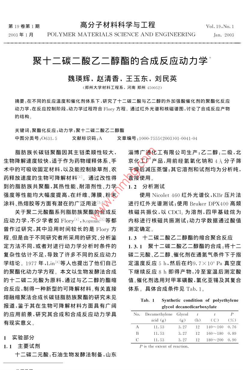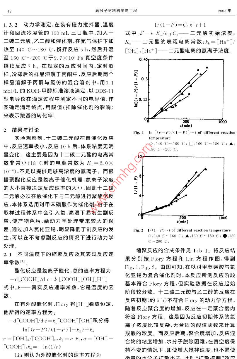 第19卷第1期高分子材料科學與工程Vol. 19. No. 12003 FF1 POLYMER MATERIALS SCIENCE AND ENGINEERINGJan.2003聚十二碳二酸乙二醇酯的合成反應動力學魏瑛輝,趙清香,王玉東,劉民英(鄭州大學材料工程系,河南鄭州450052)摘要:在不同的反應溫度和催化劑體系下,研究了十二碳二酸與乙二醇的外加強酸催化劑的聚酯化反應動力學,在反應控制階段,動力學過程符合 Flory方程。通過紅外光譜和核磁譜圖,討論了合成反應產(chǎn)物的結構。關鍵詞:聚酯化反應;動力學;聚十二碳二酸乙二醇酯中圖分類號:O631.5文獻標識碼:A文章編號:1000-7555(2003)01-0041-04脂肪族長碳鏈聚酯因其主鏈柔順性較大,淄博廣通化工有限公司生產(chǎn);乙二醇:二級,北生物降解速度較快,適于作為藥物緩釋體系、手京化工廠產(chǎn)品,用前經(jīng)氫氧化鈉和4A分子篩術中的可吸收固定材料,以及能控制除草劑、農(nóng)干燥后減壓蒸餾;其它溶劑和試劑均為分析純,藥釋放速度的生物可降解材料。通過改性得直接使用。到的脂肪族共聚酯,其熱性能、耐溶劑性、力學1.2分析測試強度等性能均大幅度提高,在纖維、薄膜、粉末使用 Nicolet460紅外光譜儀,KBr壓片法凃料、熱熔膠等方面有潛在的廣泛用途·。進行紅外光譜測試;使用 Bruker dpx400高頻關于聚二元酸酯系列脂肪族聚酯的合成反核磁共振儀,以CDCl3為溶劑,四甲基硅烷為應動力學,不少學者如 Flory,kopaκ等都內(nèi)標進行核磁共振測試;動力學數(shù)據(jù)通過酸值曾作過研究,其中沿用時間較長的是 Flory方測定確定。程。但是由于不同研究者所采用的研究、分析鑒1.3十二碳二酸乙二醇酯的縮合聚合反應定方法不同,或者對進行動力學分析時條件的1.3.1聚十二碳二酸乙二醇酯的合成:將十二復雜性估計不足,導致了許多不同的反應動力碳二元酸、乙二醇、催化劑在通氮氣條件下于指學結論。1977年,Lin等人也提出了他們自己定溫度反應5h,然后在約9.7×10Pa真空度的聚酯化動力學方程。本文以生物發(fā)酵法合成下繼續(xù)反應8h即得產(chǎn)物,冷至室溫后測定酸的十二碳二元酸為原料,通過與乙二醇的酯縮值。催化劑選用對甲苯磺酸,氯化亞錫及其復合合反應,制得一種新型的可降解材料。有關直接體系。具體合成條件見Tab.1。熔融縮聚法合成長碳鏈脂肪族聚酯的硏究未見Tab. I Synthetic condition of polyethylene報道,鑒于其在生物可降解材料方面具有廣闊glycol decanedicarboxylate的應用前景,研究其合成和合成反應動力學具No. Decamethylene Glycol t有現(xiàn)實意義acid (g11.533.2712140~1600.7611,533,2712160~1800,891實驗部分11.533.2712180~2000.901.1主要試劑P is the extent of reaction十二碳二元酸:石油生物發(fā)酵法制備,山東高分子材料科學與工程2003年1.3.2動力學測定:在裝有磁力攪拌器、溫度1/(1-P)=C,kt+1計和回流冷凝管的100mL三口瓶中,加入十式中:k=kK。k;C元酸初始濃度;碳二元酸、乙二醇和催化劑,在氮氣保護下加K二元酸的表觀電離常數(shù);k=[Ha+熱至140C~180C,攪拌反應5h,然后升溫OH],[Ha+]—二元酸電離的氫離子濃度。至160C~200C于9.7×10Pa真空度條件繼續(xù)反應7h。在規(guī)定的反應時間內(nèi),定時取樣。冷卻后的樣品溶解于丙酮中,反應后期兩個樣品溶解于丙酮與氯仿的混合溶劑中,用molL的KOH-甲醇標準溶液滴定,以DDS-11型電導儀在滴定過程中測定不同的電導值,作圖確定滴定終點,用酸值(扣除催化劑的影響)來表示羧基的轉化率。結果與討論Fig. I In [(r-P)/(1-P)]-t of different reaction實驗觀察到,十二碳二元酸在自催化反應temperature中,反應速率極小,反應10h后,體系粘度無明140C~160C;□:160C~180C;▲180C~200C顯變化。這主要是因為十二碳二元酸的電離常數(shù)非常小(18C時的電離常數(shù)為K1=2.0×0-6),不足以提供足夠高濃度的氫離子。而根據(jù)聚酯化反應是氬離子催化機理,氫離子濃度的大小直接決定反應速率的大小,因此十二碳二元酸必須在酸催化下與二元醇進行聚酯化反應,本體系選用對甲苯磺酸作為催化劑,由于在取樣過程體系中會引入氧,高溫下易發(fā)生副反應,使產(chǎn)物色污,給動力學處理帶來較大的誤1000差。通過加入氯化亞錫,明顯降低了副反應的發(fā)Fig2 1/(1-P)-t of different reaction temperature生,可以在不考慮副反應的情況下進行動力學◇:140C~160C;▲:160C~180C;●:180C~200C處理。2.1不同溫度下的縮聚反應及其表觀反應速縮聚反應的合成條件見Tab.1。將反應結率常數(shù)7。果分別按 Flory方程和Lin方程作圖,得到酯化反應是氫離子催化,總的速率方程為Fig.1,Fig.2。由圖可知,在以對甲苯磺酸與氯化亞錫為復合催化劑時,本反應所測反應階段式中,真實反應速率常數(shù)它是溫度的函基本符合Fory方程,但實驗數(shù)據(jù)在反應起始數(shù)在有外酸催化時 Flory將[H+看成恒定,反應初期(約5h)不符合下ry的動力學方程,他所得的速率方程為隨著反應聚合度的增加,反應在一定聚合度內(nèi)d[COOH/dt=k1[COOH]OH]積分得符合 Flory方程。這是因為反應初期體系的氫離子濃度比較復雜,無合適的酸值函數(shù)來計算ln[(r-P)/(1-P)]=k2t+k羧酸的濃度。而反應后期,聚合度增加,反應混r=[OH Jo/[COOH o,k,=a k,, a=OH]合物的粘度增加,水分子脫除困難,在真空度保LCOOH],ko=-In(1/r)持不變的情況下,即使增大攪拌諫度,也不易使Lin則認為外酸催化時的速率方程為微的水公子擴出去世時“擴散控制”效應魏瑛輝等:聚十二碳二酸乙二醇酯的合成反應動力學ry方程。因此,