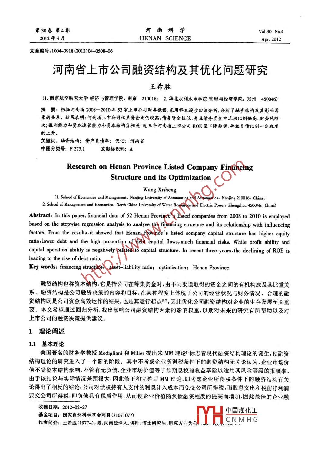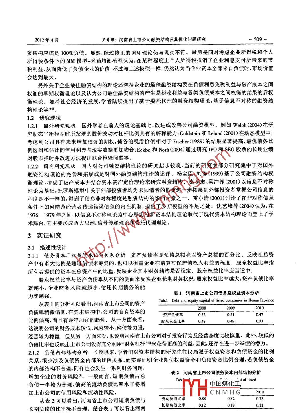第30卷第4期河南科學(xué)Vol.30 No.42012年4月HENAN SCIENCEApr. 2012文章編號: 1004 -3918(2012)04 -0508 -06河南省上市公司融資結(jié)構(gòu)及其優(yōu)化問題研究王希勝(1.南京航空航天大學(xué)經(jīng)濟與管理學(xué)院,南京210016; 2. 華北水利水電學(xué)院管理與經(jīng)濟學(xué)院,鄭州450046)摘要:根據(jù)河南省2008- 2010年 52家上市公司財務(wù)數(shù)據(jù),采用樣本逐步回歸分析,分析了融資結(jié)構(gòu)及其影響因素的關(guān)系。結(jié)果表明:河南省上市公司權(quán)益資金比例較高,債務(wù)資金較低,并且債務(wù)資金中流動比例偏高,財務(wù)風(fēng)險大;盈利能力和資本運營能力和資本結(jié)構(gòu)負相關(guān);近三年河南省上市公司ROE呈下降趨勢,導(dǎo)致負債比例一定程度的上升.關(guān)鍵詞:融資結(jié)構(gòu);資產(chǎn)負債率;優(yōu)化;河南省中圖分類號: F 275.1文獻標識碼: AResearch on Henan Province Listed Company FinancingStructure and its OptimizationWang Xisheng(1. School of Economics and Management, Nanjing University of Aeronautics and Astroauticses Nanjing 210016, China:2. School of Management and Economics, North China University of Water Resources and Eletic Power, Zhengzhou 450046, China)Abstract: In this paper, financial data of 52 Henan Province' s listed companies from 2008 to 2010 is employedbased on the stepwise regression analysis to analyse the financing structure and its relationship with influencingfactors. From the results,it showed that Henan Province' s listed company capital structure has higher equityratio, lower debt and the high proportion of debt capital flows, much financial risks. While profit ability andcapital operation ability is negatively related to capital structure. In recent three years, the declining of ROE isleading to the rise of debt ratio.Key words: financing structure; asset -iaility ratio; optimization; Henan Province融資結(jié)構(gòu)也稱資本結(jié)構(gòu),它是指公司在籌集資金時,由不同渠道取得的資金之間的有機構(gòu)成及其比重關(guān)系.融資結(jié)構(gòu)是公司融資決策的內(nèi)容和目標,在某種程度上體現(xiàn)了公司的經(jīng)營狀況與財務(wù)情況,合理的融資結(jié)構(gòu)既是公司資金高效運作的結(jié)果,也是其運行起點咽,因此優(yōu)化公司融資結(jié)構(gòu)對企業(yè)的生存發(fā)展至關(guān)重要.本文希望通過回歸分析,找出影響公司融資結(jié)構(gòu)因素的影響權(quán)重,以期對未來的研究有所幫助以及對上市公司的融資決策提供建議.1理論闡述1.1 基本理論美國著名的財務(wù)學(xué)教授Modigliani和Miller提出來MM理論[標志著現(xiàn)代融資結(jié)構(gòu)理論的誕生,使融資結(jié)構(gòu)理論的研究進入了一個新的階段.其中不考慮企業(yè)所得稅條件下的融資結(jié)構(gòu)無關(guān)論認為,企業(yè)市場價值不受資本結(jié)構(gòu)影響,不管有無負債,企業(yè)市場價值等于預(yù)期息稅前收益率除以適用其風(fēng)險等級的報酬率.由于該結(jié)論與實際情況差距很大,因此修正和完善后MM理論,即考慮企業(yè)所得稅條件下的融資結(jié)構(gòu)有關(guān)論得出了相反的結(jié)論:公司對債權(quán)持有人支付的利息計入成本而免交公司所得稅,而股息支出和稅前凈利潤要交公司所得稅,即負債具有稅盾作用,從而使企業(yè)價值隨負債融資程度的提高而增加,因此最佳的企業(yè)融收稿日期: 2012-02-27中國煤化工基金項目:國家自然科學(xué)基金項目(71071077)CNMHG.作者簡介:王希勝(977-),男,河南延津人,講師,博士研究生,研究方向為公.N2012年4月王希勝:河南省上市公司融資結(jié)構(gòu)及其優(yōu)化問題研究一509資結(jié)構(gòu)應(yīng)該是100%負債.顯然,經(jīng)過修正的MM理論仍與現(xiàn)實不符.最后是同時考忠企業(yè)所得稅和個人所得稅條件下的MM模型-米勒均衡模型認為,在某種程度上個人所得稅抵消了企業(yè)利息支付所帶來的節(jié)稅利益,從而降低了負債企業(yè)的價值,不過與上述模型-樣,仍然認為當企業(yè)資本全部來自負債時,市場價值會達到最大.另外關(guān)于企業(yè)最佳融資結(jié)構(gòu)的理論還包括企業(yè)的最佳融資結(jié)構(gòu)要在負債利息免稅利益與破產(chǎn)成本之間權(quán)衡的早期權(quán)衡理論以及認為公司最佳融資結(jié)構(gòu)的產(chǎn)生是稅收利益與各類負債成本之間權(quán)衡的結(jié)果的后權(quán)衡理論。隨著社會經(jīng)濟的發(fā)展,學(xué)者陸續(xù)提出了基于委托代理的融資結(jié)構(gòu)理論,基于信息不對稱的融資結(jié)構(gòu)理論等1461.1.2 研究現(xiàn)狀1.2.1 國外研究現(xiàn)狀 國外學(xué)者在前人的理論基礎(chǔ)上,改進或改善公司融資模型.例如Welch (2004)在研究動態(tài)平衡模型時所發(fā)現(xiàn)的股價波動對杠桿比例具有的解釋能力; Goldstein和Leland (2001)在動態(tài)模型中,.考慮到公司具有未來增加債務(wù)的期權(quán),債務(wù)的稅盾價值相對于Fischer(1989)的結(jié)果顯著提高,最優(yōu)債務(wù)比例區(qū)間和估計的信用利差與現(xiàn)實數(shù)據(jù)更加吻合;Eckbo和Norli(2004)通過研究IPO和SEO股票的長期業(yè)績對股市擇時并改進方法提出聯(lián)合檢驗問題等.1.2.2國內(nèi)研究現(xiàn)狀國內(nèi)對公司融資結(jié)構(gòu)理論的研究起步較晚,當前的研究大部分研究集中于對國外融資結(jié)構(gòu)理論的完善和拓展或是對國外融資結(jié)構(gòu)理論的