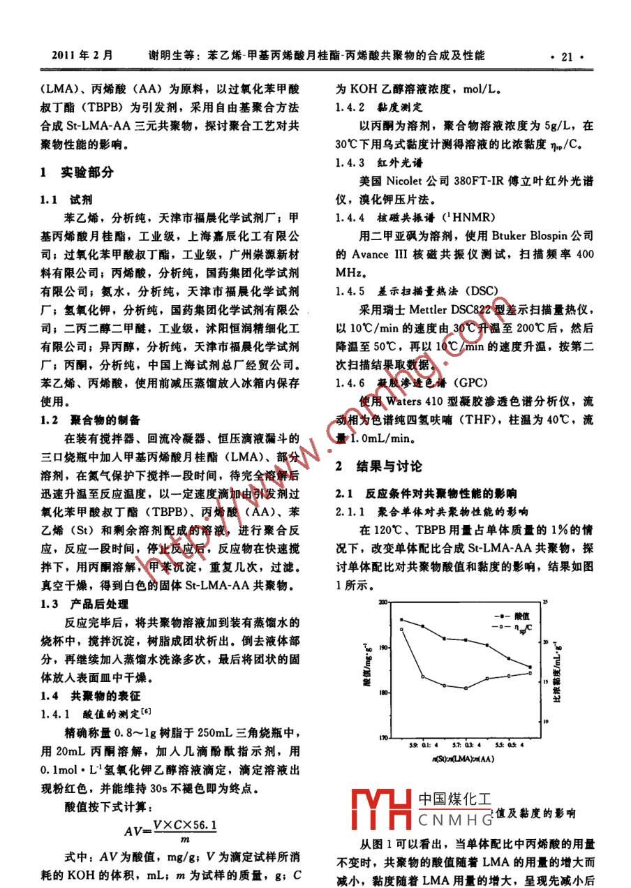 Ieb. 2011精細(xì)與專用化學(xué)品第19卷第2期Fine and Specially Chemicals20ll年2月然乙烯臼基丙烯酸月桂酯-丙烯酸共聚物的臺成及性能謝明生,陳清松,余金鳳,丁富傳,陳亮(福建師范大學(xué)化學(xué)與材料學(xué)院,福建省高分子重點實驗室,福建福州350007)摘要:以苯乙烯(St)、甲基丙烯酸月桂酯(MA)、丙烯酸(AA)為單體,過氧化苯甲酸叔丁酯為引發(fā)劑,二丙二醇甲醚為溶劑,采用自由基聚合方法,合成苯乙烯甲基丙烯酸月桂酯丙烯酸共聚物??疾炝艘l(fā)劑用量、單體摩爾配比反應(yīng)溫度對聚合物性能的影響,并用紅外光譜、差示掃描量熱儀、凝膠色譜等對共聚物進行表征,結(jié)果表明,合成反應(yīng)的最佳工藝條件是:n(St):n(LMA):n(AA)=5.7:0.3:4,過氧化苯甲酸叔丁酯用量為5%,反應(yīng)溫度為125℃,得到了多分散指數(shù)為1.67,具有良好成膜性的三元丙烯酸共聚物樹脂。關(guān)鍵詞:苯乙烯;甲基丙烯酸月桂酯;丙烯酸;丙烯酸共聚物Synthesis and characterization of styrene-lauryl methacrylate-acrylic acid copolymerXIE Ming-sheng, CHEN Qing-song, YU Jin-feng, DING Fu-chuan, CHEN Liang( College of Chemistry & Materials Science, Fujian Normal University, Fujian ProvinceAbstract: Styene-lauryl methacrylate-acrylic acid copolymers were prepared through radical polymerizationusing t-butyl peroxybenzoate(TBPB)as initiator and dimethoxy dipropyleneglycol ( DPDME)as solvent. The in-fluences of the monomer mole ratio of styene/lauryl methacrylate/acrylic acid, amount of initiator, polymerizationtemperature on copolymer performance were investigated. The copolymers structure is characterized by means ofFTIR, GPC, DSC. The results show that the best preparation condition is: n (Styene) n(lauryl methacry-late):n (acrylic acid)is 5.7:0.3: 4, the reaction temperature is 125C, the TBPb amount is 5%. The ter-polymers have good film-forming properties, and polydispersity index(Mz/Mw) is 1. 67.Key words: styrene: lauryl methacrylate; acrylic acid; acrylic copolymers水溶性聚合物是指在一定條件下能溶于水的一代表,它具有耐候性、耐磨性、附著性和光澤度等類高聚物的總稱。隨著世界對環(huán)保要求的日益提優(yōu)點,但是單一的丙烯酸樹脂在應(yīng)用于水性油墨中高,環(huán)保法規(guī)對油墨、涂料等使用過程中的排放有還存在耐水性不夠,附著力不好的缺點。因此機揮發(fā)物(VOC)(如:苯、醇、烴、酯等)日趨丙烯酸樹脂常常與其他單體進行多元共聚,以此來嚴(yán)格,而水溶性聚合物具有低/無有機揮發(fā)物的特提高其性能。單體是構(gòu)成聚合物的基礎(chǔ),單體的種點,對其的研究和應(yīng)用也越來越重視。水溶性聚合類和組成決定聚合物的物理、化學(xué)及機械性能,因物的種類繁多,水溶性丙烯酸類樹脂與有機溶劑型此,在聚合過程中單體的選擇和單體比例的確定是丙烯酸樹脂相比,不但具備優(yōu)異的硬度、光澤、耐十分重要的。苯乙烯是一種硬單體,可以使共聚物水性、耐酸堿性、良好的耐候性、耐污染性等優(yōu)的玻璃化溫度升高,賦予共聚物膜耐磨性、膜硬度點,而且具有價格低、使用安全、節(jié)省能源、減少和結(jié)構(gòu)強度,甲基丙烯酸月桂酯是一種軟單體,可環(huán)境污染和公害等特點(2-,被廣泛應(yīng)用在涂料以使聚合物的玻璃化溫度降低,賦予共聚物膜柔韌油墨、膠黏劑等領(lǐng)域,市場發(fā)展也較快。性丙烯酸樹脂是目前用于水性油墨成膜物的典型中國煤化工基丙烯酸月桂酯CNMHG收稿日期:2010-10-18基金項目:福建省科技計劃重點項目(2006N0037);福建省科技計劃重點項目(2007N0042);福建省自然科學(xué)基金項目(2009J05024)作者簡介:謝明生(1985-),男,在讀碩士,研究方向為天然高分子材料的研究。通訊作者:陳清松,福建師范大學(xué)化學(xué)與材料學(xué)院,主要從事天然高分子材料的研究2011年2月謝明生等:苯乙烯甲基丙烯酸月桂酯丙烯酸共聚物的合成及性能·21·(LMA)、丙烯酸(AA)為原料,以過氧化苯甲酸為KOH乙醇溶液濃度,mol/L。叔丁酯(TBPB)為引發(fā)劑,采用自由基聚合方法1.42黏度測定合成 St-LMA-AA三元共聚物,探討聚合工藝對共以丙酮為溶劑,聚合物溶液濃度為5g/L,在聚物性能的影響。30℃下用烏式黏度計測得溶液的比濃黏度pm/C1實驗部分1.4.3紅外光譜美國 Nicolet公司380FTIR傅立葉紅外光譜11試劑儀,溴化鉀壓片法。苯乙烯,分析純,天津市福晨化學(xué)試劑廠;甲1.4.4核磁共振譜(HNMR)基丙烯酸月桂酯,工業(yè)級,上海嘉辰化工有限公用二甲亞砜為溶劑,使用 Btuker Blospin公司司;過氧化苯甲酸叔丁酯,工業(yè)級,廣州崇源新材的 Avance III核磁共振儀測試,掃描頻率400料有限公司;丙烯酸,分析純,國藥集團化學(xué)試劑有限公司;氨水,分析純,天津市福晨化學(xué)試劑1.4.5差示掃描量熱法(DSC)廠;氫氧化鉀,分析純,國藥集團化學(xué)試劑有限公采用瑞士 Mettler DSc822型差示掃描量熱儀司;二丙二醇二甲醚,工業(yè)級,沭陽恒潤精細(xì)化工以10℃/min的速度由30℃升溫至200℃后,然后有限公司;異丙醇,分析純,天津市福晨化學(xué)試劑降溫至50℃,再以10℃/min的速度升溫,按第二廠;丙酮,分析純,中國上海試劑總廠經(jīng)貿(mào)公司。次掃描結(jié)果取數(shù)據(jù)。苯乙烯、丙烯酸,使用前減壓蒸餾放入冰箱內(nèi)保存1.4.6凝膠滲透色譜(GPC)使用。使用 Waters410型凝膠滲透色譜分析儀,流1.2聚合物的制備動相為色譜純四氫呋哺(THF),柱溫為40℃,流在裝有攪拌器、回流冷凝器、恒壓滴液漏斗的量1.0mL/min三口燒
