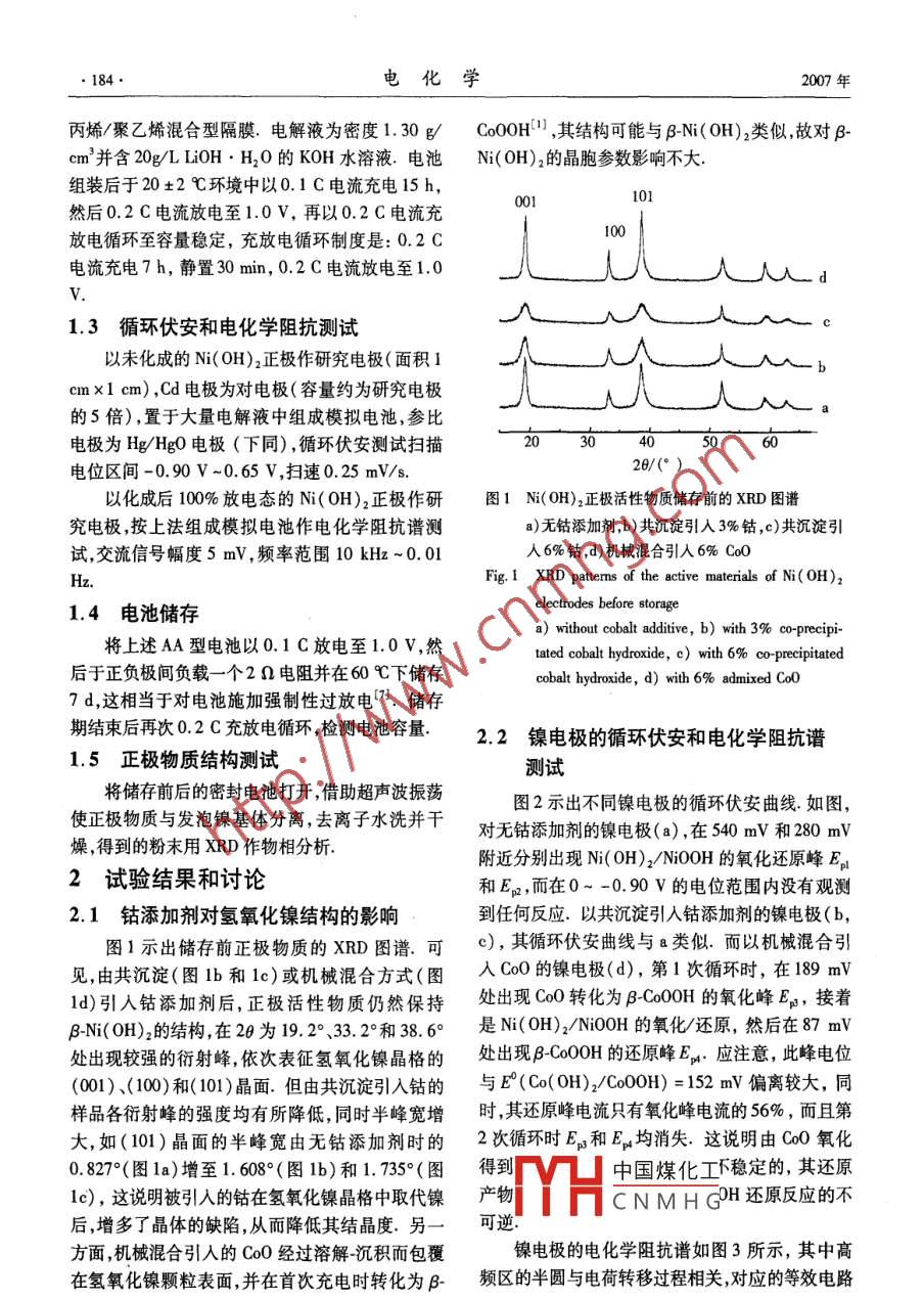 第13卷第2期電化學(xué)Vol.13 No. 22007年5月ELECTROCHEMISTRYMay 2007文章編號(hào):1006-3471 (2007 )02-0183-05鈷添加劑對(duì)發(fā)泡式鎳電極的作用機(jī)理研究李曉峰*,夏同馳,衣紹鵬,谷秀娟,宋育林(鄭州輕工業(yè)學(xué)院材料與化工學(xué)院,河南鄭州,450002)摘要:分別以共沉淀 和機(jī)械混合兩種方式于發(fā)泡式鎳電極引人鈷添加劑. X射線衍射( XRD)、循環(huán)伏安、電化學(xué)阻抗譜( EIS)和恒電流充放電等測(cè)試表明,共沉淀引入的鈷添加劑會(huì)降低氫氧化鎳各晶面衍射峰強(qiáng)度并增大其半峰寬.兩種方式引人的鈷添加劑均能改善鎳電極的電化學(xué)活性、提高金屬氫化物/鎳電池容量,而且以機(jī)械混合引人的CoO更有效.但由CoO氧化生成的B-Co0OH在低電位下不穩(wěn)定,經(jīng)強(qiáng)制性過(guò)放電儲(chǔ)存后,電池容量出現(xiàn)不可逆衰減.關(guān)鍵詞:發(fā)泡式鎳電極; 鈷添加劑;引人方式中圖分類號(hào): TM 912.2文獻(xiàn)標(biāo)識(shí)碼: A用于鎳基堿性蓄電池,如鎘/鎳( Cd/Ni)電池濃度為1 mo/L 的硫酸鎳和硫酸鈷混合溶液,和金屬氫化物/鎳( MH/Ni)電池的發(fā)泡式鎳電極CoSO含量各為0%、3%和6% (by mass,下同),因其比容量高、制備工藝簡(jiǎn)單而得到廣泛應(yīng)用.在于不斷攪拌下分別滴人50 C 2 mol/L氫氧化鈉溶這類電極中,-般使用鈷 單質(zhì)或其化合物作為添加液中.反應(yīng)完成后,常溫下靜置24h,得到的產(chǎn)物劑以提高電極的導(dǎo)電性(12]和充電性能[35].鎳電反復(fù)用去離子水洗直至完全除去SO.2 ,過(guò)濾,然極引人鈷添加劑的方式通常有:一是在合成氫氧化后120 C下干燥,研磨,過(guò)200目篩,得到3種不同鎳時(shí)以共沉淀的方式加入,鈷取代氫氧化鎳晶格中共沉淀鈷含量的氫氧化鎳粉末.鎳的位置;另一是在正極和膏時(shí)以機(jī)械混合的方式1.2電極和電池加入. V. Pralong 等的研究表明,以機(jī)械混合引入的鈷添加劑如Co0,其Co( I )/Co( M)的氧化電.電極制備:預(yù)先配制混合物(1) 2% PTFE粘接位為0.9V(vs. Cd/Cd( 0H)2) ;而共沉淀引人的鈷劑,10%金屬Ni粉,其余部分為上述3種不同共添加劑則觀測(cè)不到它的特征氧化區(qū)[6].這說(shuō)明不沉淀鈷含量的Ni(OH)2;混合物(2) 2% PTFE粘同方式引人的鈷添加劑其氧化還原行為可能不同,接劑, 6% Co0和無(wú)共沉淀鉆Ni(OH)2,將以上混進(jìn)而可能對(duì)鎳電極產(chǎn)生不同的作用.本文在發(fā)泡合物(1)和(2)各自加入適量去離子水,電動(dòng)攪拌式鎳電極中分別以上述兩種方式引入鈷添加劑,并使充分均勻,得到的膏狀物分別填涂在發(fā)泡鎳基應(yīng)用X射線衍射(XRD)、循環(huán)伏安、電化學(xué)阻抗譜體上,65C下干燥,然后輥壓至0.6mm厚度制得(EIS)和恒電流充放電等方法研究它對(duì)氫氧化鎳4種不同鈷成分的正極.取一定量的儲(chǔ)氫合金MmNis. sC.sA.o. Mnos粉(Mm =Ce, La, Nd和結(jié)構(gòu)和電化學(xué)性能的影響. .Pr), 2% PTFE粘接劑和適量去離子水充分?jǐn)嚢杈?試驗(yàn)勻,得到的膏狀物填涂在發(fā)泡鎳基體上, 65 C下1.1氫氧化鎳制備干燥,再輥壓至0.3 mm厚度制得負(fù)極.采用化學(xué)沉淀法制備氫氧化鎳.配制3種總以上述電極組裝AA型MH/Ni電池.使用聚中國(guó)煤化工收稿日期2006-11-30,修訂日期:200-12-26 * 通訊作者,Tel: (86-371HC N M H G556510, E-mail: lixi-aofeng@ zzuli. edu. cn河南省教育廳項(xiàng)目(2007530009)資助184●電化學(xué)2007年丙烯/聚乙烯混合型隔膜.電解液為密度1.30 g/ Co00H" ,其結(jié)構(gòu)可能與p-Ni( 0H)2類似,故對(duì)β-cm’并含20g/L LiOH●H20的KOH水溶液.電池Ni( 0H)z的晶胞參數(shù)影響不大.組裝后于20 +2 C環(huán)境中以0.1 C電流充電15 h,001101然后0.2 C電流放電至1.0V,再以0.2C電流充100放電循環(huán)至容量穩(wěn)定,充放電循環(huán)制度是: 0.2 C電流充電7h,靜置30 min, 0.2 C電流放電至1.0人Md___人入1.3循環(huán)伏安和電 化學(xué)阻抗測(cè)試以未化成的Ni( 0H)2正極作研究電極(面積1個(gè)___個(gè)- Abcmx1 cm) ,Cd電極為對(duì)電極(容量約為研究電極人n。的5倍),置于大量電解液中組成模擬電池,參比電極為Hg/Hg0電極(下同) ,循環(huán)伏安測(cè)試掃描20 30 4050電位區(qū)間-0.90 V~0.65 V,掃速0.25 mV/s.20/(° )以化成后100%放電態(tài)的Ni( 0H)2正極作研圖1 Ni(OH)2正極活性物 質(zhì)儲(chǔ)存前的XRD圖譜究電極,按上法組成模擬電池作電化學(xué)阻抗譜測(cè)a)無(wú)鈷添加劑,b):共沉淀引人3%鈷,c)共沉淀引試,交流信號(hào)幅度5 mV,頻率范圍10 kHz ~0.01人6%鈷,d)機(jī)械混合引人6% CoOHz.Fig.1 XRD pattemns of the active materials of Ni( 0H)21.4電池儲(chǔ)存electrodes before storagea) without cobalt additive, b) with 3% co-precipi-將上述AA型電池以0.1 C放電至1.0 V,然tated cobalt hydroxide, c) with 6% co-precipitated后于正負(fù)極間負(fù)載-一個(gè)2 n電阻并在60 9C下儲(chǔ)存cobalt hydroxide, d) with 6% admixed Co07 d,這相當(dāng)于對(duì)電池施加強(qiáng)制性過(guò)放電”.儲(chǔ)存期結(jié)束后再次0.2 C充放電循環(huán),檢測(cè)電池容量.2.2鎳電極的循環(huán)伏安和電化學(xué)阻抗譜1.5 正極物質(zhì)結(jié)構(gòu)測(cè)試測(cè)試將儲(chǔ)存前后的密封電池打開,借助超聲波振蕩圖2示出不同鎳電極的循環(huán)伏安曲線.如圖,使正極物質(zhì)與發(fā)泡鎳基體分離,去離子水洗并干對(duì)無(wú)鈷添加劑的鎳電極(a) ,在540 mV和280 mV燥,得到的粉末用XRD作物相分析.附近分別出現(xiàn)Ni( 0H)2/Ni00H的氧化