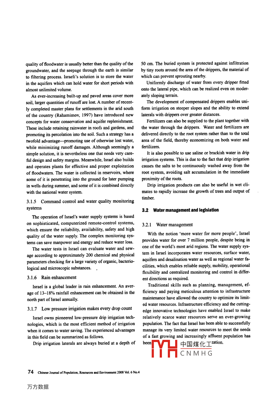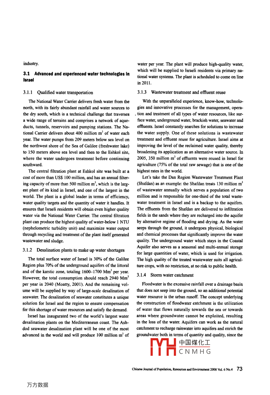 Israeli Water Achievements Today and Enlightenment to ChinaSun Lei12, Xu Lanqing'1. Institute of Environmental Science and Enginering. Ocean University of China, Qingdao Shandong 266100, China;2. Department of Soil and Water Scinces, Faculty of Agicultural, Food and Environmental Quality Sciences, the Hebrew Universityof Jerusalem, 76100, Israel;3. Logistics Group of Ocean University of China, Qingdao Shandong 266100, ChinaAbstract: Depite the endemic drought, arid elimate and asso= 2 Current water situations in Israelciated limited freshwater resources, as well as difcult geopolit-ical realities, Israel can provide a reliable supply of high qualityWater is one of the most expensive and least availablewater to a rapidly growing population. The achievements of commodities in Israel, most of its area receives less thanwater supply in Israel can be summarized as water technologies200 mm of rainfall per year, and over 65% of the land is(like water transportation and purifcation, desalination, waste-defined as a desert. Whereas in some of the desert areaswater treatment, effluent reuse, storm water catchment, controlgroundwater may be found, in most cases this is non-systems, rain enhancement and drip irigation, etc.), waterpotable or is of low quality, unless desalinated (Gvirzman,management and legislation as well as water industry. In view 2002).of the national concern regarding the quality and quantity of theDespite water scarcit, water consumption in Israel has beenwatr, the sills technologics and know -how that Israel has ac on the ise, due to both a mapid growth of the county's popu-cumulated in water spply and imigation can give us enighen. latin (2.4 2.6% per year) and increasing living standardment that is also presented in this paper.(ICBS, 2001). Between 1997 and 2001, per capita waterKey words: Israel, China, water technology, water management, consumption in urban areas of Israel increased from 60 towater industry83 m' per year. The most rapid increase in domestic waterconsumption occurred in the places with relaively low wa-1 Current situatlons of global waterter consumption levels before, especially in peripheral areasof the country. Investment in public infrastructure is also onThe etimated figure of the global annual surface waterthe rise, resulting in a gradual increase in water consump-low that is potentially available for human use is 12 500 km'tion. And the positive association can be witnessed betweenper year (Falkenmark and Rockstrom, 2004), and 84.5% ofwater consumption change and local per capita incomesthe annual global freshwater consumption was used in ag-(Portnov and Meir, 2004).riculture in 1995 (Shiklomanov, 1997). Due to the unevendistribution of global feshwater, large areas of the globe 3 Achievements In Israel water fieldsreceive low rainfall and are water deficient. Regions expe-riencing the greatest shortfall of freshwater are the MiddleDespites the endemic drought, arid climate and associ-East, large portions of Africa, some parts of Europe and ated limited freshwater resources, as well as difcult geo-Southeast Asia (Postel, 1997). According to the United Na- political realities, Israel can provide a reliable supply oftions report of the World Water Assessment Programme high quality water to a rapidly growing population, which(UNESCO, 2003), the numbers of people who are lack-is regarded as the impossible dream . The achievementsing improved water supply and improved sanitation are of water supply in Israel can be summarized as water tech-over 1.1 billion and 2.4 billion. So the health risk is rising nologies (like water transportation and purification, desali-by limited access to proper sewage and sanitation. And withnation, wastewater treatment, effluent reuse, storm waterthe population growth, the situation will only worsen in the catchment, control systems, rain enhancement and drip irfuture (Feitelson and Chenoweth, 2002).中國(guó)煤化工Coresponding auhor: Sur Lei (le. sunmailhj.c.ilCNMHG72 Chinese Joumal oPpuation, Resources end Environment 2008 VolL. 6 Nio.4industry.water per year. The plant will produce high-quality water,3.1 Advanced and experlenced water technologles Inwhich will be supplied to Israeli residents via primary na-tional water systems. The plant is scheduled to come on lineIsraelin 2011.3.1.1 Qualified water transportation3.1.3 Wastewater treatment and effuent reuseThe National Water Carrier delivers fresh water from theWith the unparalleled experience, know-how, technolo-north, with its fairly abundant rainfall and water sources togies and innovative processes for the management, opera-the dry south, which is a technical challenge that traverses. tion and treatment of all types of water resources, like sur-a wide range of terrains and comprises a network of aquc-face water, underground water, brackish water, seawater andducts, tunnels, reservoirs and pumping stations. The Na-effuents. Israel constantly searches for solutions to increasetional Carrier delivers about 400 million m' of water eachthe water supply. One of these solutions is wastewateryear. The water pumps from 209 meters below sea level ontreatment and efluent reuse for agriculture. Israel aims atthe northwest shore of the Sea of Galilee (reshwater lake) improving the level of the reclaimed water quality, therebyto 150 meters above sea level and then to the Eshkol site,broadening is application as an alternative water source. Inwhere the water undergoes treatment before continuing2005, 350 million m' of efluents were reused in Israel forsouthward.agriculture (75% of the total raw sewage) that is one of theThe central filtration plant at Eshkol site was built at ahighest rates in the world.cost of more than USS 100 million, and has an annual filter-Let's take the Dan Region Wastewater Treatment Planting capacity of more than 500 million m', which is the larg-(Shafdan) as an example: the Shafdan treats 130 million m'est plant of its kind in Israel, and one of the l