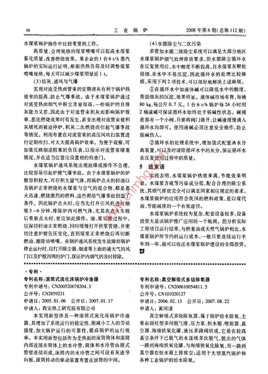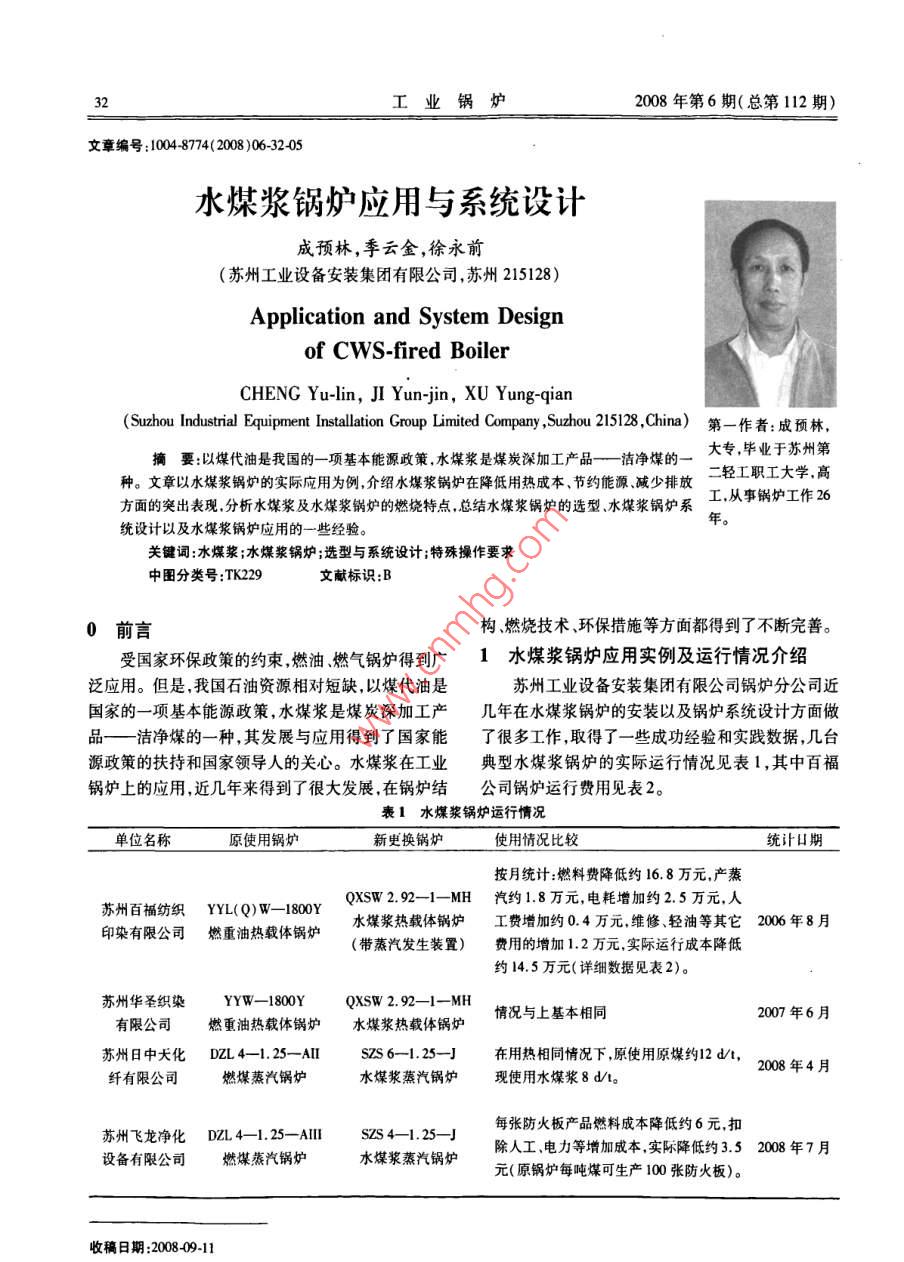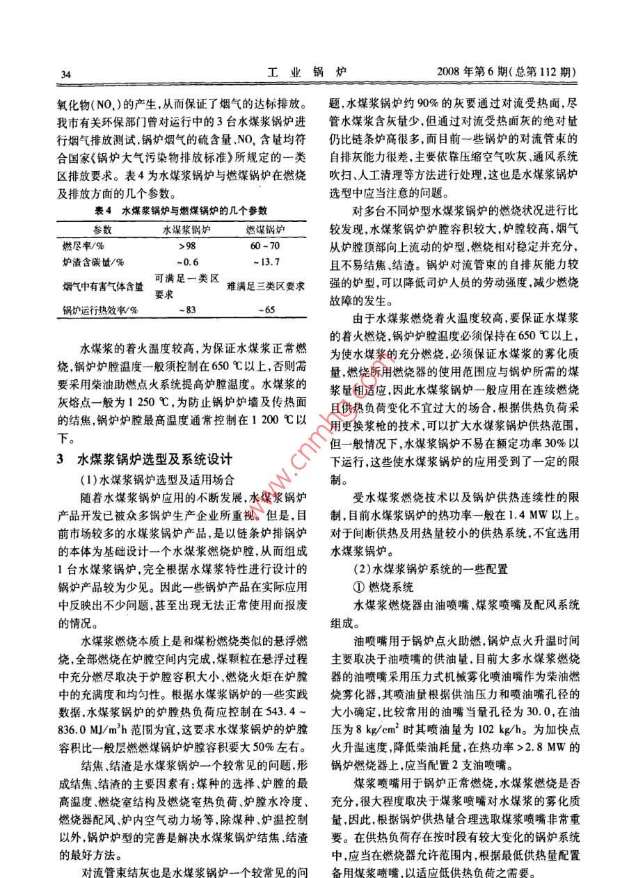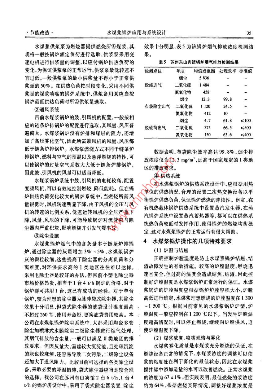 工業(yè)鍋爐2008年第6期(總第112期)文章編號:10048774(2008)06-3205水煤漿鍋爐應(yīng)用與系統(tǒng)設(shè)計成預(yù)林,季云金,徐永前(蘇州工業(yè)設(shè)備安裝集團(tuán)有限公司,蘇州215128Application and System Designof cwS-fired BoilerCHENG Yu-lin, JI Yun-jin, XU Yung-qian( Suzhou Industrial Equipment Installation Group Limited Company, Suzhou25128, China)第一作者:成預(yù)林,摘要:以煤代油是我國的一項基本能源政策,水煤漿是煤炭深加工產(chǎn)品—潔凈煤的大專,畢業(yè)于蘇州第種。文章以水煤漿鍋爐的實際應(yīng)用為例,介紹水煤漿鍋爐在降低用熱成本、節(jié)約能源減少排放二輕工職工大學(xué),高方面的突出表現(xiàn),分析水煤漿及水煤漿鍋爐的燃燒特點,總結(jié)水煤漿鍋爐的選型、水煤漿鍋爐系工,從事鍋爐工作26統(tǒng)設(shè)計以及水煤漿鍋爐應(yīng)用的一些經(jīng)驗?zāi)觋P(guān)鍵詞:水煤漿;水煤漿鍋爐;選型與系統(tǒng)設(shè)計;特殊操作要求中圖分類號:TK29文獻(xiàn)標(biāo)識:B0前言構(gòu)、燃燒技術(shù)、環(huán)保措施等方面都得到了不斷完善受國家環(huán)保政策的約束燃油、燃?xì)忮仩t得到廣1水煤漿鍋爐應(yīng)用實例及運行情況介紹泛應(yīng)用。但是,我國石油資源相對短缺以煤代油是蘇州工業(yè)設(shè)備安裝集團(tuán)有限公司鍋爐分公司近國家的一項基本能源政策,水煤漿是煤炭深加工產(chǎn)幾年在水煤漿鍋爐的安裝以及鍋爐系統(tǒng)設(shè)計方面做品——潔凈煤的一種,其發(fā)展與應(yīng)用得到了國家能了很多工作,取得了一些成功經(jīng)驗和實踐數(shù)據(jù),幾臺源政策的扶持和國家領(lǐng)導(dǎo)人的關(guān)心。水煤漿在工業(yè)典型水煤漿鍋爐的實際運行情況見表1,其中百福鍋爐上的應(yīng)用,近幾年來得到了很大發(fā)展,在鍋爐結(jié)公司鍋爐運行費用見表2。表1水煤漿鍋爐運行情況單位名原使用鍋爐新更換鍋爐使用情況比較統(tǒng)計凵按月統(tǒng)計:燃料費降低約16.8萬元,產(chǎn)蒸蘇州百福紡織YL(Q)W-180 Y QXSW2.92-1-MH汽約18萬元,電耗增加約25萬元,人水煤漿熱載體鍋爐工費增加約0.4萬元,維修、輕油等其它2006年8月印染有限公司燃重油熱載體鍋爐(帶蒸汽發(fā)生裝置)費用的增加1.2萬元,實際運行成本降低約14.5萬元(詳細(xì)數(shù)據(jù)見表2)。蘇州華圣織染YYW-1800YQXSW 2. 92-1-MH情況與上基本相同2007年6月有限公司燃重油熱載體鍋爐水煤漿熱載體鍋爐蘇州日中天化DZL4-1.25-A1Ss6-1.25-J在用熱相同情況下,原使用原煤約12d't,纖有限公司燃煤蒸汽鍋爐水煤漿蒸汽鍋爐現(xiàn)使用水煤漿8d't。2008年4月蘇州飛龍凈化DZL4-1.25- AllI sZS4-1.25-J每張防火板產(chǎn)品燃料成本降低約6元,扣設(shè)備有限公司燃煤蒸汽鍋爐水煤漿蒸汽鍋爐除人工電力等增加成本實際降低約352008年7月元(原鍋爐每噸煤可生產(chǎn)100張防火板)。收稿日期:2008091·節(jié)能改造水煤漿鍋爐應(yīng)用與系統(tǒng)設(shè)計表2百福公司鍋爐運行費用比較(2006年8月)燃料單價燃料總價電力增加人工增加蒸汽供應(yīng)燃料月消耗量/t/(元·t)/萬元/(kW·d-1)/(人·d-)/(t·d-)水煤漿16.5600370033.3分析表2列舉數(shù)據(jù),水煤漿鍋爐在降低用熱成發(fā)生器所產(chǎn)生的蒸汽比熱供蒸汽每噸可降低20余本、節(jié)約能源方面表現(xiàn)出很大的優(yōu)越性,在煤、油等元。因此該鍋爐具有較高的熱效率,節(jié)能效果和經(jīng)燃料大幅上漲的情況下,其優(yōu)越性尤為突出。濟(jì)效益十分明顯,與原來采用重油和熱供蒸汽供熱圖I所示是2007年12月蘇州百福紡織印染公系統(tǒng)相比,水煤漿鍋爐系統(tǒng)運行成本每年至少可降司在原250×10°kcal/h燃水煤漿有機熱載體鍋爐低180萬的基礎(chǔ)上,重新安裝的1臺500×104kalh燃水煤鍋爐投入使用以來始終保持正常運行沒有發(fā)漿有機熱載體鍋爐,整個系統(tǒng)由5大部分組成。生過因鍋爐燃燒系統(tǒng)故障造成的停爐事故,鍋爐運(1)鍋爐本體:包括鍋爐受壓部件、爐墻及保行穩(wěn)定,自動控制可靠溫、鋼架;2水煤漿及水煤漿燃燒特點(2)燃燒系統(tǒng):包括水煤漿儲存及供應(yīng)系統(tǒng)、霧化用壓縮空氣系統(tǒng)、柴油助燃點火系統(tǒng)、燃燒器;水煤漿是一種清潔燃料,它由煤炭(~67%)、水(~32%)及少量化學(xué)添加劑組合而成,煤炭經(jīng)過(3)通風(fēng)除塵系統(tǒng):包括鼓、引風(fēng)機、煙風(fēng)道、多研磨、細(xì)化,并充分與水均勻混合,產(chǎn)生均勻的流動管除塵器、水膜除塵器等;(4)供熱系統(tǒng):包括高溫循環(huán)油泵、髙低位槽、性較好的煤漿,在化學(xué)添加劑的作用下,水煤漿可保持長期不沉淀。根據(jù)水煤漿的性質(zhì)和用途,水煤漿輸油管線,為提高鍋爐熱效率,鍋爐煙氣出口設(shè)置煙可分為:精煤水煤漿、精細(xì)水煤漿、經(jīng)濟(jì)性水煤漿、氣道蒸發(fā)器1臺,根據(jù)水煤漿鍋爐的特點及使用單位化水煤漿、環(huán)保性水煤漿等,目前用于工業(yè)鍋爐的是的用熱情況,系統(tǒng)配置4Uh導(dǎo)熱油蒸汽發(fā)生器1臺(蒸汽輸出與熱供蒸汽管道并網(wǎng));精煤水煤漿。表3所列是目前常用的水煤漿、Ⅱ類(5)控制系統(tǒng):除了正常有機熱載體鍋爐的控姻煤、類煙煤的一些技術(shù)指標(biāo)。表3水煤漿、H、Ⅲ類煙煤的技術(shù)指標(biāo)表制系統(tǒng)外,該爐的供漿泵、引風(fēng)機采用變頻控制,有名稱水煤漿Ⅱ