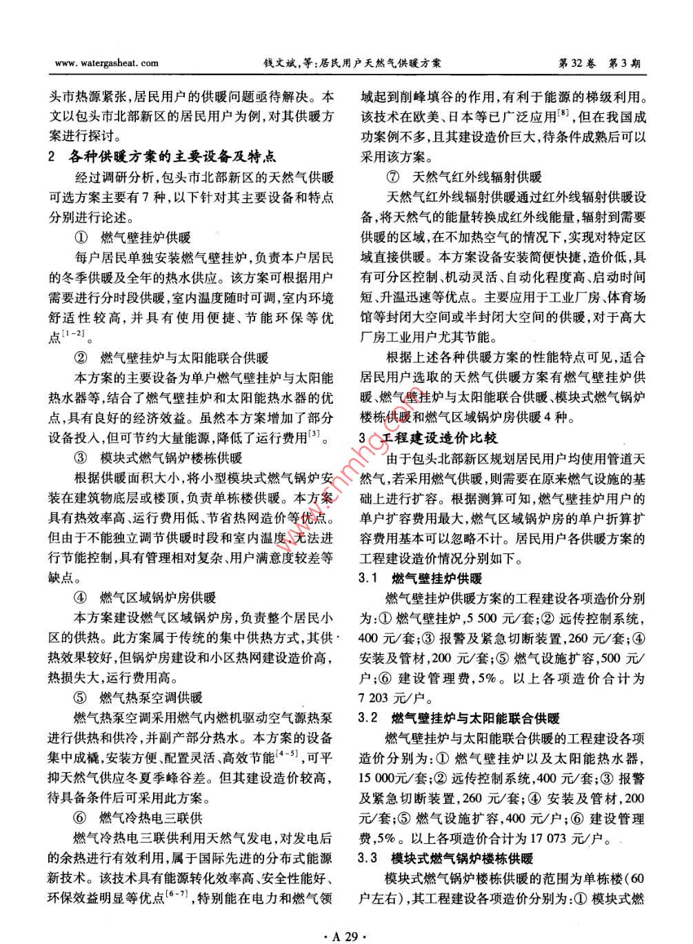 第32卷第3期煤氣與熱力Vol 32 No. 32012年3月Gas heatMar.20122》錄》爐爐護(hù)》》》護(hù)供熱工程建設(shè)與發(fā)展多居民用戶天然氣供暖方案錢(qián)文斌!,章陽(yáng),李丹華2,王海(1.中國(guó)燃?xì)饪毓捎邢薰?廣東深圳518033;2.哈爾濱市燃?xì)夤こ淘O(shè)計(jì)研究院,黑龍江哈爾濱150016)摘要:以包頭市北部新區(qū)居民用戶的天然氣供暖方案為例,對(duì)比分析了燃?xì)獗趻鞝t供暖、燃?xì)獗趻鞝t與太陽(yáng)能聯(lián)合供暖、模塊式燃?xì)忮仩t樓棟供暖、燃?xì)鈪^(qū)域鍋爐房供暖、燃?xì)鉄岜每照{(diào)供暖、燃?xì)饫錈犭娙?lián)供、天然氣紅外線輻射供暖7種供暖方案的技術(shù)特點(diǎn),對(duì)比較適合居民用戶供暖的前4種方案進(jìn)行了工程建設(shè)造價(jià)和運(yùn)行費(fèi)用對(duì)比分析。燃?xì)獗趻鞝t供暖方案工程造價(jià)最低,運(yùn)行費(fèi)用較少,節(jié)能效果較好;燃?xì)獗趻鞝t與太陽(yáng)能聯(lián)合供暖方案工程造價(jià)最高,但其運(yùn)行費(fèi)用最少,節(jié)能效果最佳。關(guān)鍵詞:天然氣供暖;燃?xì)獗趻鞝t;燃?xì)鈪^(qū)域鍋爐房;模塊式燃?xì)忮仩t中圖分類號(hào):TU995文獻(xiàn)標(biāo)識(shí)碼:B文章編號(hào):1000-4416(2012)03-0A28-03Natural Gas Heating Scheme for Domestic UsersQIAN Wenbin, ZHANG Yang, LI Danhua, WANG HaiAbstract: Taking the natural gas heating scheme for domestic users in northern new area of BaotouCity as example, the technical characteristics of seven heating schemes including wall-mounted gas boilerheating, combined heating with wall-mounted gas boiler and solar energy, modular gas boiler buildingheating, regional gas boiler room heating, heat pump air-conditioning system heating, combined coolingheat and power system heating and gas-fired infrared radiant heating are compared and analyzed. Theproject cost and operation cost of the first four heating schemes suitable for domestic users are comparedand analyzed. The project cost is the minimum, operation cost is lower and energy-saving efficiency isbetter for wall-mounted gas boiler heating. The project cost is the maximum, but operation cost is thelowest and energy-saving efficiency is the best for combined heating with wall-mounted gas boiler and solar energyKey words: natural gas heating; wall-mounted gas boiler; regional gas boiler room; modularras boiler1概述根據(jù)包頭市城市總體規(guī)劃,在110國(guó)道以北、包我國(guó)天然氣利用和建筑行業(yè)的快速發(fā)展,使得白公路兩側(cè)規(guī)劃建設(shè)北部新區(qū)。北部新區(qū)包括3個(gè)在城市里大量使用天然氣的條件逐漸成熟。國(guó)家節(jié)功能區(qū):石拐新區(qū),以居住、商業(yè)、行政區(qū)域?yàn)橹?職能減排和環(huán)境保護(hù)的要求,對(duì)城市供暖和集中供熱教園區(qū)以職業(yè)技術(shù)學(xué)院及其配套設(shè)施為主;青山區(qū)事業(yè)提出了新的挑戰(zhàn),也產(chǎn)生了以天然氣為熱源進(jìn)北部裝備園區(qū),以工業(yè)園區(qū)為主。北部新區(qū)規(guī)劃居行區(qū)域供暖的需求。住建筑面積為460×104m2,約4.6×10戶。由于包www.watergasheat.com錢(qián)文斌,等:居民用戶天然氣供暖方案第32卷第3期頭市熱源緊張,居民用戶的供暖問(wèn)題亟待解決。本域起到削峰填谷的作用,有利于能源的梯級(jí)利用。文以包頭市北部新區(qū)的居民用戶為例,對(duì)其供暖方該技術(shù)在歐美、日本等已廣泛應(yīng)用,但在我國(guó)成案進(jìn)行探討。功案例不多,且其建設(shè)造價(jià)巨大,待條件成熟后可以2各種供暖方案的主要設(shè)備及特點(diǎn)采用該方案經(jīng)過(guò)調(diào)研分析,包頭市北部新區(qū)的天然氣供暖⑦天然氣紅外線輻射供暖可選方案主要有7種,以下針對(duì)其主要設(shè)備和特點(diǎn)天然氣紅外線輻射供暖通過(guò)紅外線輻射供暖設(shè)分別進(jìn)行論述。備,將天然氣的能量轉(zhuǎn)換成紅外線能量,輻射到需要①燃?xì)獗趻鞝t供暖供暖的區(qū)域,在不加熱空氣的情況下,實(shí)現(xiàn)對(duì)特定區(qū)每戶居民單獨(dú)安裝燃?xì)獗趻鞝t,負(fù)責(zé)本戶居民域直接供暖。本方案設(shè)備安裝簡(jiǎn)便快捷,造價(jià)低,具的冬季供暖及全年的熱水供應(yīng)。該方案可根據(jù)用戶有可分區(qū)控制、機(jī)動(dòng)靈活、自動(dòng)化程度高、啟動(dòng)時(shí)間需要進(jìn)行分時(shí)段供暖,室內(nèi)溫度隨時(shí)可調(diào),室內(nèi)環(huán)境短、升溫迅速等優(yōu)點(diǎn)。主要應(yīng)用于工業(yè)廠房、體育場(chǎng)舒適性較高,并具有使用便捷、節(jié)能環(huán)保等優(yōu)館等封閉大空間或半封閉大空間的供暖,對(duì)于高大點(diǎn)廠房工業(yè)用戶尤其節(jié)能。燃?xì)獗趻鞝t與太陽(yáng)能聯(lián)合供暖根據(jù)上述各種供暖方案的性能特點(diǎn)可見(jiàn),適合本方案的主要設(shè)備為單戶燃?xì)獗趻鞝t與太陽(yáng)能居民用戶選取的天然氣供暖方案有燃?xì)獗趻鞝t供熱水器等,結(jié)合了燃?xì)獗趻鞝t和太陽(yáng)能熱水器的優(yōu)暖、燃?xì)獗趻鞝t與太陽(yáng)能聯(lián)合供暖、模塊式燃?xì)忮仩t點(diǎn),具有良好的經(jīng)濟(jì)效益。雖然本方案增加了部分樓棟供暖和燃?xì)鈪^(qū)域鍋爐房供暖4種。設(shè)備投入,但可節(jié)約大量能源降低了運(yùn)行費(fèi)用。3工程建設(shè)造價(jià)比較③模塊式燃?xì)忮仩t樓棟供暖由于包頭北部新區(qū)規(guī)劃居民用戶均使用管