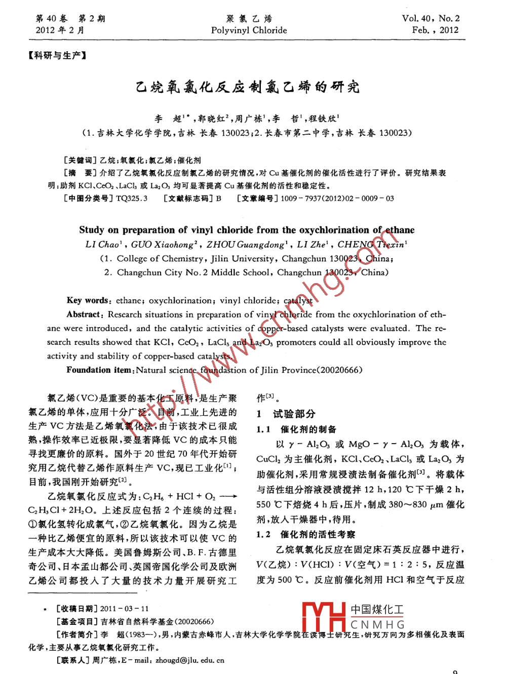 第40卷第2期聚氯乙烯Vol. 40, No. 22012年2月Polyvinyl ChlorideFeb. , 2012[科研與生產(chǎn)]乙烷氧氣化反應(yīng)制氯乙烯的研究李超'*,郭曉紅’,周廣棟',李 哲',程鐵欣'(1.吉林大學(xué)化學(xué)學(xué)院,吉林長春130023;2. 長春市第二中學(xué),吉林長春130023)[關(guān)鍵詞]乙烷;氧氯化;氯乙烯;催化劑[摘要] 介紹了乙烷氧氯化反應(yīng)制氯乙烯的研究情況,對Cu基催化劑的催化活性進(jìn)行了評價。研究結(jié)果表明:助劑KCI、CcO2、LaCl或La2O,均可顯著提高Cu基催化劑的活性和穩(wěn)定性。[中圖分類號] TQ325.3[文獻(xiàn)標(biāo)志碼]B [文章編號] 1009 - 7937(2012)02 - 0009- 03Study on preparation of vinyl chloride from the oxychlorination of ethaneLI Chao' , GUO Xiaohong2, ZHOU Guangdong', LI Zhe' , CHENG Tiexin'(1. College of Chemistry, Jilin University, Changchun 130023, China;2. Changchun City No. 2 Middle School, Changchun 130023,China)Key words: ethanc; oxychlorination; vinyl chloride; catalystAbstract: Research situations in preparation of vinyl chloride from the oxychlorination of eth-ane were introduced, and the catalytic activities of copper-based catalysts were evaluated. The re-search results showed that KCl, CeO2, LaCl3 and La2O3 promoters could all obviously improve theactivity and stability of copper-based catalysts.Foundation item : Natural science foundastion of Jilin Province(20020666)氯乙烯(VC)是重要的基本化工原料,是生產(chǎn)聚作[2]。氯乙烯的單體,應(yīng)用十分廣泛。目前,工業(yè)上先進(jìn)的試驗部分生產(chǎn)VC方法是乙烯氧氯化法,由于該技術(shù)已很成1.1催化劑 的制備熟,操作效率已近極限,要顯著降低VC的成本只能以γ-AIl2O,或MgO-γ-Al2O,為載體,尋找更廉價的原料。國外于20世紀(jì)70年代開始研CuCl2為主催化劑,KCl、CcO2、LaCl,或La2O,為究用乙烷代替乙烯作原料生產(chǎn)VC,現(xiàn)已工業(yè)化1;助催化劑,采用常規(guī)浸潰法制備催化劑)。將載體目前,我國剛開始研究[2]。乙烷氧氯化反應(yīng)式為:C2H6 + HCI+ Or→與活性組分溶液浸漬攪拌12 h,120 C下干燥2 h,C2H,Cl+2H2O。上述反應(yīng)包括2個連續(xù)的過程:550 C下焙燒4 h后,壓片,制成380~830 μm催化①氯化氫轉(zhuǎn)化成氯氣,②乙烷氧氯化。因為乙烷是劑,放人干燥器中,待用。一種比乙烯便宜的原料,所以該技術(shù)可以使VC的1.2 催化劑的活性考察生產(chǎn)成本大大降低。美國魯姆斯公司、B.F.古德里乙烷氧氯化反應(yīng)在固定床石英反應(yīng)器中進(jìn)行,奇公司、日本孟山都公司、英國帝國化學(xué)公司及歐洲V(乙烷) : V(HCI) : V(空氣)=1 : 2: 5,反應(yīng)溫乙烯公司都投人了大量的技術(shù)力量開展研究工度為500C。反應(yīng)前催化劑用HCI和空氣于反應(yīng)[收稿日期] 2011-03-11中國煤化工[基金項目]吉林省自然科學(xué)基金(20020666)MHCNMHG[作者簡介]李超(1983--),男,內(nèi)蒙古赤峰市人,吉林大學(xué)化學(xué)學(xué)院在讀博土研究生,冊究萬間為多相催化及表面化學(xué),主要從事乙烷氧氯化研究工作。[聯(lián)系人]周廣棟,E- mail: zhougd@jlu. edu. cn9科研與坐器聚氯乙烯2012年溫度下活化0.5 h。反應(yīng)產(chǎn)物用島津GC- 8A型氣100「100相色譜儀分析(Porapak Q色譜柱,FID檢測器)。302結(jié)果與討論ro t■乙烷轉(zhuǎn)化率▼VC選擇性2.1活性組分CuCl2含量對催化劑的影響口乙烯選擇性60,乙烷氧氯化反應(yīng)催化劑的主活性組分為50 tCuCl,筆者分別制備了不同Cu含量(Cu質(zhì)量分?jǐn)?shù)0上30 t分別為1%.3%、5%.7%和9%)的催化劑。所用載20體均為多孔γ-Al2O3,Cu含量對催化劑活性的影10響見圖1。1:12:13:14:15:10orn() : n(Cu)田2 K/Cu摩爾比對催化劑活性的影響Fig.2 Efect of K/Cu molecular ratio on activity of catalysts2.3第2助劑La或Ce含量對催化劑性能的影響90年90進(jìn)在Cu基催化劑中,除KCl外,還要引人稀土氣50化物或者氧化物以改善催化劑活性或者穩(wěn)定性。馮海強(qiáng)等[2引人CeCl,改進(jìn)CuK/a - Al2O3 催化劑,40 t。乙烯選擇性并篩選出最佳CuCl2 - KCl一CeCl3/a- Al2O3配比,乙烷轉(zhuǎn)化率高達(dá)98%。X J Li等[4]研究LaCl,w(Cu)/%改進(jìn)CuCl2 - KCI/y- Al2O3催化劑時發(fā)現(xiàn),引人圖1 Cu 含量對催化劑活性的影響LaCl3顯著提高了VC的選擇性和催化劑的使用壽Fig.1 Effect of Cu content on activity of catalysts命。TEM電鏡表明[4];LaCl顯著提高了Cu的分從圖1中可以看出:乙烷轉(zhuǎn)化率在Cu質(zhì)量分散,使更多的活性中心參與反應(yīng)過程。La 含量對催數(shù)為3%時最高,此后隨Cu含量的增加而下降;對化劑活性的影響見圖3。于目標(biāo)產(chǎn)物VC的選擇性而言,Cu質(zhì)量分?jǐn)?shù)為5%100 r| 100時最大;綜合考慮乙烷轉(zhuǎn)化率、VC選擇性和活性組分Cu的分散狀態(tài)等因素,取Cu質(zhì)量分?jǐn)?shù)5%為最●乙烷轉(zhuǎn)化率佳,可顯著提高Cu的物種利用率。2.2第1助劑KCl含量對催化劑性能的影響290 員在Cu基催化劑中,通常要摻人一定量的堿金,50地屬化合物(如KCI)。KCI 的摻人有效地降低了催化10 t40劑表面CuCh與載體的相互作用,而且在反應(yīng)過程30 F中KC1和CuCl2可形成低共熔點化合物,有效地降20 L678低CuCl2的揮發(fā)性。此外,TPR研究表明[4] :KClw(la)/%的摻人使Cu* /Cu的還原變得更加困難,說明KCl圖3 La 含量對催化劑活性的影響的加人有利于Cu* /Cu2+的轉(zhuǎn)化,從而保證了較高Fig.3 Efeet of La content on activity of catalysts的催化活性和催化劑的壽命。其中,K/Cu摩爾比由圖3可見:乙烷轉(zhuǎn)化率和VC選擇性在La質(zhì)對催化劑活性的影響