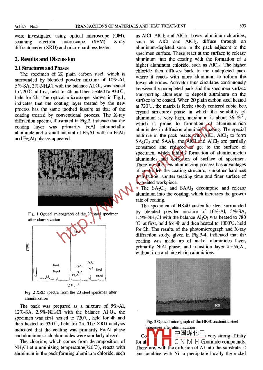 TRANSACTIONS OF MATERIALS AND HEAT TREATMENTVol.25 No.5PROCEEDINGS OF THE 14 IFHTSE CONGRESSOctober 2004A Controlled New Process of Pack AluminizationHUANG Zhi-rong, MA Liu-bao, LI Pei-ning, XU HongSchool of Mechanical Engineering, East China University of Science and Technology, Shanghai, ChinaAbstract: Aluminum diffusion coatings are often prepared by a pack aluminization technique, which is a specific variety ofchemical vapor deposition (CVD) method. The coating process takes place in a bed containing a mixed powder that servesas a source of the coatings forming element. The phase composition of the diffusion layer obtained depends on the activityof the Al during the pack aluminization processing. In this work, the proportion of Al to special additive powder in the packand the treatment temperature are adjusted to achieve the desired surface compostion of aluminized layer. The aluminized20 plain carbon steel and HK40 austenitic steel were investigated by optical microscopy (OM) , X-ray dffaction (XRD)and microsclerometer. The results showed that the desired FeAl, FezAl and NiAl were respectively formed on the 20 plaincarbon steel and HK40 austenitic steel, and the aluminides FeAl3, FezAls or NizAl3, NiAls could be inhibited.Key words: Pack aluminization, Contolled aluminization, Aluminized steelsIRON ALUMINIDES exhibit excellent corrosionphase inhomogeneities may occur, and therefore, theresistance in aggressive atmospheres at elevatedeffective activity of the bed may differ from whattemperaturel, which enables steels or alloys to beoriginally intended. As a result, a mixture of favorableprotected by Fe-Al intermetallic coatings. However, itand unfavorable phase may appear on the surface of theshould be borme in mind that aluminides with a highcoating. In the present work, the pack, with the desiredaluminum content- FeAlg, FezAls- -tend to embrittleAl activity, was prepared from a mixture of Al and athe coated layer and reduce its oxidation resistance. Byspecial additive. A controlled new process of packcontract, iron- rich iron aluminides possess excellentaluminization is developed for the purpose ofmechanical properties and oxidation resistancel5-olcontrolling the phases formed on the surface andAluminum diffusion coatings are often prepared by aobtaining the desirable aluminide phase.pack aluminization technique, which is a specificvariant of the chemical vapor deposition (CVD)1. Experimental Proceduresmethod. In the process, the coating is prepared by packThe alloys in the experiments are a commercial typecementation process involving heating the parts in20 plain carbon steel and a centrifugal casting HK40contact with a powder mixture of aluminum or anaustenitic steel furmace tube, the compositions are asaluminum alloy, a halide activator, usually a chloride orshowed in Table 1.fluoride salt, and an inert diluent such as alumina. TheAll specimens were in the form of rectangular sheetsassembly is then heated to promote diffusion, forof dimensions 10mmx10mmx3mm. The specimensexample at 800-1000C for 2-24 hours. The aluminumwere grounded with silicon carbide waterproof papercoating on the surface of the component penetrates intofrom No.200 to No. 800, degreased with acetone andhe alloy substrate to form a zone, the phasealcohol, ultrasonically cleaned in acetone and driedcomposition and properties of which are sensitive to thebefore pack cementation processing. The specimenprocess parameters---pack composition, temperaturesurrounded by uniformly blended powder mixtureand treatment time. The final microstructure of thecontaining Al powder, special additive(SA), NH4Clcoating is controlled by the substrate composition,activator and Al2O3 inert fllr was sealed in austenitictemperature and the pack aluminum activity. In moststainless retort with a paste of kaoline and liquidcases, the pack composition is varied to obtain acoating with the desired properties. Thesodium silicate, and subsequently heated in a furmace. Itcoating-forming elements may be introduced inwas at first heated to 720~820C, held for 4h and thenelemental form, or as an alloy of appropriateheated to 920~1000C, held for 2h, and at last the retortwas fumace-cooled to below 350 C before beingcomposition, usually prepared by melting andcooled in the air.solidification followed by homogenization and grindingThe structure and properties of the coating layerinto a powder. In that process, some chemical anTable 1 Chemical compositions of tested samples (mass %)中國(guó)煤化工-MaterialsCrNi_SFeEFYHC NMH G-20~0.230.3| 0.U.U55| u.035balHK40-0.424.821.10.75| 1.0.0270.0100.053bal.Vol.25 No.5TRANSACTIONS OF MATERIALS AND HEAT TREATMENT693were investigated using optical microscope (OM),as AlCI, AlCl2 and AlCl3. Lower aluminum chlorides,scanningelectron microscope (SEM), X-raysuch as AICI and AlCl2, diffuse through andiffractometer (XRD) and micro-hardness tester.aluminum-depleted zone in the pack adjacent to thespecimen surface. These react at the surface to release2. Results and Discussionaluminum into the coating with the formation of ahigher aluminum chloride, such as AlCl3. The higher2.1 Structures and PhasesThe specimen of 20 plain carbon steel, which ischloride then diffuses back to the undepleted packsurrounded by blended powder mixture of 10%-Al,where it reacts with more aluminum to reform the5%-SA, 2%-NH4Cl with the balance Al2O3, was heatedlower chlorides. Activator thus circulates continuouslyto 720C at first, held for 4h and then heated to 930C,between the undepleted pack and the specimen surfaceheld for 2h. The optical microscope, shown in Fig.1,transporting aluminum to deposit aluminum on thesurface to be coated. When 20 plain carbon steel heatedindicates that the coating layer treated by the newat 720C, the matrix is ferrite (body centered cubic, bcc,process has the same toothed feature as that of thecrystal structure) phase in which the solubility ofcoating treated by conventional process. The X-rayaluminum is ver