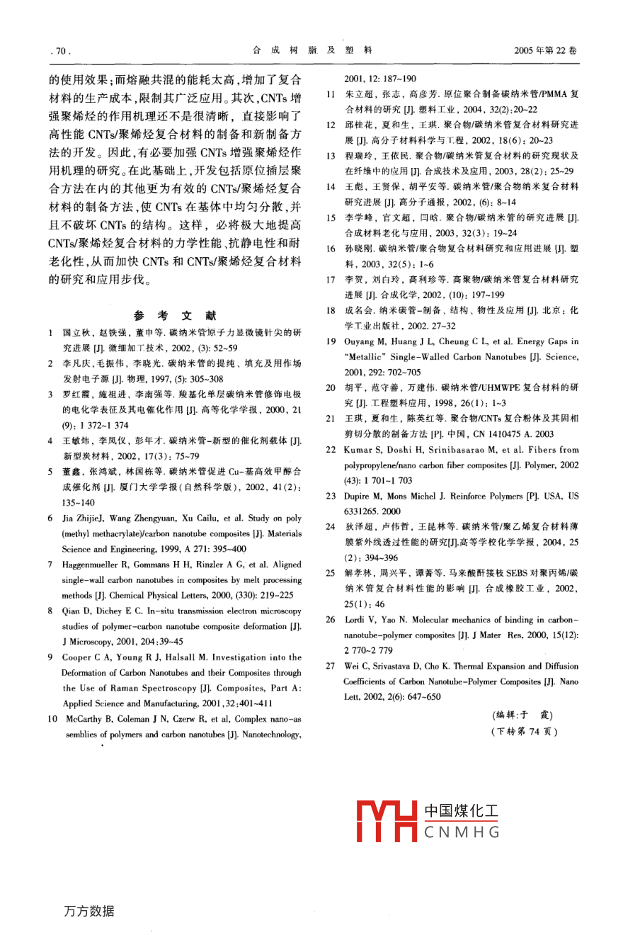 綜述合成樹脂及塑料,2005, 22(3): 67CHINA SYNTHETIC RESIN AND PLASTICS碳納米管在聚烯烴改性中的應用籍軍劉偉周涵(中國石油化工股份有限公司石油化工科學研究院,北京,10083)摘要:綜述了碳納米管(CNTs)/聚烯烴復合材料的研究進展,評述了今后CNTs/聚烯烴復合材料的研究方向。CNTs對聚烯烴的力學性能、電性能和光學性能有促進作用:CNTs/聚乙烯復合材料的拉伸強度提高了約20%;w(CNTs)為0.30%的CNT:/超高相對分子質量聚乙烯的體積電阻率小于1x10° ∩.cm,達到了抗靜電的要求,w(CNTs)為0.01%的CNTs/聚Z烯薄膜的紫外線總透過率從67.5%降到32.0%。關鍵詞:碳納米管 聚烯烴復合材料 性能中國分類號: TQ 325.1文獻標識碼: A文章編號: 1002-1396(2005 )03- 0067-04碳納米管(CNTs)是一種新型的功能材料,應CNTs,其導電性優(yōu)于銅,CNTs的楊氏模量和剪切.用于原子力顯微鏡的針尖凹.儲氫材料場發(fā)射電模量與金剛石相同,理論強度可達1.0 TPa,是鋼子源2、修飾電極凹納米電子設備、催化劑載體閣、的100倍。具有超高的韌性,而密度僅為鋼的1/7,高分子復合材料及催化劑促進劑9等。自1991年耐強酸強堿,在空氣中973K以下基本不被氧化。被發(fā)現以來,CNTs就引起了科研工作者的極大興因此,利用CNTs制備聚烯烴復合材料可極大地趣。CNTs的研究是當前化學、物理和材料科學領改善聚烯烴的力學性能、電性能和光學性能。域的熱點之一。目前,關于CNTs/高分子復合材料的文獻很2CNTs/聚烯烴復合材料的制備方法多1611。有人2-17已對CNTs/聚烯烴復合材料的研究CNTs粒徑小,表面能大,在范德華力的作用進展做了詳細介紹。本文主要就CNTs改性聚烯下,容易發(fā)生團聚。另外,CNTs具有較大的長烴的研究現狀和研究結果進行了總結。徑比,會發(fā)生纏繞。Ouyang等19測量了扶手型和鋸齒型CNTs的能帶,發(fā)現具有金屬性的鋸齒型1 CNTs 的結構及性能CNTs由于團聚會顯示出1個高于Feimi能級的CNTs一般由單層或多層石墨層卷曲而成,兩能帶結構而實際上呈現半導體性;扶手型CNTs端各被半個富勒烯封閉。因此,也可以將其看作是則會出現1個較小的偽能帶。因此,提高CNTs在富勒烯在一個方向上的延伸。CNTs的直徑一般在聚合物中的分散能力,增加與聚合物的界面結合1 nm到幾十納米,長度在幾十納米到微米級, 長力,防止CNTs團聚是制備CNTs/聚烯烴復合材料徑比在1 000左右,可看作準-維材料。CNTs 可的關鍵。以分為單壁管和多壁管。單壁管由單層碳原子繞制備CNTs/聚烯烴納米復合材料的方法主要合而成,CNTs具有對稱性和單一性;多壁管由多有機械混合、熔融共混、溶液共混和原位聚合等方層碳原子一層接一層繞合而成,好像同軸電纜一法。 但是,對于非極性的聚烯烴而言,主要采用機樣。CNTs獨特的結構使其具有優(yōu)異的力學性能、械混合和熔融共混的方法。熱穩(wěn)定性及電性能。理論計算表明舊,單壁CNTs的導電性能與其中國煤化工明: 2005-03-02。津大學化工系,現為中手性及直徑有關。當結構參數為(n,m) 的單壁CNTs滿足2n+3m=3q(q為整數)時,CNTs表現為FYHC N M H G研究院研究生,主要從事分子模擬及高分子復合材料的研究工作。聯系電話:金屬性,其他類型的則屬于半導體。作為導體的(010)62327551轉3080;E- mail: jun7308@163.com。.68.合成樹脂及塑料2005年第22卷2.1機械混合法混煉;最后,將混煉物切成小片擠出,并在PP的.機械混合法主要用研磨設備將CNTs和聚烯玻璃化轉變溫度(T)附近用熔融紡絲的方法制得烴混合而得到復合材料。胡平等啊通過球磨法制纖維。備了CNTs/超高相對分子質量聚乙烯(UHMWPE)狄澤超等叫將CNTs用氫氟酸和硝酸處理后,復合材料。UHMWPE為白色粉末,平均粒徑為兒與低密度聚乙烯在 180 C下混煉、造粒,制得了百微米。為了改善UHMWPE的塑性,先將自制的CNTs分散均勻的CNTs/聚乙烯(PE)復合材料。解CNTs與經過稀釋的分散偶聯劑混合,然后同孝林等129采用球磨共混和熔融共混相結合的方UHMWPE - -起放入三頭研磨機中研磨2h以上。法,制備了CNT/PP復合材料。其中,馬來酸酐接通過掃描電子顯微鏡(SEM)觀察表明,CNTs在枝苯乙烯-乙烯-丁烯-苯乙烯共聚物(MA- -SEBS)UHMWPE中分散良好,直徑在50~60 nm。還與手作為相容劑促進了CNTs在PP基體中的分散,形工混合、溶液超聲混合及磁力攪拌混合等方法進成了完善的逾滲網絡。行了比較,發(fā)現研磨法的分散效果最好。王琪等凹利用固相剪切的方法制備了CNTs/3CNTs對聚烯烴性能的影響聚烯烴復合粉體。將聚烯烴顆粒和CNTs在高速3.1力學性能攪拌器中均勻混合后送人固相剪切粉碎設備,重CNTs與聚合物大分子尺寸在同一數量級,可復碾磨多次,得到外觀均勻的CNTs/聚烯烴復合以近似看作--種剛性大分子。因此,作為增強材料粉體。該復合粉體通過熱壓成型可得到CNTs/聚對提高聚烯烴性能有著重要意義。烯烴復合材料。王琪等叫利用固相剪切的方法制備的CNTs/2.2熔融 共混法聚烯烴復合粉體,其拉伸強度和抗沖擊性能均得熔融共混法是將CNTs和聚烯烴混合后熔到了一-定的提高。同純PE相比,CNTs/PE復合材融,再制成各種復合材料。Kumar等四在雙螺桿擠料的拉伸強度提高了大約20%,沖擊強度提高了出機上制備了CNTs/聚丙烯(PP)復合材料。擠出15%-30%;而CNTs/PP復合材料的拉伸強度和沖機的各段溫度分別為150,200,220,240 C,螺桿擊強度比純PP分別提高了25%和20%。轉速為20 r/min。擠出物料經過淬火和真空干燥.胡平等網在測試CNTs/UHMWPE復合材料的后,