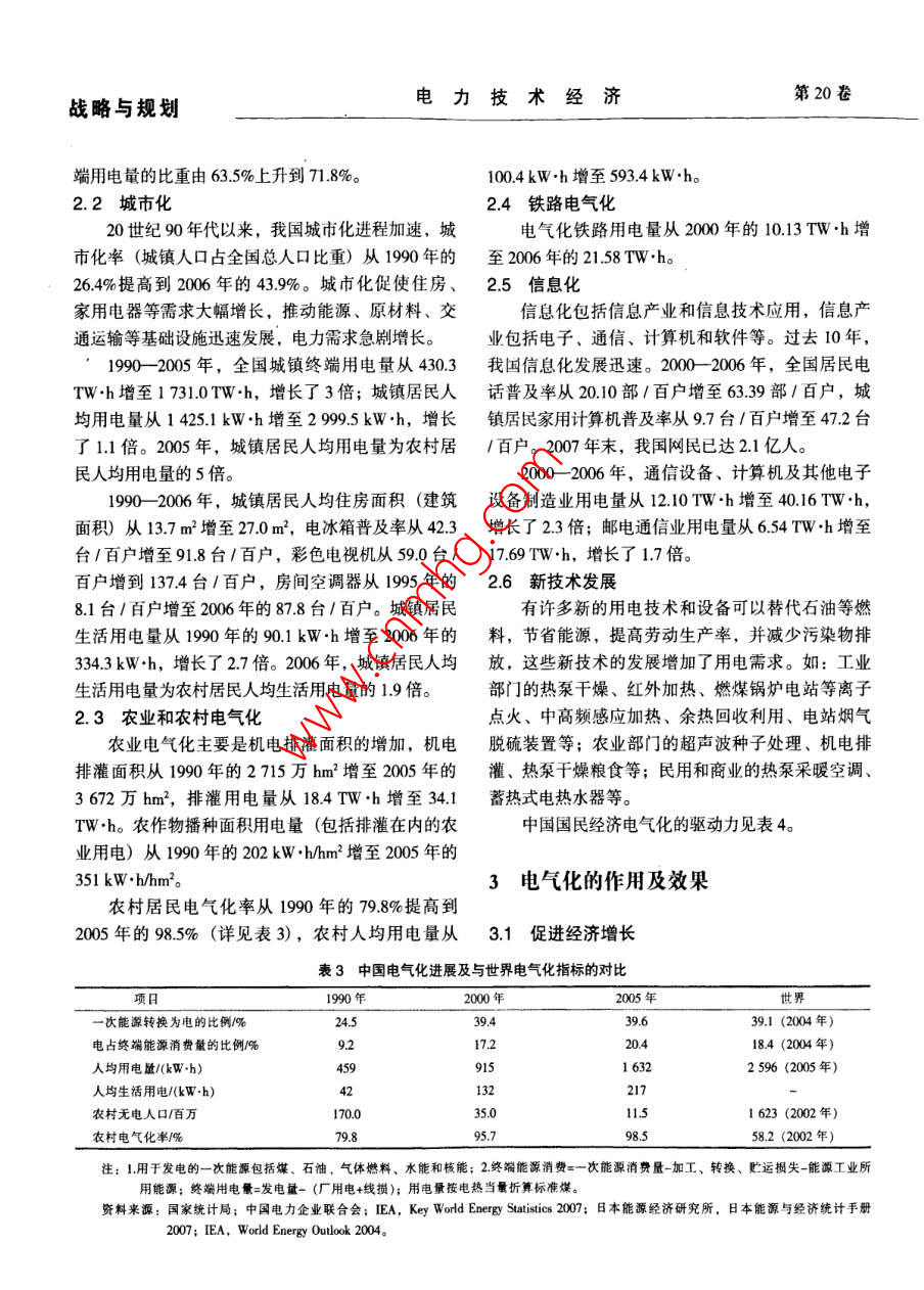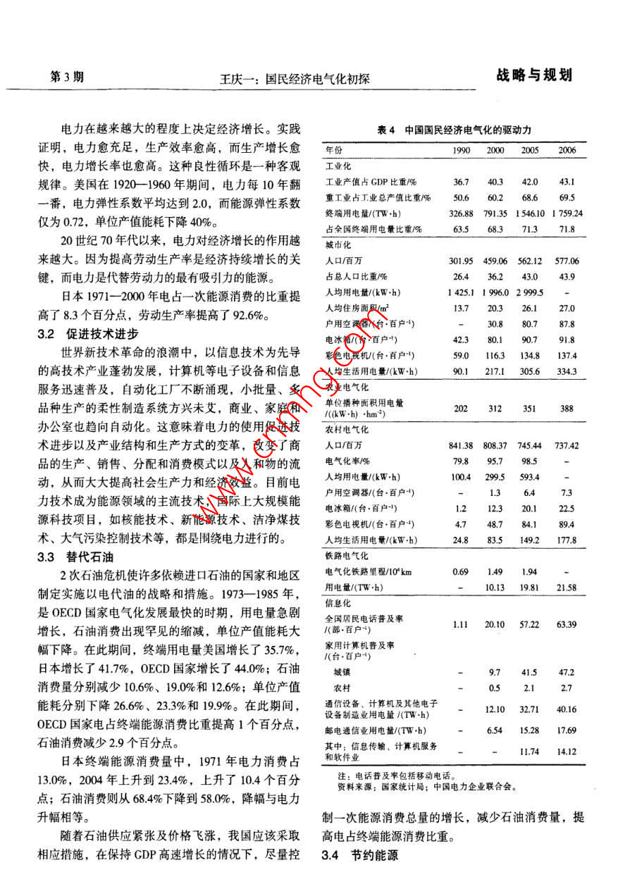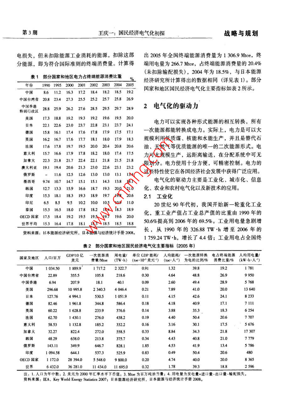 戰(zhàn)略與規(guī)劃:第20卷第3期電力技術(shù)經(jīng)濟(jì)Vol.20 No.32008年6月Electric Power Technologic EconomicsJun.2008文章編號(hào):1008-1682(2008)03-0012-06國(guó)民經(jīng)濟(jì)電氣化初探王慶一.(煤炭信息研究院,北京10029)摘要:綜述了電氣化對(duì)促進(jìn)經(jīng)濟(jì)增長(zhǎng)、改善生活質(zhì)量、節(jié)能、代油等重要意義,論述了工業(yè)化、城市化、信息化和新技術(shù)是推動(dòng)電氣化迅速發(fā)展的動(dòng)力。我國(guó)應(yīng)該研究制定以電力為基礎(chǔ)的能源發(fā)展戰(zhàn)略和電氣化計(jì)劃。關(guān)鍵詞:電氣化;節(jié)能;石油替代;能源戰(zhàn)略中圖分類(lèi)號(hào): TK018文獻(xiàn)標(biāo)識(shí)碼:[Analysis of Electrification on National EconomyWANG Qing-yi(Coal Informnation Istite, Beijing 100202, China)Abstract: This paper summarizes significant benefits of electrification in advancing economical growth, improvingliving quality, energy conservation and substitution of petroleum, and concludes that industrialization, urbanization,information revolution and new technology are among the major driving force of electrification. It proposes that a newenergy strategy based on electricity be sophisticatedly studied and drawn up.Key words: electrification; energy conservation; substitution of petroleum; energy strategy1國(guó)民經(jīng)濟(jì)電氣化的概念及度量能源署(IEA) 的統(tǒng)計(jì)方法,包括煤炭、石油、天然氣、核能、水能和其他可再生能源,折算成油當(dāng)量電氣化可定義為能源需求向電力轉(zhuǎn)化的過(guò)程,(或標(biāo)準(zhǔn)煤,即煤當(dāng)量)相加,即發(fā)電消耗的能源也就是用電力替代其他形式能源并帶動(dòng)電力需求不量。發(fā)電能源和一次能源消費(fèi)量中核電和水電的當(dāng)斷增長(zhǎng)的過(guò)程。電氣化程度,即社會(huì)經(jīng)濟(jì)發(fā)展對(duì)電量換算系數(shù)為10 893kJ/ (kW.h) 和3595kJ/ kW+h)。力的依賴(lài)程度,通常用2個(gè)指標(biāo)來(lái)衡量:一是發(fā)電電力為終端用電量,等于發(fā)電量減去廠用電和能源占一次能源總消費(fèi)量的百分比,它反映電力在線路損失量, 按電熱當(dāng)量折算成標(biāo)準(zhǔn)煤。終端能源能源系統(tǒng)中的地位;二是電力占終端能源總消費(fèi)量消費(fèi)量應(yīng)按國(guó)際通行的能源平衡定義和計(jì)算方法計(jì)的百分比,用來(lái)度量各類(lèi)用戶(hù)的電力消費(fèi)水平,說(shuō)算: 一次能源消費(fèi)量扣除加工、轉(zhuǎn)換、貯運(yùn)損失和明電力對(duì)社會(huì)經(jīng)濟(jì)發(fā)展的作用。此外,居民電氣化能源工業(yè)消耗的能源,電力按電熱當(dāng)量折算成標(biāo)準(zhǔn)率、人均用電量、人均生活用電量等,也是衡量電煤。中國(guó)綜合能源平衡表按發(fā)電煤耗法和電熱當(dāng)量氣化程度的重要指標(biāo)。法列出2組數(shù)據(jù);發(fā)電煤耗法未扣除火力發(fā)電能源發(fā)電能源占- -次能源總消費(fèi)量比例,按照國(guó)際損失和能源工業(yè)消耗的能源;電熱當(dāng)量法扣除了發(fā)收稿日期: 2008-02-20作者簡(jiǎn)介:王慶-(1935-), 男,江蘇張家港人,研究員,長(zhǎng)期從事能源政策研究工作,曾任中國(guó)能源研究會(huì)副理事長(zhǎng)。E-mail: wangqingyi2008@sina com第3期王慶一:國(guó)民經(jīng)濟(jì)電氣化初探戰(zhàn)略與規(guī)劃電損失,但未扣除能源工業(yè)消耗的能源,扣除這部出 2005年全國(guó)終端能源消費(fèi)量為1 306.9 Mtce,約分能源,即為符合國(guó)際準(zhǔn)則的終端消費(fèi)量。計(jì)算得端用電量為266.7Mtce,占終端能源消費(fèi)量的20.4%(未扣除輸配損失),2004 年為18.5%,與日本能源表1部分國(guó)家和地區(qū) 電力占終端能源消費(fèi)比重%經(jīng)濟(jì)研究所計(jì)算得出的數(shù)據(jù)相同(詳見(jiàn)表1)。 部分年份1990 1995 2000 2001 2002 2003 2004 2005國(guó)家和地區(qū)國(guó)民經(jīng)濟(jì)電氣化主要指標(biāo)如表2所示。中國(guó)8.6 11.2 16.3 172 18.4 18.2 18.5 19.2中國(guó)臺(tái)灣省20.8 23.4 27.3 25.5 25.2 25.7 25.8 26.9中國(guó)香港28.8 25.9 26.2 27.6 28.5 29.5 29.7 2892電氣化的驅(qū)動(dòng)力特別行政區(qū)美國(guó).17.318.8 19.2 19.3 19.2 19.6 19.5 20.0電力可以實(shí)現(xiàn)各種形式能源的相互轉(zhuǎn)換,所有日本22.1 2.6 23.0 23.7 22.8 23.1 23.7 24.1德國(guó)15.8 16.1 17.4 17.6 17.8 17.9 17.5 17.1-次能源都能轉(zhuǎn)換成電力。實(shí)際上,電力是可以大英國(guó)16.2 16.7 17.6 17.7 18.1 18.0 17.9 18.3規(guī)模利用低質(zhì)煤、核能和水能生產(chǎn),并且是替代石法國(guó)17.6 1719.19.5 20.0 20.4 20.8 20.6油、天然氣等優(yōu)質(zhì)能源的唯- -的二次能源形式。電意大利.I5.7 16.6 17.9 17.8 18.2 18.0 174 17.5力可大規(guī)模生產(chǎn),遠(yuǎn)距離輸送,在分配系統(tǒng)中可無(wú)加拿大22.321.8 21.7 22.4 221.8 21.5 21.8限劃分。電力使用十分方便,可精密控制。電力的澳大利亞19.1 19.4 20.6 21.3 23.0 22.6 23.1 23.2這些特性使它在各國(guó)經(jīng)濟(jì)社會(huì)發(fā)展中獲得廣泛應(yīng)用。俄羅斯12.613.0 13.0 13.1 13.4墨西哥9.7410.7 14.7 15.1 15.1 14.3 13.8 14.1電氣化的驅(qū)動(dòng)力主要是工業(yè)化、城市化、信息韓國(guó)16.6 18.7 19.3 20.0 21.0化、農(nóng)業(yè)和農(nóng)村電氣化以及新技術(shù)的應(yīng)用。印度15.3 18.1 18.3 19.3 18.9 19.7 19.8 20.62.1工業(yè)化印尼6.5 8.5 9.:20世紀(jì)90年代初,我國(guó)開(kāi)始新一輪重化工業(yè)泰國