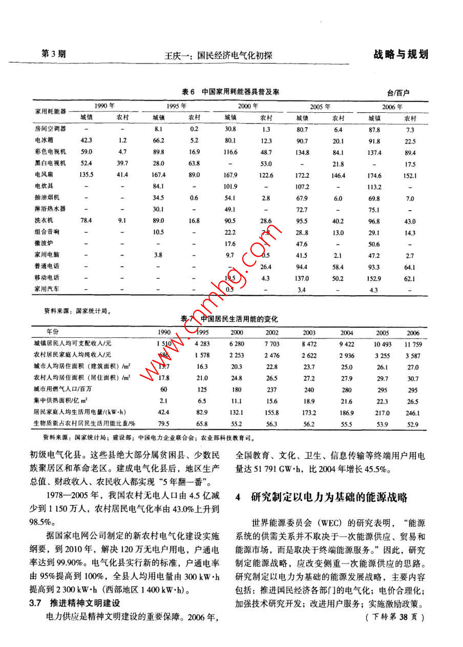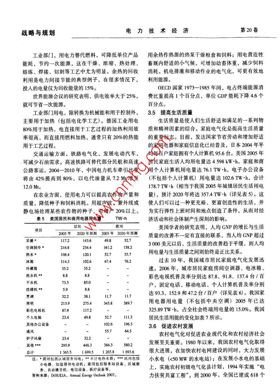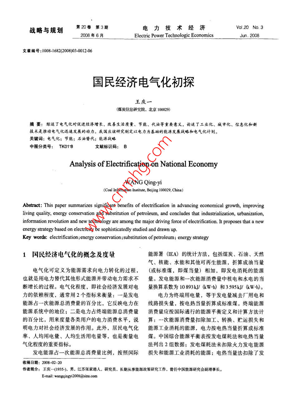 戰(zhàn)略與規(guī)劃:第20卷第3期電力技術(shù)經(jīng)濟(jì)Vol.20 No.32008年6月Electric Power Technologic EconomicsJun.2008文章編號(hào):1008-1682(2008)03-0012-06國(guó)民經(jīng)濟(jì)電氣化初探王慶一.(煤炭信息研究院,北京10029)摘要:綜述了電氣化對(duì)促進(jìn)經(jīng)濟(jì)增長(zhǎng)、改善生活質(zhì)量、節(jié)能、代油等重要意義,論述了工業(yè)化、城市化、信息化和新技術(shù)是推動(dòng)電氣化迅速發(fā)展的動(dòng)力。我國(guó)應(yīng)該研究制定以電力為基礎(chǔ)的能源發(fā)展戰(zhàn)略和電氣化計(jì)劃。關(guān)鍵詞:電氣化;節(jié)能;石油替代;能源戰(zhàn)略中圖分類(lèi)號(hào): TK018文獻(xiàn)標(biāo)識(shí)碼:[Analysis of Electrification on National EconomyWANG Qing-yi(Coal Informnation Istite, Beijing 100202, China)Abstract: This paper summarizes significant benefits of electrification in advancing economical growth, improvingliving quality, energy conservation and substitution of petroleum, and concludes that industrialization, urbanization,information revolution and new technology are among the major driving force of electrification. It proposes that a newenergy strategy based on electricity be sophisticatedly studied and drawn up.Key words: electrification; energy conservation; substitution of petroleum; energy strategy1國(guó)民經(jīng)濟(jì)電氣化的概念及度量能源署(IEA) 的統(tǒng)計(jì)方法,包括煤炭、石油、天然氣、核能、水能和其他可再生能源,折算成油當(dāng)量電氣化可定義為能源需求向電力轉(zhuǎn)化的過(guò)程,(或標(biāo)準(zhǔn)煤,即煤當(dāng)量)相加,即發(fā)電消耗的能源也就是用電力替代其他形式能源并帶動(dòng)電力需求不量。發(fā)電能源和一次能源消費(fèi)量中核電和水電的當(dāng)斷增長(zhǎng)的過(guò)程。電氣化程度,即社會(huì)經(jīng)濟(jì)發(fā)展對(duì)電量換算系數(shù)為10 893kJ/ (kW.h) 和3595kJ/ kW+h)。力的依賴(lài)程度,通常用2個(gè)指標(biāo)來(lái)衡量:一是發(fā)電電力為終端用電量,等于發(fā)電量減去廠用電和能源占一次能源總消費(fèi)量的百分比,它反映電力在線路損失量, 按電熱當(dāng)量折算成標(biāo)準(zhǔn)煤。終端能源能源系統(tǒng)中的地位;二是電力占終端能源總消費(fèi)量消費(fèi)量應(yīng)按國(guó)際通行的能源平衡定義和計(jì)算方法計(jì)的百分比,用來(lái)度量各類(lèi)用戶(hù)的電力消費(fèi)水平,說(shuō)算: 一次能源消費(fèi)量扣除加工、轉(zhuǎn)換、貯運(yùn)損失和明電力對(duì)社會(huì)經(jīng)濟(jì)發(fā)展的作用。此外,居民電氣化能源工業(yè)消耗的能源,電力按電熱當(dāng)量折算成標(biāo)準(zhǔn)率、人均用電量、人均生活用電量等,也是衡量電煤。中國(guó)綜合能源平衡表按發(fā)電煤耗法和電熱當(dāng)量氣化程度的重要指標(biāo)。法列出2組數(shù)據(jù);發(fā)電煤耗法未扣除火力發(fā)電能源發(fā)電能源占- -次能源總消費(fèi)量比例,按照國(guó)際損失和能源工業(yè)消耗的能源;電熱當(dāng)量法扣除了發(fā)收稿日期: 2008-02-20作者簡(jiǎn)介:王慶-(1935-), 男,江蘇張家港人,研究員,長(zhǎng)期從事能源政策研究工作,曾任中國(guó)能源研究會(huì)副理事長(zhǎng)。E-mail: wangqingyi2008@sina com第3期王慶一:國(guó)民經(jīng)濟(jì)電氣化初探戰(zhàn)略與規(guī)劃電損失,但未扣除能源工業(yè)消耗的能源,扣除這部出 2005年全國(guó)終端能源消費(fèi)量為1 306.9 Mtce,約分能源,即為符合國(guó)際準(zhǔn)則的終端消費(fèi)量。計(jì)算得端用電量為266.7Mtce,占終端能源消費(fèi)量的20.4%(未扣除輸配損失),2004 年為18.5%,與日本能源表1部分國(guó)家和地區(qū) 電力占終端能源消費(fèi)比重%經(jīng)濟(jì)研究所計(jì)算得出的數(shù)據(jù)相同(詳見(jiàn)表1)。 部分年份1990 1995 2000 2001 2002 2003 2004 2005國(guó)家和地區(qū)國(guó)民經(jīng)濟(jì)電氣化主要指標(biāo)如表2所示。中國(guó)8.6 11.2 16.3 172 18.4 18.2 18.5 19.2中國(guó)臺(tái)灣省20.8 23.4 27.3 25.5 25.2 25.7 25.8 26.9中國(guó)香港28.8 25.9 26.2 27.6 28.5 29.5 29.7 2892電氣化的驅(qū)動(dòng)力特別行政區(qū)美國(guó).17.318.8 19.2 19.3 19.2 19.6 19.5 20.0電力可以實(shí)現(xiàn)各種形式能源的相互轉(zhuǎn)換,所有日本22.1 2.6 23.0 23.7 22.8 23.1 23.7 24.1德國(guó)15.8 16.1 17.4 17.6 17.8 17.9 17.5 17.1-次能源都能轉(zhuǎn)換成電力。實(shí)際上,電力是可以大英國(guó)16.2 16.7 17.6 17.7 18.1 18.0 17.9 18.3規(guī)模利用低質(zhì)煤、核能和水能生產(chǎn),并且是替代石法國(guó)17.6 1719.19.5 20.0 20.4 20.8 20.6油、天然氣等優(yōu)質(zhì)能源的唯- -的二次能源形式。電意大利.I5.7 16.6 17.9 17.8 18.2 18.0 174 17.5力可大規(guī)模生產(chǎn),遠(yuǎn)距離輸送,在分配系統(tǒng)中可無(wú)加拿大22.321.8 21.7 22.4 221.8 21.5 21.8限劃分。電力使用十分方便,可精密控制。電力的澳大利亞19.1 19.4 20.6 21.3 23.0 22.6 23.1 23.2這些特性使它在各國(guó)經(jīng)濟(jì)社會(huì)發(fā)展中獲得廣泛應(yīng)用。俄羅斯12.613.0 13.0 13.1 13.4墨西哥9.7410.7 14.7 15.1 15.1 14.3 13.8 14.1電氣化的驅(qū)動(dòng)力主要是工業(yè)化、城市化、信息韓國(guó)16.6 18.7 19.3 20.0 21.0化、農(nóng)業(yè)和農(nóng)村電氣化以及新技術(shù)的應(yīng)用。印度15.3 18.1 18.3 19.3 18.9 19.7 19.8 20.62.1工業(yè)化印尼6.5 8.5 9.:20世紀(jì)90年代初,我國(guó)開(kāi)始新一輪重化工業(yè)泰國