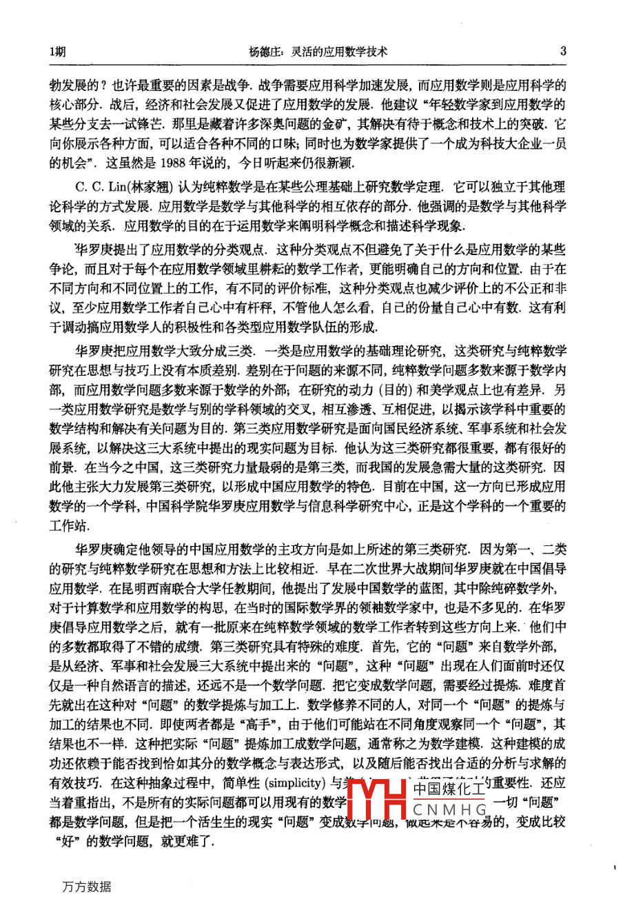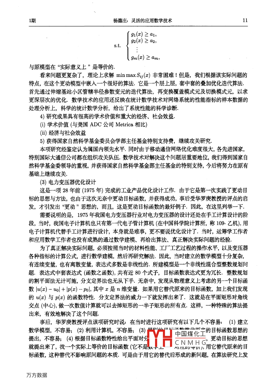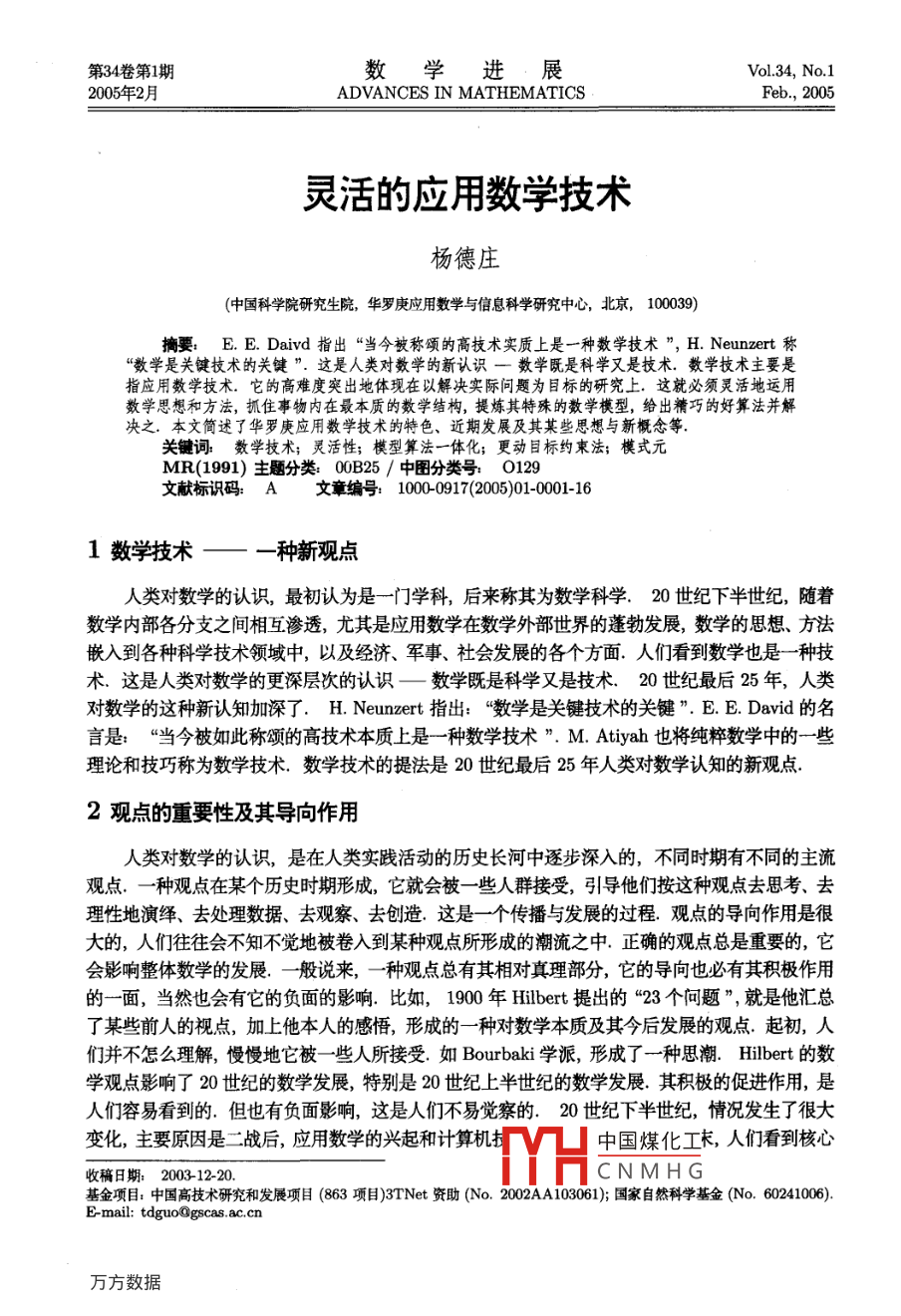 第34卷第1期數學進展Vol 34. No. 1005年2月ADVANCES IN MATHEMATICSFeb.2005靈活的應用數學技術楊德莊(中國科學院研究生院,華羅庚應用數學與信息科學研究中心,北京,10039)摘要:E.E.Davd指出“當今被稱頌的高技術實質上是一種數學技術",H. Neunzert稱《數學是關鍵技術的關鍵”.這是人類對數學的新認識一數學既是科學又是技術,數學技術主要是指應用數學技術.它的高難度突出地體現在以解決實際問題為目標的研究上.這就必須靈活地運用數學思想和方法,抓住事物內在最本質的數學結構,提煉其特殊的數學模型,給出精巧的好算法并解決之,本文簡述了華羅庚應用數學技術的特色、近期發(fā)展及其某些思想與新概念等關鍵詞數學技術;靈活性;模型算法一體化;更動目標約東法;模式元MR(1991)主題分類:00B25/中圖分類號:O129文獻標識碼:A文章編號1000917(2005)01-0001-161數學技術—一種新觀點人類對數學的認識,最初認為是一門學科,后來稱其為數學科學.20世紀下半世紀,隨著數學內部各分支之間相互滲透,尤其是應用數學在數學外部世界的蓬勃發(fā)展,數學的思想、方法嵌入到各種科學技術領域中,以及經濟、軍事、社會發(fā)展的各個方面.人們看到數學也是一種技術.這是人類對數學的更深層次的認識—數學既是科學又是技術.20世紀最后25年,人類對數學的這種新認知加深了. H. Neunzert指出:“數學是關鍵技術的關鍵”.E.E.Davd的名言是:“當今被如此稱頌的高技術本質上是一種數學技術”M. Atiyah也將純粹數學中的一些理論和技巧稱為數學技術.數學技術的提法是20世紀最后25年人類對數學認知的新觀點2觀點的重要性及其導向作用人類對數學的認識,是在人類實踐活動的歷史長河中逐步深入的,不同時期有不同的主流觀點.一種觀點在某個歷史時期形成,它就會被一些人群接受,引導他們按這種觀點去思考、去理性地演繹、去處理數據、去觀察、去創(chuàng)造.這是一個傳播與發(fā)展的過程.觀點的導向作用是很大的,人們往往會不知不黨地被卷入到某種觀點所形成的潮流之中.正確的觀點總是重要的,它會影響整體數學的發(fā)展一般說來,一種觀點總有其相對真理部分,它的導向也必有其積極作用的一面,當然也會有它的負面的影響.比如,1900年 Hilbert提出的“23個問題”,就是他匯總了某些前人的視點,加上他本人的感悟,形成的一種對數學本質及其今后發(fā)展的觀點起初,人們并不怎么理解,慢慢地它被一些人所接受.如 Bourbaki學派,形成了一種思潮. Hilbert的數學觀點影響了20世紀的數學發(fā)展,特別是20世紀上半世紀的數學發(fā)展.其積極的促進作用,是人們容易看到的.但也有負面影響,這是人們不易覺察的.20世紀下半世紀,情況發(fā)生了很大變化,主要原因是二戰(zhàn)后,應用數學的興起和計算機中國煤化工,人們看到核心收稿日期12-20CNMHG基金項目:中國高技術研究和發(fā)展項目(863項目)3TNet資助(No.2002AA103061);國家自然科學基金(No.60241006)數學進34卷數學的發(fā)展之外,應用數學和計算機技術得到突飛猛進的發(fā)展.今天,我們談起數學,都會著重地提核心數學、應用數學和計算機技術的互動作用.20世紀末,數學整體發(fā)展水平已達到一個新的境界.且不提過去一個世紀中社會因素對數學整體發(fā)展的作用,僅就數學界來講,諸多數學家的數學觀點,以及起主導作用的數學團隊(他們可能散布在世界各地)的勤奮工作,都對世界整體數學發(fā)展做出了貢獻,其中不能不提到馮·諾伊曼的貢獻.他不但是一位世界一流的純粹數學家,也是世界一流的應用數學家和現代計算技術的倡導者和奠基人.他可算是20世紀對人類社會、經濟、生活影響最大的數學家.他的數學觀點,來自他對純粹數學、應用數學和計算機技術發(fā)展的全面思考,他對應用數學的推動以及他卓有遠見的發(fā)展電子計算機的思想,已結出豐碩果實,還要在本世紀發(fā)揮他的影響力.馮·諾伊曼的數學觀點,對20世紀的應用數學和計算技術的發(fā)展起到積極的導向作用,而應用數學和計算技術的發(fā)展自然導致數學技術提法的出現3應用數學技術數學既是科學又是技術,數學技術這種提法,本身是一種觀點,這種數學技術主要是指應用數學技術人們把數學分為純粹數學和應用數學,但這只是一種大致的分法,有時很難把某一分支或某一方向歸屬于純的,還是應用的.事實上,時至今日,人們也沒有說清楚什么是數學?什么是應用數學?但是數學工作者總要大體上把握它們,必須有一種觀點理解它們,認識它們,因為只有這樣,才知道自己該做什么和怎么做什么是應用數學?在數學界有許多不同的觀點a, M. Atiyah在回答“什么是數學”時說“很困難,一種可能的回答是數學是解決‘向題的各種思想與智力技巧的集合體”.他強調“問題的作用”.純粹數學中,如費馬大定理、哥德巴赫猜想等等,吸引了許多數學家對這些問題的研究,在他們奮力解決這些問題的過程中,引進了許多新的技巧與概念,這些新的技巧與概念滲透到許多數學分支之中,推動了數學的創(chuàng)新,增強了美學成分,促進了數學的進步.這是來自數學內部的問題, Hilbert的23個問題正是如此M. Atiyah認為“問題”在數學發(fā)展中起關鍵作用如果“問題”是源于數學世界的外部,這些外部問題對數學產生刺激,也會吸引許多數學家去研究它.有時,這些問題可在已有的數學框架內處理,