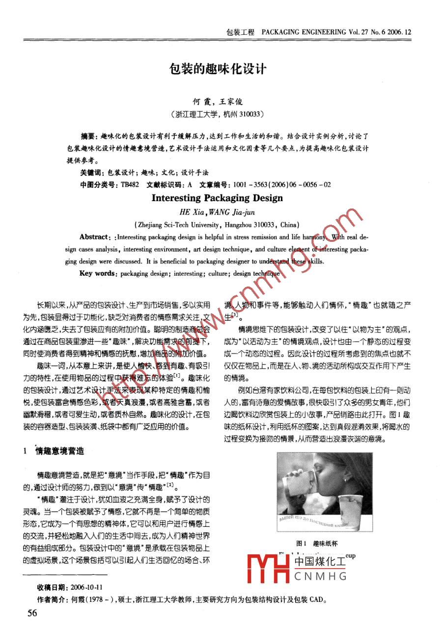 包裝工程PACKAGING ENCINEERING Vol. 27 No. 6 2006. 12包裝的趣味化設(shè)計何霞,王家俊(浙江理工大學,杭州310033)摘要:趣味化的包裝設(shè)計有利于緩解壓力,達到工作和生活的和諧。結(jié)合設(shè)計實例分析,討論了包裝趣味化設(shè)計的情趣意境營造,藝術(shù)設(shè)計手法運用和文化因素等幾個要點,為提高趣味化包裝設(shè)計提供參考。關(guān)鍵詞:包裝設(shè)計;趣味;文化;設(shè)計手法中圖分類號: TB482文獻標識碼: A文章編號: 1001 -3563(2006)06 -0056 -02,Interesting Packaging DesignHE Xia , WANG Jia-jun(Zhejiang Sci-Tech University, Hangzhou 310033, China)Abstract: :Interesting packaging design is helpful in stres remissioa and life harmony. With real de-sign cases analysis , interesting environment , art design technique , and culture element of interesting packa-ging design were discussed. It is beneficial to packaging designer to understand these skills.Key words: packaging design; interesting; culture; design technique長期以來,從產(chǎn)品的包裝設(shè)計生產(chǎn)到市場銷售,多以實用境、人物和事件 等,能夠觸動人們情懷,“情趣”也就隨之產(chǎn)為先,包裝顯得過于功能化,缺乏對消費者的情感需求關(guān)注,文生”。化內(nèi)涵匱乏,失去了包裝應(yīng)有的附加價值。聰明的制造商總會情境思維下的包裝設(shè)計,改變了以往“以物為主”的觀點,通過在商品包裝里滲進-些“ 趣味" ,解決功能需求的前提下,成為“以活動為主”的情境觀點,設(shè)計也由一個靜態(tài)的過程變同時使消費者得到精神和情感的撫慰,增加商品的附加價值。成一個動態(tài)的過程。因此設(shè)計的過程所考慮到的焦點也就不趣味-詞,從本意上來講,是使人愉快、感到有趣、有吸引僅僅在物品上,而是在人、物、境的活動所構(gòu)成交互作用下產(chǎn)生力的特性,在使用物品的過程中獲得難忘的體驗”。趣味化的情境。的包裝設(shè)計,通過藝術(shù)設(shè)計手法來表現(xiàn)某種特定的情趣和愉例如臺灣有家飲料公司在每包飲料的包裝上印有-則動悅,使包裝富含情感色彩,或者天真浪漫,或者高雅含蓄,或者人的,富有詩意的愛情故事,很快吸引了眾多的男女青年,他們幽默滑稽,或者可愛生動,或者質(zhì)樸自然。趣味化的設(shè)計,在包邊喝飲料邊欣賞包裝上的小故事,產(chǎn)品銷路由此打開。圖1趣裝的容器造型、包裝裝潢紙袋中都有廣泛應(yīng)用的價值。味的紙杯設(shè)計,利用紙杯的圖案,達到真假混淆效果,將喝水的過程變換為接吻的情景,從而營造出浪漫詼諧的意境。1情趣意境營造 .情趣意境營造,就是把“意境"當作手段,把情趣"作為目的,通過設(shè)計師的努力,做到以意境"傳“情趣”[2。"情趣"灌注于設(shè)計,猶如血波之充滿全身,賦予了設(shè)計的靈魂。當一個包裝被賦予了情感,它就不再是一個簡單的物質(zhì)形態(tài),它成為一個有思想的精神體,它可以和用戶進行情感上的交流,并輕松地融入人們的生活中間去,成為人們精神世界圖1趣味紙杯.的有益組成部分。包裝設(shè)計中的“意境"是承載在包裝物品上的虛擬場景,這個場景包括可以引起人們生活回憶的場合、環(huán)中國煤化工-cupMYHCNMHG收稿日期: 2006-10-11作者簡介:何霞(1978 -) ,碩士,浙江理工大學教師,主要研究方向為包裝結(jié)構(gòu)設(shè)計及包裝CAD。56何霞等包裝的趣味 化設(shè)計例如紹興特產(chǎn)加飯酒及茴香豆采用趣味包裝,其包裝容器2藝術(shù)設(shè)計手法運用 .為毛竹筒,筒上繪有紹興“老鄉(xiāng)”臉孔,頭戴紹興氈帽,既富有濃郁的地方特色,又具有詼諧幽默的情調(diào),對消費者和游客有在包裝設(shè)計的造型及裝潢上采用比喻、夸張擬人、仿生等很大的吸引力。這種設(shè)計抓住區(qū)域文化的特征,只有受這種文別出心裁地構(gòu)思設(shè)計手法,將更多幽默、詼諧以及樂觀的要素化熏陶的消費者才能體會到個中趣味。圖3蘭貴人化妝品系添加到包裝設(shè)計當中,可以增加包裝的趣味性和幽默感,強化列設(shè)計,以清宮貴人為容器造型設(shè)計的文化內(nèi)涵,表達民族化對顧客的吸引力。妝品獨特形象。瓶型采用柔形的圓型,以紫砂工藝體現(xiàn)女性的“情以物興,物以情觀" ,就是要設(shè)計師們以物我交感、心美感 ,瓶蓋用清宮帽,紅蘭相兼更顯示出清朝文化。包裝圖案物應(yīng)合雙向生成的設(shè)計理念[4 ,將自然形態(tài)轉(zhuǎn)化為富于生命的清宮貴人用圖畫白描手法裝飾于瓶身圖案和諧呼應(yīng)。力和情趣的設(shè)計形式,從而創(chuàng)造出有生命力的作品。趣味的包裝設(shè)計要以人為本,從人的需求出發(fā),在保證包裝的使用價值的前提下,側(cè)重考慮滿足人在精神層面的需求的設(shè)計要素,沒計出符合人精神訴求的包裝。例如圖2會做表情的紙盒包裝設(shè)計,利用了擬人、夸張、仿生等手法運用簡練的線條使其呈現(xiàn)生物的笑臉或形狀,俏皮可愛,生動的刻畫出生物的各種表情,人在第一眼看到它們的時候赫然一笑,達到情趣化設(shè)計的目的,愉悅?cè)说男睦?緩解生活圖3蘭貴人化妝品系列壓力,這種手法非常成功地應(yīng)用在J L童包裝設(shè)計中。Fig. 3 LAN Gui - ren cosmetic series4.結(jié)語X_U現(xiàn)代社會工作和生活的節(jié)奏越來越快,使人處于長期緊張狀態(tài),容易疲勞,人的情緒也易于煩躁。趣味的包裝設(shè)計有利于緩解壓力,達到工作和生