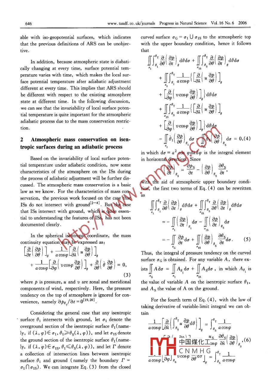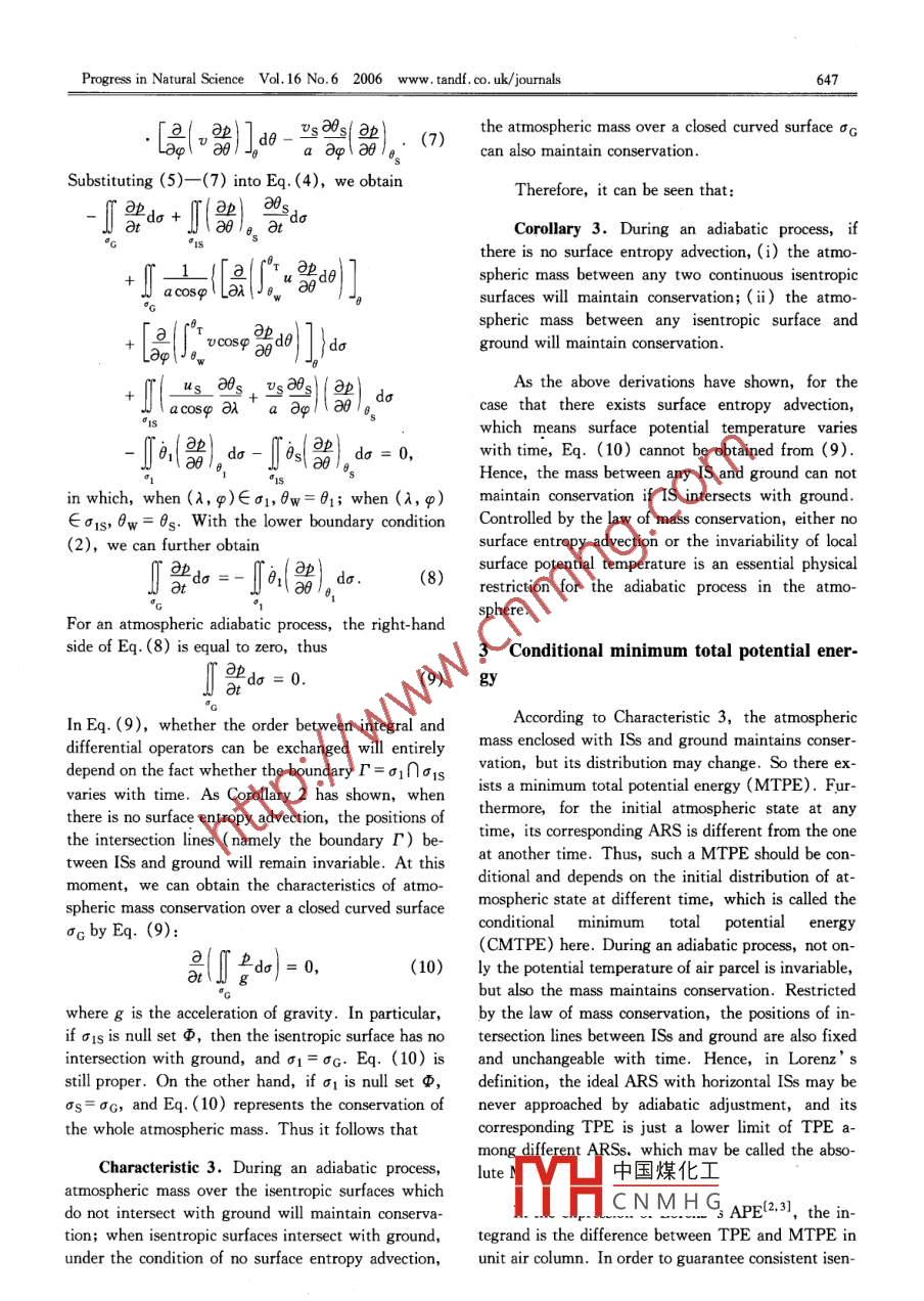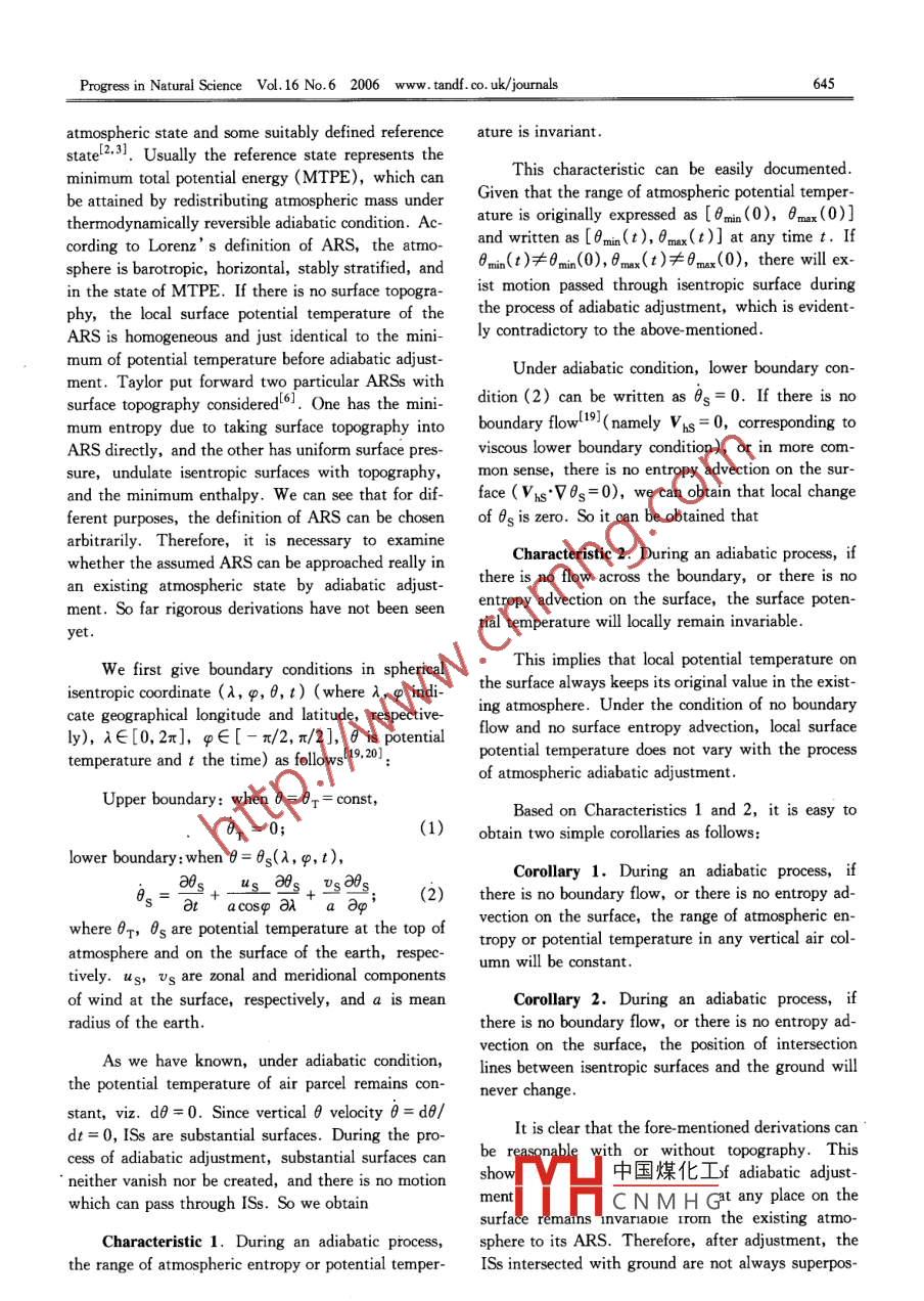 PROGRESS IN NATURAL SCIENCEVol. 16, No. 6, June 2006Some characteristics of the atmosphere during an adiabatic processGAO Ll2, LI Jianping' ** and REN Hongli'(1. LASG, Institute of Atmospheric Physics, Chinese Academy of Sciences, Beijing 00029, China; 2. Graduate School of Chinese A-cademy of Sciences, Beiing 100049, China; 3. National Climate Center, Laboratory of Climate Studies, China Meteorological Adminis-tration, Beijing 100081, China)Received September 10, 2005Abstract Some important characteristics of the atmosphere during an adiabatic process are investigated, which include the invari-ability of atmnospheric entropy range and local surface potential temperature, the conservation of the atmospheric mass intervened betweenany isentropic surface and the ground, and the isentropic surface intersecting with the ground. The analysis shows that the atmosphericreference state (ARS) for investigation on available potentia! energy (APE) should be deined objectively as the state which could be BP-proached from the existing atmosphere by adiabatic adjustment, and be related to initial atmospheric state before adjustment. For the initialatmosphere state at any time, its corresponding ARS is dfferent from the one at another time. Based on the above mentioned conclusions,the reference state proposed by Lorenz cannot be obtained physcally, so a new conception, the conditional minimum total potential ener-gy, is put forward in order to obietively investigate atmospheric APE.Keywords: available potential energy, adiabatic, isentropic surface, atnospheric reference state, conditional minimum total po-tential energy.The studies on available potential energy (APE)In the work on theoretical derivation and calcula-always play an important role in atmospheric energet-tion of APE, to define a suitable atmospheric refer-ics. The terminology of APE was first introduced forence state (ARS) by redistributing atmospheric massthe general circulation by Margules'1I, and later rede-under thermodynamically reversible adiabatic processfined by Lorenzl2.31. Furthermore, approximate andis of importance. In Lorenz’s first ARS without to-exact formulas for calculating APE and its generationpography, the atmosphere is barotropic, horizontal, .were promoted, but those derivations are traditionallystably stratified, and in minimum TPEI2,3,5]. Fur-based on the assumptions that hydrostatic balancether researches on ARS have been done, such as theprevails, the atmosphere is stably stratified every-case with topography, etc. Actually, such distri-where, the latent energy does not contribute to thebutions of ARS have been directly designed physical-internal energy, and surface topography can be ig-ly, whereas some characteristics of atmosphere onnored. There have been many approximations devel-isentropic surfaces ( ISs ) under adiabatic conditionoped for handling those assumptions. For example,have not yet been mathematically investigated. More-Dutton and Johnson derived a“ more exact" equationover, how ARS can be obtained from an existing at-by eliminating the assumption of hydrostatic balmospheric state in terms of adiabatic adjustment, andance'”,and Lorenz developed moist available energywhether ARS designed physically can be approached,by considering the vapor processl5), and Taylor tookhave not been proved mathematically. Evidently,surface topography into accounto. Lorenz' s APEsolving these essential problems are very important forconcept has also been extended to study the variationthe comprehension of ARS and APE,which will beof APE in a limited region during the process of for-examined in the present paper.mation of storms'[7-10]In recent years, the theory of 1 Variation of local surface potential tem-APE has new development in many aspects'll- -131,perature during an adiabatic processand has also been applied widely to the studies of at-mospheric and oceanic energetics-14 -18] .APE is defined by Lorenz as the difference be-twee中國煤化ITPE) of an eisig* Supported by the National Science Fund for Distinguished Young Scholars (Grant.TYTHCNMHG°ic Research DevelopmentProgram of China (Grant No.2006CB400503)** To whom correspondence should be adressed. E -mail: gaoli@ mail. iap. ac. cnProgtess in Natural Science Vol.16 No.6 2006 www. tandf. co. uk/ journals645atmospheric state and some suitably defined referenceature is invariant .statel2.31. Usually the reference state represents theminimum total potential energy (MTPE), which canThis characteristic can be easily documented.be attained by redistributing atmospheric mass underGiven that the range of atmospheric potential temper-thermodynamically reversible adiabatic condition. Ac-ature is originally expressed as [0min(0),0max(0)]cording to Lorenz’ s definition of ARS, the atmo-and written as [0min(t),0mx(t)] at any time t. Ifsphere is barotropic, borizontal, stably stratified, and0min(t)≠0min(0), 0max(t)≠0max(0), there will ex-in the state of MTPE. If there is no surface topogra-ist motion passed through isentropic surface duringphy, the local surface potential temperature of thethe process of adiabatic adjustment, which is evident-ARS is homogeneous and just identical to the mini-ly contradictory to the above- mentioned.mum of potential temperature before adiabatic adjust-Under adiabatic condition, lower boundary con-ment. Taylor put forward two particular ARSs withsurface topography consideredl6l. One has the mini-dition (2) can be written as 0s= 0. If there is nomum entropy due to taking surface topography intoboundary flowl19l(namely Vhs= 0, corresponding toARS directly, and the other has uniform surface pres-viscous lower boundary condition), or in more com-sure, undulate isentropic surfaces with topography,mon sense, there is no entropy advection on the sur-and the minimum enthalpy. We can see that for dif-face ( Vns*V0s=0), we can obtain that local changeferent purposes, the definition of ARS can be chosenof 0s is zero. So it can be obtained tha