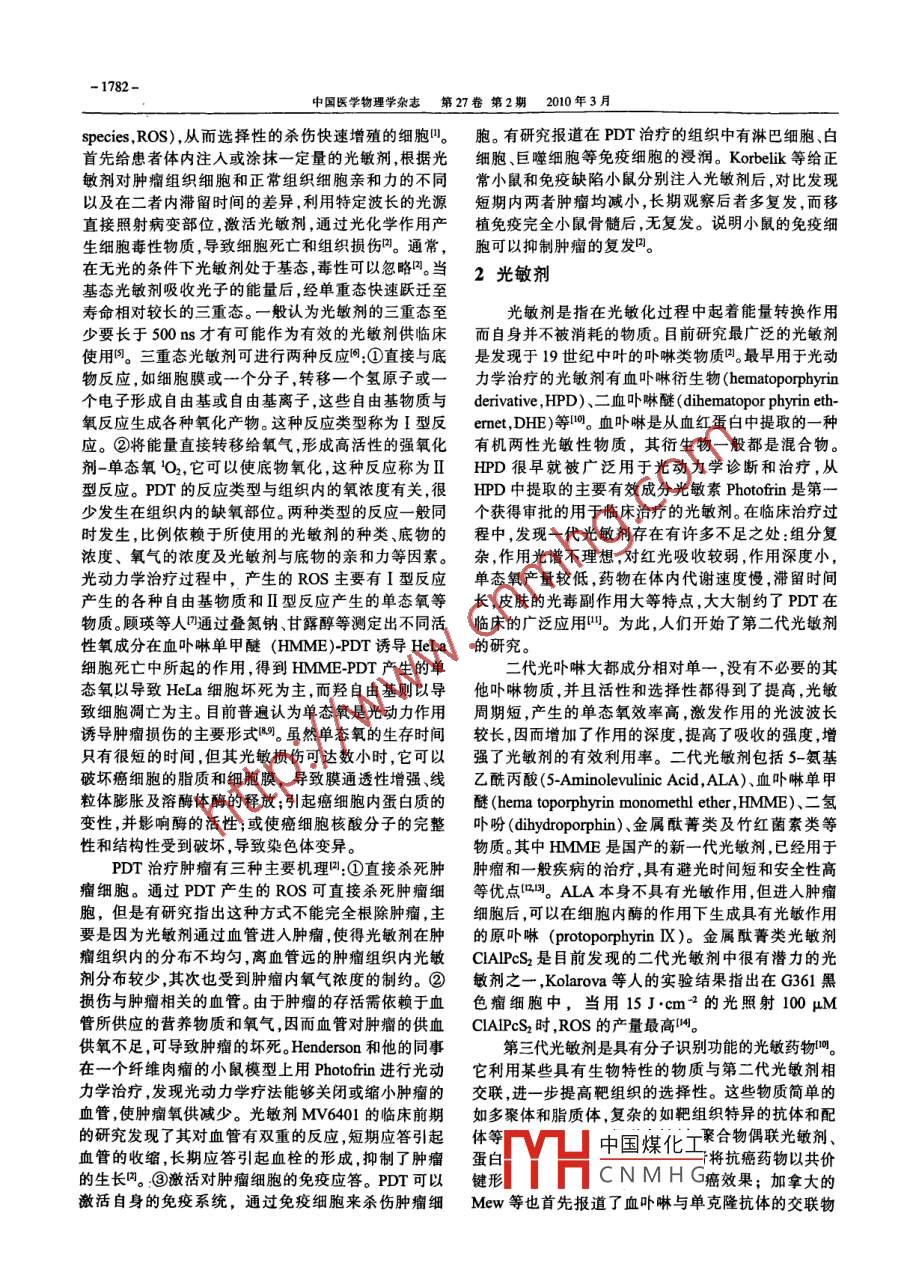 010年3月中國醫(yī)學(xué)物理學(xué)雜志第27卷第2期Chinese Journal of Medlcal PhysicsVoL27, No. 2光動力學(xué)療法和聲動力學(xué)療法李維娜,楊繼慶,劉淵聲,屈學(xué)民,文峻,張敏(第四軍醫(yī)大學(xué)生物醫(yī)學(xué)工程系數(shù)理教研室,陜西西安71002)摘要:目的:通過對腫瘤治療中光動力學(xué)療法和聲動力學(xué)療法的研究現(xiàn)狀及研究進展的綜述,以期對臨床應(yīng)用或?qū)嶒炑芯科鸬揭欢ǖ慕梃b作用。方法:本文具體闡述了光動力學(xué)療法和聲動力學(xué)療法殺傷腫瘤細胞的分子機制以及光敏劑與聲敏劑的分類,介紹了兩種方法在腫瘤方面的應(yīng)用及對新的治療模式的探索,展望了光動力學(xué)療法和聲動力學(xué)療法臨床應(yīng)用的巨大潛力。結(jié)果:光動力學(xué)療法和聲動力學(xué)療法的研究已取得了一定的成果但在組織內(nèi)氧含量新型光敏劑與聲敏劑的開發(fā)、藥物劑量的把握及對聲動力學(xué)療法作用機理的研究方面仍存在問題。結(jié)論:光動力學(xué)療法和聲動力學(xué)療法作為兩種新的腫瘤治療手段,在腫瘤的防治中已展現(xiàn)出良好的應(yīng)用前景但在臨床實際應(yīng)用中光動力學(xué)療法還未普及而聲動力學(xué)療法起步較晚尚處于研究階段,未應(yīng)用于臨床關(guān)鍵詞:光動力學(xué)療法;聲動力學(xué)療法;光敏劑;聲敏劑;腫瘤中圖分類號:R4599文獻標(biāo)識碼:A文章編號:1005-202X(2010)02-1781-04Photodynamic Therapy and Sonodynamic TherapyLI Wei-na, YANG Ji-qing, LIU Yuan sheng, QU Xue-min, WEN Jun, ZHANG Min(Department of Mathematics and Physics, the Forth Military Medical University, Xi'an Shaanxi 710032, China)Abstract: Objective: This paper summarized the research status and progress of photodynamic therapy(PDt) and sonodynamic therapy (SDT), and we hope this can be a useful reference for clinics or research. Methods: In this review we expound theirmolecular mechanisms in detail and classify the photosensitizer and sonosensitizer, indicate their applications for the cancertreatment and summarize their new treating modes. pDt and Sdt have huge potential for cancer treatment. Results: PDt andSDT have achieved a certain results, whereas there are still many problems, such as tissue oxygen content, new photosensitizerand sonosensitizer, drug dosage and mechanisms of SDT. Conclusions: PDT and SDt, which are new methods for treatingcancer, have shown a good application prospect, But PDT has not been universal in clinics and SDT is still in the experimentKey words: photodynamic therapy, sonodynamic therapy; photosensitizer; sonosensitizer; tumor前言中備受關(guān)注的兩種重要手段。與傳統(tǒng)的化療放療、手術(shù)等治療方式相比,它們能夠選擇性的殺死腫瘤細癌癥作為嚴(yán)重威脅人類健康的主要殺手之一,對胞減小對正常組織的危害它的治療越來越多的受到人們的注意。光動力學(xué)療法1光動力學(xué)療法( photodynamic therapy,PDT)和聲動力學(xué)療法(sondymanic therapy,sSDT)目前都已成為腫瘤防治研究早在4000多年前,古埃及人就用白芷和日光來治療白癜風(fēng);古希腈和古印度人也已經(jīng)知道補骨脂的種子和日光可以用來治療牛皮癬和白癜風(fēng)嗎。100多年前,人們就已經(jīng)發(fā)現(xiàn)光與特定的化學(xué)物質(zhì)相互作用收稿日期:200-11-06可以導(dǎo)致細胞的死亡。20世紀(jì)60年代, Lipson和他基金項目:國家自然科學(xué)基金資助項目(No,0804129)的同事們在梅奧診所開始了現(xiàn)代光動力學(xué)療法的臨作者簡介:李維娜(1982-),女,陜西西安人,第四軍醫(yī)大學(xué)數(shù)理教研室助教,從事生物物理研究床應(yīng)中國煤化工通訊作者:楊繼慶(1961-),第四軍醫(yī)大學(xué)口腔醫(yī)院設(shè)備科主任教授一光激活光敏劑,產(chǎn)主要從事生物物理研究。E- maildjiqingy(@ pmmu.edu.en生具YHaCNMHG (reactive oxygen1782中國醫(yī)學(xué)物理學(xué)雜志第27卷第2期2010年3月species,ROs),從而選擇性的殺傷快速增殖的細胞。胞。有研究報道在PDT治療的組織中有淋巴細胞白首先給患者體內(nèi)注入或涂抹一定量的光敏劑,根據(jù)光細胞、巨噬細胞等免疫細胞的浸潤。 Korbelik等給正敏劑對腫瘤組織細胞和正常組織細胞親和力的不同常小鼠和免疫缺陷小鼠分別注入光敏劑后,對比發(fā)現(xiàn)以及在二者內(nèi)滯留時間的差異,利用特定波長的光源短期內(nèi)兩者腫瘤均減小,長期觀察后者多復(fù)發(fā),而移直接照射病變部位,激活光敏劑,通過光化學(xué)作用產(chǎn)植免疫完全小鼠骨髓后,無復(fù)發(fā)。說明小鼠的免疫細生細胞毒性物質(zhì),導(dǎo)致細胞死亡和組織損傷。通常,胞可以抑制腫瘤的復(fù)發(fā)。在無光的條件下光敏劑處于基態(tài),毒性可以忽略。當(dāng)光敏劑基態(tài)光敏劑吸收光子的能量后,經(jīng)單重態(tài)快速躍遷至壽命相對較長的三重態(tài)。一般認(rèn)為光敏劑的三重態(tài)至光敏劑是指在光敏化過程中起著能量轉(zhuǎn)換作用少要長于500ns才有可能作為有效的光敏劑供臨床而自身并不被消耗的物質(zhì)。目前研究最廣泛的光敏劑使用。三重態(tài)光敏劑可進行兩種反應(yīng)間:①直接與底是發(fā)現(xiàn)于19世紀(jì)中葉的卟啉類物質(zhì)。最早用于光動物反應(yīng),如細胞膜或一個分子,轉(zhuǎn)移一個氫原子或一力學(xué)治療的光敏劑有血卟啉衍生物( hematoporphyrin個電子形成自由基或自由基離子,這些自由基物質(zhì)與 derivativ
