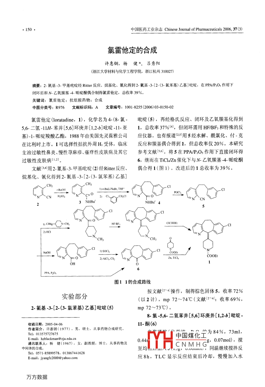 ●150●中國醫(yī)藥工業(yè)雜志Chinese Joumal of Pharmaceuticals 2006, 37 (3)氯雷他定的合成許惠鋼,楊健*, 呂秀陽(浙江大學(xué)材料與化學(xué)工程學(xué)院,浙江杭州310027)摘要: 2- 氟基-3-甲基吡啶經(jīng)Riter反應(yīng)、烷基化、氰化得到2-氰基-3-[2-<(3- 氯苯基)乙基]吡啶,在PPA/P:Os作用下閉環(huán)后和N-乙氧羰基-4-哌啶酮偶合制得氯雷他定,總收率39%。關(guān)鍵詞:氯雷他定:抗組胺藥物:合成中圖分類號: R976文獻(xiàn)標(biāo)識碼: A文章編號: 1001-8255 (2006) 03-0150-02氯雷他定(loratadine,1), 化學(xué)名為4-(8- 氯-吡啶(5),再經(jīng)格氏反應(yīng)、閉環(huán)及乙氧羰基化得到5,6-二氫-11H-苯并[5,6]環(huán)庚并[1,2-b]吡啶-11-亞1,總收率37%[4,但閉環(huán)需用HF/BFs和特殊的反基)-1-哌啶羧酸乙酯,1988 年由美國先靈葆雅公司應(yīng)儀器。也有報道12.5)用5經(jīng)水解、 酰氯化、付-克在比利時上市。1可選擇性拮抗外周H受體,臨床反應(yīng)和羰基偶合得到1,但總收率僅20%。本研究主治過敏性鼻炎、慢性蕁麻疹、瘙癢性皮膚病及其它參考文獻(xiàn)5.0,將5在PPA/P:Os作用下直接閉環(huán)得.過敏性皮膚病1.21。6,繼而在TiCl./Zn催化下與N-乙氧羰基-4-哌啶酮文獻(xiàn)341用2-氰基-3-甲基吡啶(2)經(jīng)Ritter反應(yīng)、偶合得1(圖1)。改進(jìn)后的1總收率為39%。烷基化、氰化得到2-氰基-3-[2-(3-氯苯基)乙基].CH3yC1-BuOH__CIN H-SO4C o2) cla .CH.CI3 NHBu'NHBu' 4Cl1CMg-< N-CH;HFIBFsCIC0OEt .21HC1~CH3CH3CINaOH1)SOC2COOE:COOEtF02)AICI.CS22n.TCL4OHPPA. P:2Os圖11的合成路線按文獻(xiàn)[2~ 41操作,制得棕色固體5,收率72%實驗部分(以2計),mp 72~74C(文獻(xiàn)[2~4: 收率69%,2-氰基-3-[2-(3-氯苯基)乙基]吡啶(5)mp 72~73C)。8-氯-5,6-二氫苯并[5,6]環(huán)庚并[1,2-b]吡啶.收稿日期: 2005-04-0611-酮(6)作者簡介:許惠鋼(1977), 男,碩士,從事藥物合成研究。Tel: 013575727675"中國煤化畢為84%, 73ml,通訊聯(lián)系人:楊健(1967), 女副教授,博士,從事藥物及E-mail: hzblackman@zju.edu.cn0.441CNMHGg, 0.07mol), 攪中間體的合成。至均m人.g, u.uvn,同溫繼續(xù)攪拌反Tel: 0571-85899578, 013867441628E-mail: jyangfz2000@ yaboo.com應(yīng)8h,TLC顯示反應(yīng)結(jié)束后冷卻,慢慢加入水中國醫(yī)藥工業(yè)雜志Chinese Jourmal of Pharmaceuticals 2006, 37(3)●151●(125m1),加濃氨水(280m1)調(diào)至pH 7,用氯仿參考文獻(xiàn):( 100ml, 50m1)萃取,無水硫酸鈉干燥,過濾,1] DuBuske LM. Second-generation antihistamines the risk of濾液蒸干,剩余固體用乙酸乙酯-正己烷-石油醚ventricular arhuthmias[J]. Clin Ther, 1999, 21 (2): 281-28(1 : 1 :3)重結(jié)晶,得淡黃色晶體6(11.7g,77.9%),mp 98~101C (文獻(xiàn)[2] 100~101C)。2] 蘇熠東,吳范宏.8-氣-10,11.二氫-4- 氮雜-5H-二苯并[a,b]_-環(huán)庚酮的合成[J]. 華東理工大學(xué)學(xué)報,2002, 28(6):'HNMR確證結(jié)構(gòu)。665-667.氯雷他定(1)[3] Schumacher DP, Murphy BL, Clark JE, et al. Superacid6(4.2g,17mmol) 和N-乙氧羰基-4-哌啶酮cyclodehydration of ketones in the production of tricyclic(3.1g,0.02mol) 溶于THF (50ml),攪拌加入鋅粉antihistamines[J]. J Org Chem, 1989, 54(9): 2242-2244.(7.5g,0.12mol), 0'C 慢慢加入TiCl4(4. 8ml, .4] Schumacher DP, Park F, Murphy BL, et al. Process for pre-0.04mol),加完后升溫至回流反應(yīng)2.5h,TLC顯示paring piperidylidene dihydro-dibenzo(a,d)-cycloheptenes oraza-derivatives thereof[P]. US: 473 1447, 1988-03-15.反應(yīng)完成后加入水(200m1)和甲苯(100ml),有機(jī)層5] Stampa A, Camps P, Rodriguez G, et al. Process for the prepa-用濃氨水洗滌,無水硫酸鎂干燥,過濾,濾液減壓濃ration of loratadine[P]. US: 6084100,. 2000-07-04. (CA縮,剩余固體用丁醚重結(jié)晶,得白色晶體1(4.6g,2000. 133: 73940)70%),mp 134.5~ 136C(文獻(xiàn):收率68%[s,mp[6] Vllani FJ. Novel aza-dibenzo[a,d]cycloheptene derivatives134~ 136C[51)。'HNMR確證結(jié)構(gòu)。[P]. US: 3326924, 1967-06-20.Synthesis of LoratadineXU Hui-Gang, YANG Jian*, Lu Xiu-Yang(College of Material Science and Chemical Engineering, Zhejiang University, Hangzhou 310027)ABSTRACT: Loratadine was synthesized from 2-cyano 3-methylpyridine via Ritter reaction, alkylation and cyanidationto give 2-cyan-3-[2- (3-chloropheny) ethyl] piperidine, which subjected to cyclization in presence of PPA/P:Os and thencoupling with N-ethoxycarbonyl 4-piperidone. The overall yield was 39%.Key Words: loratadine; antihistamine; synthesisSCIENTIFICSIPI2006年3月27~29日北京湖北大廈U P D A TE 上海醫(yī)藥工業(yè)研究院2006第二屆國際精細(xì)化工技術(shù)培訓(xùn)制藥精細(xì)化工產(chǎn)品的研發(fā)和放大生產(chǎn)如果您向往歐美的市場,向往以最低的成本、最快的時間解決化學(xué)合成和放大工藝中的技術(shù)問題,那么ScientfieUpdate和.上海醫(yī)藥工業(yè)研究院信息中心在國內(nèi)合辦的“制藥精細(xì)化工產(chǎn)品的研發(fā)和放大生產(chǎn)”就是您的必修課程。參加培訓(xùn)的學(xué)員將得到一本500頁的“化學(xué)工藝培訓(xùn)教材”,該教材在海外被譽(yù)為制藥化工的“圣經(jīng)”,在歐美的單獨售價為600美元。培訓(xùn)結(jié)束授予學(xué)員Scientific Update和英國皇宏化學(xué)學(xué)會理理結(jié)l業(yè)證書。參加者每位注冊費(fèi)人民幣5500元,其中包括講義費(fèi)600美金H中國煤化工0元,含午餐和茶點,住宿自理,主辦方可代為預(yù)訂賓館。為保證培訓(xùn)質(zhì)量,本培訓(xùn)C NMH Gt.聯(lián)系人:徐虹,電話/傳真: 021-62897076/ 021-62890581, E-mail: training@ pharmadl.com
