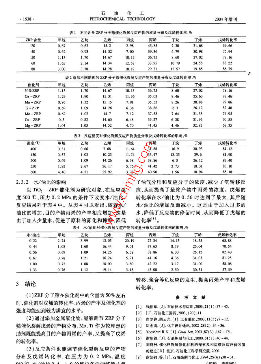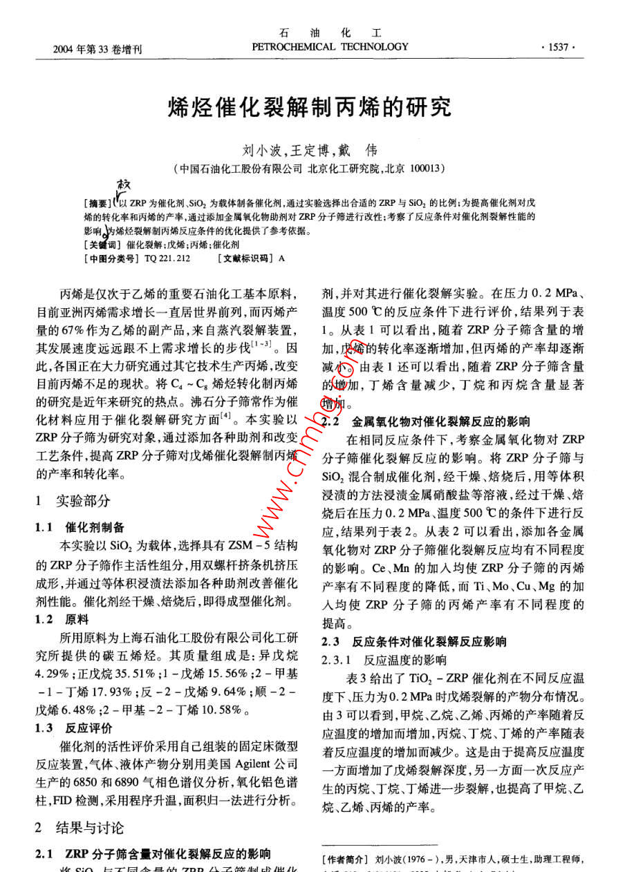 石油化工2004年第33卷增刊PETROCHEMICAL TECHNOLOGY●1537●烯烴催化裂解制丙烯的研究劉小波,王定博,戴偉(中國石油化工股份有限公司北京化工研究院,北京100013)[摘要]以ZRP為催化劑、,siO2 為載體制備催化劑,通過實驗選擇出合適的ZRP與SiO2的比例;為提高催化劑對戊烯的轉(zhuǎn)化率和丙烯的產(chǎn)率,通過添加金屬氧化物助劑對ZRP分子篩進行改性;考察了反應(yīng)條件對催化劑裂解性能的影響為烯烴裂解制丙烯反應(yīng)條件的優(yōu)化提供了參考依據(jù)。[關(guān)鍵詞]催化裂解;戊烯;丙烯;催化劑[中圖分類號] TQ 221.212[文獻標(biāo)識碼] A丙烯是僅次于乙烯的重要石油化工基本原料,劑,并對其進行催化裂解實驗。在壓力0. 2 MPa、目前亞洲丙烯需求增長--直居世界前列,而丙烯產(chǎn)溫度500 C的反應(yīng)條件下進行評價,結(jié)果列于表量的67%作為乙烯的副產(chǎn)品,來自蒸汽裂解裝置,1。從表1可以看出,隨著ZRP分子篩含量的增其發(fā)展速度遠(yuǎn)遠(yuǎn)跟不上需求增長的步伐1-3]。因加,戊烯的轉(zhuǎn)化率逐漸增加,但丙烯的產(chǎn)率卻逐漸此,各國正在大力研究通過其它技術(shù)生產(chǎn)丙烯,改變減小。由表1還可以看出,隨著ZRP分子篩含量目前丙烯不足的現(xiàn)狀。將C.~Cg烯烴轉(zhuǎn)化制丙烯的增加,丁烯含量減少,丁烷和丙烷含量顯著的研究是近年來研究的熱點。沸石分子篩常作為催增加?;牧蠎?yīng)用于催化裂解研究方面(4]。本實驗以2.2金 屬氧化物對催化裂解反應(yīng)的影響ZRP分子篩為研究對象,通過添加各種助劑和改變在相同反應(yīng)條件下,考察金屬氧化物對ZRP工藝條件,提高ZRP分子篩對戊烯催化裂解制丙烯分子篩催化裂解反應(yīng)的影響。將ZRP分子篩與.的產(chǎn)率和轉(zhuǎn)化率。SiO2混合制成催化劑,經(jīng)干燥、焙燒后,用等體積.浸漬的方法浸漬金屬硝酸鹽等溶液,經(jīng)過干燥、焙1實驗部分燒后在壓力0.2MPa、溫度500C的條件下進行反1.1催化劑制備本實驗以SiO2為載體,選擇具有ZSM-5結(jié)構(gòu)應(yīng),結(jié)果列于表2。從表2可以看出,添加各金屬氧化物對ZRP分子篩催化裂解反應(yīng)均有不同程度的ZRP分子篩作主活性組分,用雙螺桿擠條機擠壓的影響。Ce、Mn的加入均使ZRP分子篩的丙烯成形,并通過等體積浸漬法添加各種助劑改善催化產(chǎn)率有不同程度的降低,而Ti、Mo、Cu、Mg的加劑性能。催化劑經(jīng)干燥、焙燒后,即得成型催化劑。人均使ZRP分子篩的丙烯產(chǎn)率有不同程度的1.2 原料提高。所用原料為上海石油化工股份有限公司化工研2.3反應(yīng) 條件對催化裂解反應(yīng)影響究所提供的碳五烯烴。其質(zhì)量組成是:異戊烷2.3.1反應(yīng) 溫度的影響4.29% ;正戊烷35.51%;1 -戊烯15. 56%;2-甲基表3給出了TiO2-ZRP催化劑在不同反應(yīng)溫-1-丁烯17. 93%;反-2-戊烯9.64%;順-2-度下、壓力為0.2 MPa時戊烯裂解的產(chǎn)物分布情況。戊烯6. 48%;2-甲基-2-丁烯10. 58%。由3可以看到,甲烷、乙烷、乙烯、丙烯的產(chǎn)率隨著反1.3 反應(yīng)評價應(yīng)溫度的增加而增加,丙烷、丁烷、丁烯的產(chǎn)率隨表催化劑的活性評價采用自己組裝的固定床微型著反應(yīng)溫度的增加而減少。這是由于提高反應(yīng)溫度反應(yīng)裝置,氣體、液體產(chǎn)物分別用美國Agilent公司-方面增加了戊烯裂解深度,另-方面一次反應(yīng)產(chǎn)生產(chǎn)的6850和6890氣相色譜儀分析,氧化鋁色譜生的丙烷、丁烷、丁烯進- -步裂解,也提高了甲烷、乙柱,FID檢測,采用程序升溫,面積歸- -法進行分析。烷,乙烯丙烯的產(chǎn)率。2結(jié)果 與討論2.1 ZRP 分子篩含量對催化裂解反應(yīng)的影響[作者簡介]劉小波(1976-),男 ,天津市人,碩士生,助理工程師,將SiO2與不同含量的ZRP分子篩制成催化電話010 - 64216131 - 225 ,電郵liuxiaobo@ brici. ac. cn。石油化工●1538●PETROCHEMICAL TECHNOLOGY2004年增刊表1不同含量 ZRP分子篩催化裂解反應(yīng)產(chǎn)物的質(zhì)量分布及戊烯轉(zhuǎn)化率,%_ZRP 含量甲烷乙烷乙丙烷丙烯丁烷丁烯戊婿轉(zhuǎn)化率200.670.6215.245.852.3031. 6839.664014.327.00 .39.366.7930. 98.75.9401.131.7014. 6710.1336.758.6027.0278. 16so01.652.1414.3412. 5833.9510. 7983.22 .303.004.2818.1229.3112.5719. 8586.75表2添加不同助劑的ZRP分子篩催化裂解反應(yīng)產(chǎn)物的質(zhì)量分布及戊烯轉(zhuǎn)化率,%催化劑乙烯戊烯轉(zhuǎn)化率50% ZRP14.6778.16Ce - ZRP1.291. 9015.3111.3635.039.4625.6378.46Mn - ZRP0.961.3215. 157.9135.538.2630.8879. 86Ti- ZRP0.691.0914. 266.38 .38. 866.326.1282.40Mo -ZRP1.0214.77.1237.587.6474.95Cu - ZRP0.50.8214. 606.4839.276.3831. 96.70. 55Mg - ZRP1.04 .1.0314. 524.7041.454.4632. 8268.35表3反應(yīng)溫度對催化裂解反應(yīng)產(chǎn) 物質(zhì)量分布及戊烯轉(zhuǎn)化率的影響,%溫度/C_乙烯4000.310.667. 6811.6431.8816.930.9381.124500.5710. 2511.7433.4713.3529.681.905006. 3838.865.326. 12.s501.932.6726. 175.7641.423.7318.3183. 10004.404.5125.923.7840.901.5618.9485.182.3.2水/ 油比的影響了油氣分壓和反應(yīng)分子的濃度,減少了氫轉(zhuǎn)移反以TiO2-ZRP催化劑為研究對象,在反應(yīng)溫應(yīng),從而提高了最終產(chǎn)物中丙烯的濃度。戊烯的度500 C、壓力0.2 MPa的條件下改變水/油比,轉(zhuǎn)化率在水/油比為0.56時達到了最大,其后隨.反應(yīng)結(jié)果列于表4中。從表4可以看出,隨著水/水/油比的增加反而減小。這是由于加人過多的油比的增加,目的產(chǎn)物丙烯的產(chǎn)率相應(yīng)增加,這是.水,