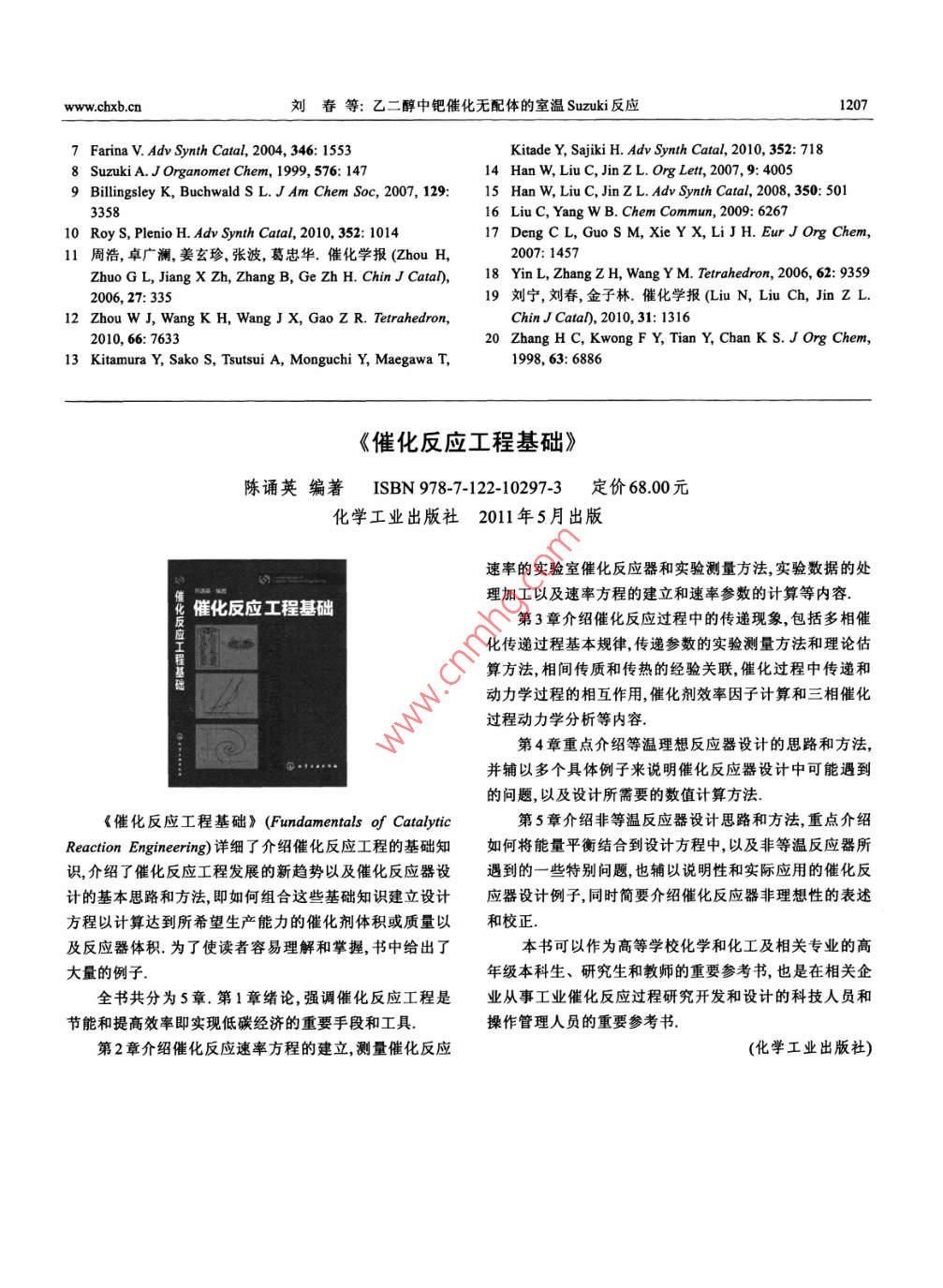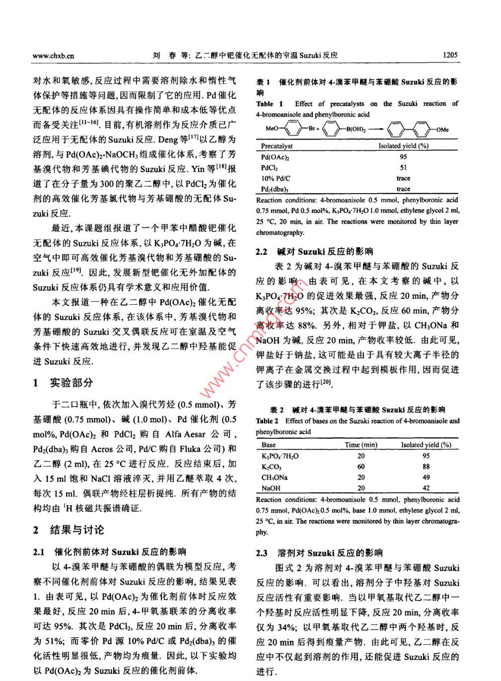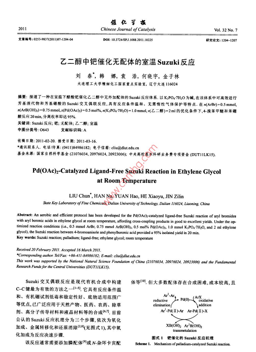 2011Chinese Journal of catalysisVol 32 No. 7文章編號:0253-9837(2011)07-1204-04DoI:10.3724SPJ.1088.2011.10225研究論文:1204120乙二醇中鈀催化無配體的室溫 Suzuki反應(yīng)劉春,韓娜,袁浩,何曉字,金子林大連理工大學(xué)精細化工國家重點實驗室,遼寧大連116024摘要:報道了一種在室溫下醋酸鈀催化乙二醇中無外加配體的 Suzuk反應(yīng)體系.以K3PO47H2O為堿,在該體系中可高效進行芳基溴代物和芳基硼酸的 Suzuki交叉偶聯(lián)反應(yīng),具有反應(yīng)條件溫和、無需惰性氣體保護等特點.在n(ABr)=0.5mmoln(ArB(OH2)=075mmol,x(Pd(OAc)=0.5mol%,n(KPO47H2O)=1.0mmol,v乙二醇)=2ml的優(yōu)化條件下,4-溴苯甲醚和苯硼酸反應(yīng)20min,分離收率即達95%關(guān)鍵詞: Suzuki反應(yīng);鈀;無配體;乙二醇;室溫中圖分類號:0643文獻標(biāo)識碼:A收稿日期:2011-0220.接受日期:201103-16.通訊聯(lián)系人.電話傳真:(041184986182;電子信箱:ciu@dlut.edu.cn基金來源:國家自然科學(xué)基金(21076034,20976024,20923006);中央高?;究蒲袠I(yè)務(wù)費專項資金( DUTIILKI5)Pd(oAc)2-Catalyzed Ligand-Free Suzuki Reaction in Ethylene Glycolt room TemperatureLIU Chun, HAN Na, YUAN Hao, HE Xiaoyu, JiN ZilinState Key Laboratory of Fine Chemicals, Dalian University of Technology, Dalian 116024, Liaoning, ChinaAbstract: An aerobic and efficient protocol has been developed for the pd(OAch-catalyzed ligand-free Suzuki reaction of aryl bromideswith aryl boronic acids in ethylene glycol at room temperature, affording cross-coupling products in good to excellent yields. Under the op-ized reaction conditions (i.e, 0.5 mmol ArBr, 0.75 mmol ArB(OH), 0.5 mol% Pd(OAch, 1.0 mmol K,PO4 7H20, and 2 ml ethyleneglycol), the Suzuki reaction between 4-bromoanisole and phenylboronic acid provided a 95% isolated yield in 20 minKey words: Suzuki reaction; palladium; ligand-free; ethylene glycol; room temperatureReceived 20 February 2011. Accepted 16 March 2011.*Correspondingauthor.Tel/Fax+86-411-84986182:E-mail:cliu@dut.edu.cnThis work was supported by the National Natural Science Foundation of China(21076034, 20976024, 20923006) and the FundamentalResearch Funds for the Central Universities(DUTIILK15)Suz山k交又偶聯(lián)反應(yīng)是現(xiàn)代有機合成中構(gòu)建體等但大多數(shù)配體存在合成困難,成本較高,且CC鍵最為有效的方法之一-.它具有反應(yīng)條件溫和、有機硼試劑低毒和穩(wěn)定性好、底物適用范圍廣ArAreductivePd(0)dativ等優(yōu)點,已廣泛應(yīng)用于天然產(chǎn)物、醫(yī)藥、農(nóng)藥、除草eliminationaddition劑、高分子傳導(dǎo)材料和液晶材料等的合成67.目前ArPd(Ⅱ} Ar Ar-Pd(l)X公認的 Suzuk反應(yīng)機理分為三個步驟,依次為氧化加成、金屬轉(zhuǎn)移化和還原消除(見圖式1),其中氧XB(OH Ar'B(OH)化加成為反應(yīng)決速步驟圖式1鈀催化的Suuk反應(yīng)機理該反應(yīng)通常需要添加膦配體或M雜環(huán)卡賓配Scheme 1. Mechanism of palladium-catalyzed Suzuki reaction.www.chxb.cn劉春等:乙二醇中鈀催化無配體的室溫 Suzuki反應(yīng)1205對水和氧敏感,反應(yīng)過程中需要溶劑除水和惰性氣表1催化劑前體對4溴苯甲醚與苯硼酸S以四k反應(yīng)的影體保護等措施等問題,因而限制了它的應(yīng)用.Pd催化無配體的反應(yīng)體系因具有操作簡單和成本低等優(yōu)點Table 1 Effect of precatalysts on the Suzuki reaction of4-bromoanisole and phenylboronic acid而備受關(guān)注1.目前,有機溶劑作為反應(yīng)介質(zhì)已廣Meo泛應(yīng)用于無配體的Suuk反應(yīng)Deng等以乙醇為溶劑,與PdOA)2NaoH3組成催化體系考察了芳Isolated yield (%基溴代物和芳基碘代物的 Suzuk反應(yīng)Yin等18報PCh210% Pd/Ctrace道了在分子量為300的聚乙二醇中,以PCl2為催化Pd,(dba劑的高效催化芳基氯代物與芳基硼酸的無配體Su- Reaction conditions:4 bromozuki反應(yīng)0.75 mmol, Pd 0.5 mol%, K, PO. 7Hyo 1.0 mmol, ethylene glycol 2 mL,最近,本課題組報道了一個甲苯中醋酸鈀催化25. C, 20 min, in air. The reactions were monitored by thin layerchromatography.無配體的 Suzuki反應(yīng)體系,以K3PO47H2O為堿,在空氣中即可高效催化芳基溴代物和芳基硼酸的Su-22堿對 Suzuki反應(yīng)的影響zuk反應(yīng)19.因此,發(fā)展新型鈀催化無外加配體的表2為堿對4-溴苯甲醚與苯硼酸的 Suzuki反Suuk反應(yīng)體系仍具有學(xué)術(shù)意義和應(yīng)用價值應(yīng)的影響.由表可見,在本文考察的堿中,以本文報道一種在乙二醇中Pd(OAc)2催化無配K3PO47H2O的促進效果最強,反應(yīng)20min,產(chǎn)物分體的 Suzuki反應(yīng)體系,在該體系中,芳基溴代物和離收率達95%;其次是K2CO3,反應(yīng)60min,產(chǎn)物分芳基硼酸的 Suzuki交叉偶聯(lián)反應(yīng)可在室溫及空氣離收率達88%.另外,相對于鉀鹽,以CH3ONa和條件下快速高效地進行,并發(fā)現(xiàn)乙二醇中羥基能促NaOH為堿,反應(yīng)20min,產(chǎn)物收率較低.由此可見,進 Suzuki反應(yīng)鉀鹽好于鈉鹽,這可能是由于具有較大離子半徑的鉀離子在金屬交換過程中起到模板作用,因而促進1實驗部分了該步驟的進行20于二口瓶中,依次加入溴代芳烴(0.5mmol)、芳表2堿對4溴苯甲醚與苯硼酸 Suzuki反應(yīng)的影響基硼酸(0.75mmol)、堿(1.0mo)、Pd催化劑(0.5 Table2 Effect of bases on the Suzuki reaction of4 bromoanisole andmol%, Pd(oAc)2和PdCl2購自 Alfa Aesar公司ronIc aPd2(dba)3購自Acos公司,PdC購自 Fluka公司)和Time(min) lsolated yield (%K,PO.7HO乙二醇(2ml),在25°C進行反應(yīng).反應(yīng)結(jié)束后,加co6088入15m飽和NaCl溶液淬滅,并用乙醚萃取4次, CHIONE每次15ml偶聯(lián)產(chǎn)物經(jīng)柱層析提