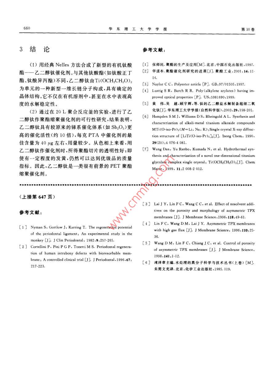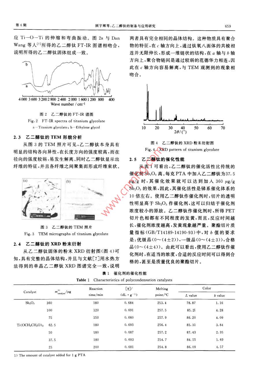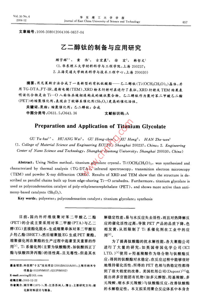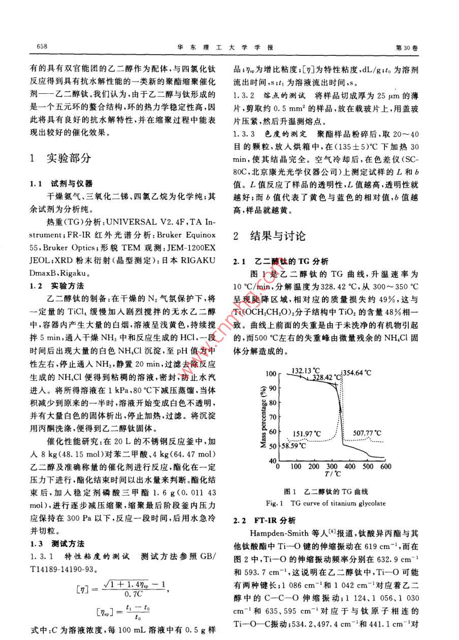 Vol, 30 No 6華東理工大學(xué)學(xué)報(bào)2004-12Journal of East China University of Science and Technology657文章編號(hào):1006-3080(2004)06-0657-04乙二醇鈦的制備與應(yīng)用研究顧宇輝,黃偉,古宏展2,徐宏2,韓哲文1(1.華東理工大學(xué)材料科學(xué)與工程學(xué)院,上海200237;2.上海交通大學(xué)納米科學(xué)與技術(shù)工程中心,上海200030摘要:用尼萊斯方法合成了一類新型的有機(jī)鈦酸酯—乙二醇鈦(Ti(OCH2CH2O)2)晶體,并用TG-DTA、FT-IR、透射電鏡(TEM)、XRD粉末衍射對(duì)其進(jìn)行了表征。XRD衍射及TEM結(jié)果表明該化合物是由TiO八面體共棱相連構(gòu)成的鏈狀聚合物。乙二醇鈦?zhàn)鳛榫蹖?duì)苯二甲酸乙二酯(PET)的縮聚催化劑,表現(xiàn)出了較銻系催化劑(Sb2O3)更高的催化活性關(guān)鍵詞:聚酯;縮聚催化劑;乙二醇鈦;合咸中圖分類號(hào):O631.5;O643.36文獻(xiàn)標(biāo)識(shí)碼:APreparation and Application of Titanium GlycolateGU Yu-hui, HUANG Wei, GU Hong-chen', XU Hong?, HAN Zhe-wen'(1. College of Material Science and Engineering ECUST, Shanghai 200237, China; 2. EngineerinCenter of Nano Science and Technology, Shanghai Jiaotong University, Shanghai 200030, China)Abstract: Using Nelles method, titanium glycolate crystal, Ti(OCH2CH O)2, was synthesized andcharacterized by thermal analysis (TG-DTA), infrared spectroscopy, transmition electron microscopy(TEM)and powder X-ray diffraction (XRD). Results of XRD and TEM show that the structure is decribed as parallel chains built up from edge-sharing Ti-O octahedra. Furthermore, titanium glycolate isused as polycondensation catalyst of poly-ethyleneterephthalate(PET), and shows more active than antimony-based catalysts (Sb, OKey words: polyester polycondensation catalyst; titanium glycolate; synthesis目前,國(guó)內(nèi)外纖維級(jí)聚對(duì)苯二甲酸乙二酯解穩(wěn)定性差,易與水反應(yīng)失去活性,而且對(duì)熱降解反(PET)的合成主要采用對(duì)苯二甲酸(PTA)與乙二應(yīng)的催化活性過高導(dǎo)致PET產(chǎn)品的品質(zhì)下降,色醇(EG)直接酯化脫水生成縮聚單體對(duì)苯二甲酸雙相發(fā)黃,從而限制了Ti系催化劑在工業(yè)中的應(yīng)-羥乙酯(BHET),然后縮聚脫EG生成PET聚酯。用21,縮聚催化劑在聚酯的生產(chǎn)過程中起著至關(guān)重要的作為了提高鈦酸酯的抗水解性能,各大聚酯公司用。T系催化劑(主要為鈦酸酯類如鈦酸四正丁進(jìn)行了大量的研究,如英國(guó)帝國(guó)化學(xué)公司(ICI酯與鈦酸四異丙酯)的活性高,且無毒性但是其水LTD.)使用a羥基羧酸作為絡(luò)合物與鈦酸酯反應(yīng),得到的鈦酸酯對(duì)水穩(wěn)定,在反應(yīng)過程中能夠很好基金項(xiàng)目:科技部“十五”攻關(guān)項(xiàng)目(20BA310A09);上海市納米專地維持催化活性,所得的PET色相與熱穩(wěn)定性都得項(xiàng)基金(0159NMo37,0213NM002)到了很大程度的改善。美國(guó)杜邦公司( Dupont)也E-mailaesting@163.com提出將多官能團(tuán)有機(jī)物(如多元醇胺、羥基羧酸、多收稿日期:2003-12-22作者簡(jiǎn)介:顧宇輝(1975-),男,江蘇蘇州人博士,主要研究方向:催元羧酸、縮水多元羧酸)與鈦酸酯反應(yīng),改善鈦酸酯化新材料設(shè)計(jì)與制備的水解穩(wěn)定性。本文擬采用聚合反應(yīng)體系中本身含華東理工大學(xué)學(xué)報(bào)第30卷有的具有雙官能團(tuán)的乙二醇作為配體,與四氯化鈦品;為增比粘度;[們?yōu)樘匦哉扯?dL/g;to為溶劑反應(yīng)得到具有抗水解性能的一類新的聚酯縮聚催化流出時(shí)間,s;t為溶液流出時(shí)間,s。劑—乙二醇鈦。我們認(rèn)為,由于乙二醇與鈦形成的1.3.2熔點(diǎn)的測(cè)試將樣品切成厚為25m的薄是一個(gè)五元環(huán)的整合結(jié)構(gòu)環(huán)的熱力學(xué)穩(wěn)定性高因片,剪取約0.5mm2的樣品,放在載玻片上,用蓋玻此將具有良好的抗水解特性,并在縮聚過程中能表片壓緊,然后升溫測(cè)熔點(diǎn)現(xiàn)出較好的催化效果1.3.3色度的測(cè)定聚酯樣品粉碎后,取20~40目的顆粒,放入烘箱中,在(135±5)℃下加熱301實(shí)驗(yàn)部分min,使其結(jié)晶完全??諝饫鋮s后,在色差儀(SC80C,北京康光光學(xué)儀器公司)上測(cè)定試樣的L和b1.1試劑與儀器值。L值反應(yīng)了樣品的透明性,L值越高,透明性就干燥氨氣、三氧化二銻、四氯乙烷為化學(xué)純;其越好;而b值代表了黃色與藍(lán)色的相對(duì)值,b值越余試劑為分析純。高,樣品就越黃熱重(TG)分析: UNIVERSAL V2.4F,TAInstrument;FRR紅外光譜分析: bruker equinox2結(jié)果與討論55, Bruker Optics;形貌TEM觀測(cè):JEM-1200EXJEOL;XRD粉末衍射(晶型測(cè)定):日本 RIGAKU2.1乙二醇鈦的TG分析圖1是乙二醇鈦的TG曲線,升溫速率為1.2實(shí)驗(yàn)方法10C/min,分解溫度為328.42°C,從300~350C乙二醇鈦的制備:在干燥的N2氣氛保護(hù)下,將呈現(xiàn)陡降區(qū)域,相對(duì)應(yīng)的質(zhì)量損失約49%,這與定量的TiCl4緩慢加入劇烈攪拌的無水乙二醇Ti(OCH2CH2O)2分子結(jié)構(gòu)中TO2的含量48%相一中,容器內(nèi)產(chǎn)生大量的白煙,溶液呈淺黃色,持續(xù)攪致。曲線上前面的失重是由于未洗凈的有機(jī)物引起拌5min,通入干燥NH3中和反應(yīng)生成的HCl,一段的,而500°左右的失重峰由微量殘余的NHCl固時(shí)間后出現(xiàn)大量的白色NHCl沉淀,至pH值為中體分解造成的性左右,停止通入NH3,靜置20min,過濾去除反應(yīng)生成的NHCl便得到粘稠的溶液,密封,防止水汽100r-13213842t354進(jìn)入。將所得溶液在1kPa,80"C下減壓蒸餾,當(dāng)體積