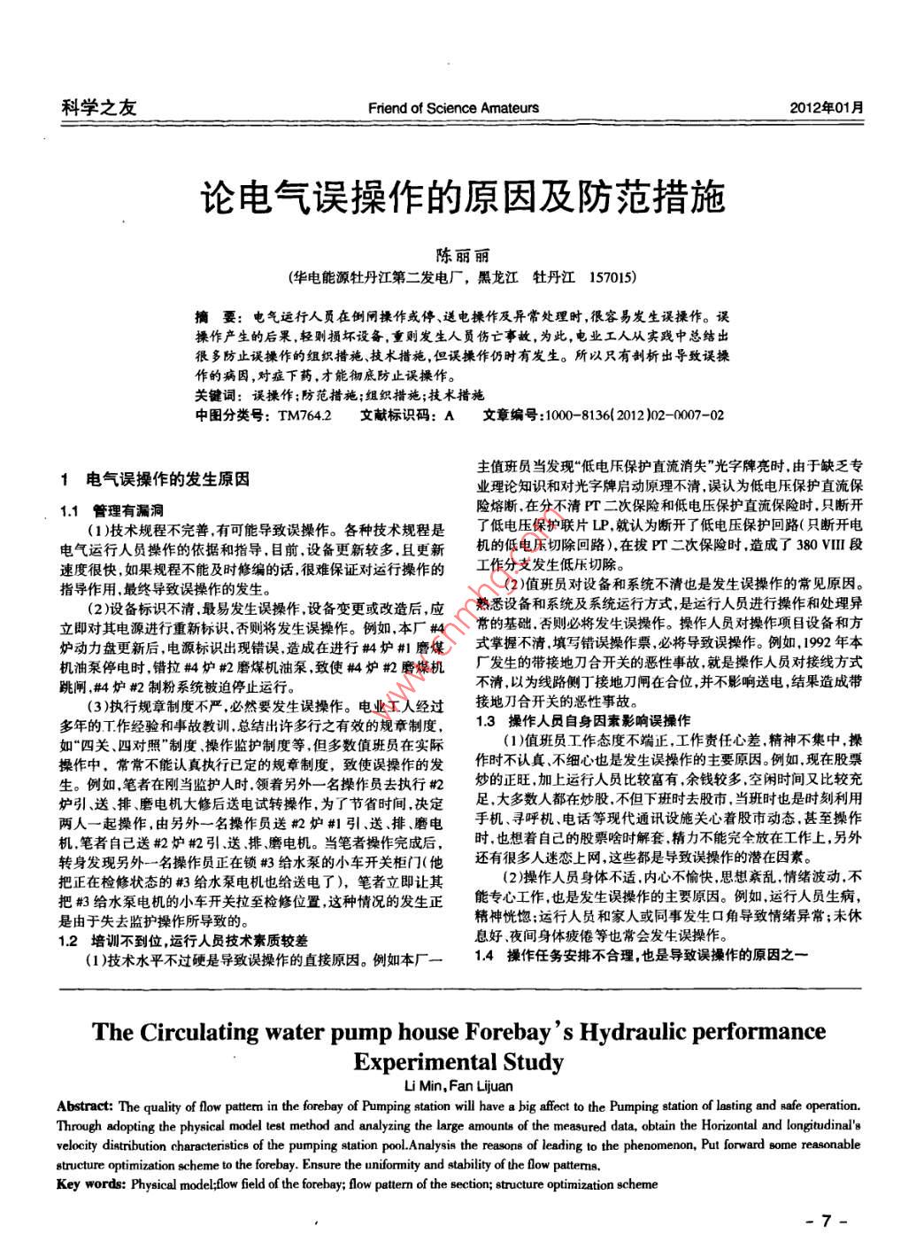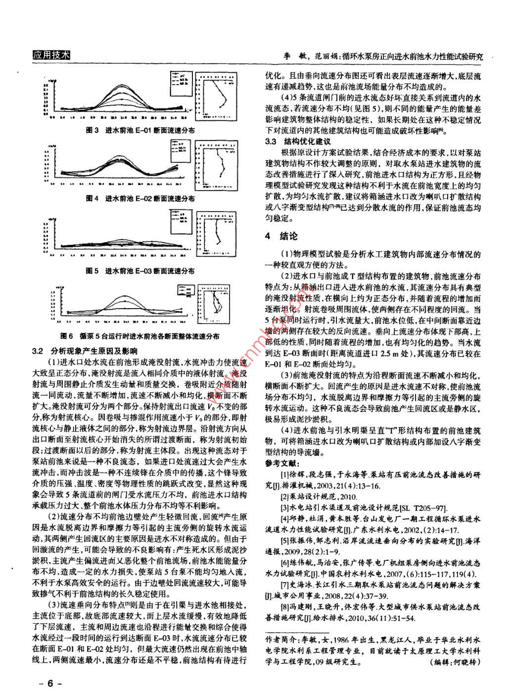 科學之友Friend of Science Amateurs2012年01月循環(huán)水泵房正向進水前池水力性能試驗研究李敏,范麗娟(太原理工大學水利科學與工程學院,山西太原030024)摘要:泵站前池內的流態(tài)優(yōu)劣,對泵站的持久安全運行有極大的影響。經采用物理模型試驗的方法,通過分析大量的實測資料,得出前池流場橫向、縱向的流速分布特點,分析現(xiàn)象產生因素,提出合理的前池結構優(yōu)化方案,以保證其間水流流態(tài)的均勻性和穩(wěn)定性。關鍵詞:物理模型;前池流場;斷面流態(tài);結構優(yōu)化中圖分類號: TV131.61文獻標識碼: A文章編號: 000-8136( 2012 )02- -00-030本項試驗綜合國內外文獻",主要考慮以下相似條件:1引言重力相似(F,數(shù)相似)火力發(fā)電中,循環(huán)水泵房進水前池的水力性能是否穩(wěn)定對(F),=(=)=1循環(huán)水泵的安全和高效運行都至關重要,對循環(huán)水泵房的土建合理投資也有指導作用"。泵站設計規(guī)范1規(guī)定,泵站前池布置應其流量和流速比尺分別為:滿足水流順暢流速均勻、池內不得產生渦流的要求。如果進水流速比尺:V=L" =3.162前池的形狀.尺寸設計不合理.容易在池內形成不良流場。前池是流量比尺:Q=L, =316.2泵站的進水建筑物P,將引水管道中的來水均勻地分配給各流道;當水輪機引用流最迅速改變時.前池的容積叮起一定的調節(jié)阻力相似:n=L," =1.46作用.因此,引水管道與泵房進水前池的銜接,應盡量保證泵房2.2測點布置進水前池有良好的流態(tài),保證水流能均勻平穩(wěn)地進人吸水室,避為r便于分析水流特性,在進水前池內設有3個測速斷面,免回流和渦流的產生。本文研究將通過物理模型對循環(huán)水泵房每個斷面設5條垂線。每條測速垂線都從底部0.2 m起測,間距1m進水前池進行系統(tǒng)的水力特性試驗研究,并結合試驗數(shù)據(jù)分析布置測點(見圖1和圖2)。水面流場形態(tài):采用直接觀察和拍照其水力性能,優(yōu)化原設計方案,提出合理的改進措施.保證循環(huán)的方法。水泵的安全運行。本文按重力相似準則設計正態(tài)物理模型,針對T.程布置的特點,即進水前池與引水明渠呈直"T形布置,研究該結構下前池流場及流速分布情況。試驗設計了循環(huán)水泵全部開啟的情況,通過對水流流態(tài)、典型斷面流速分布、水位的觀測,分析了各斷面橫向縱向水流的分布特點同時研究其產生機理及影響。圈1流速測點垂向分布圖2流速測點橫向分布2研究方法2.3試驗器材(1 )流速:采用南京水利水電科學研究院研制的OA型旋漿2.1 物理模型設計式光纖流速傳感器、接專用采集系統(tǒng)測量。本試驗基于某實際工程設計模型,根據(jù)研究目的和要求,試(2 )前池水位:使用水尺進行測量。驗對前池流場進行了主要探測.進水前池結構:長(沿水流方向)x(3)表面流態(tài)觀察:采用示蹤觀察,并拍照記錄,同時結合其寬=30.0 mx 26.8 m。自流引水管:采用鋼筋混凝土箱涵,單根裁他觀測結果- -同分析。面凈空尺寸bxh=3.5 mx 3.5 m,設計流速為2.23 m/s,進水前池2.4試驗組次與引水明渠呈直"T"形布置。.按照試驗要求選取了- -種典型的情況進行試驗數(shù)據(jù)的采集,為保證模型試驗的精度.試驗采用正態(tài)模型模型全部采用根據(jù)循泵臺數(shù)及特點將試驗單泵流量控制為5.87 m/s,此時前池優(yōu)質有機玻璃加T:制作,一般有機玻璃板的糙率在0.007-0.009水深控制為60 cm左右,循泵5臺全部開啟。之間,模型用優(yōu)質有機玻璃制作能滿足糙率相似要求.從而滿足3數(shù)據(jù)分析阻力相似。幾何比尺L,=10.模型試驗占地面積約為32 mx8m。根據(jù)模型試驗相似原理,要保證不同尺度(λL≠1)的兩個流3.1 前池流速分布體運動的完全相似幾乎是不可能的,通常是根據(jù)原型流體運動進水前池各測速斷面位置和編號見圖1和圖2。本試驗采用的特性,確定出主要影響的作用力.選擇合適的相似準則進行模南京水利水電科學研究院研制的0A型旋漿式光纖流速傳感器、擬。一般情況下.泵房進水流道水工模型試驗是在幾何相似的前接專用采集系統(tǒng)測量前池各測點流速。試驗測得大量數(shù)據(jù),并對提下,依據(jù)F,相似準則設計和運行模型.有條件地放松對雷諾數(shù)數(shù)據(jù)進行了處理分析。圖3-圖6分別給出了5臺水泵運行時,各相似條件的要求。斷面水流橫向流速分布和垂向流速分布情況。一5-應用技術李敏, 范麗娟:循環(huán)水泵房正向進水前池水力性能試驗研究優(yōu)化。且由垂向流速分布圖還可看出表層流速逐漸增大,底層流速有遞減趨勢,這也是前池流場能量分布不均造成的。(4)5條流道閘門前的進水流態(tài)好壞直接關系到流道內的水流流態(tài),若流速分布不均(見圖5),則不同的能量產生的能量差影響建筑物整體結構的穩(wěn)定性,如果長期處在這種不穩(wěn)定情況圖3進水前池E-01斷面流速分布下對流道內的其他建筑結構也可能造成破壞性影響啊。3.3 結構優(yōu)化建議根據(jù)原設計方案試驗結果.結合經濟成本的要求,以對泵站建筑物結構不作較大調整的原則,對取水泵站進水建筑物的流態(tài)改善措施進行了深人研究.前池進水口結構為正方形,且經物理模型試驗研究發(fā)現(xiàn)這種結構不利于水流在前池寬度上的均勻圈4進水前池E -02斷面流速分布擴散,為均勻水流擴散,建議將箱涵進水口改為喇叭口擴散結構或八字漸變型結構調已達到