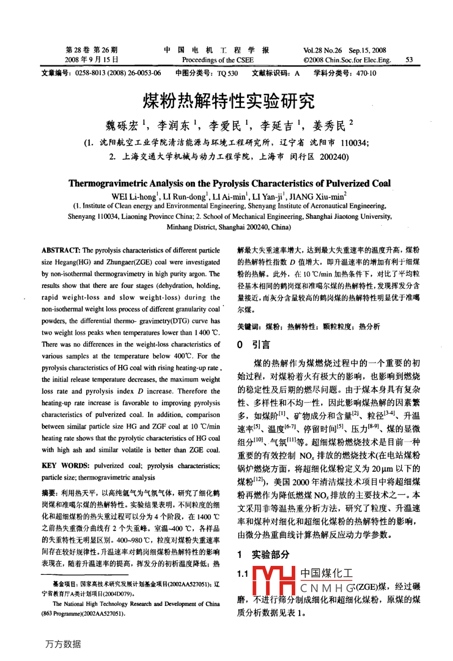 第28卷第26中國(guó)電機(jī)工程學(xué)報(bào)vL28No.26Sep.15,20082008年9月15日Proceedings of the CSEE@2008 Chin. Soc. for Elec Eng. 53文章編號(hào):0258-8013(2008)260053-06中圖分類號(hào):TQ530文獻(xiàn)標(biāo)識(shí)碼:A學(xué)科分類號(hào):470-10煤粉熱解特性實(shí)驗(yàn)硏究魏礫宏!,李潤(rùn)東,李愛民1,李延吉1,姜秀民2(1.沈陽航空工業(yè)學(xué)院清潔能源與環(huán)境工程研究所,遼寧省沈陽市110034;2.上海交通大學(xué)機(jī)械與動(dòng)力工程學(xué)院,上海市閔行區(qū)200240Thermogravimetric Analysis on the Pyrolysis Characteristics of Pulverized CoalWEI Li-hong, LI Run-dong', LI Ai-min, LI Yan-ji, JIANG Xiu-min(1. Institute of Clean energy and Environmental Engineering, Shenyang Institute of Aeronautical Engineering,Shenyang 110034, Liaoning Province China; 2. School of Mechanical Engineering, Shanghai Jiaotong UniversityMinhang District, Shanghai 200240, China)ABSTRACT: The pyrolysis characteristics of different particle解最大失重速率增大,達(dá)到最大失重速率的溫度升高,煤粉size Hegang(HG) and Zhungaer(zGE) coal were investigated的熱解特性指數(shù)D值增大,即升溫速率的增加有利于細(xì)煤by non-isothermal thermogravimetry in high purity argon.The粉的熱解。此外,在10℃/min加熱條件下,對(duì)比了平均粒results show that there are four stages( dehydration,, holding,徑基木相同的鶴崗煤和準(zhǔn)噶爾煤的熱解特性,發(fā)現(xiàn)揮發(fā)分含rapid weight-loss and slow weight-loss)during the量接近,而灰分含量較高的鶴崗煤的熱解特性明顯優(yōu)于準(zhǔn)噶non-isothermal weight loss process of different granularity coal /Khpowders, the differential thermo- gravimetry (DTG)curve has關(guān)鍵詞:煤粉;熱解特性;顆粒粒度;熱分析two weight loss peaks when temperatures lower than 1 400 CThere was no differences in the weight-loss characteristics of 0 3Ivarious samples at the temperature below 400C. For thepyrolysis characteristics of HG coal with rising heating-up rate煤的熱解作為煤燃燒過程中的一個(gè)重要的初the initial release temperature decreases, the maximum weight始過程,對(duì)煤粉著火有極大的影響,也影響到燃燒loss rate and pyrolysis index D increase. Therefore the的穩(wěn)定性及后期的燃盡問題。由于煤本身具有復(fù)雜heating-up rate increase is favorable to improving pyrolysis性、多樣性和不均一性,因此影響煤熱解的因素繁characteristics of pulverized coal. In addition, comparison多,如煤階田、礦物成分和含量、粒徑4、升溫between similar particle size HG and ZGF coal at 10 T/min速*、溫度67、停留時(shí)間、壓力9、煤的顯微ating rate shows that the pyrolytic characterstics o組分⑩、氣氛等.超細(xì)煤粉燃燒技術(shù)是目前一種with high ash and similar volatile is better than ZGE coal重要的有效控制NO排放的燃燒技術(shù)(在電站煤粉KEY WORDS: pulverized coal. pyrolysis characteristics;鍋爐燃燒方面,將超細(xì)化煤粉定義為20μm以下的particle size; thermogravimetric analysis煤粉12),美國(guó)2000年清潔煤技術(shù)項(xiàng)目中將超細(xì)煤摘要:利用熱天平,以商純氬氣為氣氛氣體,研究了細(xì)化鶴粉再燃作為降低燃煤NO2排放的主要技術(shù)之一。本崗煤和準(zhǔn)喝爾媒的熱解特性。實(shí)驗(yàn)結(jié)果表明,不同粒度的細(xì)文采用非等溫?zé)嶂胤治龇椒?研究了粒度、升溫速化和超細(xì)煤粉的熱失重過程可以分為4個(gè)階段,在1400℃率和煤種對(duì)細(xì)化和超細(xì)化煤粉的熱解特性的影響,之前熱失重微分曲線有2個(gè)失重峰。室溫400℃,各樣品的失重特性無明顯區(qū)別。400~980℃,粒度對(duì)煤粉失重速率由微分熱重曲線計(jì)算熱解反應(yīng)動(dòng)力學(xué)參數(shù)。間存在較好規(guī)律性升溫速率對(duì)鶴崗細(xì)煤粉熱解特性的影響1實(shí)驗(yàn)部分表現(xiàn)在,隨著升溫速率的提高,揮發(fā)分的初析溫度降低;熱11凵中國(guó)煤化工基金項(xiàng)目:國(guó)家高技術(shù)研究發(fā)展計(jì)劃基金項(xiàng)目(200AA527051);遼寧省教育廳A類計(jì)劃項(xiàng)日(2004D079)CNMHG(ZGE)煤,經(jīng)過碾The National High Technology Research and development of Chi磨,不進(jìn)行篩分制成細(xì)化和超細(xì)化煤粉,原煤的煤863 pros質(zhì)分析數(shù)據(jù)見表1。中國(guó)電機(jī)工程學(xué)報(bào)第28卷表1鶴崗煤、準(zhǔn)噶爾煤的工業(yè)分析與元素分析中大分子網(wǎng)絡(luò)結(jié)構(gòu)發(fā)生斷鏈(350~1150℃)和半焦Tab. 1 Ultimate and proximate analysis of testingcoal samples縮聚成焦炭(1150℃以上)由圖1和2的熱解曲線還可以看出,4種粒徑煤種元素分析/%工業(yè)分析/%的鶴崗煤粉在400℃之前的熱解特性曲線無明顯HG6825467808260487310420853253448151805區(qū)別,在400500℃區(qū)間有一快速失重區(qū)間,相同ZGE72543.3361.2181016439013.8633.3349.17364溫度下的失重速率隨粒徑的增大而增大,其順序注:根據(jù)a(C)+a(H3)+a(Nd)+a(O)+S)+以A)+a(Md)=100%計(jì)算得到為:562μm>23.3m>35.9μm>7,0μm。在5001.2熱重分析980℃區(qū)間,失重速率與粒徑的關(guān)系與前者相反,本實(shí)驗(yàn)是在囗本島津公司的60H型熱重差熱相同溫度下的失重速率隨粒徑的增大而減小,其順同時(shí)分析儀上進(jìn)行。采用5、10、20、30℃/min升序?yàn)?7.0mx359m>233mx562m。980℃溫速率,用氣(99作為氣氛氣體,氣體流量以后,70、359和562m粒徑的煤樣也較好規(guī)律:50 mU/min。試樣用量約8mg,用高純氬99在980-1200℃之間,同一溫度下的失重速率隨著氣吹掃05h以除去爐體內(nèi)
