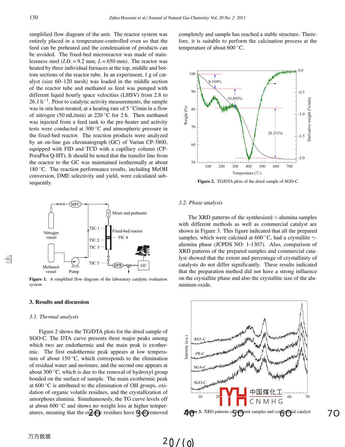 Available online at www.sciencedirect.com| Joumal ofScienceDirect7I Natural GasChemistryEL SEVIERJournal of Natural Gas Chemistry 20(201 1)128-134www.elsevier.com/locate/jngcSynthesis of nanocrystalline ry-Al2O3 by sol-gel and precipitationmethods for methanol dehydration to dimethyl etherZahra Hosseinil,Majid Taghizadeh1*,F(xiàn)ereydoon Yaripour?2I. Chemical Engineering Department, Babol University of Technology P. 0. Box 484, 4714871167 Babol, Iran;2. Catalyst Research Group, Petrochemical Research and Technology Company NPC, Tehran, Iran[ Manuscript received October 20, 2010; revised December 5, 2010 ]JoadAbstractThe capability of sol-gel and conventional precipitation techniques for the synthesis of nanocrystalline y-alumina was investigated. Thesecatalysts were used for vapor-phase dehydration of methanol to dimethyl ether in a fixed-bed reactor under the same operating conditions(T= 300°C, P= 1 bar, LHSV=2.8, 11.7, 26.1 h-'y nd charagteriped by meats of N2 adsorption-desorption, NHg-TPD, XRD, TGA andSEM techniques. According to the experimental reqlts, the caplysts prelsing sol-gel method in non-aqueous medium showed betterperformance compared with those prepared by other mhethods.Key words7~Al2O3; sol-gel; precipitation; methanol dehyd rationg dimnethylMurd Cs1. Introductionlays,vot phosphates such as aluminium phosphatesVI VIiwywT mentoned. Meanwhile, y-alumina is a very efecivceDemethyl ether (DME) has potential appitcations as acatalyst for this reaction, and it is believed that most of the acidchemical building block. In addition, since the characteris-sites on this catalyst are of the Lewis type. However, there istics of DME are similar to those of liquefied petroleum gasno consensus in the scientific community as to whether the(LPG) and given its high heating value, it has been speculatedLewis sites can be converted to Bronsted sites in the pres-that DME could be used in large scale power production, inence of water [8- 10]. Special interest for catalysis applica-home heating, in replacement of LPG for automobiles, and astions of nanoparticles is due to their unique properties. Ra diesel fuel substitute or combustion supplement. In thesecently, many different methods have been investigated in (applications, the specification for the purity of DME has beender to synthesize mesoporous nanocrystalline 7-Al2O3 withreported to be lower than 99 wt% requirement for curent uses higher specific surface area [11- 15]. Chemical routes for the(DME fuel grade is 88.9%)[1-5].production of these materials include sol-gel method, and con-There are three routes for DME production. Nowadays,trolled precipitation of boehmite obtained from alkoxides andthe DME world's production is performed with one of thealuminum salts [16,17]. The advantage of the sol gel methodfollowing routes: methanol dehydration, methanol/DME CO-includes the ability of maintaining a high degree of purity,production and direct synthesis [6,7].changing physical characteristics such as pore size distribu-Several catalysts having activity for the catalytic conver-tion and pore volume, and preparing samples at low temper-atures. The main factors which influence the structural prop-dehydration catalysts. It is generally accepted that acid cata-erties of the final r-alumina samples in the sol-gel techniquelysts are the best materials for the dehydration of methanol to are the hydrolysis ratio (moles of water per mole of aluminumdimethyl ether and that Bronsted or Lewis acids are capableprecursor), acidity of the precursor solution and the molarof performing this reaction. As examples of known acidic de-ratio of template to aluminum precursor. Combining a highhydration catalysts alumina, e.g. y-alumina, silica, alumina-porosity with high surface area improves the overall physicalsilica mixtures, crystalline aluminosilicates, crystalline zeo-properties and consequently increases the catalyst life [11,18].“Corresponding author. Tel: +98-111-3234204; Fax: +98-111-3234201; E-mail: m. taghizadehfr@y中國煤化工This work was financially supprted by Iranian Nanotechnology Initiative Council.YHCNM HGCopyrightO201 1, Dalian Institute of Chemical Pnese Academy of Sciences. All rights reserved.doi: 10.1016/S 10039953(10)60172-7Journal of Natural Gas Chemistry Vol. 20 No.2 2011129In this work, the effects of different preparation meth-ful pH adjustment to 7.5. Thetemperature was maintaods on catalytic properties and physical structure of nanocrys- 60 °C during precipitation step. The precipitate was digestedtalline 7/-Al2O3 as a solid-acid catalyst have been investigated. at 60 °C for 3 h. Then, the precipitate was filtered and dried atThe solid-acid catalyst has been tested in a fixed-bed reactor120。C for 24 h. The final solid was then calcined at 600 °Cand characterized by TGA, N2 adsorption- desorption, XRD,for 6 h at a heating rate of 2 °C/min and named as PR-C.SEM and NH3-TPD.2.2.4. Commercial reference sample2. ExperimentalFor comparison, a commercially available 7-alumina2.1. Materialssample was used as a reference catalyst. This sample wassupplied from BASF company and named REF-C.Aluminium iso-propoxide (AIP, 99 wt%), 2-propanol(IPA), propionic acid (AP), nitric acid (65 wt%), aluminum2.3. Characterizationnitrate nonahydrate (ANN, 98.5 wt%) and potassium bicar-bonate purchased from Merck Company were used as startingThe surface area, pore size distribution and pore vol-chemicals in different methods.ume were determined using a nitrogen adsorption-desorptionisotherm at the liquid-nitrogen temperature (- 196°C) by a2.2. Catalyst preparationNOVA 2200 instrument (Quantachrome, Boynton Beach, FL).Prior to the adsorption-desorption measurements, all the sam-2.2.1. Sol-gel method in a non-aqueous mediumples were degassed at 200 °C in a N2 flow for 16 h to removethe moisture and other impurities.Aluminum iso-propoxide, 2-propanol and propionic acidThe X-ray diffraction (XRD) patterns of all the cal-were used as aluminum pre