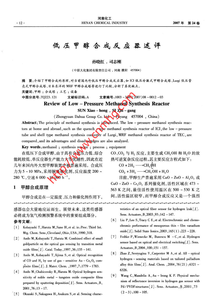 河南化工●12.HENAN CHEMICAL INDUSTRY2007年第24卷低壓甲醇合成反應(yīng)器述評(píng)孫曉紅,司志剛(中原大化集團(tuán)有限責(zé)任公司,河南濮陽(yáng)457004)摘要:介紹了 甲醇合成的原理,對(duì)當(dāng)前國(guó)內(nèi)外低壓甲醇合成反應(yīng)器,如ICI低壓冷激式甲醇合成塔、Lurgi低壓管殼式甲醇合成塔、日本東洋的MRF甲醇合成塔等進(jìn)行了比較,分析了其優(yōu)缺點(diǎn)。關(guān)鍵詞:甲醇;合成塔;工藝;設(shè)備,中圖分類號(hào):TQ223.121文獻(xiàn)標(biāo)識(shí)碼:A文章編號(hào):1003 - 3467(2007 )08 -0012 -03Review of Low - Pressure Methanol Synthesis ReactorSUNXiao-hong,SIZhi-gang(Zhongyuan Dahua Group Co. Ltd. , Puyang 457004 ,China)Abstract :The principle of methanol synthesis is introduced. The low - pressure methanol synthesis reac-tors at home and abroad , such as the quench - type methanol synthesis reactor of ICI,the low - pressuretube and shell type methanol synthesis converter of Lurgi , MRF methanol synthesis reactor of TEC, arecompared , and its advantages and disadvantages are also analyzed.Key words : methanol ; synthesis reactor ; process ; equipment在低壓下合成甲醇,由于具有合成壓力低、綜合CO、CO2 與H2反應(yīng),主要生成CH2OH和H2O的放能耗較低、單反應(yīng)器生產(chǎn)能力大等優(yōu)越性,因此在近熱可逆復(fù)雜反應(yīng)過(guò)程,其主要反應(yīng)方程式如下:幾年來(lái)國(guó)內(nèi)外大型甲醇裝置中被普遍采用。合成壓CO +2H2一→CH,0H力為5~ 10 MPa,采用銅基催化劑,反應(yīng)溫度200 ~CO2 +3H2一→CH3OH + H20280 C ,空速6000~10 000 h-'。目前,甲醇生產(chǎn)普遍采用CuO-ZnO-Al203或CuO - ZnO - Cr2O3系列催化劑,活性區(qū)域在473 ~1甲醇合成原理563 K之間,最佳活性使用溫區(qū)在500 ~530 K之甲醇合成是在- -定溫度、壓力和催化劑作用下,間?;钚詼貐^(qū)較窄,而甲醇合成反應(yīng)又是一個(gè)強(qiáng)烈感器也會(huì)大量地應(yīng)運(yùn)而生。展望未來(lái),這類傳感器teristics of an optical fiber sensor for hydrogen leak[J].必將成為氫氣檢測(cè)預(yù)警系統(tǒng)中的重要組成部分。Sens. Actuators, B ,2003 ,93:142 - 147.參考文獻(xiàn):6] Liu P,Ilee S,Tracy C E,et al. FElectrochromic and chemo-1 ] Kobayashi T, Haruta M , Sano H,et al. in:Proc. Third Int.chromic prformance of mesoporous thin - flm vanadiumoxide[J]. Solid State lonics ,2003 ,165(1):223 -228.Mtg. Chem. Sens ,Cleveland ,0hio, USA ,1990 ,318.Feduke P, Wienecke M, Bunescu M - C,et al. Hydrogen[2] Ando M,Kobayashi T, Haruta M. Combined efet of smallsensor based on optical and eletrical switching[J]. Sens.goldparticle on the optical gas sensing by transition metalActuators ,B,2004 ,100:151 -157.oxide films[J]. Catal. Today ,1997 ,36:135 - 141. .[3] Ando M, Kobayashi T, ljia s, et al. Opical recogition[ 8] Zhao z, Sevryugina Y , Carpenter M A, et al. All - opticalhydrogen - sensing materials based on tailored palladiumof Co and H2 by use of gas - sensitive Au - Co3O4 com-alloy thin films[ J]. Anal. Chem. ,2004 ,76(21):6321 -posite films[J]. J. Mater. Chem. ,1997,7:1779 - 1783.6326.[4] Ando M,Chabicovsky R,Haruta M. Optical hydrogen sen-9] Wang C, Mandelis A,Au - leong K P. Physical mecha-sitivity of noble metal - tungsten oxide composile flmsnism of rflctance inversion in hydrogen gas sensor withprepared by sutring deposition[J]. Sens. Actuators,B,Pd/PVDFstructures{ J]. Sens. Actuators,B ,2001 ,732001 ,76:13-17.(2 -3):100- 105.[5] Okazaki s, Nakagawa H, Asakura S,et al. Sensing charac-河南化工HENAN CHEMICAL INDUSTRY2007年第24 卷2.5丹麥 Nissui - Topsoe的工藝中壓蒸汽人網(wǎng)。托普索公司為適應(yīng)大型甲醇裝置的需要,近年來(lái)開發(fā)了三塔絕熱徑向合成塔串聯(lián)的合成裝置,塔.間用水移熱,在60萬(wàn)Va以下的裝置中可以單塔運(yùn)自行,并且入塔新鮮氣先經(jīng)過(guò)保護(hù)催化劑,確保新鮮氣徹底脫硫脫砷,然后與循環(huán)氣混合后進(jìn)入合成塔。由于該公司選擇高活性高選擇性、高操作彈性的催新鮮包,化劑( MK - 121),可在單塔體積不大的情況下,裝填30 ~40 m'催化劑即可生產(chǎn)50~60萬(wàn)Va甲醇。一甲醇其合成回路如圖1所示。與其他工藝相比,托普索工藝中合成塔的進(jìn)出1.壓縮機(jī)2.換熱器3.硫保護(hù)器4.反應(yīng)器5.冷卻器6.閃蒸罐7.水泵 8.汽包 9. 分離器10. 排污罐口溫差較小,僅為32C,塔的單層轉(zhuǎn)化率高,可達(dá)到圈1托普索低壓 甲醇合成的工藝流程圖15% ,其他工藝的單層轉(zhuǎn)化率最高僅為7% ~ 8%;Linda公司的低壓均溫型甲醇合成反應(yīng)塔,采用該工藝的催化劑裝填量相對(duì)較少,同等條件下僅用螺旋水冷管,鍋爐水進(jìn)人管內(nèi),移走管外催化劑的反29.9 t,而其他工藝需要60 t左右。但該工藝為了應(yīng)熱。就其結(jié)構(gòu)來(lái)講,比Lurgi直型冷管較好的解確保脫硫,新鮮氣與循環(huán)氣只做到了缸外混合,與缸決熱應(yīng)力問題,運(yùn)行更為可靠,但設(shè)備加工難度也進(jìn)內(nèi)混合相比,壓縮時(shí)高壓段與循環(huán)段匹配有一定的- -步增加。難度。綜上所述,幾種低壓甲醇合成反應(yīng)器的對(duì)比見2.6 Linda 公司的甲醇合成反應(yīng)器表1。表1低壓甲醇合成反應(yīng)器的比較類型ICI冷激Lurgi 管殼.MRFTopsoeIMCLinda催化劑層溫差大小催化劑裝填系數(shù)>705355040結(jié)構(gòu)可靠性好一般副產(chǎn)蒸汽中壓或高壓中壓低壓?jiǎn)螌愚D(zhuǎn)化率7%8%10%15%9%設(shè)備加工難度易難催化劑層溫結(jié)構(gòu)簡(jiǎn)單,易差小,合成效合 成阻力小,.催化劑活性塔體相對(duì)較較好的消 除熱優(y