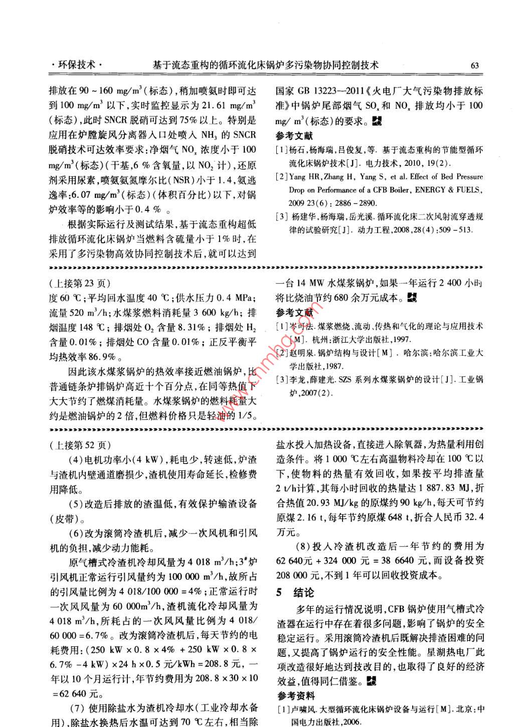 工業(yè)鍋爐2013年第5期(總第141期)章編號(hào):10048774(2013)05002004燃水煤漿熱水鍋爐的設(shè)計(jì)張方春,史向華,王麗(山東泰安山鍋集團(tuán)有限公司,山東泰安271038)摘要:結(jié)合水煤漿燃料特性,指出其對(duì)鍋爐結(jié)構(gòu)的影響,并重點(diǎn)介紹了一臺(tái)SHS141.25/115/70J型鍋爐的設(shè)計(jì)要點(diǎn)及注意事項(xiàng)。關(guān)鍵詞:水煤漿;燃料特性;設(shè)計(jì)思路;結(jié)焦中圖分類號(hào):TK229文獻(xiàn)標(biāo)識(shí)碼:ADesign of Coal Water Mixture Fired Hot Water boiler第一作者:張方春(1974-),高級(jí)工程ZHANG Fang-chun, SHI Xiang- hua, WANG Li師,1995年畢業(yè)于天Shangdong Tai'an Shankou Boiler Group Co. Ltd., Tai'an 271038, China津理工學(xué)院熱能工程系,長期從事鍋爐Abstract: Combined with the characteristics of coal water mixture, points out its influence to the的設(shè)計(jì)開發(fā)工作。structure of boiler, mainly describes the key points needed to be paid attention to in designing of oneSHS 14-1. 25/115/70-J boilerKey words: coal water mixture; fuel characteristics design ideas; coking0前言1.2水煤漿與煤粉燃燒比較水煤漿是通過制漿技術(shù),在制漿廠把精洗過的圖1為煤粉與水煤漿燃燒的溫差曲線。由圖1固態(tài)煤燃料和清水(29%)一起在特制的研磨機(jī)中可知:各重量比的水煤漿釋放水分的吸熱過程在研磨,并加入適量(約1%)的添加劑攪拌均勻后轉(zhuǎn)100-200℃,水分蒸發(fā)吸熱高峰在150℃附近,且變成為可用泵輸送的流態(tài)煤燃料。水煤漿鍋爐爐前所含水分越高吸熱量越大。含水重量比為10%和燃料系統(tǒng)設(shè)備和燃油鍋爐十分相似,水煤漿可以像20%的水煤漿與煤粉的溫差波動(dòng)曲線懸殊不大,且重油一樣用壓縮空氣或壓力蒸汽進(jìn)行霧化后燃燒,在水分被蒸發(fā)后,由于水分對(duì)煤粉的吸附與蒸發(fā),增易著火,燃燒穩(wěn)定,保留了煤粉的燃燒特性,但啟動(dòng)加了煤粉顆粒的孔隙率,利于揮發(fā)分的析出,促進(jìn)時(shí)間比煤粉爐要短,負(fù)荷變動(dòng)適應(yīng)性強(qiáng)。CO的氧化,因此在開始燃燒放熱初期,水煤漿的放1水煤漿的燃燒分析熱量反而高于煤粉的放熱量。當(dāng)水的重量比達(dá)30%~40%時(shí),其溫差曲線比煤粉低,由此可以認(rèn)為1.1水煤漿成分含水分重量份額超過30%的水煤漿將導(dǎo)致著火及水煤漿在制造過程中進(jìn)行凈化處理可除去原燃燒困難。因而需要解決水煤漿初期多出的水分的料煤中灰分的50%-75%,黃鐵礦(無機(jī)硫)的蒸發(fā)問題,即需要一部分熱量將多出的水分蒸發(fā)。40%~90%,同時(shí)可回收原料煤發(fā)熱量的90%~這是水煤漿燃燒需解決的重點(diǎn)問題。水分較大,將98%。水煤漿和制作水煤漿的原料煤的成分和特性引起爐內(nèi)燃燒溫度下降、煙氣量增加,爐內(nèi)吸熱量減比較如表1。表1水煤漿和制造水煤漿的原料煤成分和特性比較B升溫*10℃m項(xiàng)目原料煤(一種煙煤洗煤)水煤漿灰分10%硫分1.5%基線水分溫差/℃發(fā)熱量/(kJ·kg2)3000027001030300080物理形態(tài)固態(tài)液態(tài)10%漿0%漿40%漿圖1煤粉與水煤漿燃燒的溫差曲線收稿日期:201302-18研究與開發(fā)燃水煤漿熱水鍋爐的設(shè)計(jì)少,對(duì)流受熱面吸熱量增加。同時(shí),水分多時(shí)需要較2,1鍋爐結(jié)構(gòu)高的熱空氣溫度,亦即需要布置更多的空氣預(yù)熱器該鍋爐結(jié)構(gòu)型式為SHS型,雙鍋筒橫置式Ⅱ型受熱面。布置。如圖3所示。13水煤漿火焰分析對(duì)已投入運(yùn)行的水煤漿鍋爐燃燒火焰測量和觀察,發(fā)現(xiàn)水煤漿火焰清晰,且亮度很強(qiáng),水煤漿的燃燒火焰發(fā)射能力一般較低,搖曳閃爍較小,從火焰溫度分布看,水煤漿總體溫度比煤粉溫度低約200℃溫度最高點(diǎn)比煤粉燃燒提前了1~1.5m,后部衰減程度較快,這說明水煤漿火焰要比煤粉短,且有提前的趨勢(如圖2)。1—水煤漿噴口2一火焰2水煤漿鍋爐設(shè)計(jì)圖2水煤漿火焰情況燃燒器2爐膛3—鍋筒4級(jí)空預(yù)器5-省煤器6-二級(jí)空預(yù)器圖3鍋爐簡圖2.1.1煙氣流程為1.25MPa,介質(zhì)平均溫度只有92℃,該額定壓力水煤漿燃燒生成的煙氣從爐膛后部上方煙窗流下的飽和蒸汽溫度可達(dá)194℃,具有102℃的欠焓,出,經(jīng)凝渣管后進(jìn)入對(duì)流管束,在對(duì)流管束內(nèi)部作上就是與鍋爐出口溫度比較也有79℃的欠焓,且能保下三次曲折,再從上部出口窗向后流至尾部煙道,依證上升管內(nèi)水的流速在0.6m/s以上(水動(dòng)力計(jì)算次流過第一級(jí)空預(yù)器、省煤器和第二級(jí)空預(yù)器后排中已體現(xiàn)),可充分保證水動(dòng)力的安全性,為減小循出鍋爐。環(huán)水泵的能耗,將鍋爐循環(huán)阻力控制在0.0926742.1.2水循環(huán)方式MPa。每個(gè)循環(huán)回路高位設(shè)有排汽閥,低位設(shè)有排該鍋爐采用強(qiáng)制循環(huán)方式(水系統(tǒng)流程如圖污閥。水循環(huán)回路通過以上優(yōu)化設(shè)計(jì),更能保證鍋4),克服了自然循環(huán)鍋爐爐內(nèi)循環(huán)水量不足、管內(nèi)爐的安全經(jīng)濟(jì)運(yùn)行。流速低、易結(jié)垢、易爆管的缺點(diǎn)。該鍋爐的運(yùn)行壓力旁路系統(tǒng)回水—省煤器一右上煙位右側(cè)冷壁右下集-畫后集箱一后側(cè)水壁司出水總集汽罐上鋼簡對(duì)流管束上升一[下鍋簡區(qū)對(duì)流管束下降上鍋筒圖4鍋爐水系統(tǒng)流程工業(yè)鍋爐2013年第5