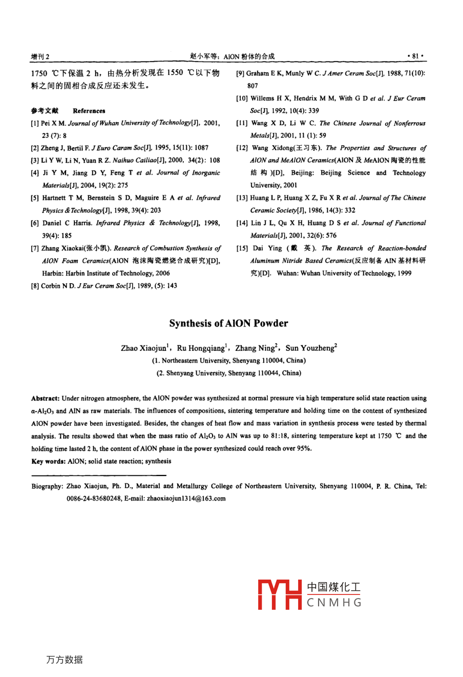 第38卷增刊:稀有金屬材料與工程Vol.38, Suppl.22009年12 月RARE METAL MATERIALS AND ENGINEERINGDecember 2009AION粉體的合成趙小軍,茹紅強',張寧2, 孫有政2(1.東北大學,遼寧沈陽10004)(2.沈陽大學,遼寧沈陽10044)摘要: 以a-Al2O3和AIN為原料,利用高溫固相反應在氮氣氣氛下常壓合成了AION粉體。研究了成分配比、合成溫度、保溫時間對合成AION粉體含量的影響,并通過熱分析測試了合成過程熱流和質(zhì)量的變化。結(jié)果表明,當原料Al2O3和AIN的質(zhì)量比為81:18、合成工藝為1750 C,2h時,得到AION相的含量達到95%以上。關鍵詞: AION; 固相反應;合成中圖法分類號: TQ174文獻標識碼: A文章編號: 1002-185X(2009)S2-0078-04尖晶石型氧氮化鋁(AION)是以Al2O3-AIN體系存溫度的變化情況。在的一個重要單相,是一種比較穩(wěn)定的固溶體陶2結(jié)果及分析瓷[2。AION陶瓷材料以獨特的性能成為頗具潛力的新材料3),它不僅具有良好的耐高溫性、熱震穩(wěn)定性2.1 原料配比對AION生成量的影響和耐氧化性能,是一種理想的高溫結(jié)構(gòu)陶瓷和近代耐根據(jù)相圖,在1750 C可以形成穩(wěn)定存在的AION火材料。同時,由于高純、致密的AION材料具有良相的范圍內(nèi)取了3種不同的原料成分配比,具體的原好的透光性,且由于其具有光學各向同性,在0.2~ 0.8料配比如表1所示。在各種成分配比中都加入了1%μm光波波段最高理論透過率可達80%以上,只要注的Al粉,起還原劑的作用。意控制晶界的組織結(jié)構(gòu)和殘余氣孔4,AION透明陶瓷還是耐高溫紅外窗口和頭罩的優(yōu)選材料之一(5-7]。表1 不同種類原料的配料組成目前,AION陶瓷在材料領域已受到了廣泛關Table 1 Compositions of mistures with different starting注[8-10。但是AION的合成機理還有待研究,至今仍material (w/%)未找到適宜的AION制備工藝參數(shù)1)。由于成本、工Numbera-Al2O3A藝和技術(shù)等方面的原因,我國距工業(yè)生產(chǎn)AION還有8l8相當距離[12]。本研究采用Al2O3 和AIN為原料合成29AION粉,通過測試AION相的生成含量探索AION的C34合成工藝,并通過熱分析測試在合成過程中的熱流和熱重的變化情況。對不同原料配比合成的AION粉體進行物相分析,結(jié)果如圖1所示。不同原料配比下合成AION相1實驗的相對含量見圖2.由圖1和圖2可以發(fā)現(xiàn)Al2O3含量.使用的原料有Al2O3、AIN及Al粉。按照原料配對產(chǎn)物的相組成有著重要的影響。各種配比的原料合比稱取各粉末后,以無水乙醇為溶劑,加入剛玉磨球成后都有大量AION相生成,說明Al2O3和AIN在這濕磨24h后,再將得到的漿料進行干燥,獲得混合粉個溫度下已經(jīng)發(fā)生了固相反應,但是實驗還發(fā)現(xiàn)除了末,最后將混合粉末放入石墨坩堝中置于真空碳管燒AION相以外,都還有AIN相。隨著Al2O3含量的增結(jié)爐中在設定的工藝參數(shù)下在氮氣氣氛下合成AION加,未反應完全的AIN相含量逐漸減少,其XRD衍粉體,并通過XRD分析合成粉體的相組成。射峰強度逐漸減弱,生成的AION相含量逐漸增加。稱取少量球磨并干燥后的混合粉末放入剛玉坩堝.當Al2O3含量達到81%時,AION的生成量可以達到置于熱分析儀中加熱到1550 C,測量熱流及熱重隨95%以上,基本上可以認為只有AION相存在。AION中國煤化工收稿日期: 2009-06-22基金項目:國家自然科學基金(50672060)及遼寧省基金項目(05L265, 20052002YHCNMHG作者簡介:趙小軍,男,1983 年生,博士,東北大學材料與冶金學院,遼寧沈陽10004,電話: 024-83680248, E-mail: zhaoxiajun1314@163.co增刊2趙小軍等: AION 粉體的合成●79.的表達式為Al23O2zNs, 用兩種原料可以表示為相:當溫度繼續(xù)升高,在1800 C時,生成的AION相9Al2O35AIN,此時與實驗的結(jié)果相吻合。含量明顯降低,AIN含量增加,這可能是部分AION另外,從圖1中還發(fā)現(xiàn)在合成的AION粉體中都發(fā)生分解造成的結(jié)果。含有少量的AIN,這是由于原料是在以石墨為加熱體的爐中進行合成,由于Al2O3在高溫、還原氣氛(CO、C)中能夠和N發(fā)生反應生成AIN13,14。 另外,提供8北i止......還原氣氛的部分Al粉和N在高溫下也能生成AIN,●AIN.所以最后殘留極少量的AIN屬于正?,F(xiàn)象?!鯝LO,1750 ,C il●AON1700 CA.it出讓1地么堅208010020/0B_一1圖3不同溫度下合成AION粉的XRD圖譜Fig. 3 XRD patterns of AION power at dfferet temperatureC_。4080100-20/(0)80-圖1不同原料配比合 成AION粉體的XRD圖50Fig.1 XRD patterns of sample with different composition00-20-17001750180060Temperature, T/C圖4不同合成溫度下AION的生成量圖Fig.4 Content of AION product at diferent temperature657081從圖3和圖4還可以看出,1750C時生成的AIONContent ofALOJ%衍射鋒最強,其含量最多,達到95%以上,故該溫度圖2不同AlO3含量下AION的生成量圖為合成AION粉體的最佳溫度。當?shù)陀谠摐囟鹊臅r候,F(xiàn)ig.2 Content of AION product with dfferent content of Al2O3反應未進行或者反應不完全:當高于該溫度的時候,部分已生成的AION相發(fā)生分解,AION相含量降低,2.2合成溫度對AION生成量的影響AIN相含量明顯增加。這是因為AION相部分發(fā)生分選擇a-Al2O3 和AIN為原料,升溫速率為10解生成了AIN,但是Al2O3 含量沒有明顯增大,這可C/mnin,保溫時間2h, 氮氣氣氛下合成AION粉體。能是由于分解后的Al2O3是以Al和Al2O氣體的形式溫度分別設置為1700,1750, 1800 C.而隨氣流逸出。另外在高溫下還發(fā)現(xiàn)極少量的AlgO3N,對在不同合成溫度下合成的粉體進行XRD物相相,可能這是AION相分解后的殘留相,有待進- -步分析,結(jié)果如圖3